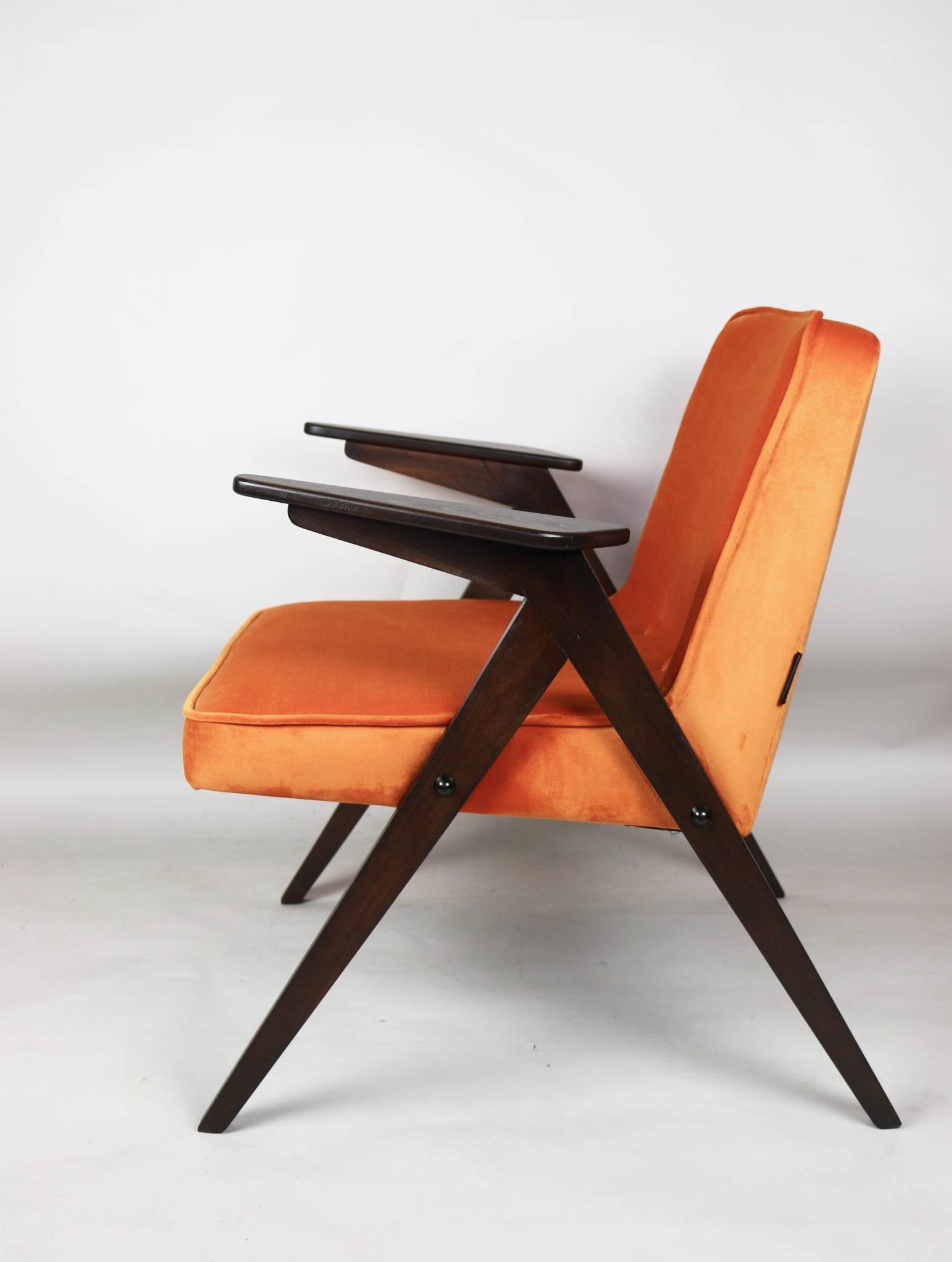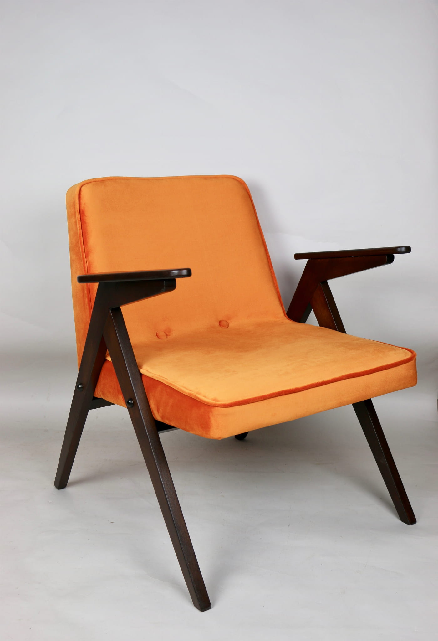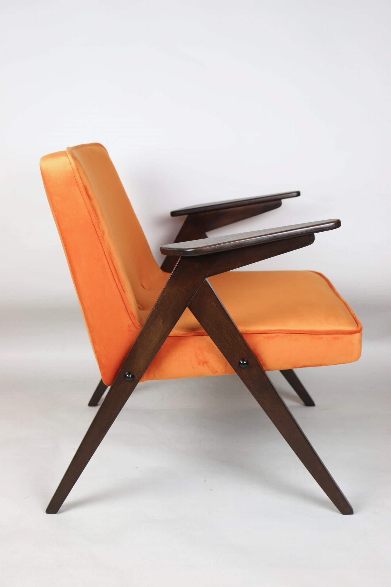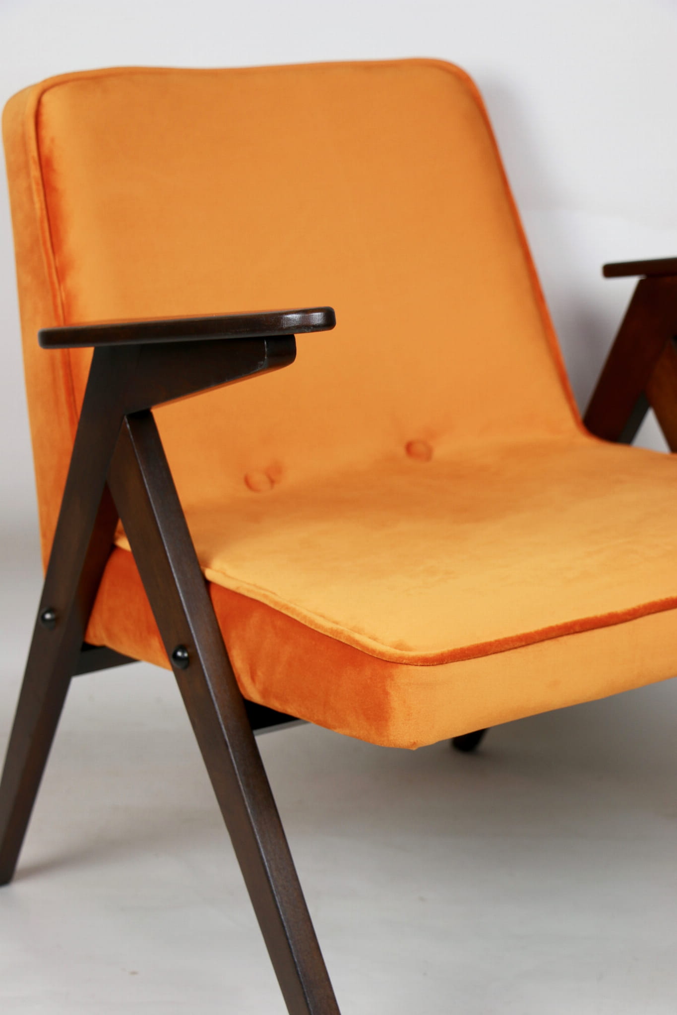Fotel Bunny projektu Józefa Chierowskiego, który został całkowicie odrestaurowany. Nowe obicie pokryte aksamitnym materiałem tapicerskim w pomarańczowym kolorze z serii Quartz. Stelaż drewniany z podłokietnikami w kolorze ciemniejszego drewna.