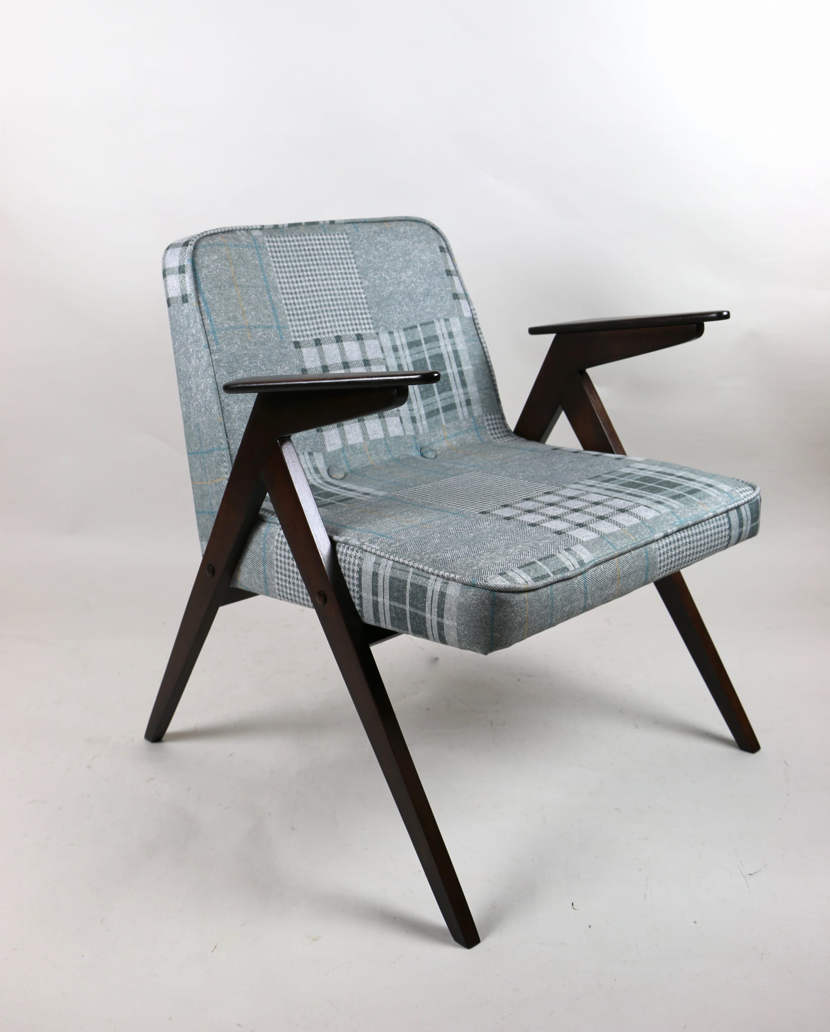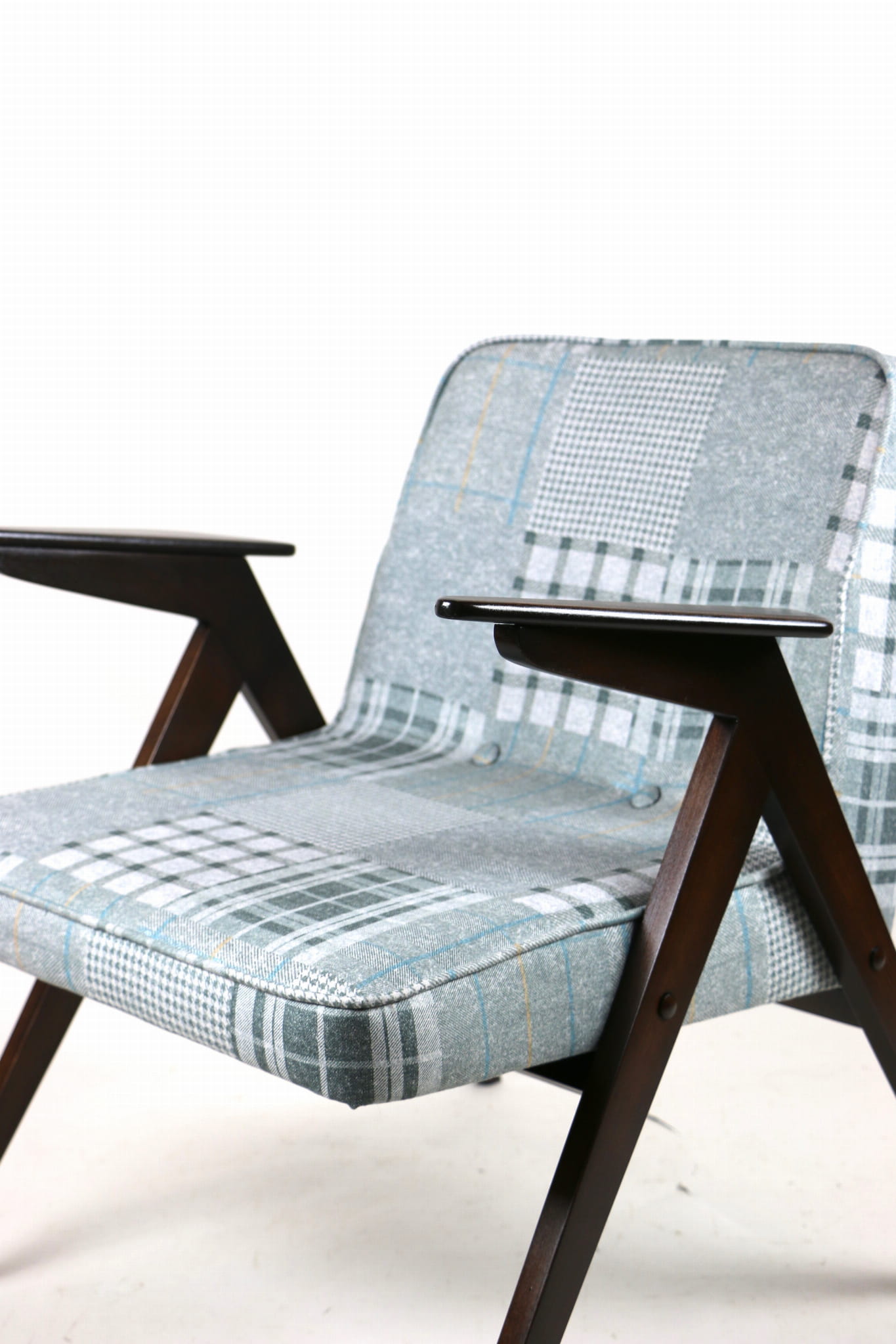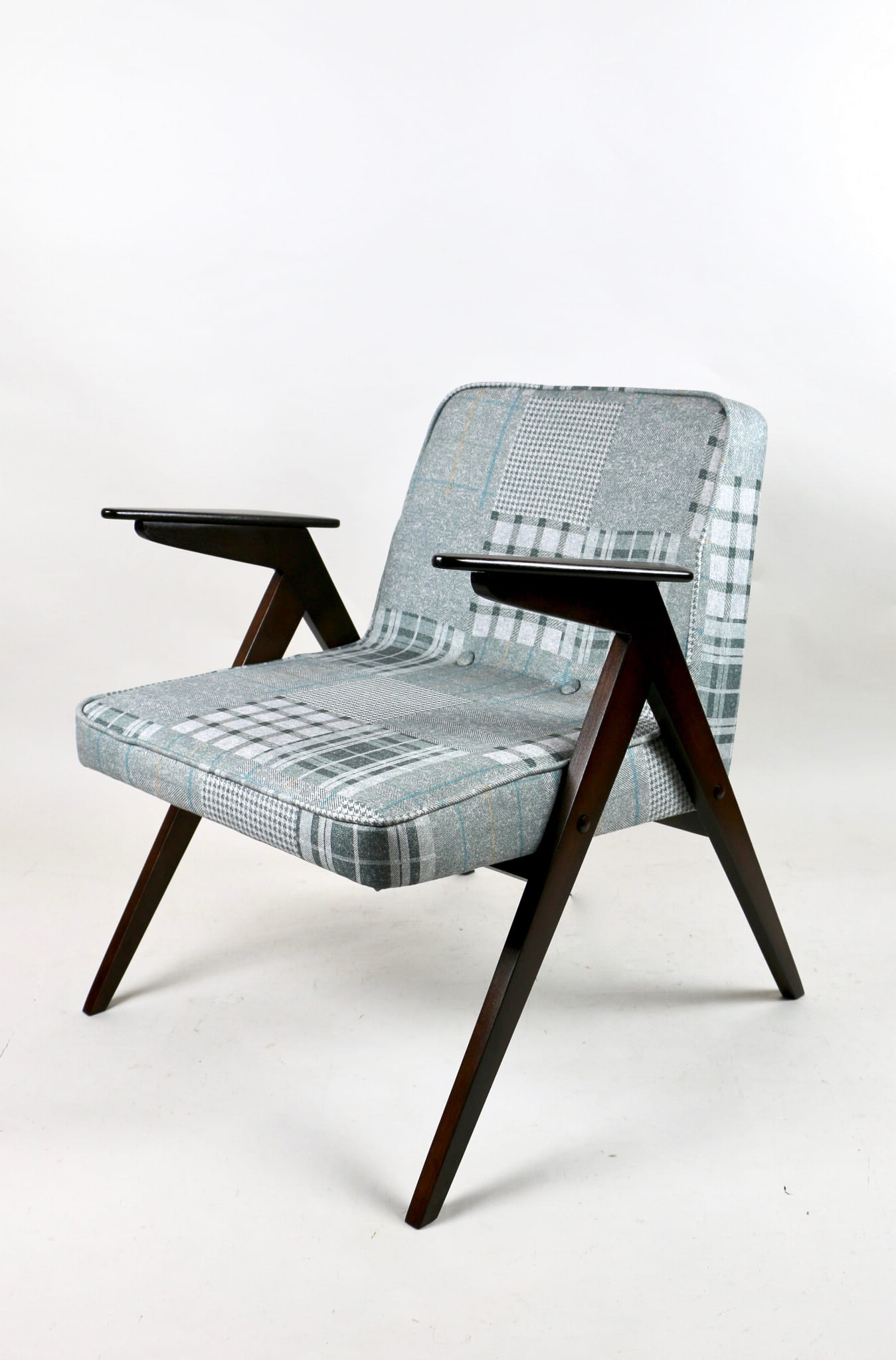 Fotel Bunny z lat 70. Został odrestaurowany. Zyskał nowe obicie pokryte drukowanym materiałem tapicerskim w kratkę i jodełkę szaro niebieską. Stelaż drewniany z podłokietnikami w kolorze ciemnego drewna utrwalony lakierobejcą - kolor orzech