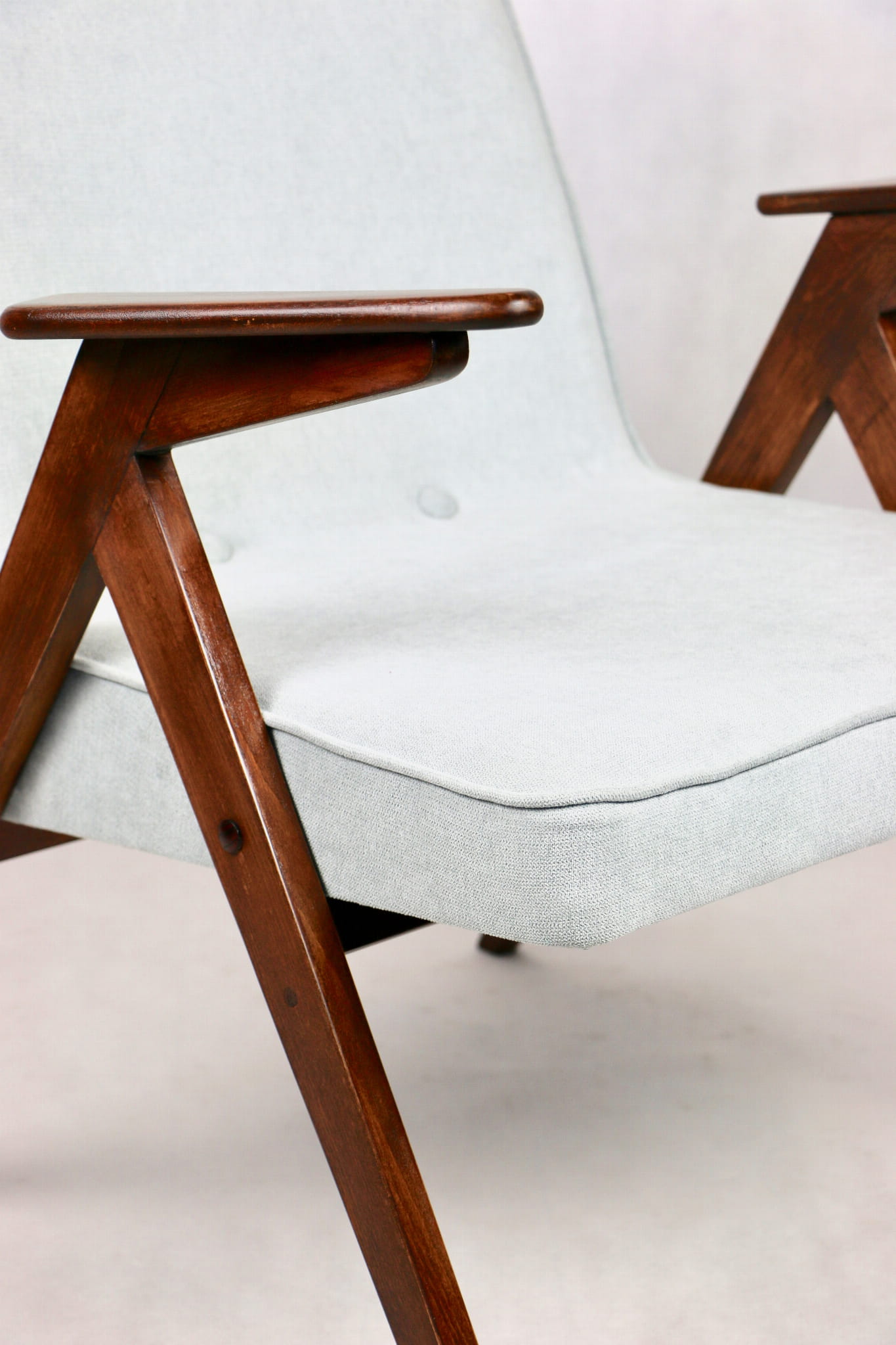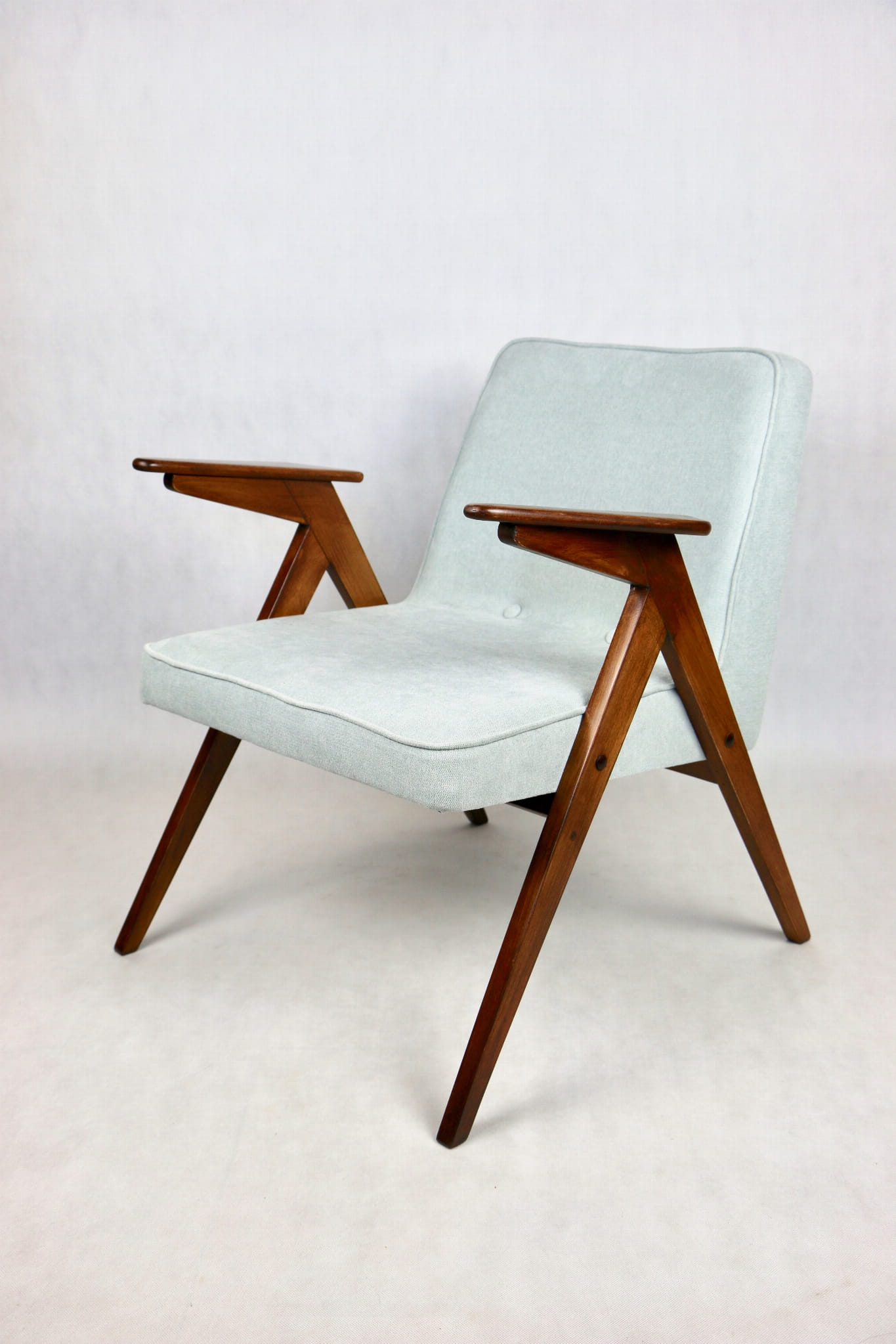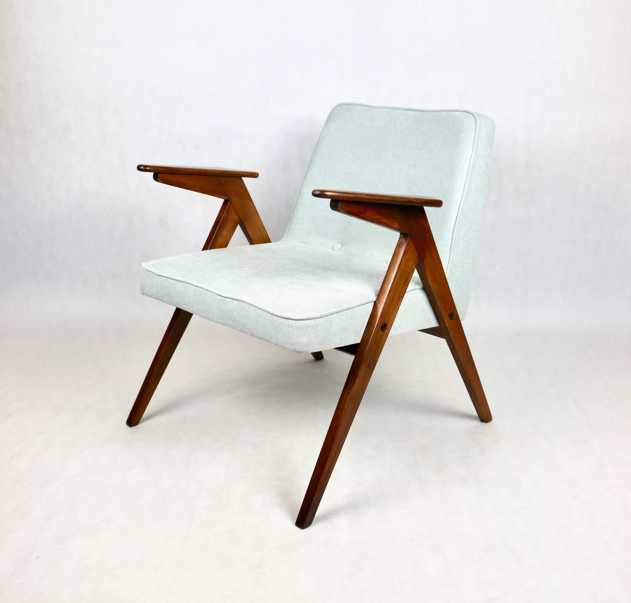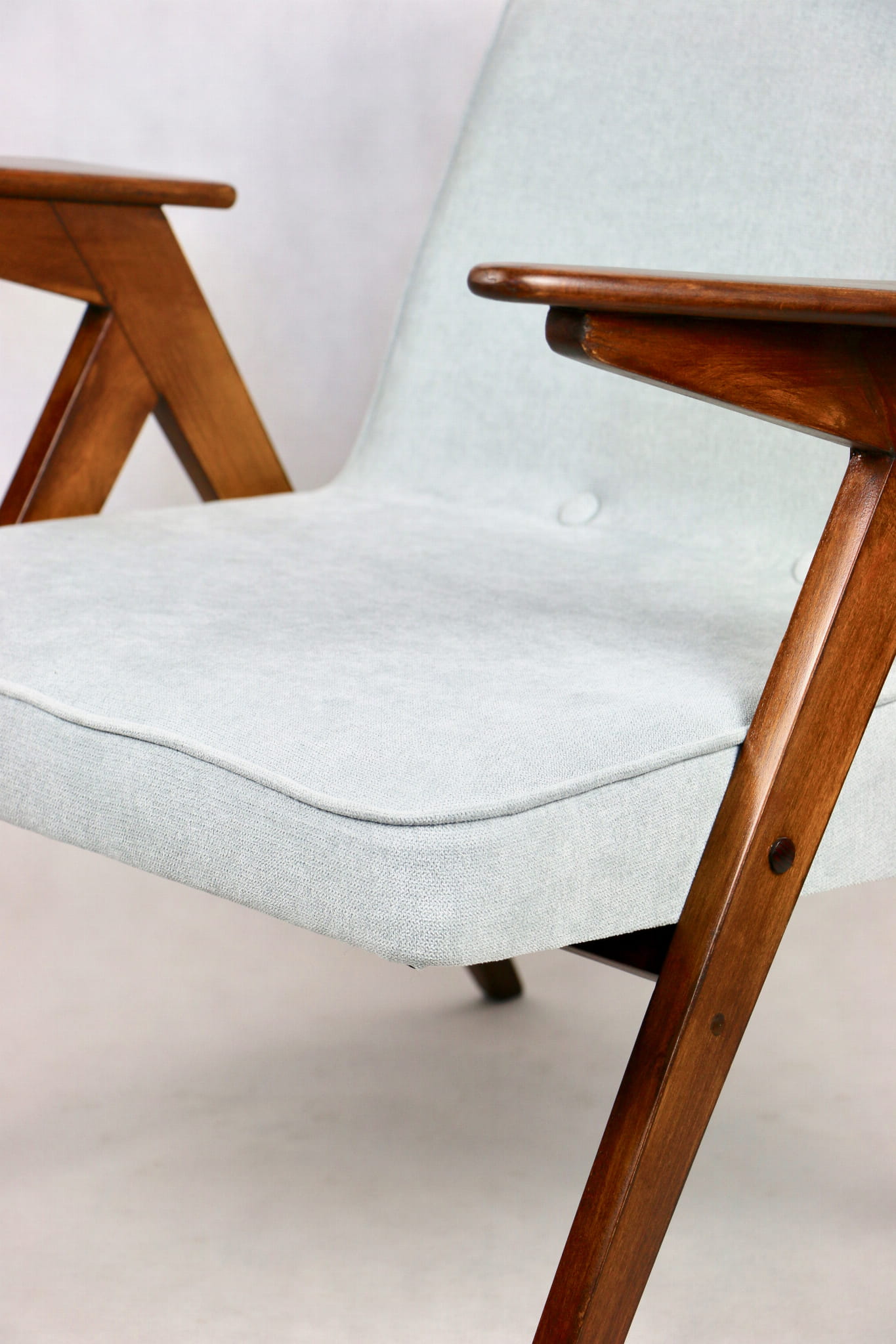 Fotel Bunny z lat 70. Został całkowicie odrestaurowany. Zyskał nowe obicie pokryte strukturalnym materiałem tapicerskim w kolorze turkusowym - jasno niebieskim. Stelaż drewniany z podłokietnikami w kolorze naturalnego drewna utrwalony lakierem .