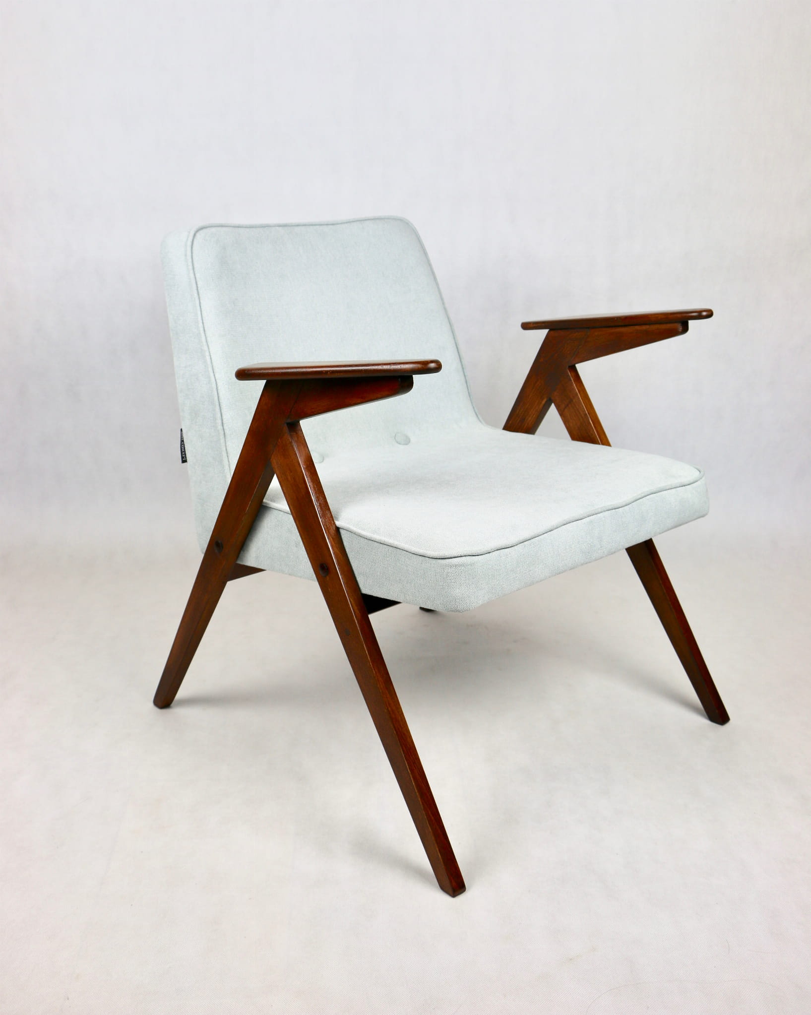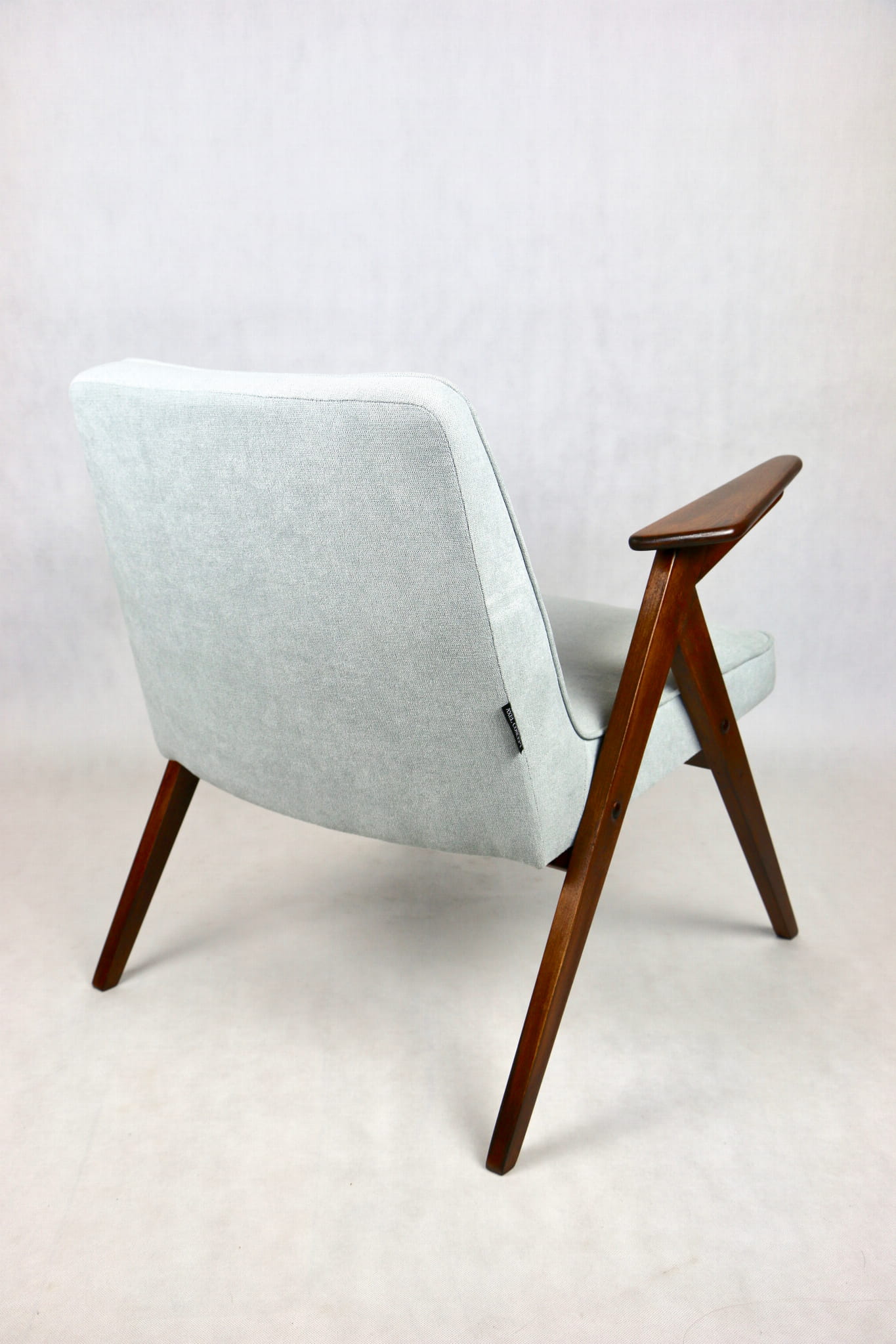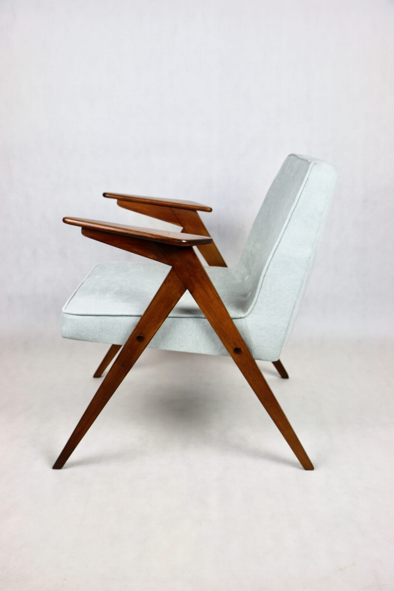 Fotel Bunny z lat 70. Został całkowicie odrestaurowany. Zyskał nowe obicie pokryte strukturalnym materiałem tapicerskim w kolorze turkusowym - jasno niebieskim. Stelaż drewniany z podłokietnikami w kolorze naturalnego drewna utrwalony lakierem .
