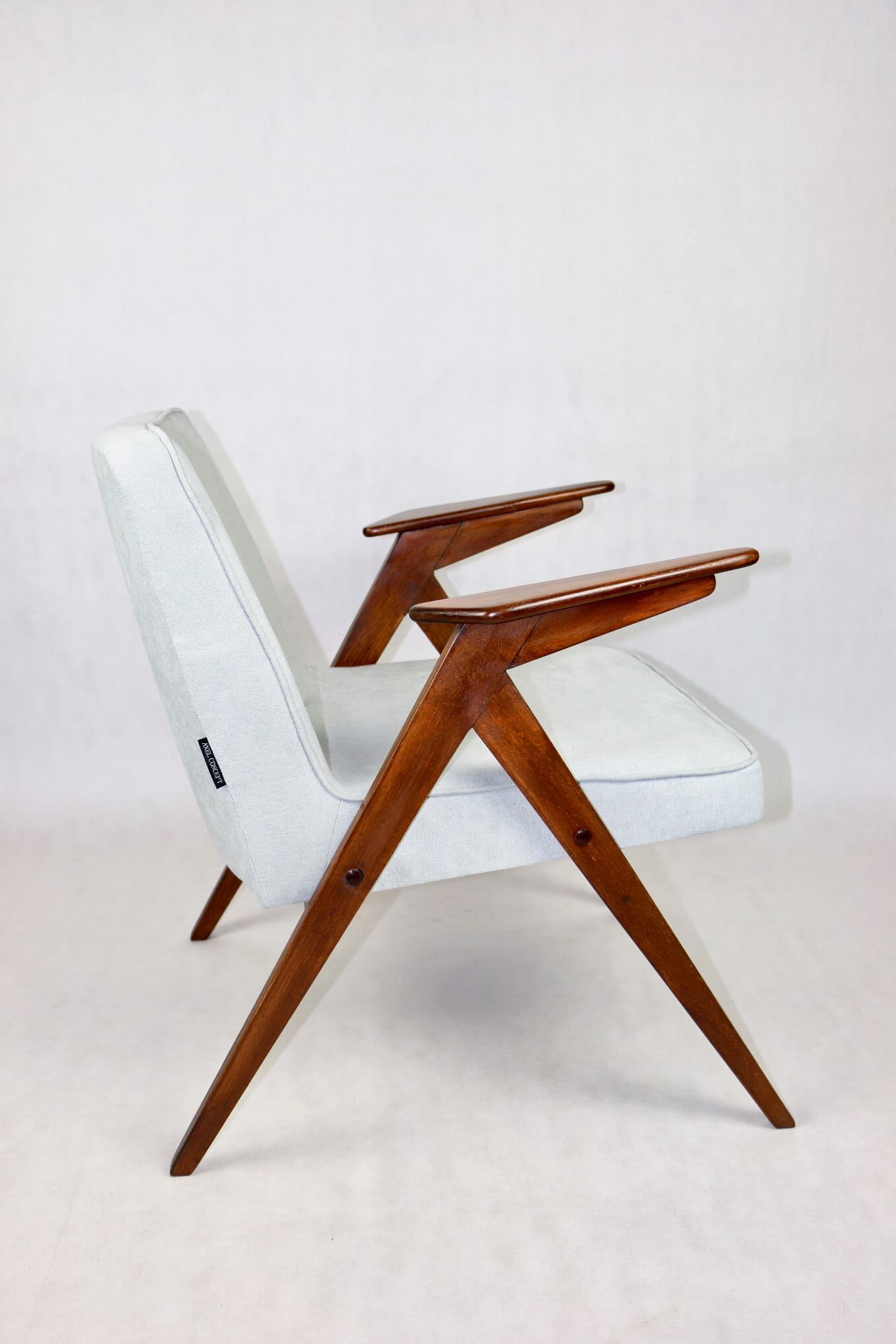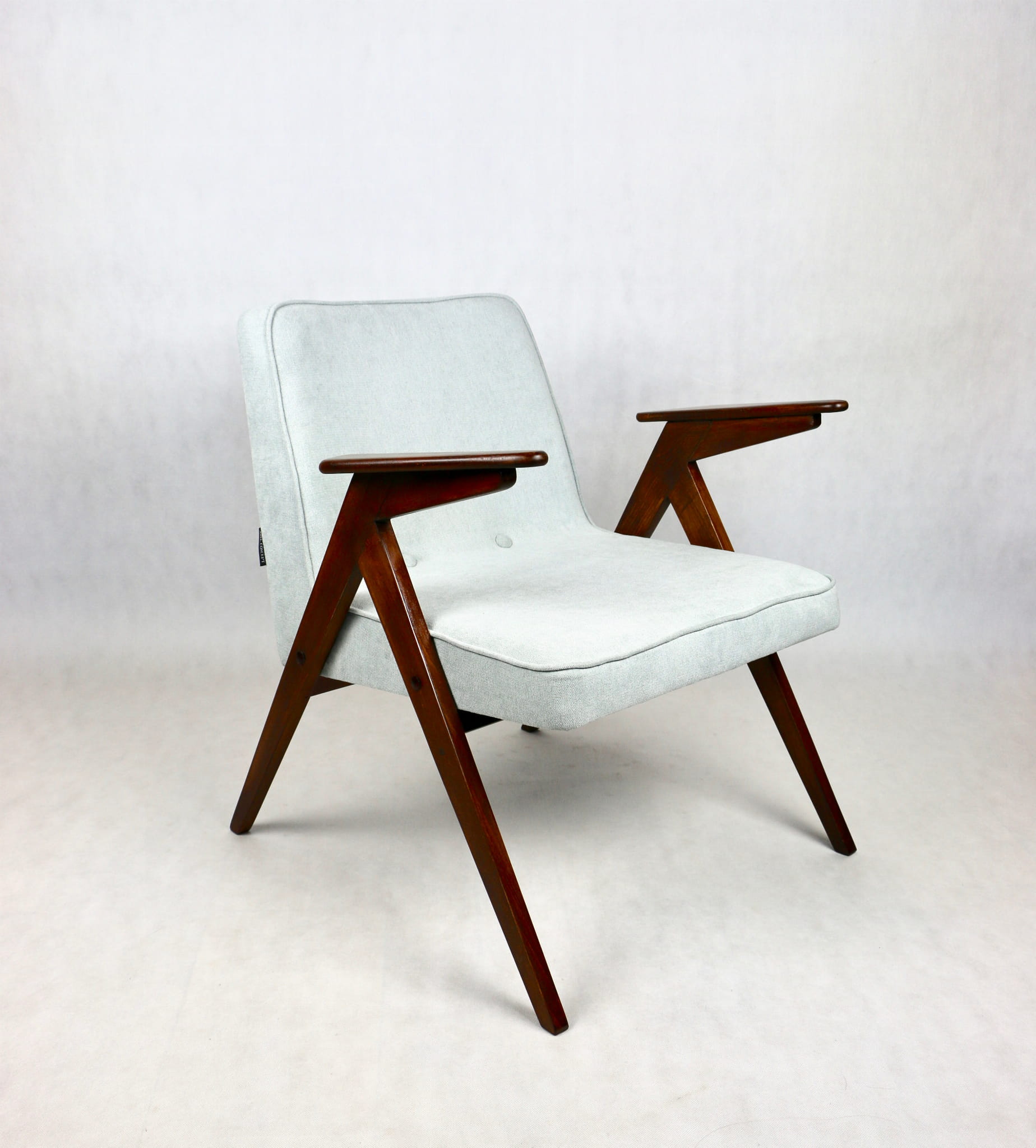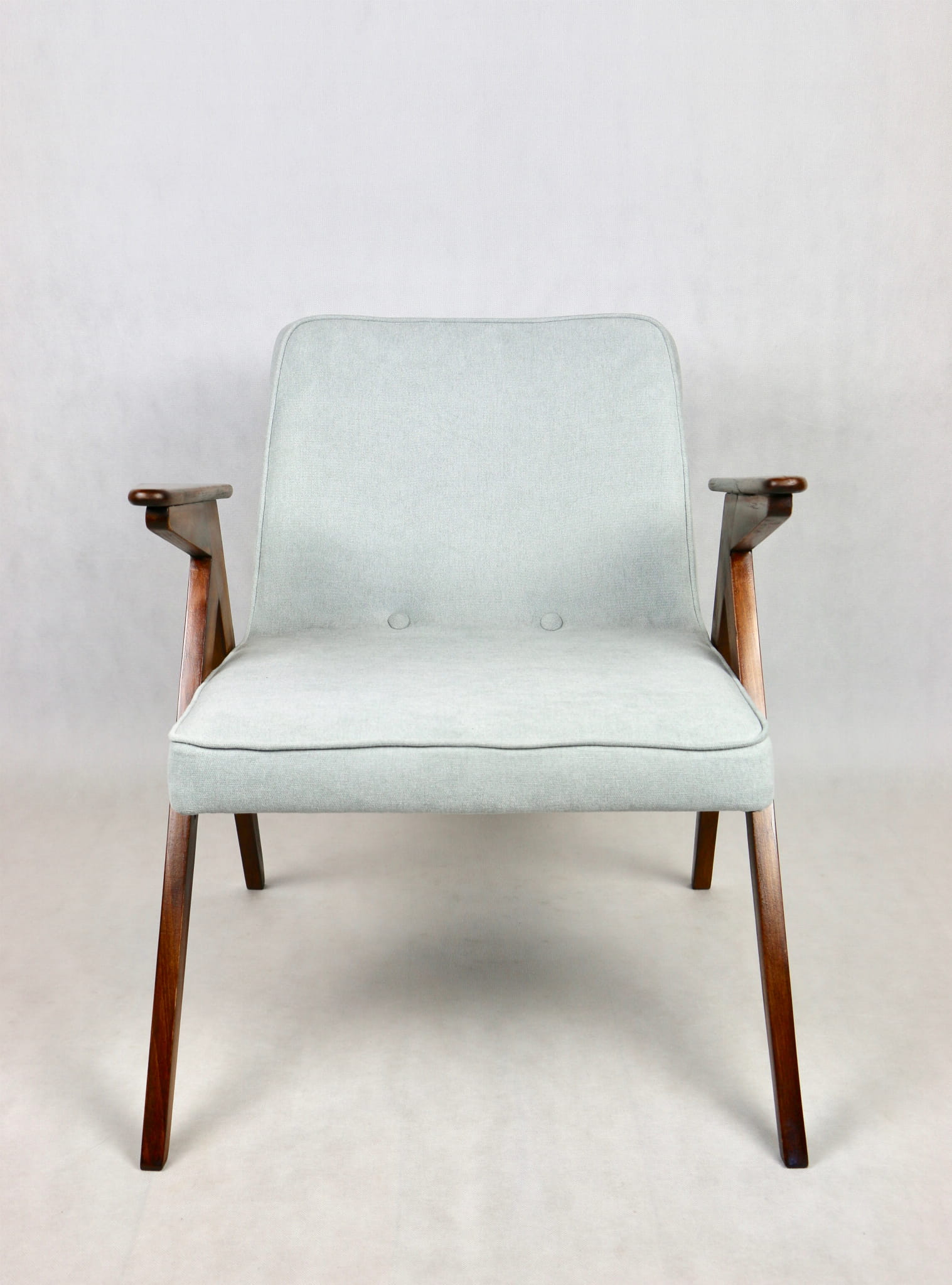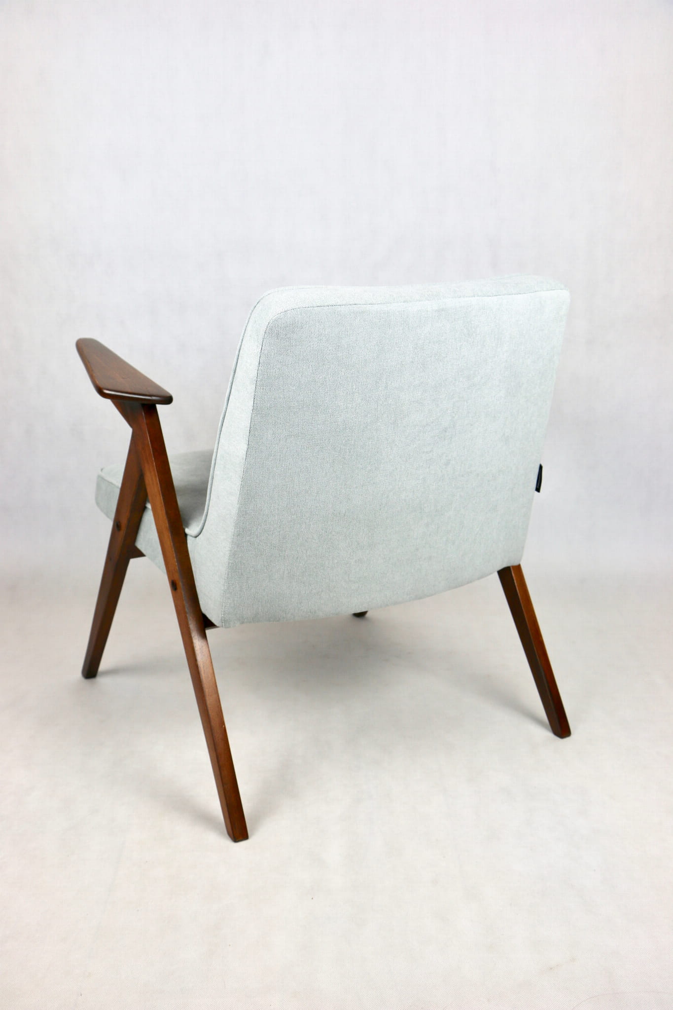 Fotel Bunny z lat 70. Został całkowicie odrestaurowany. Zyskał nowe obicie pokryte strukturalnym materiałem tapicerskim w kolorze turkusowym - jasno niebieskim. Stelaż drewniany z podłokietnikami w kolorze naturalnego drewna utrwalony lakierem .