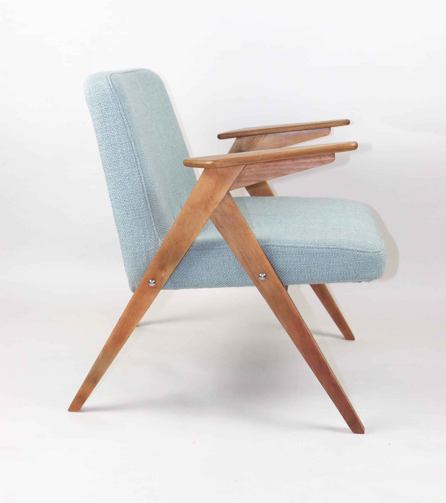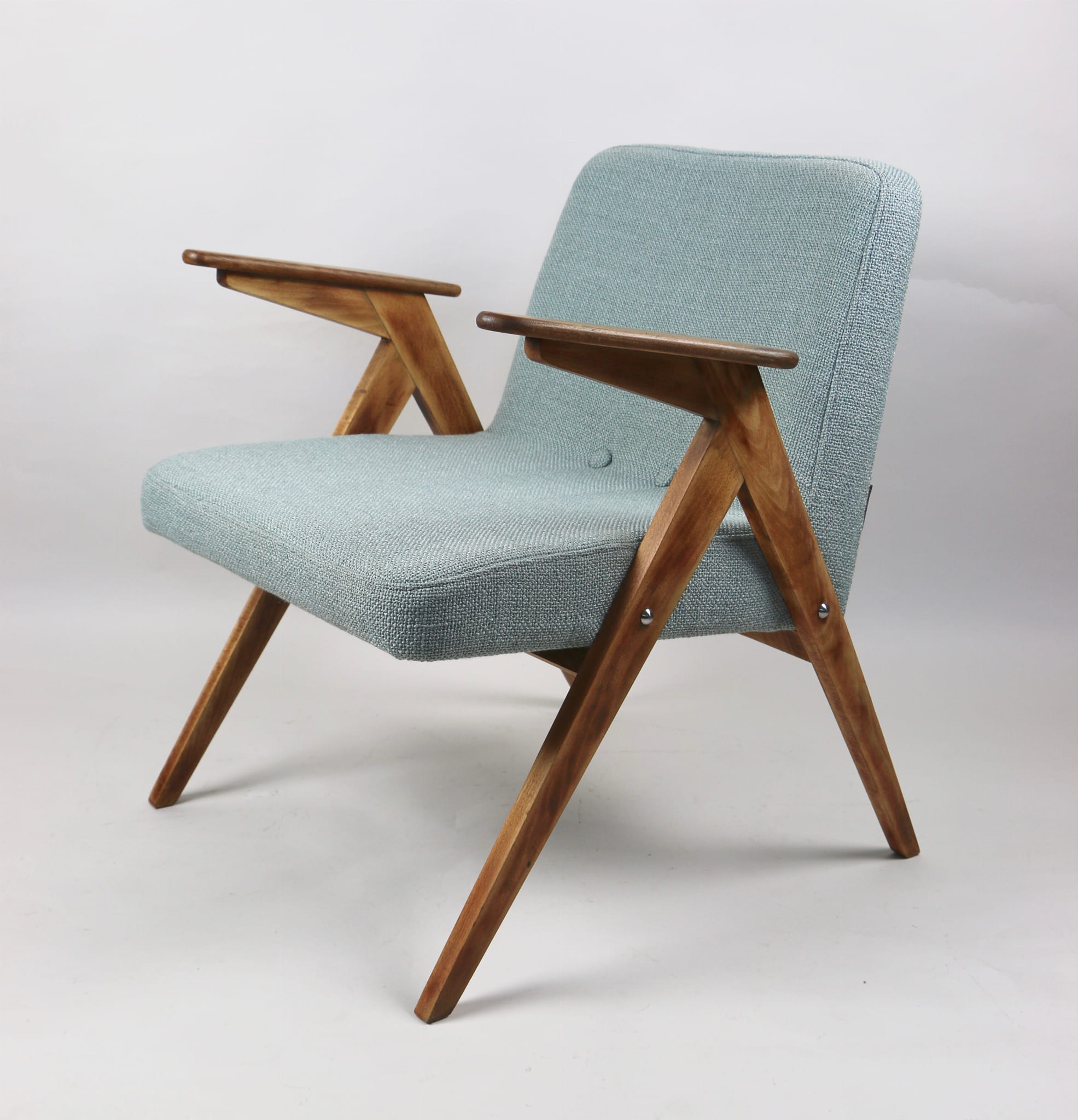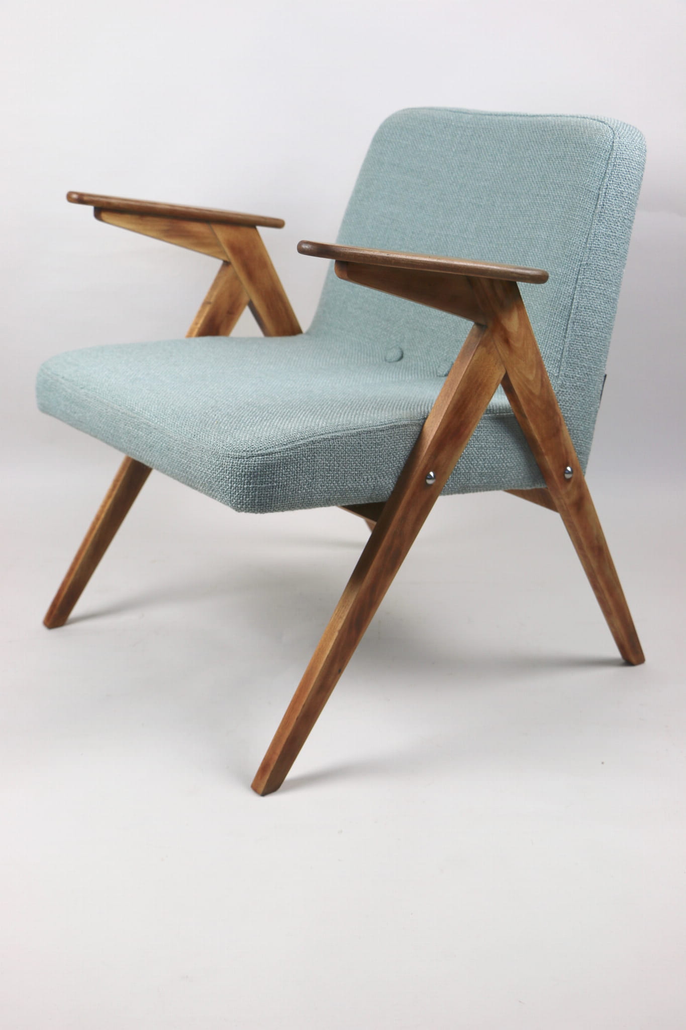 Fotel Bunny z lat 70. Został całkowicie odrestaurowany. Zyskał nowe obicie pokryte strukturalnym materiałem tapicerskim w kolorze turkusowym. Stelaż drewniany z podłokietnikami w kolorze naturalnego drewna utrwalony olejowoskiem .