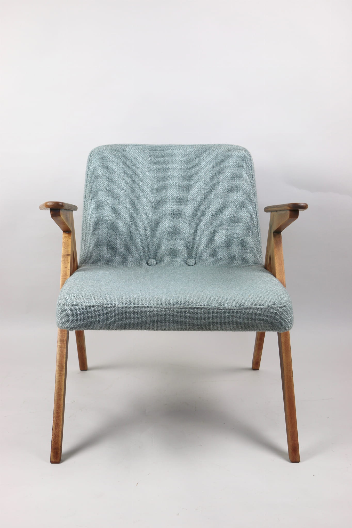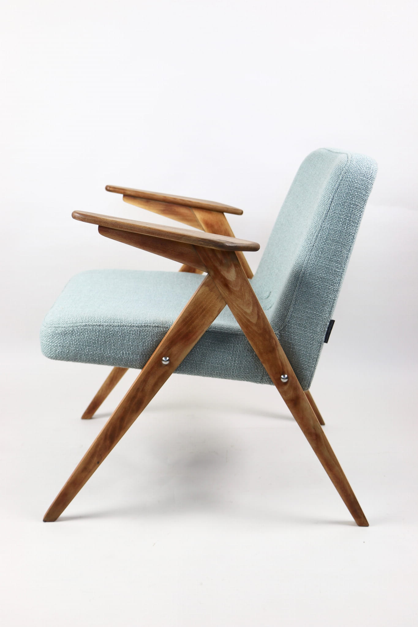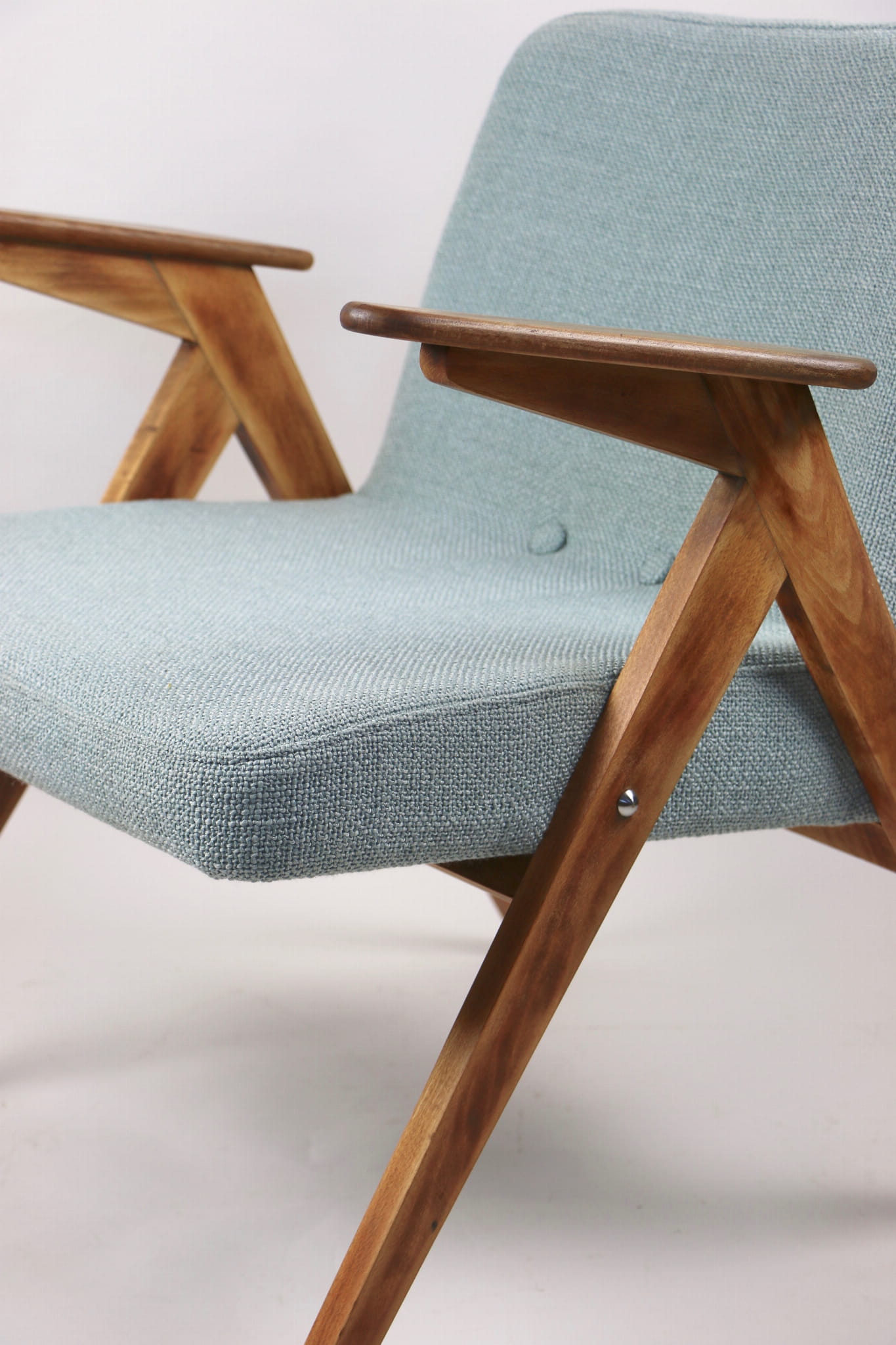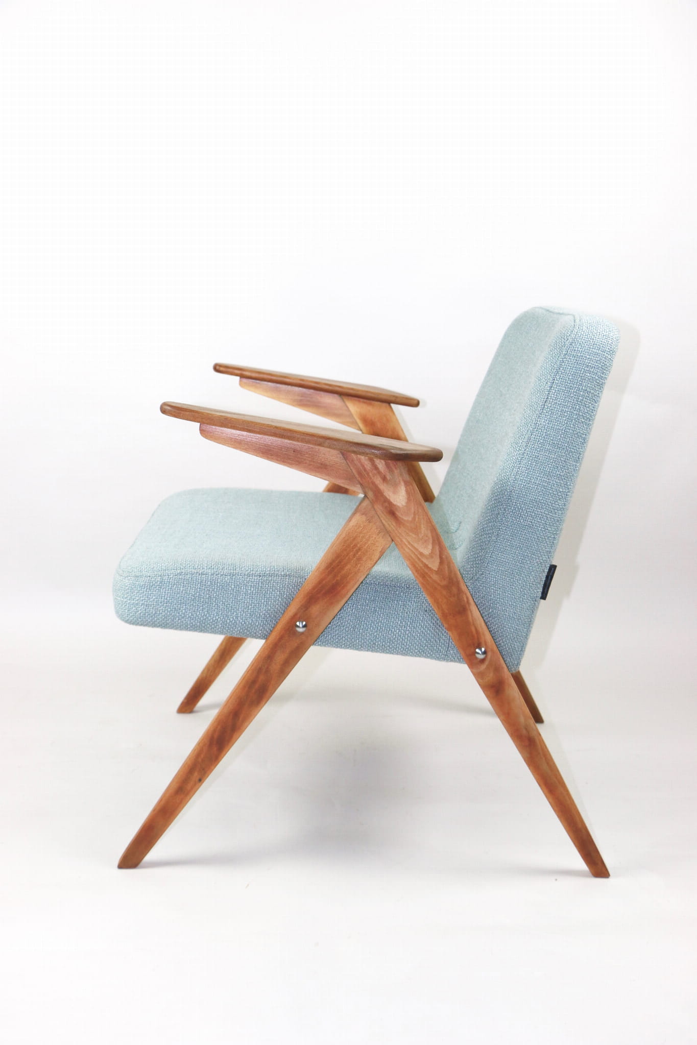 Fotel Bunny z lat 70. Został całkowicie odrestaurowany. Zyskał nowe obicie pokryte strukturalnym materiałem tapicerskim w kolorze turkusowym. Stelaż drewniany z podłokietnikami w kolorze naturalnego drewna utrwalony olejowoskiem .