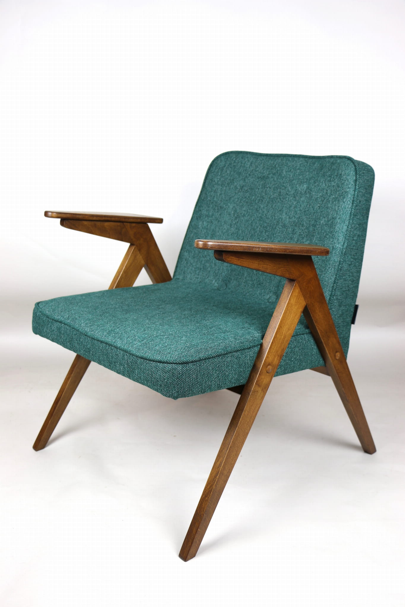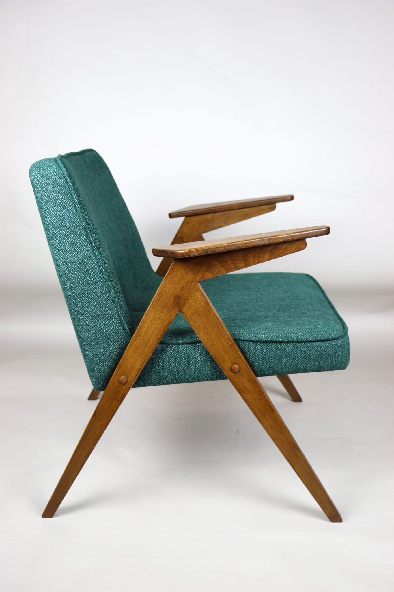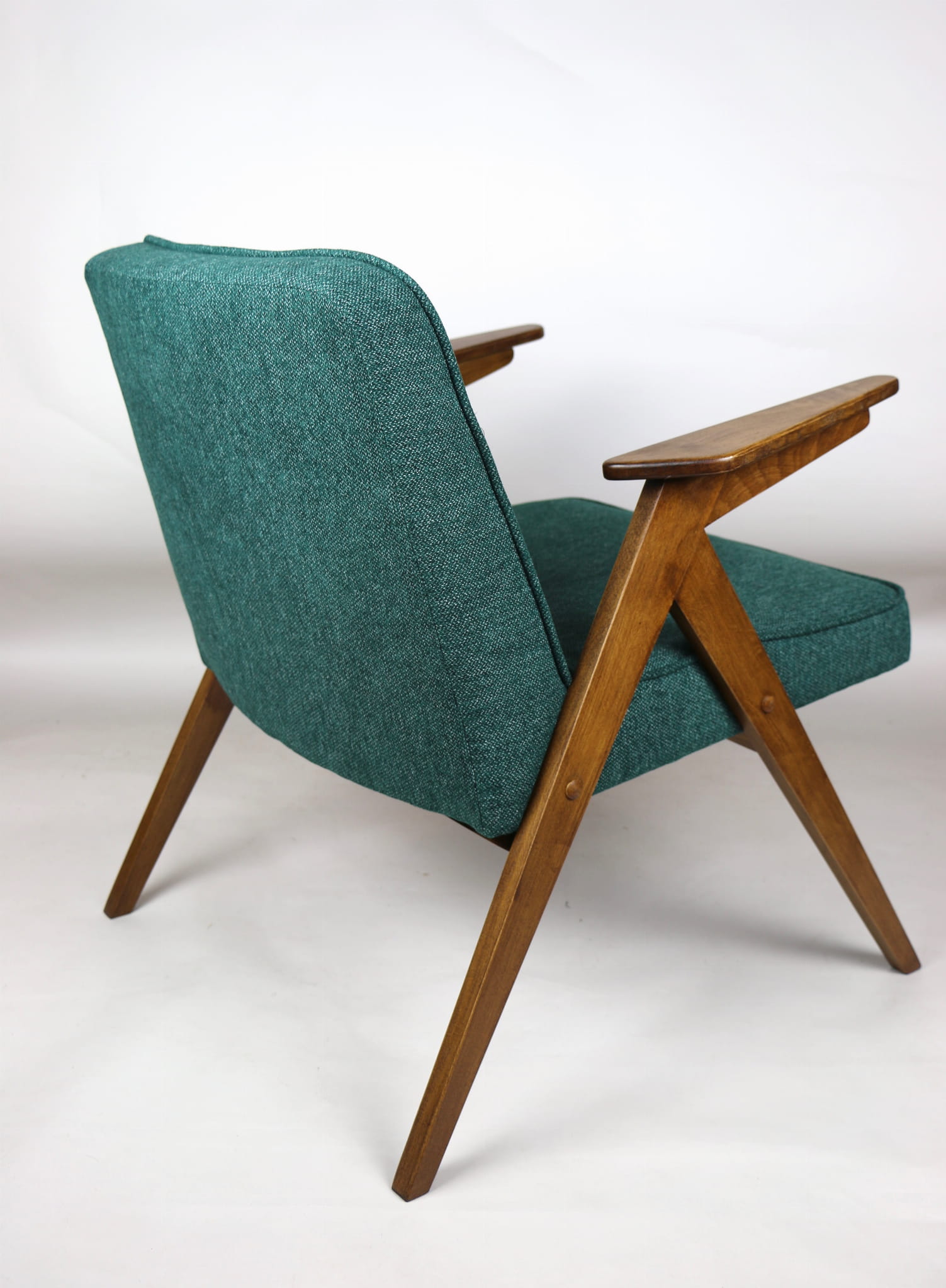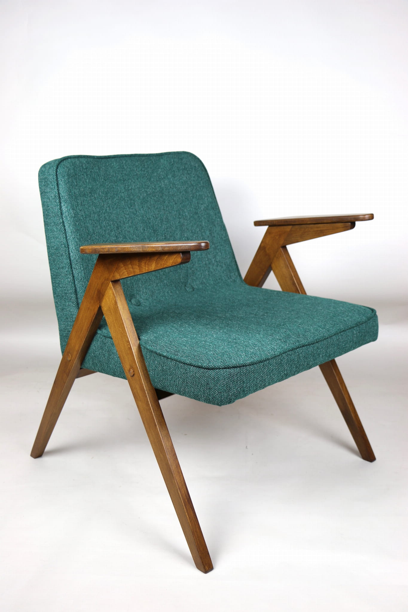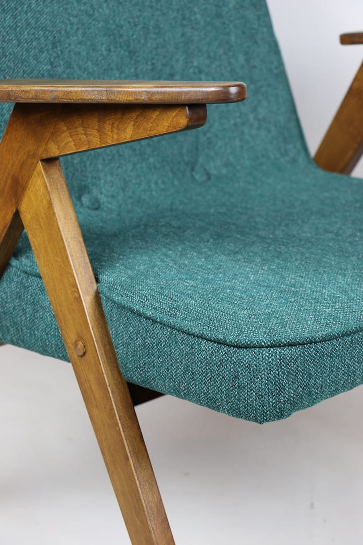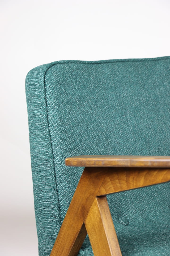 Fotel Bunny projektu Józefa Chierowskiego, który został całkowicie odrestaurowany. Nowe obicie pokryte strukturalnym materiałem tapicerskim w zielono-morskim kolorze z serii Queens. Stelaż drewniany z podłokietnikami w kolorze orzechowego drewna.