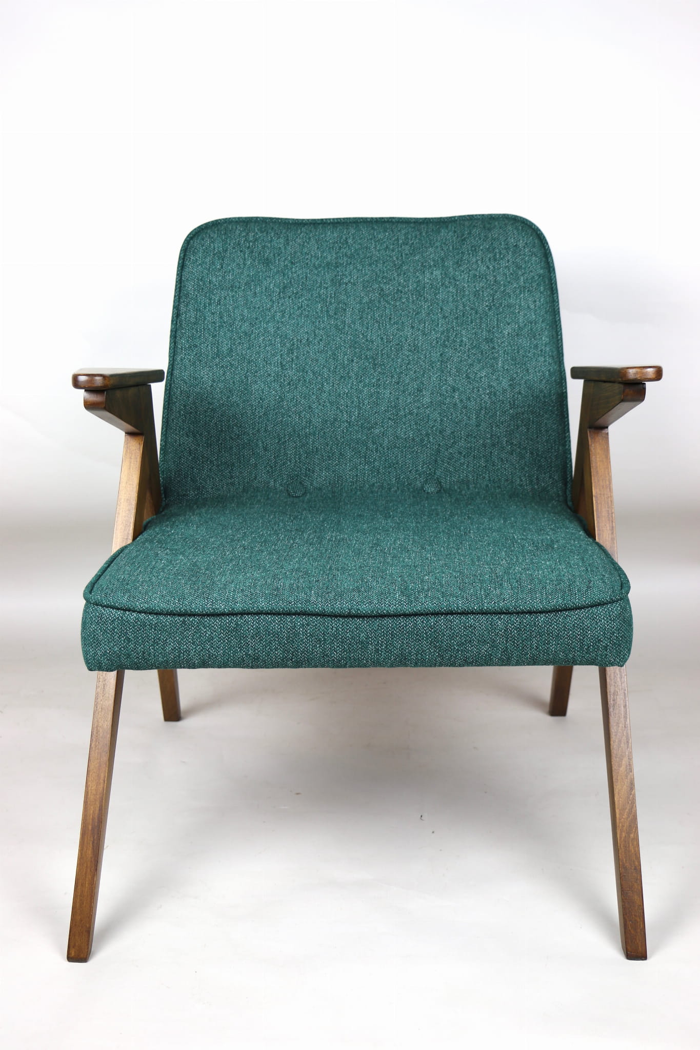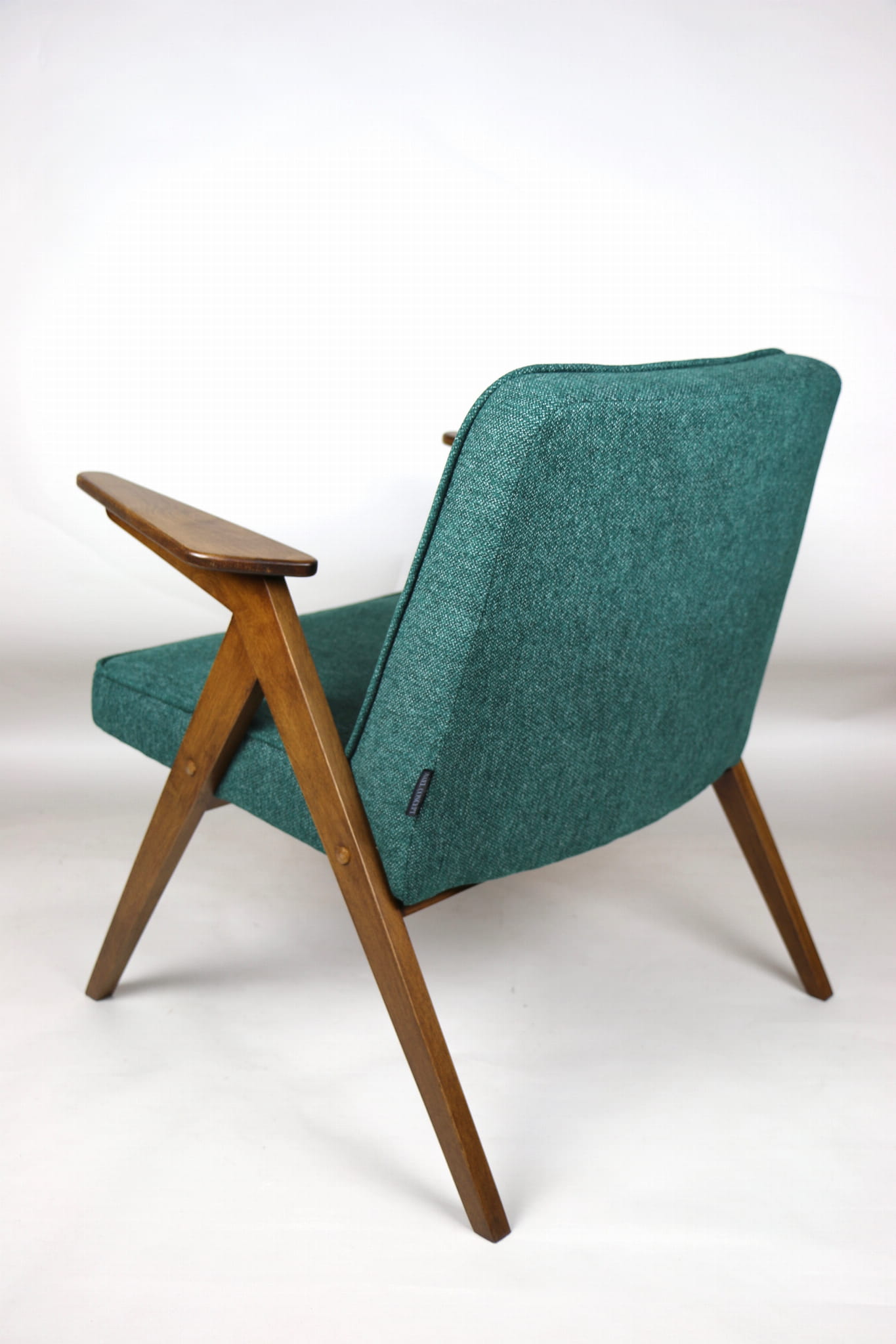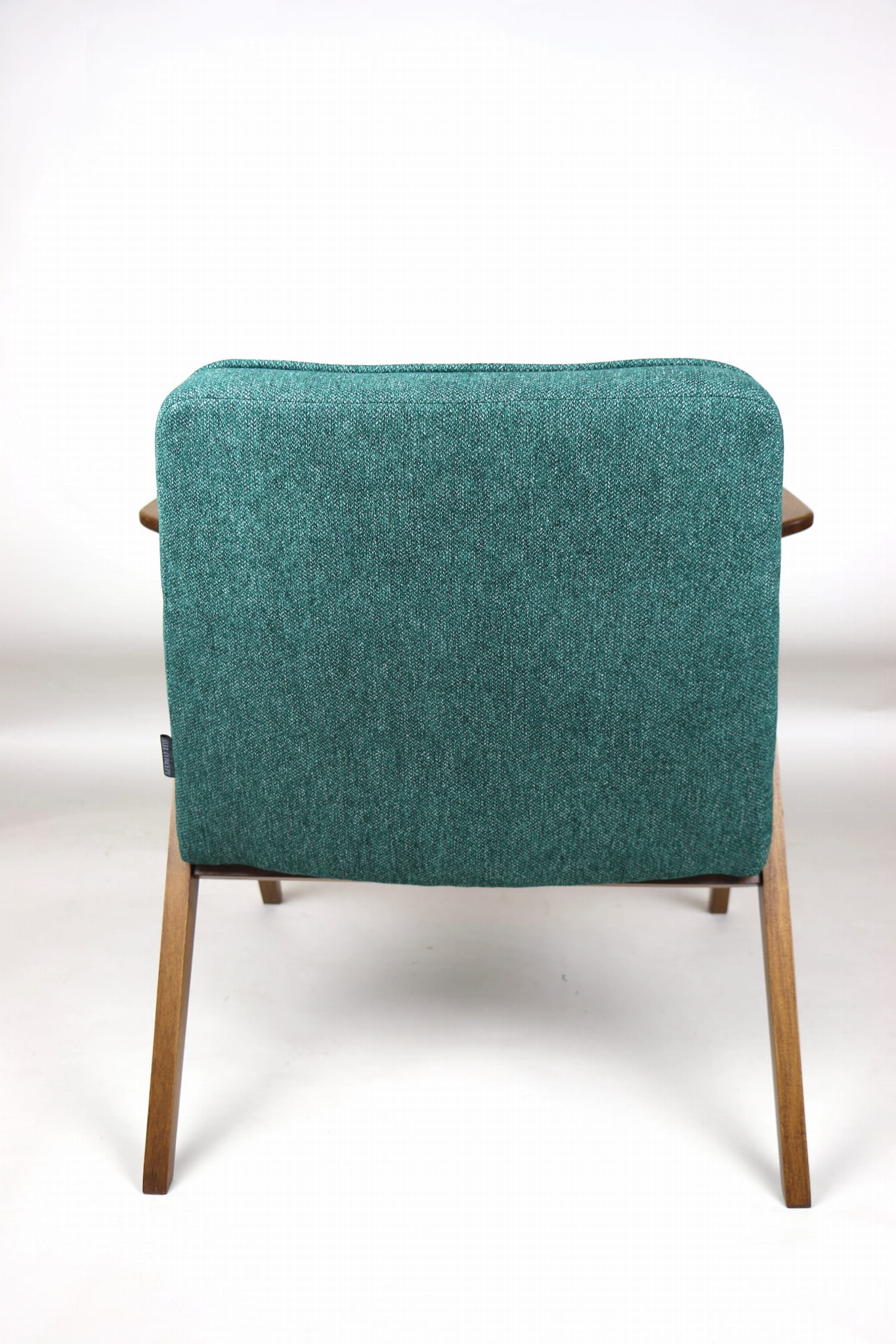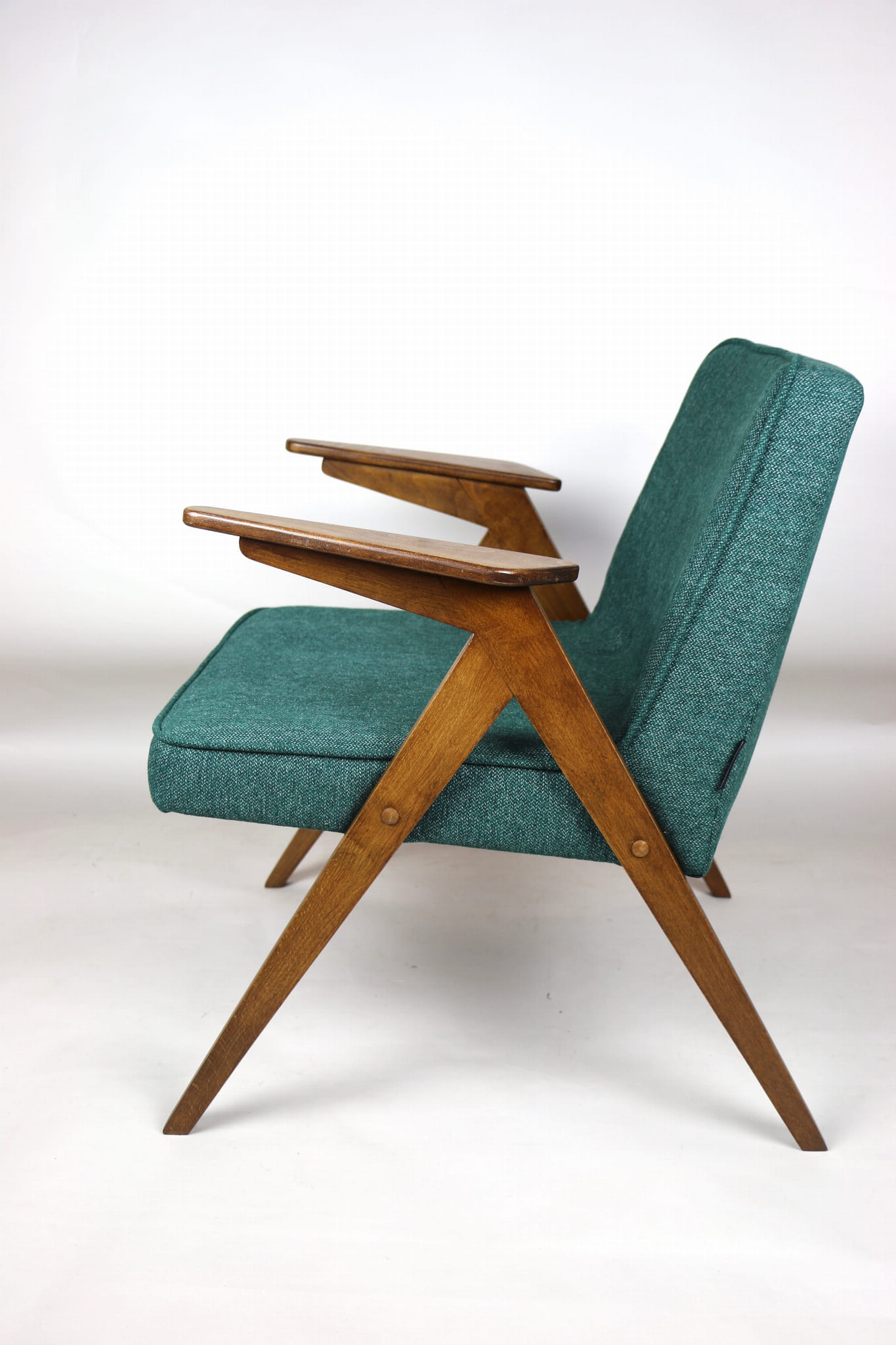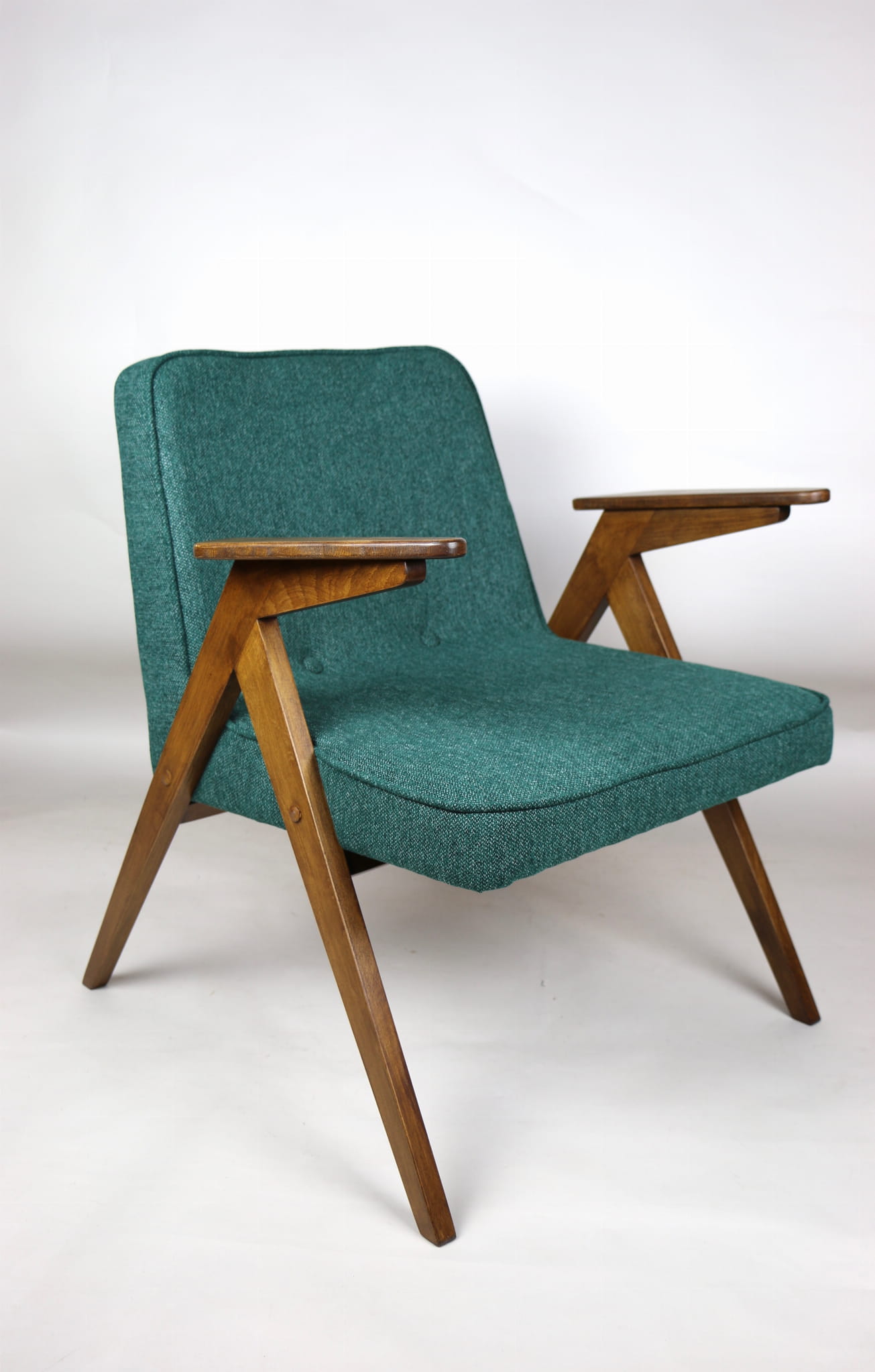 Fotel Bunny projektu Józefa Chierowskiego, który został całkowicie odrestaurowany. Nowe obicie pokryte strukturalnym materiałem tapicerskim w zielono-morskim kolorze z serii Queens. Stelaż drewniany z podłokietnikami w kolorze orzechowego drewna.