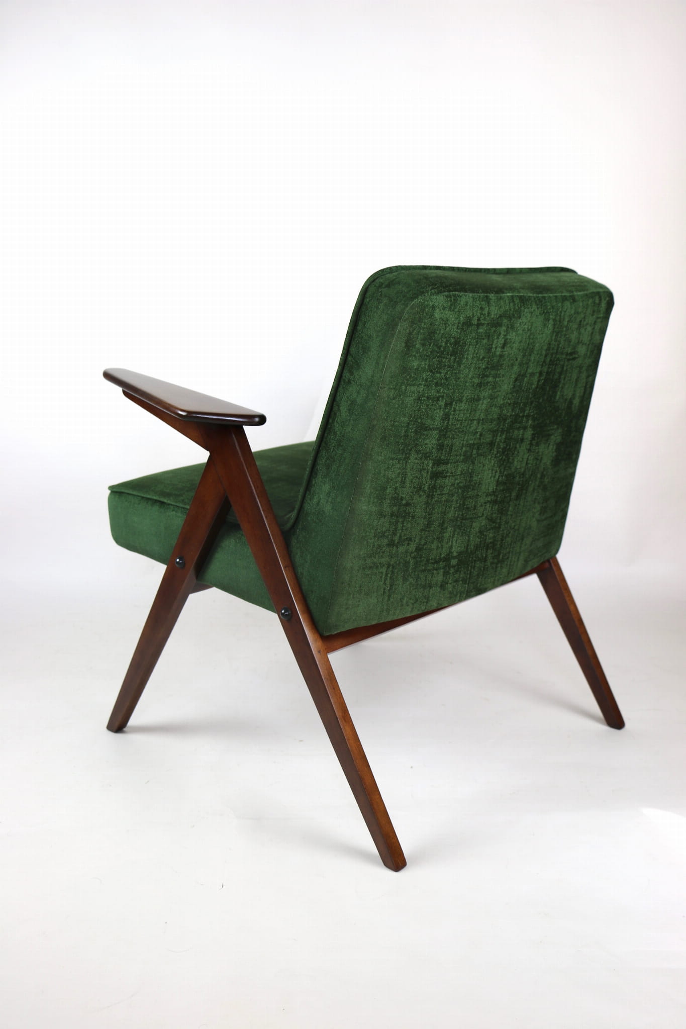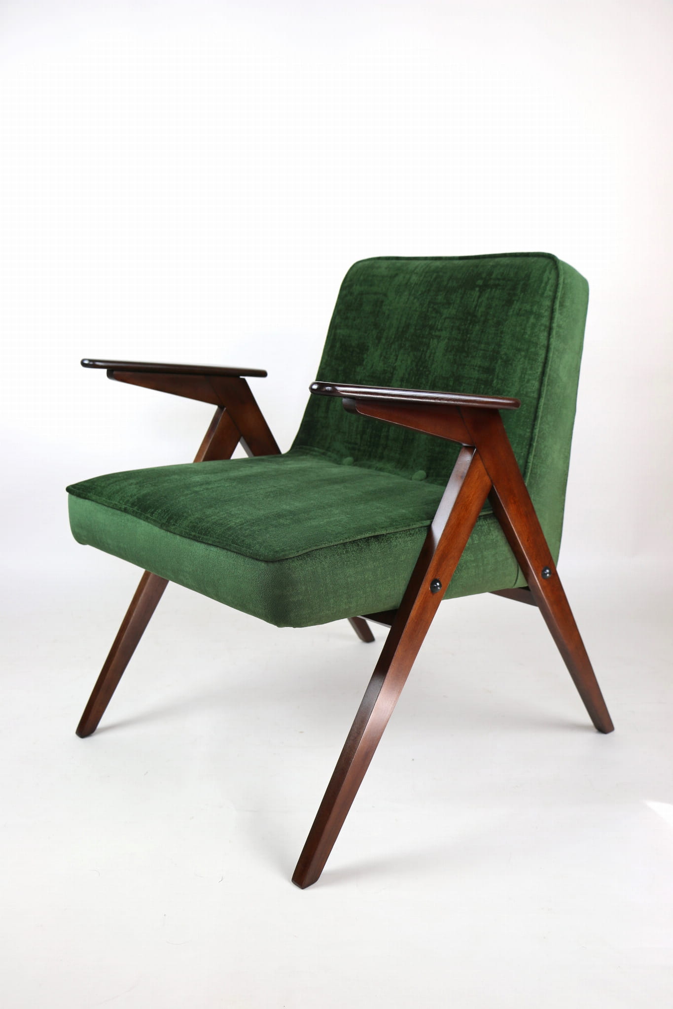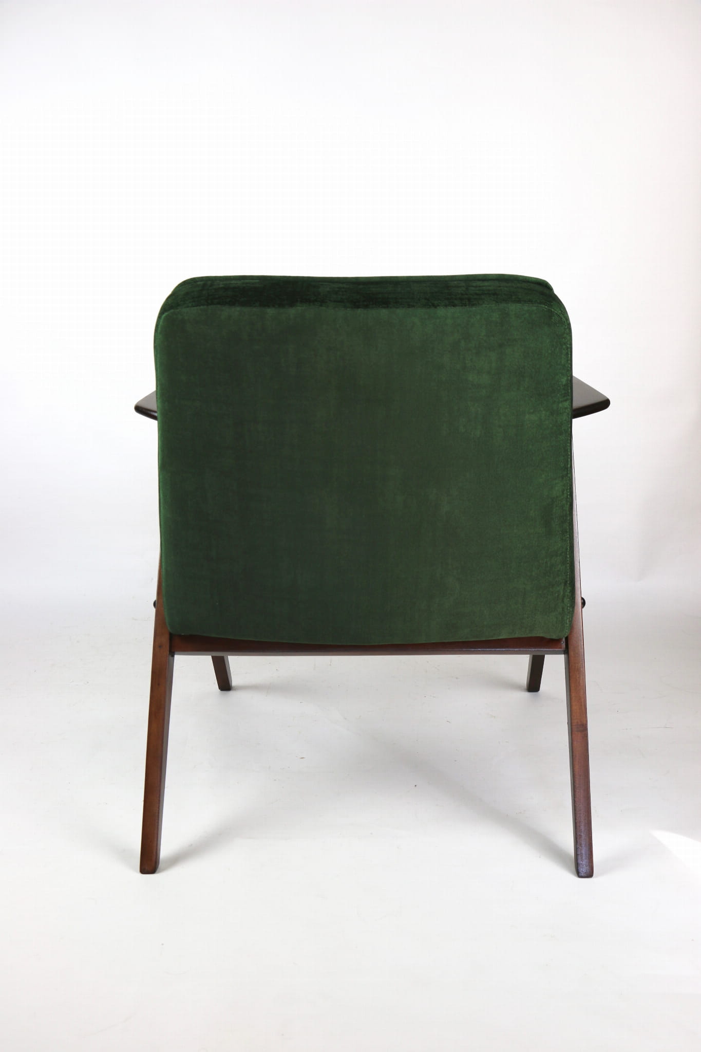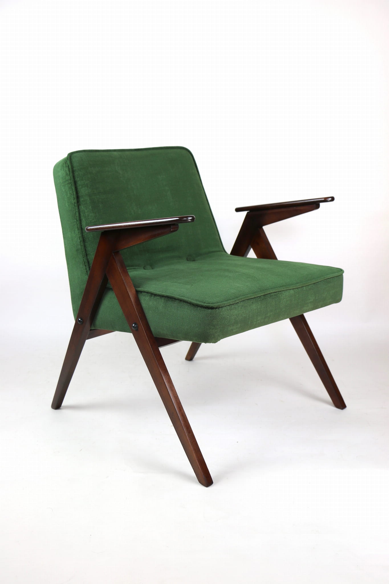 Fotel Bunny z lat 70. Został całkowicie odrestaurowany. Zyskał nowe obicie pokryte materiałem tapicerskim w kolorze zielonym w charakterystyczny strukturalny velvet z serii Symphony Mills - Chameleon. Stelaż drewniany z podłokietnikami w kolorze ciemnego drewna utrwalony lakierem.