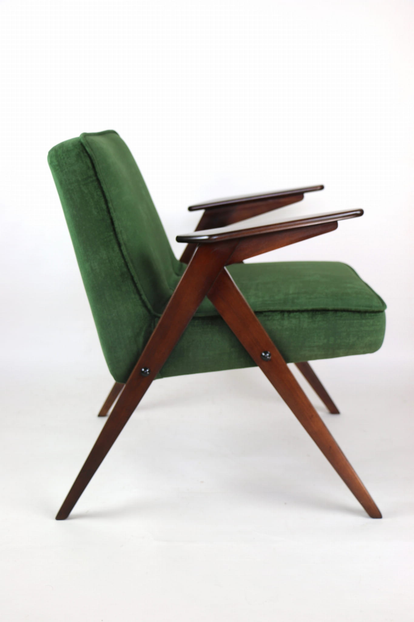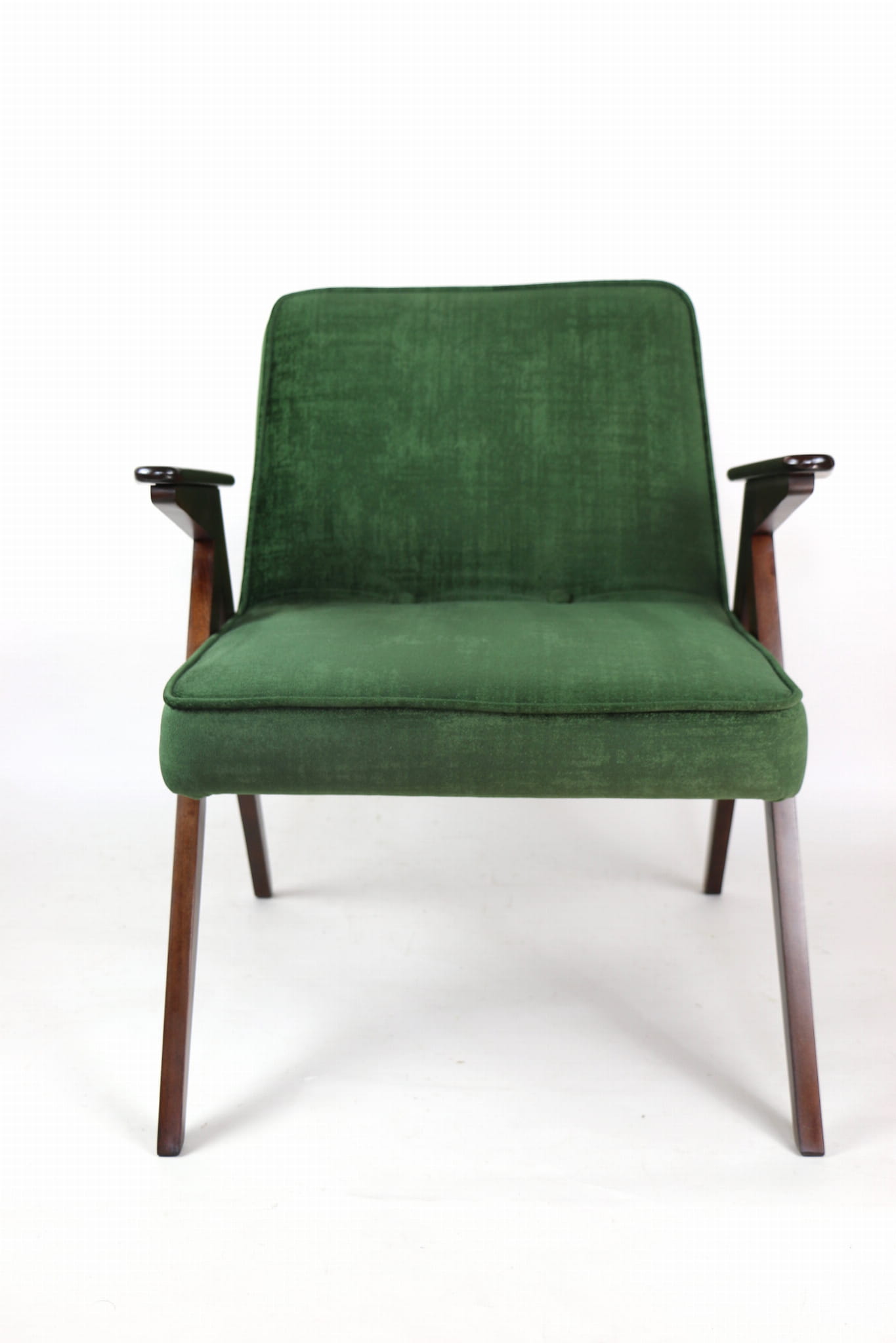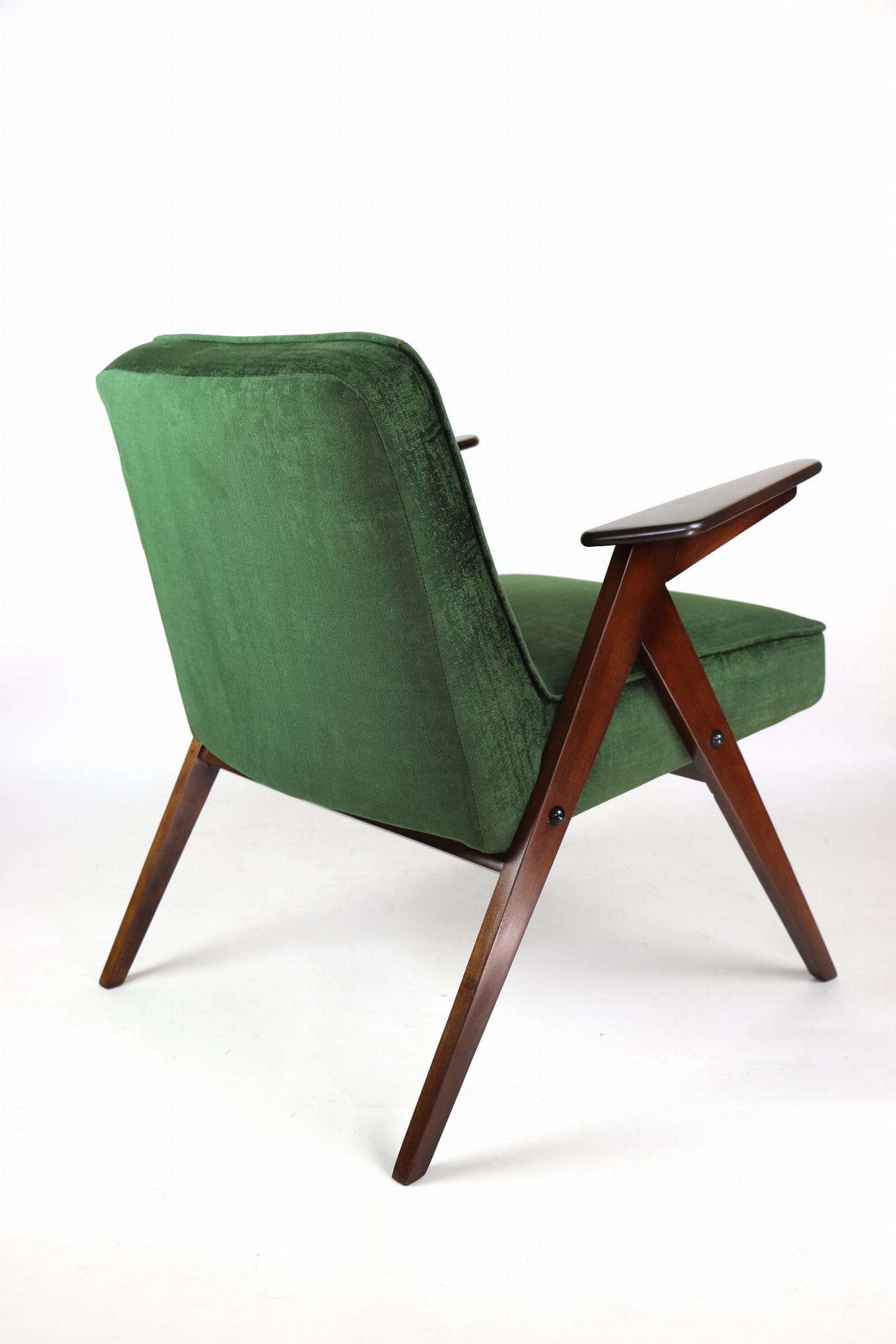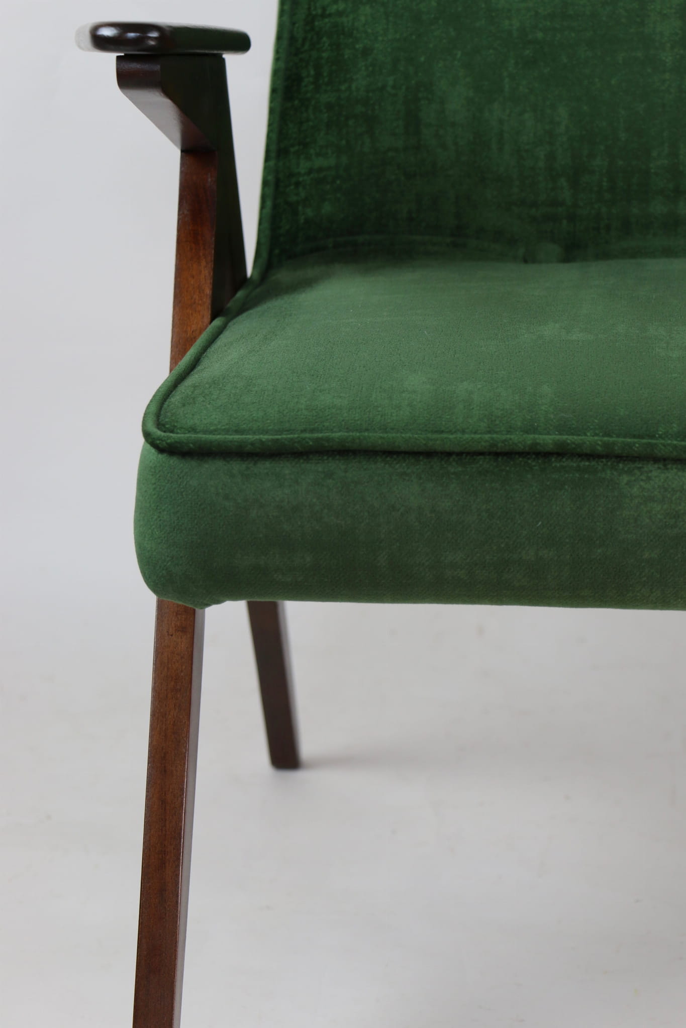 Fotel Bunny z lat 70. Został całkowicie odrestaurowany. Zyskał nowe obicie pokryte materiałem tapicerskim w kolorze zielonym w charakterystyczny strukturalny velvet z serii Symphony Mills - Chameleon. Stelaż drewniany z podłokietnikami w kolorze ciemnego drewna utrwalony lakierem.