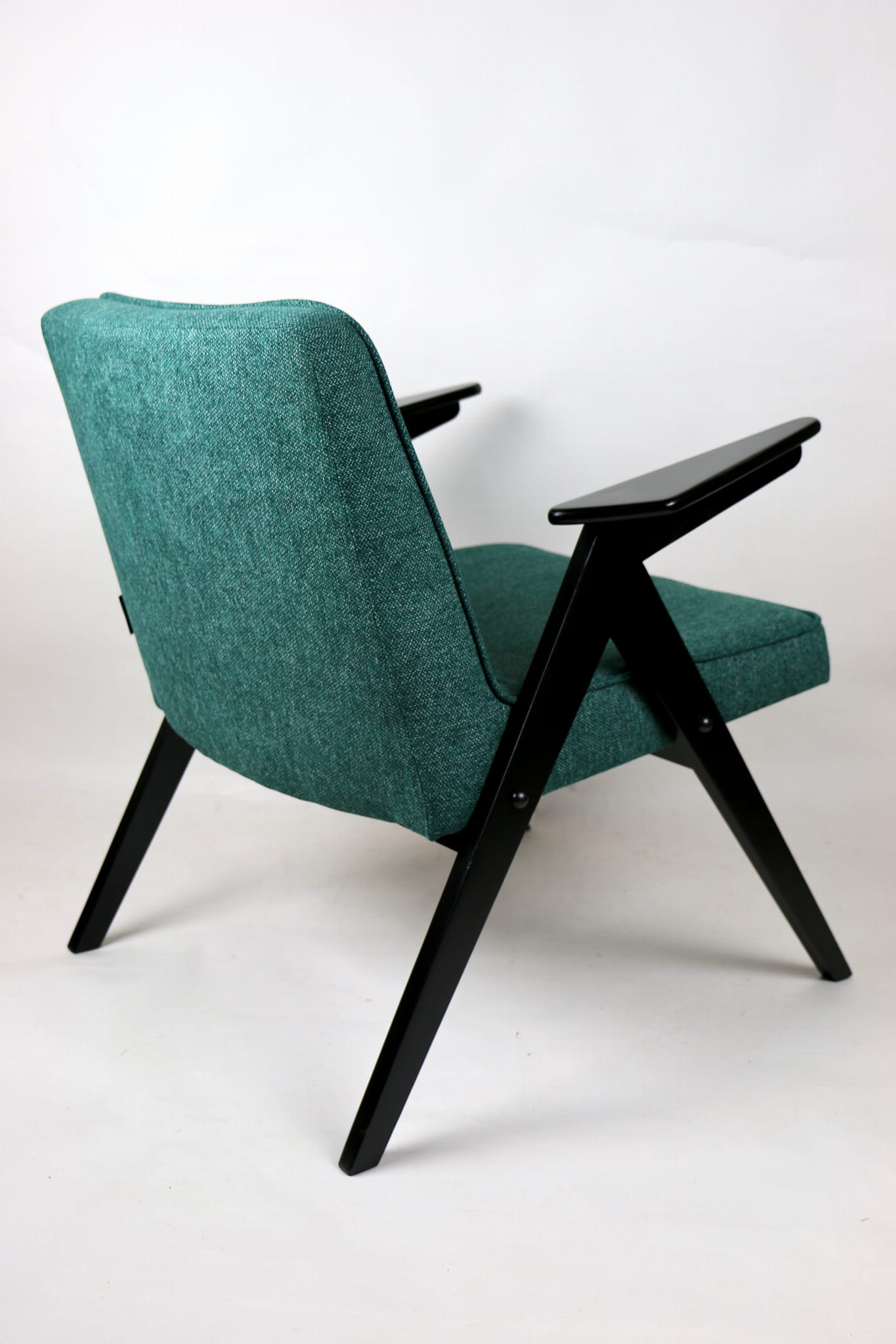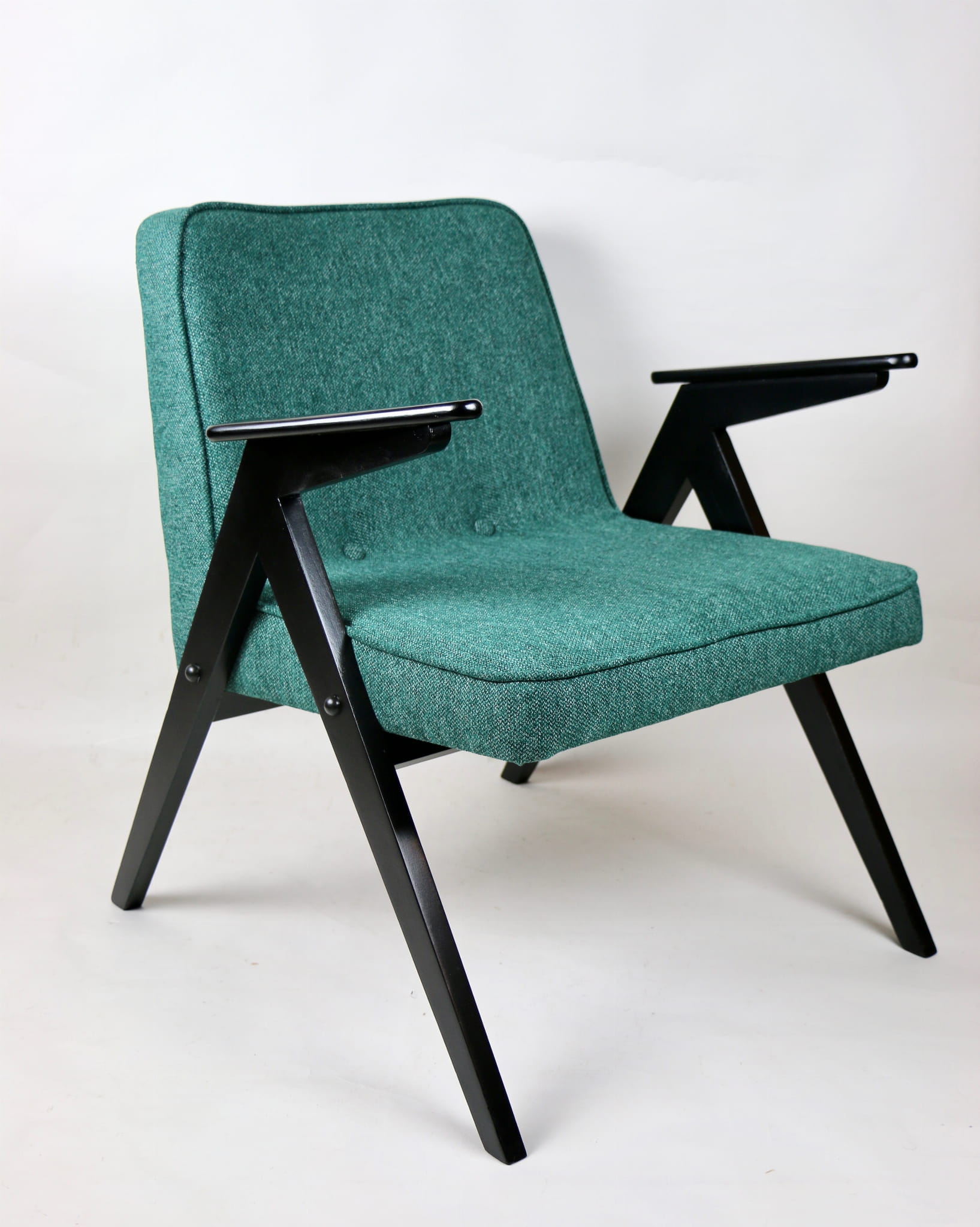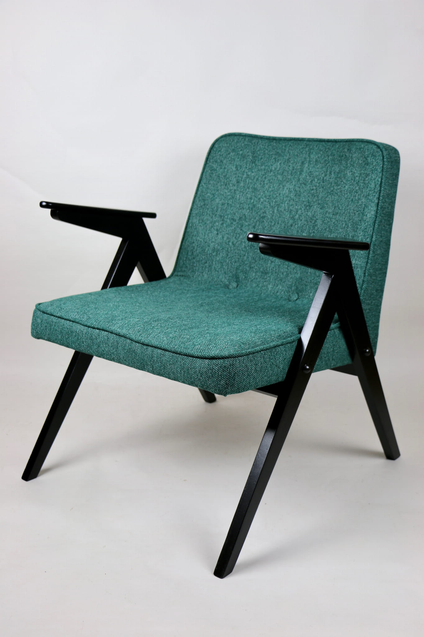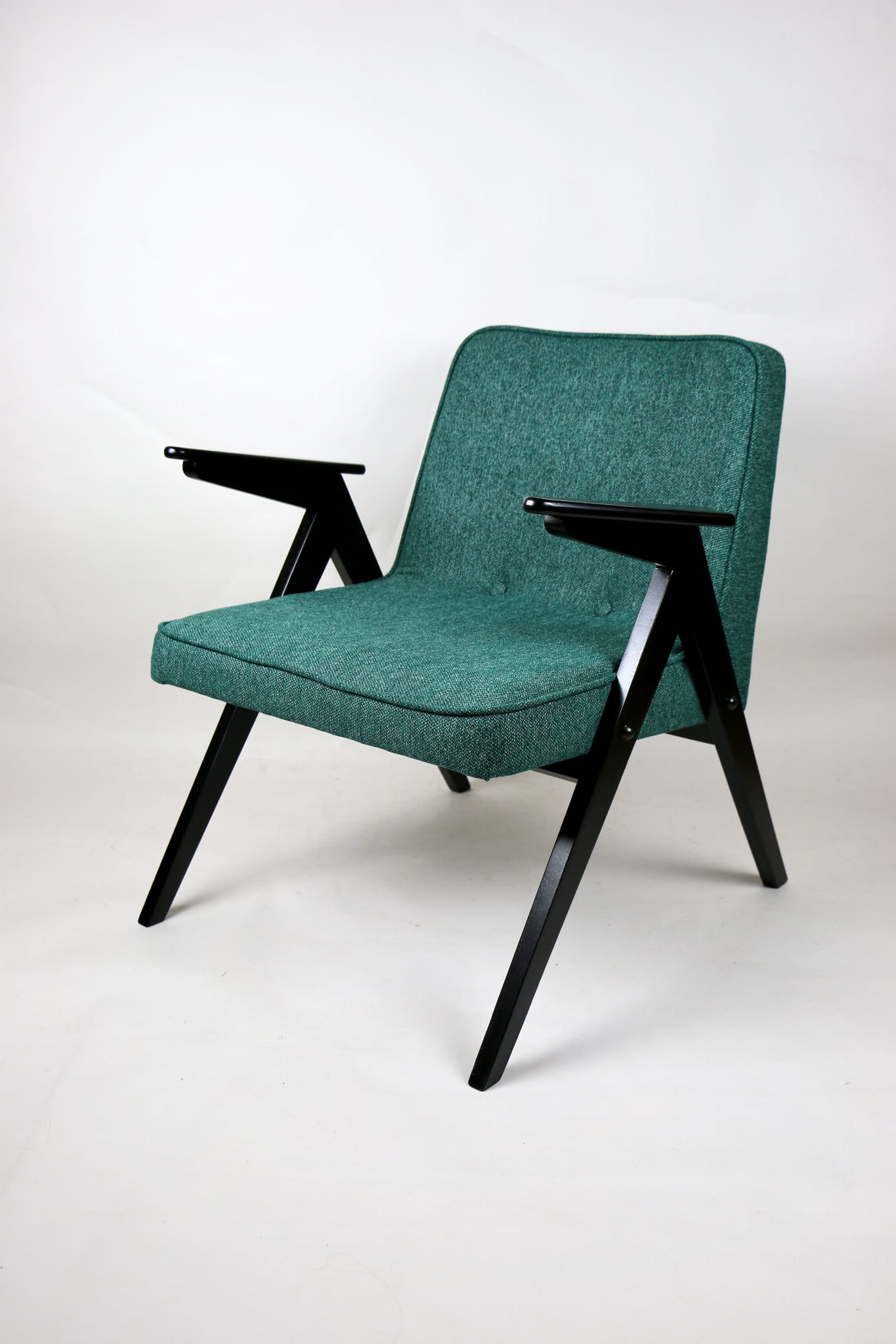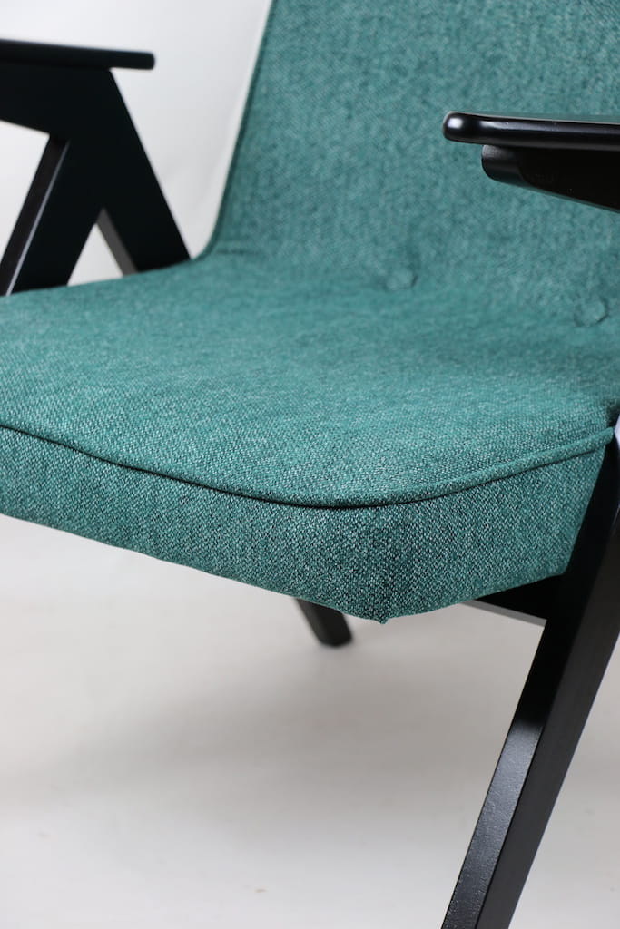 Fotel Bunny z lat 70. Został całkowicie odrestaurowany. Zyskał nowe obicie pokryte materiałem tapicerskim w kolorze zielonym w charakterystyczny strukturalny wzór z serii Symphony Mills - Queens. Stelaż drewniany z podłokietnikami w kolorze ciemnego drewna utrwalony lakierem.
