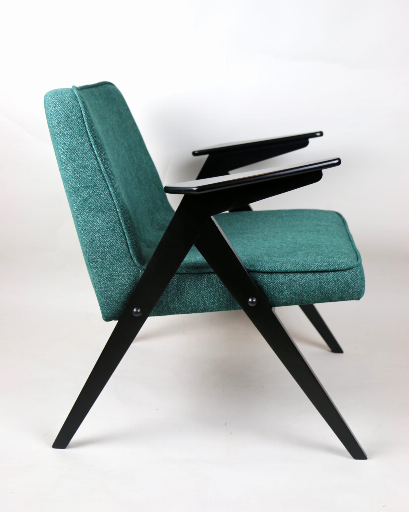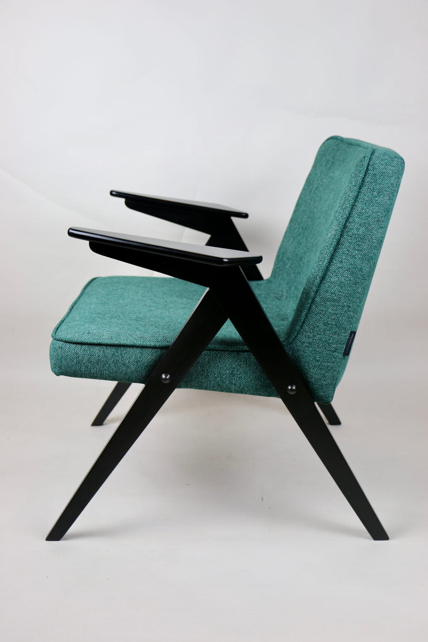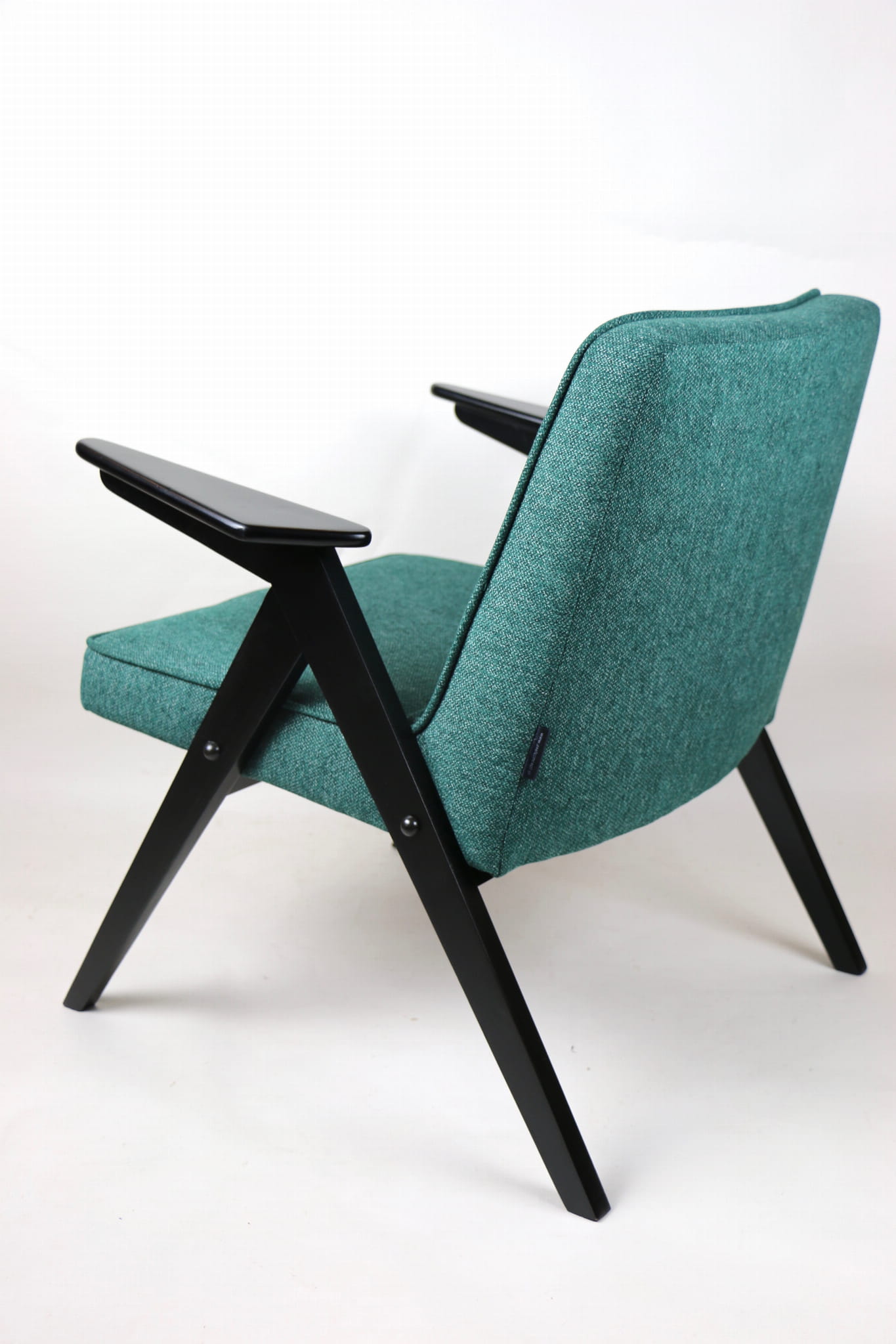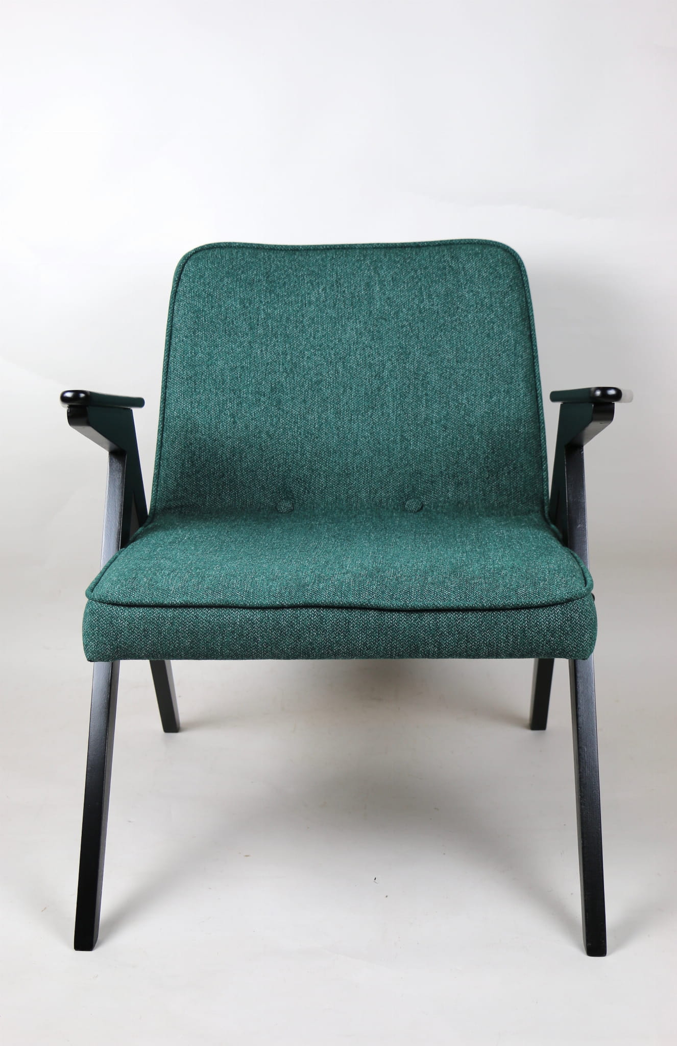 Fotel Bunny z lat 70. Został całkowicie odrestaurowany. Zyskał nowe obicie pokryte materiałem tapicerskim w kolorze zielonym w charakterystyczny strukturalny wzór z serii Symphony Mills - Queens. Stelaż drewniany z podłokietnikami w kolorze ciemnego drewna utrwalony lakierem.