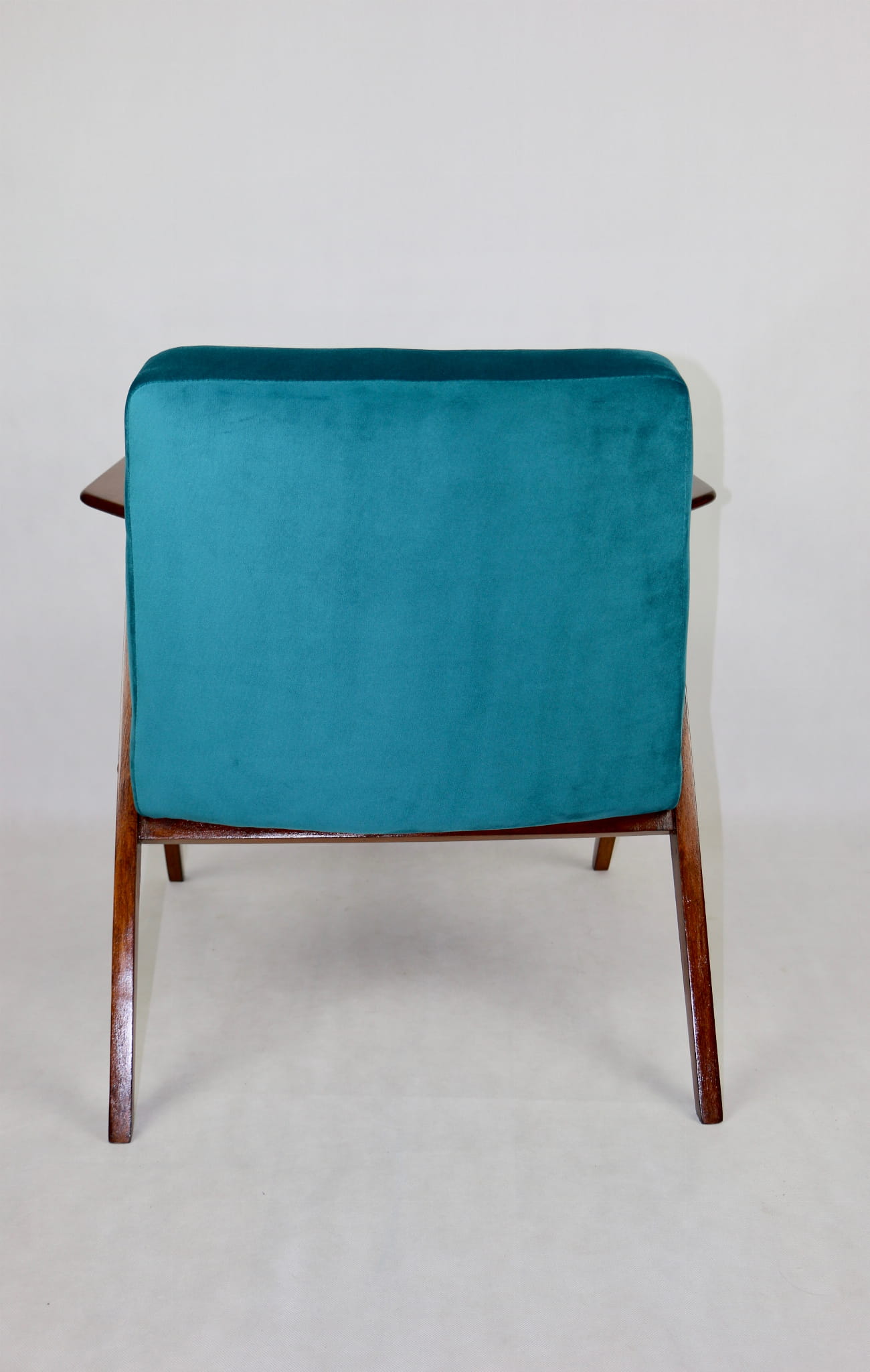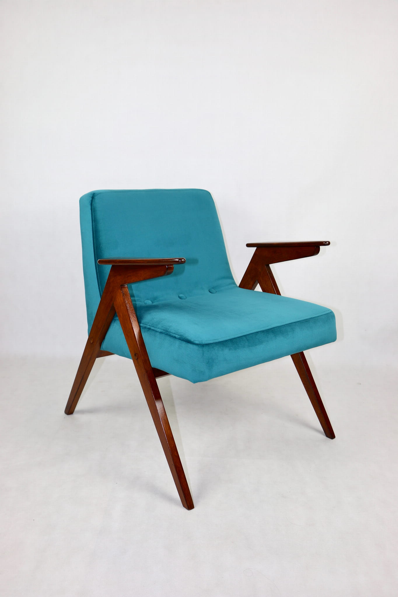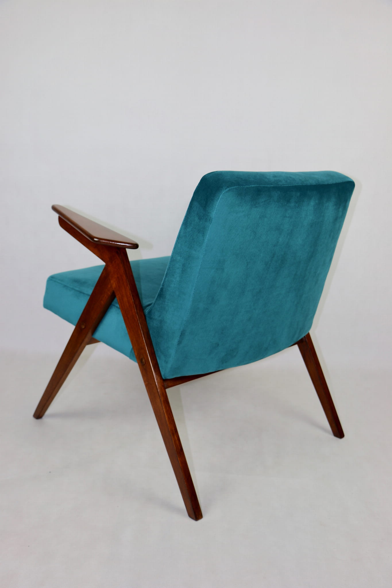 Fotel Bunny projektu Józefa Chierowskiego, który został całkowicie odrestaurowany. Nowe obicie pokryte aksamitnym materiałem tapicerskim w zielono-morskim kolorze z serii Paris. Stelaż drewniany z podłokietnikami w kolorze ciemnego drewna.
