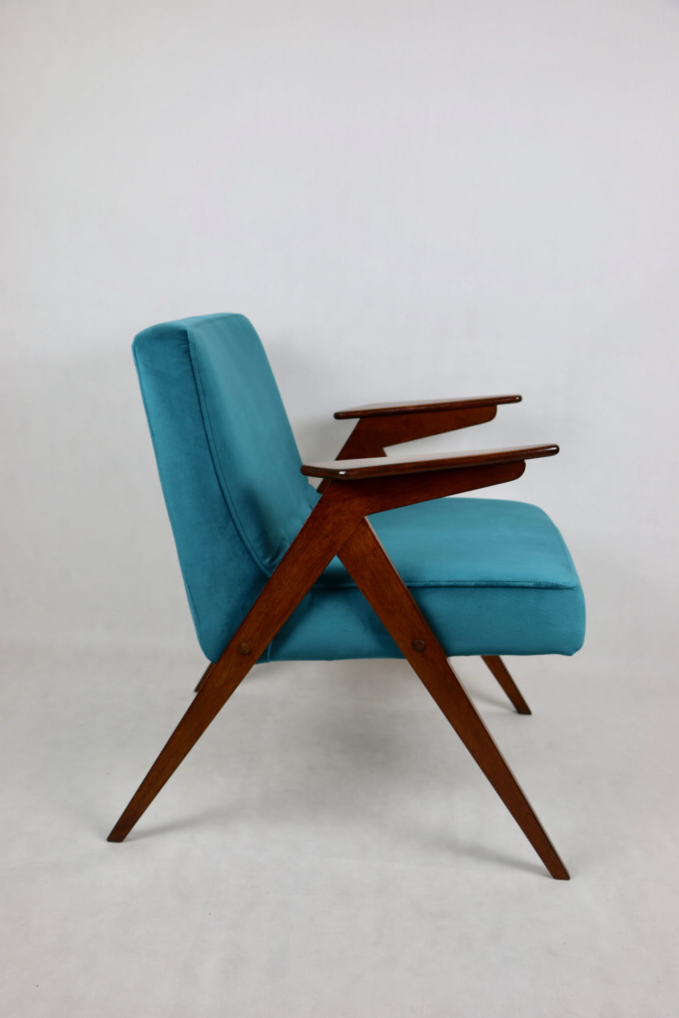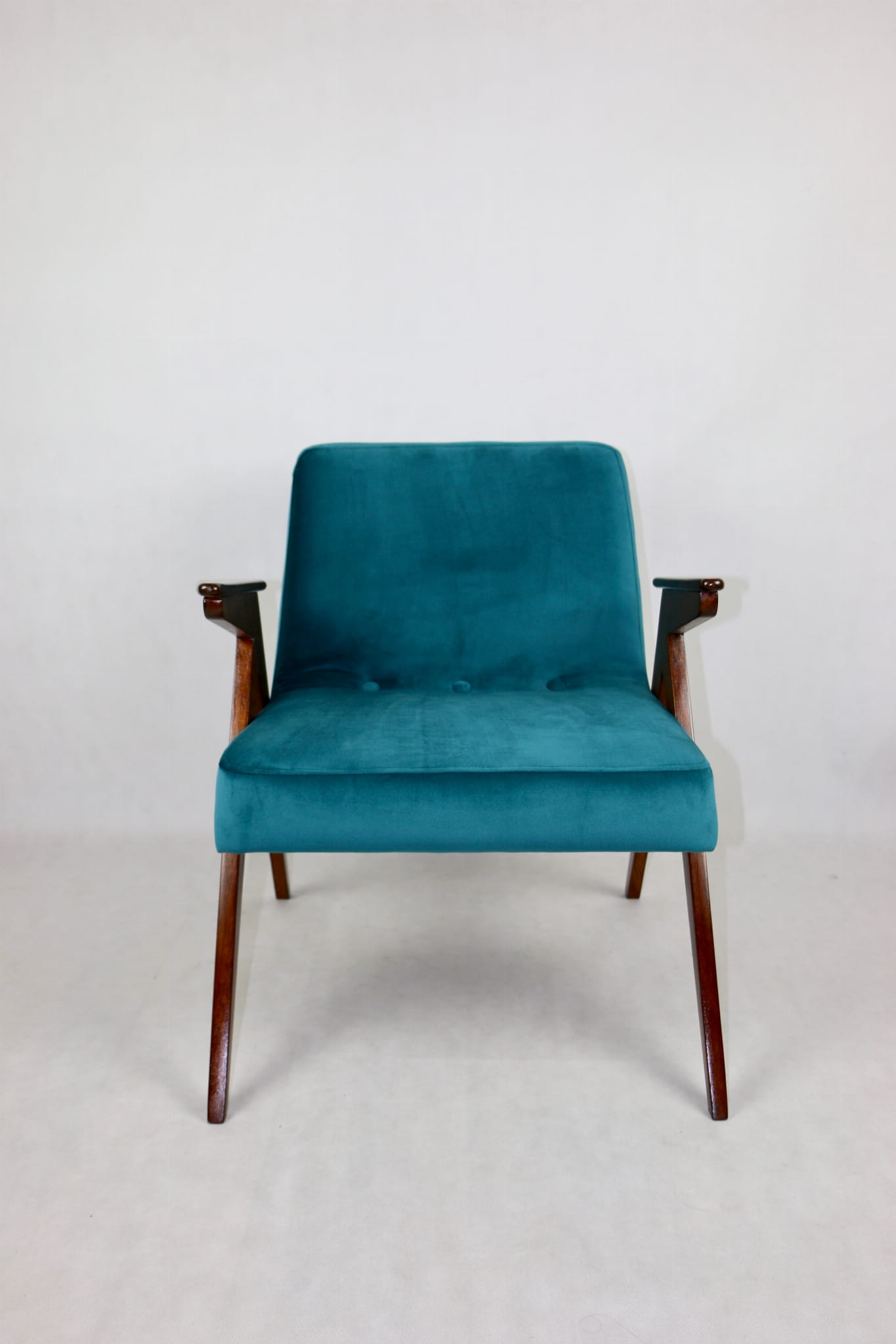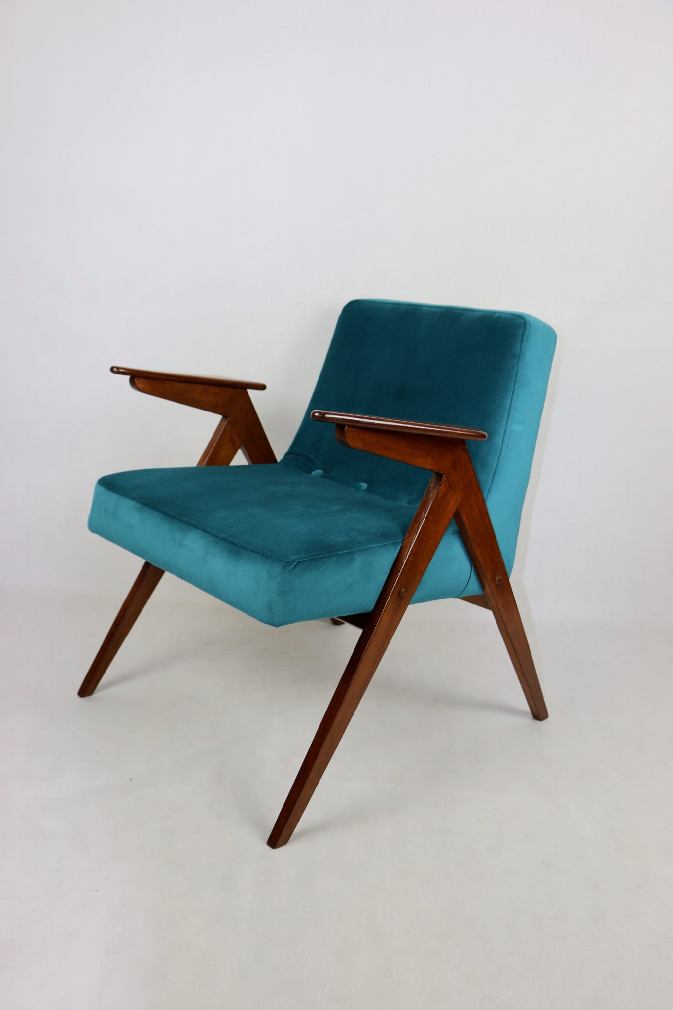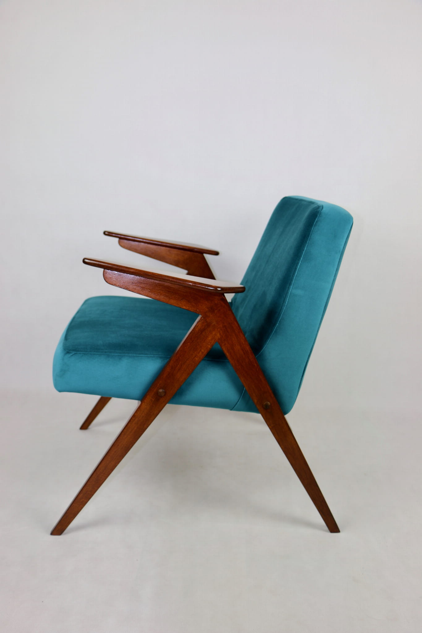 Fotel Bunny projektu Józefa Chierowskiego, który został całkowicie odrestaurowany. Nowe obicie pokryte aksamitnym materiałem tapicerskim w zielono-morskim kolorze z serii Paris. Stelaż drewniany z podłokietnikami w kolorze ciemnego drewna.