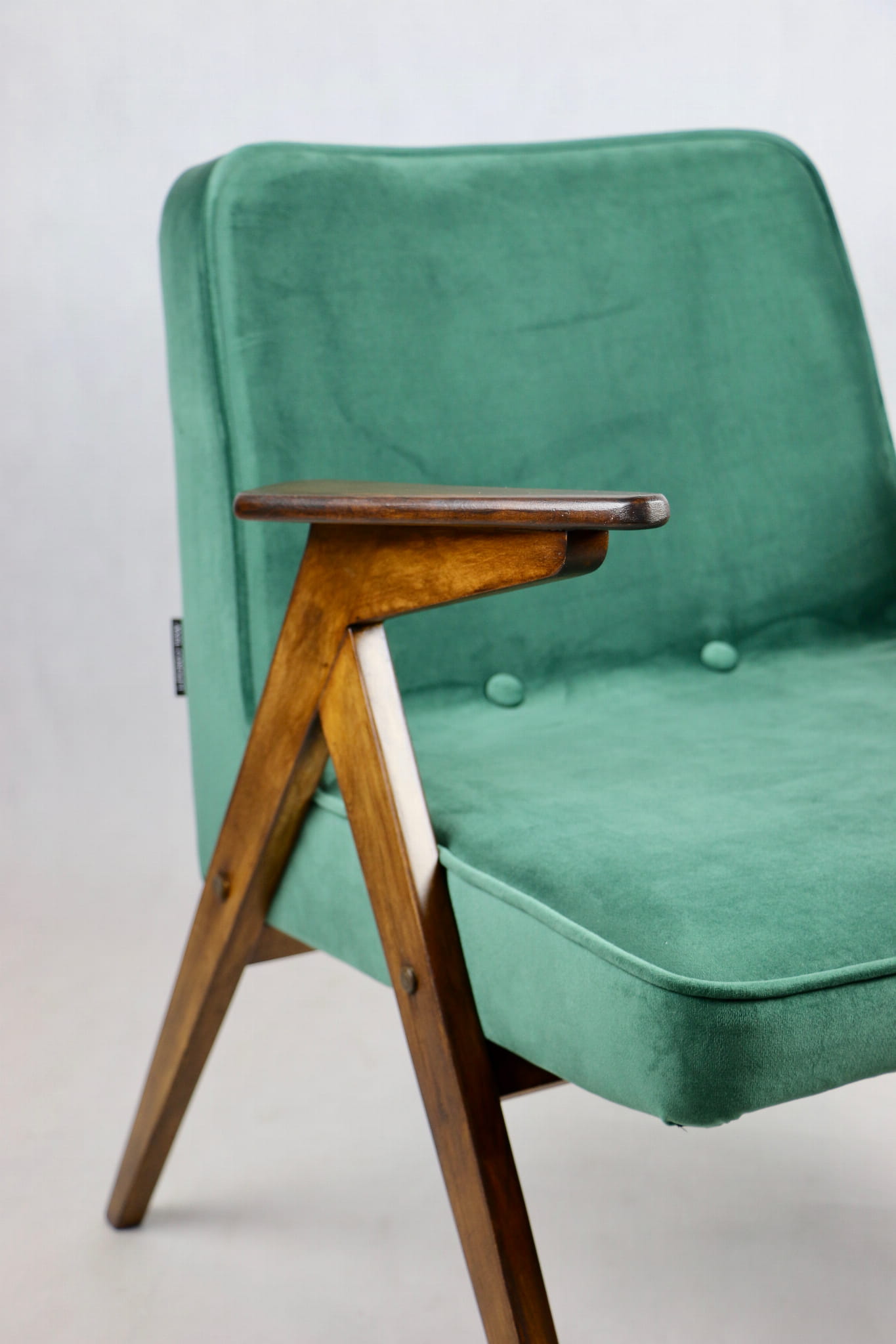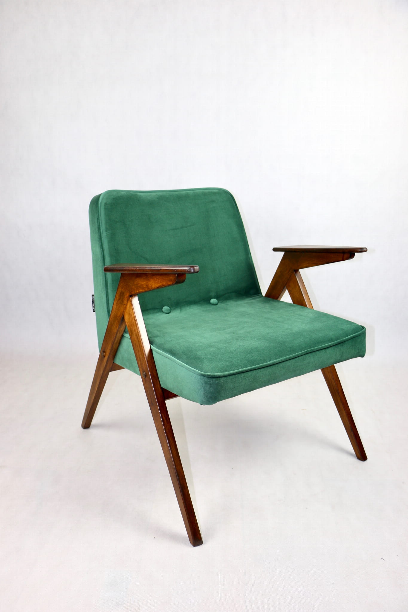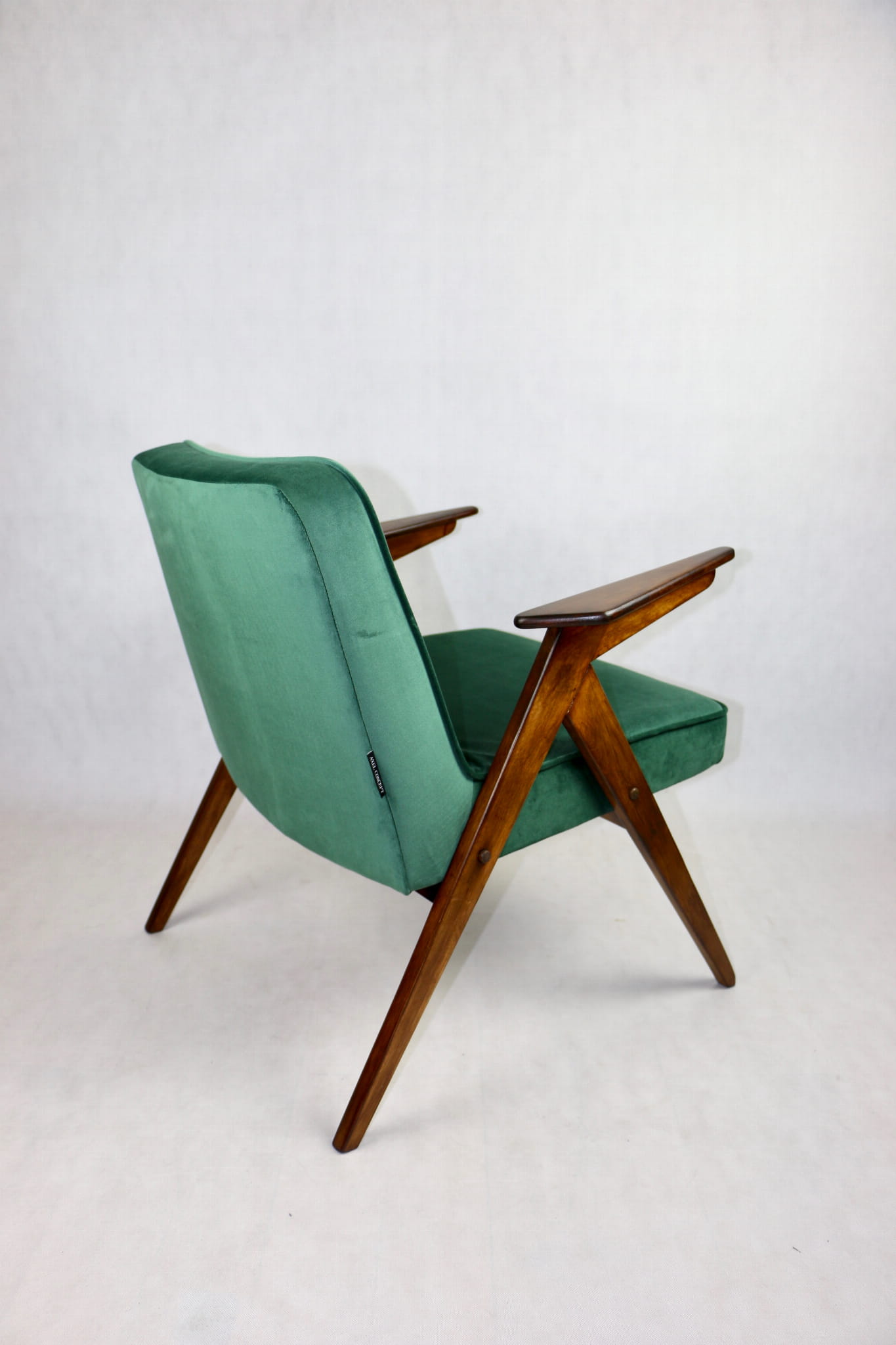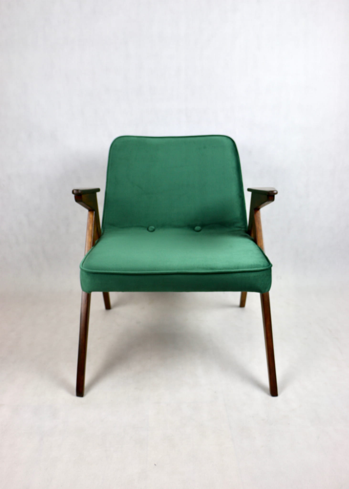 Fotel Bunny projektu Józefa Chierowskiego, który został całkowicie odrestaurowany. Nowe obicie pokryte aksamitnym materiałem tapicerskim w zielonym kolorze z serii Paris. Stelaż drewniany z podłokietnikami w kolorze ciemniejszego drewna.