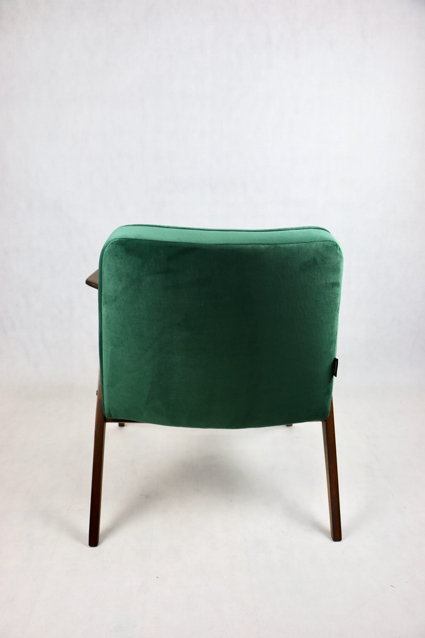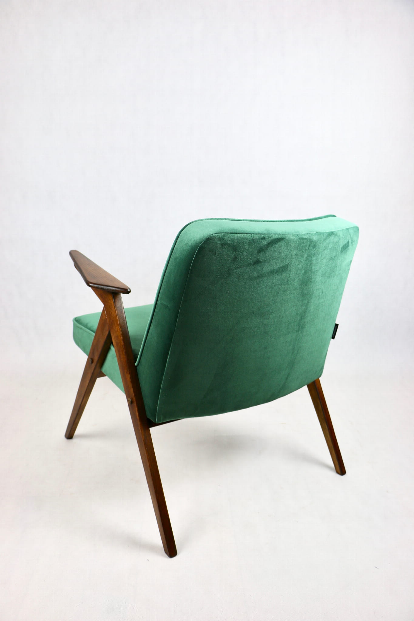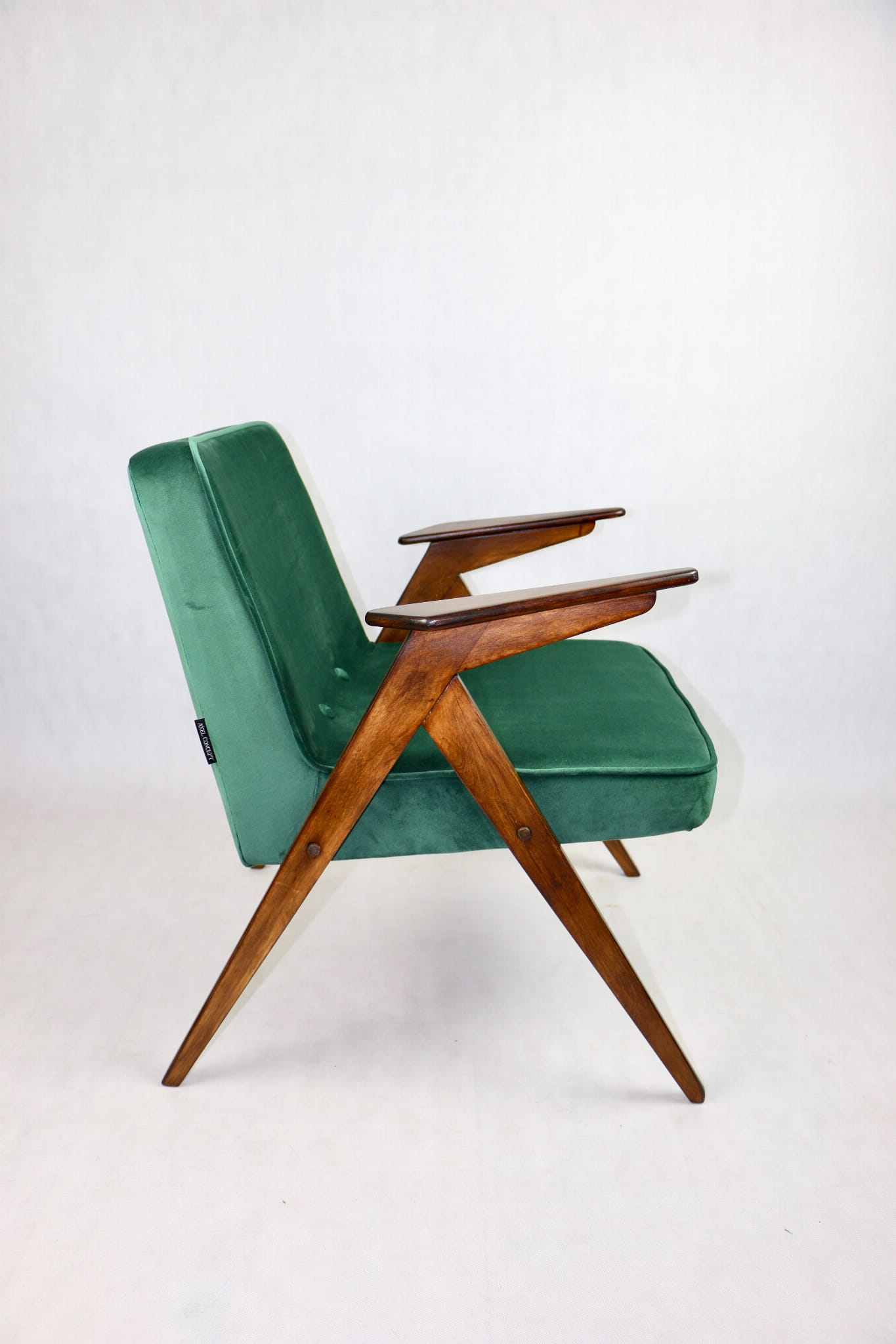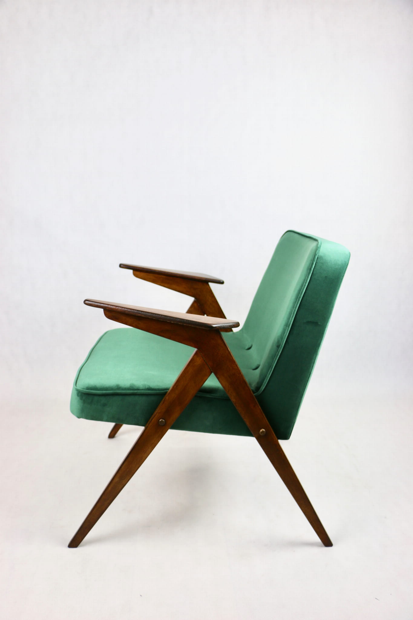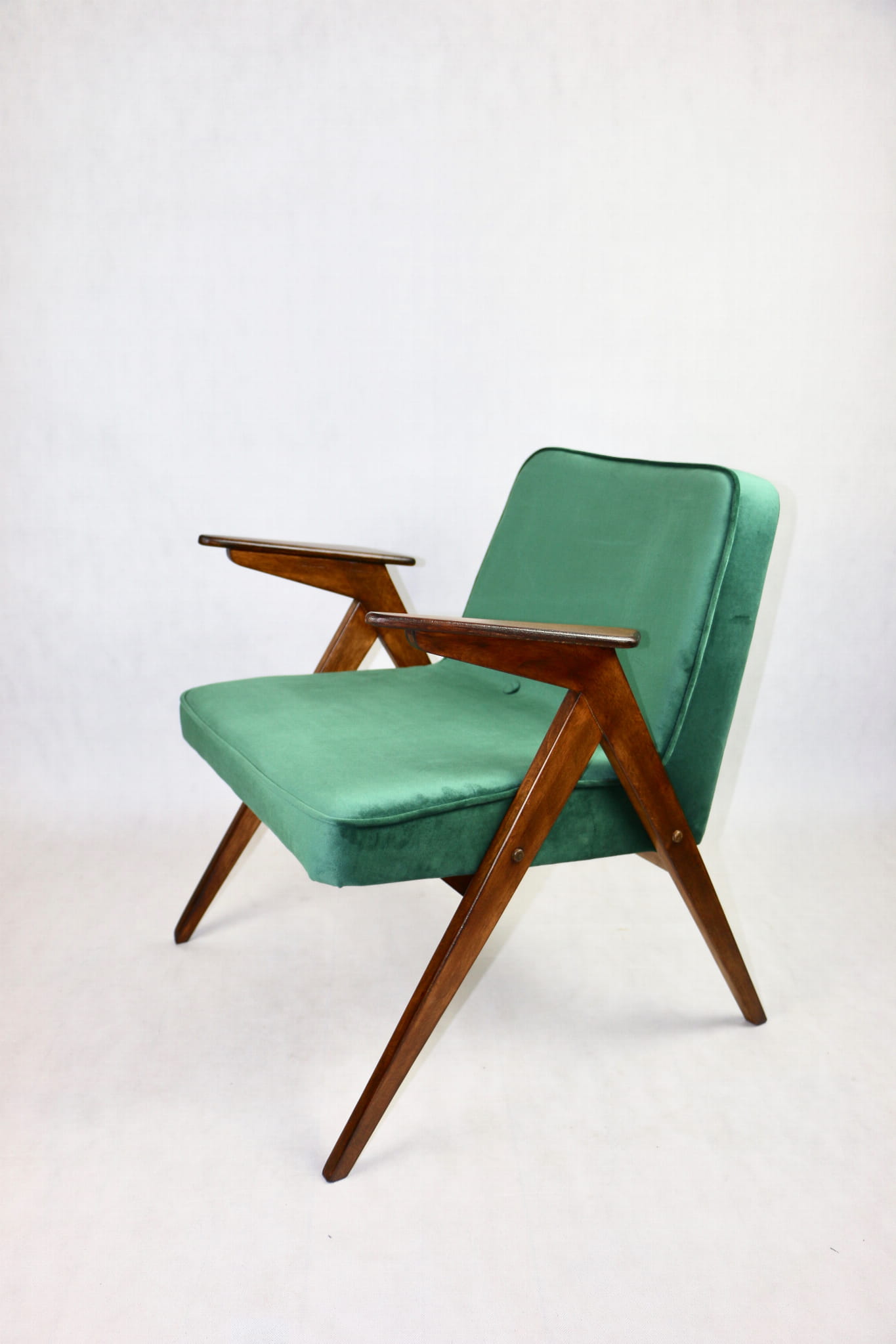 Fotel Bunny projektu Józefa Chierowskiego, który został całkowicie odrestaurowany. Nowe obicie pokryte aksamitnym materiałem tapicerskim w zielonym kolorze z serii Paris. Stelaż drewniany z podłokietnikami w kolorze ciemniejszego drewna.