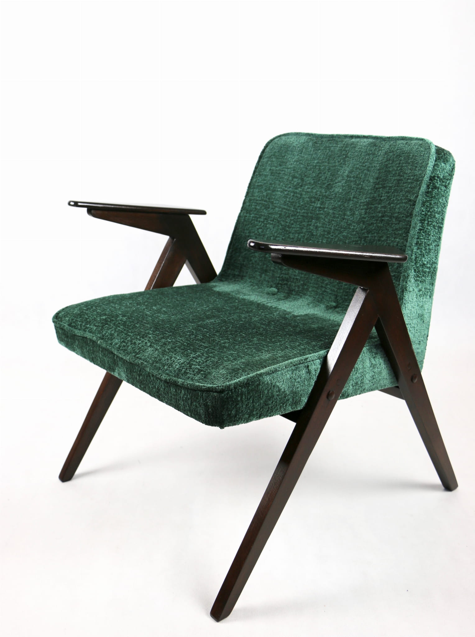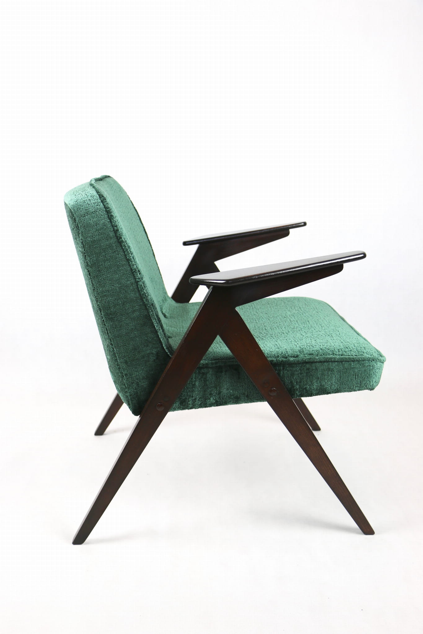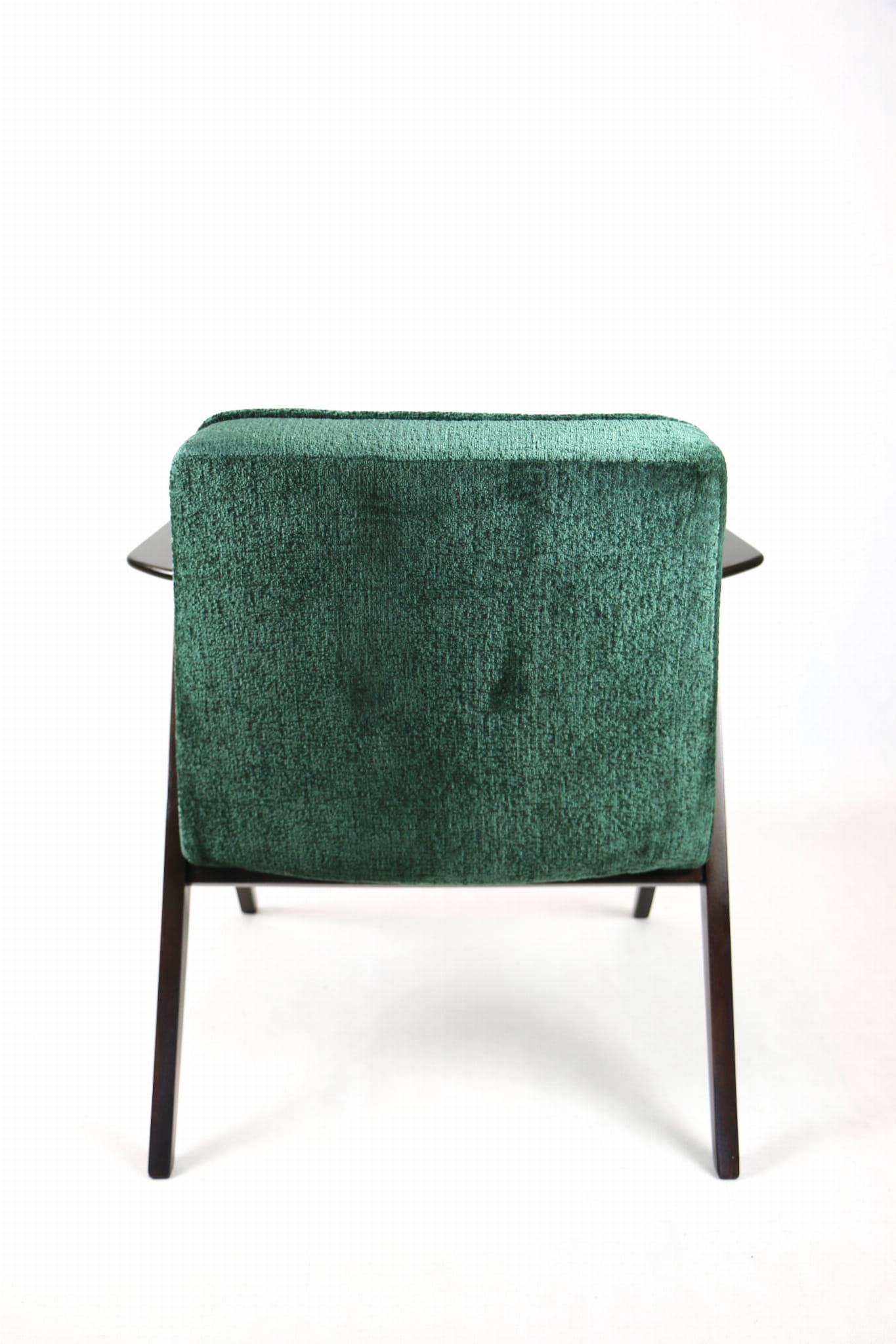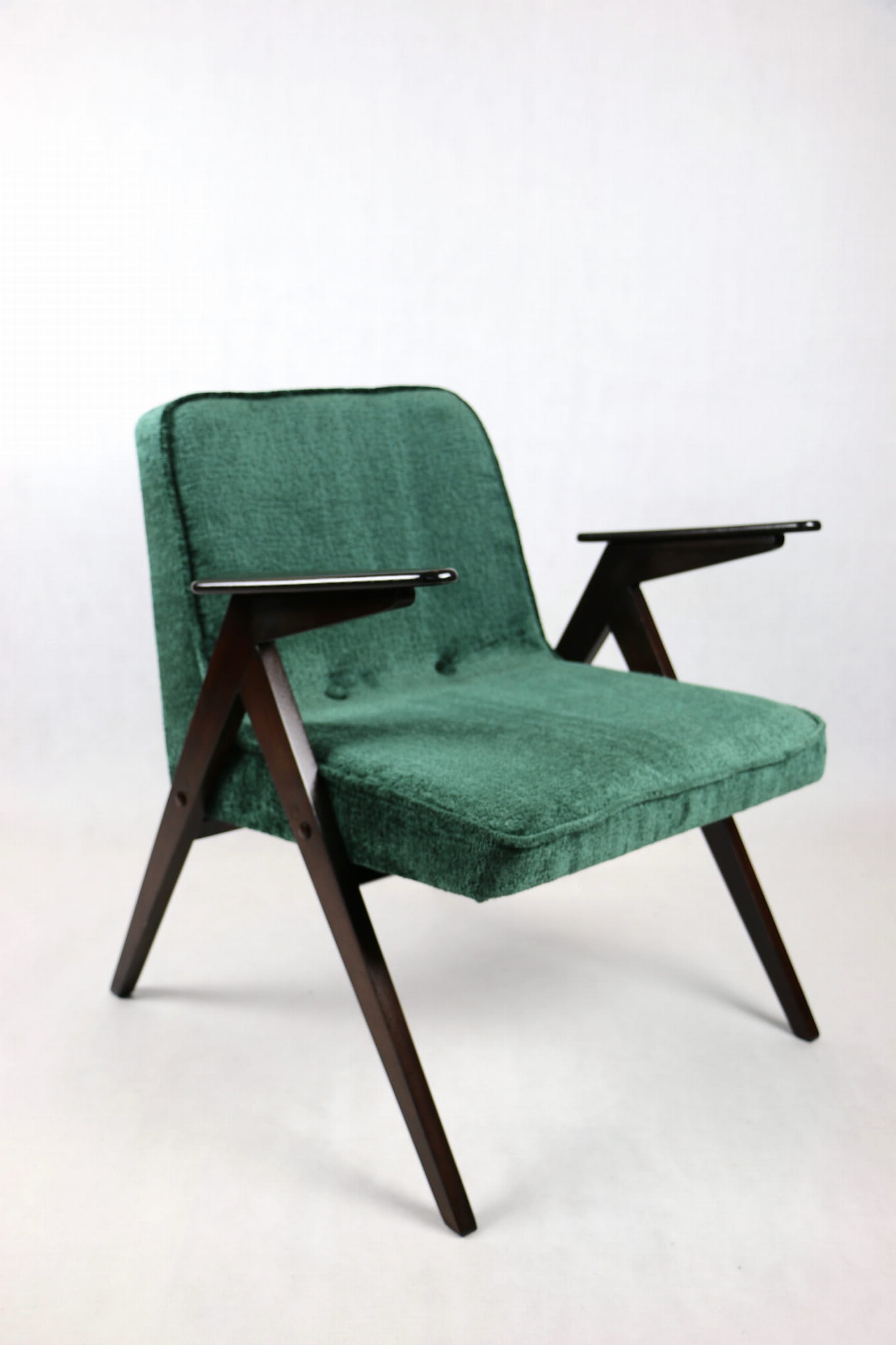 Fotel Bunny projektu Józefa Chierowskiego, który został całkowicie odrestaurowany. Nowe obicie pokryte strukturalnym materiałem tapicerskim w zielonym kolorze z serii Bergen. Stelaż drewniany z podłokietnikami w kolorze ciemnego drewna.