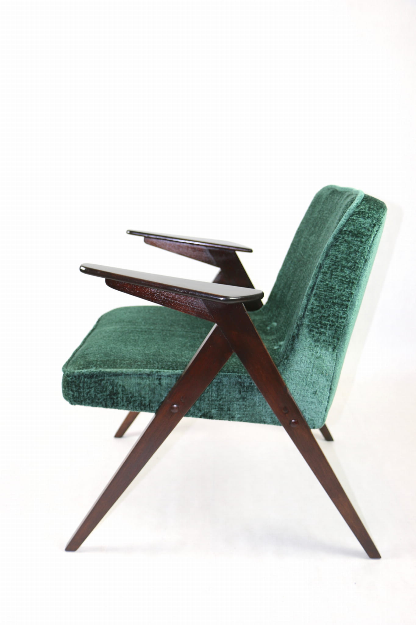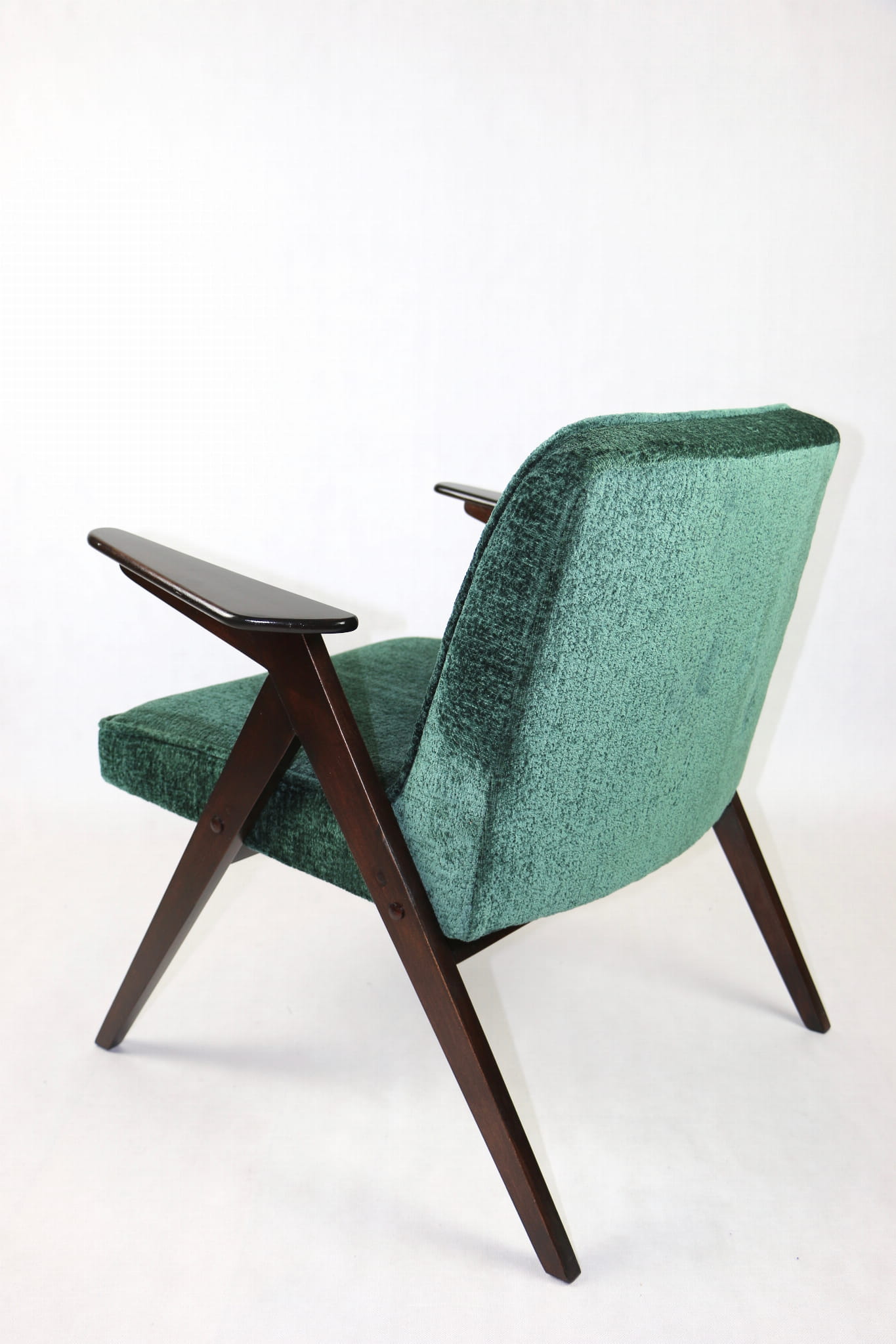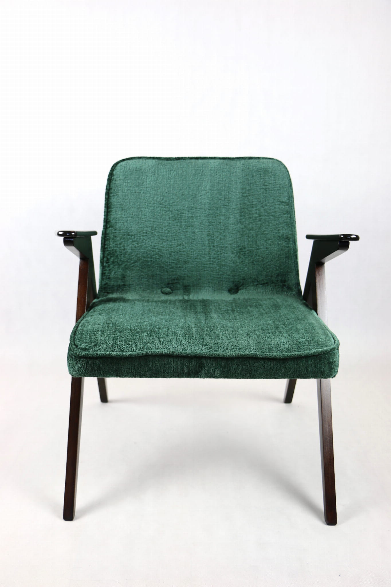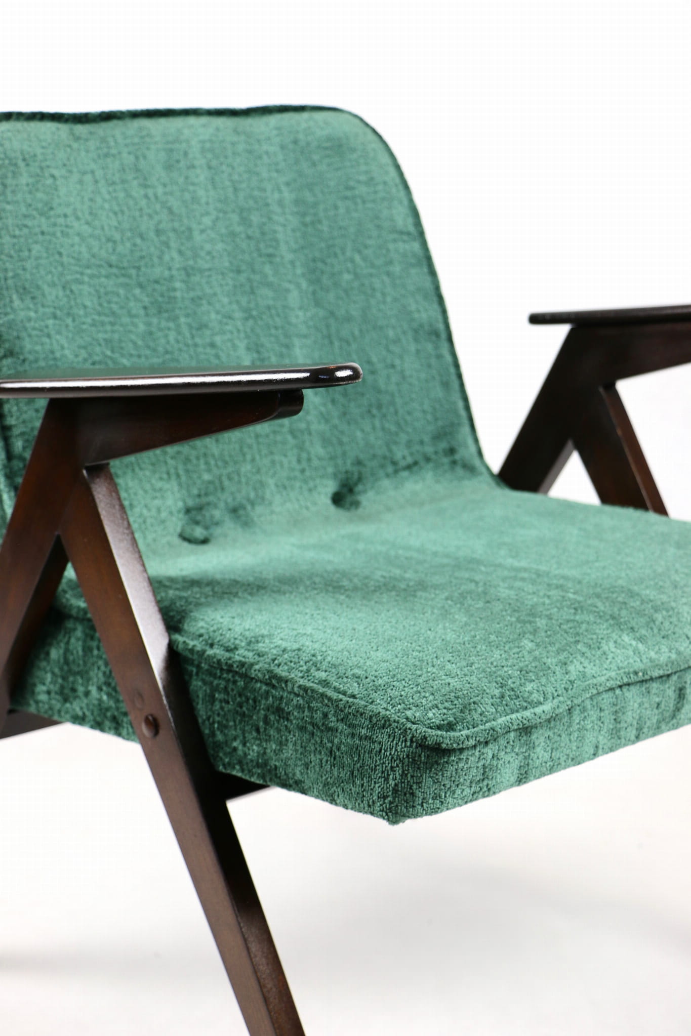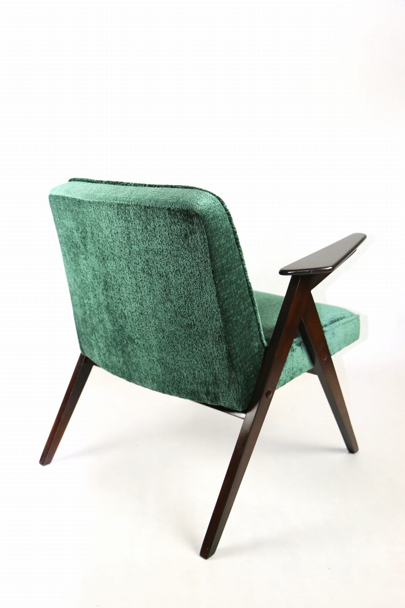 Fotel Bunny projektu Józefa Chierowskiego, który został całkowicie odrestaurowany. Nowe obicie pokryte strukturalnym materiałem tapicerskim w zielonym kolorze z serii Bergen. Stelaż drewniany z podłokietnikami w kolorze ciemnego drewna.