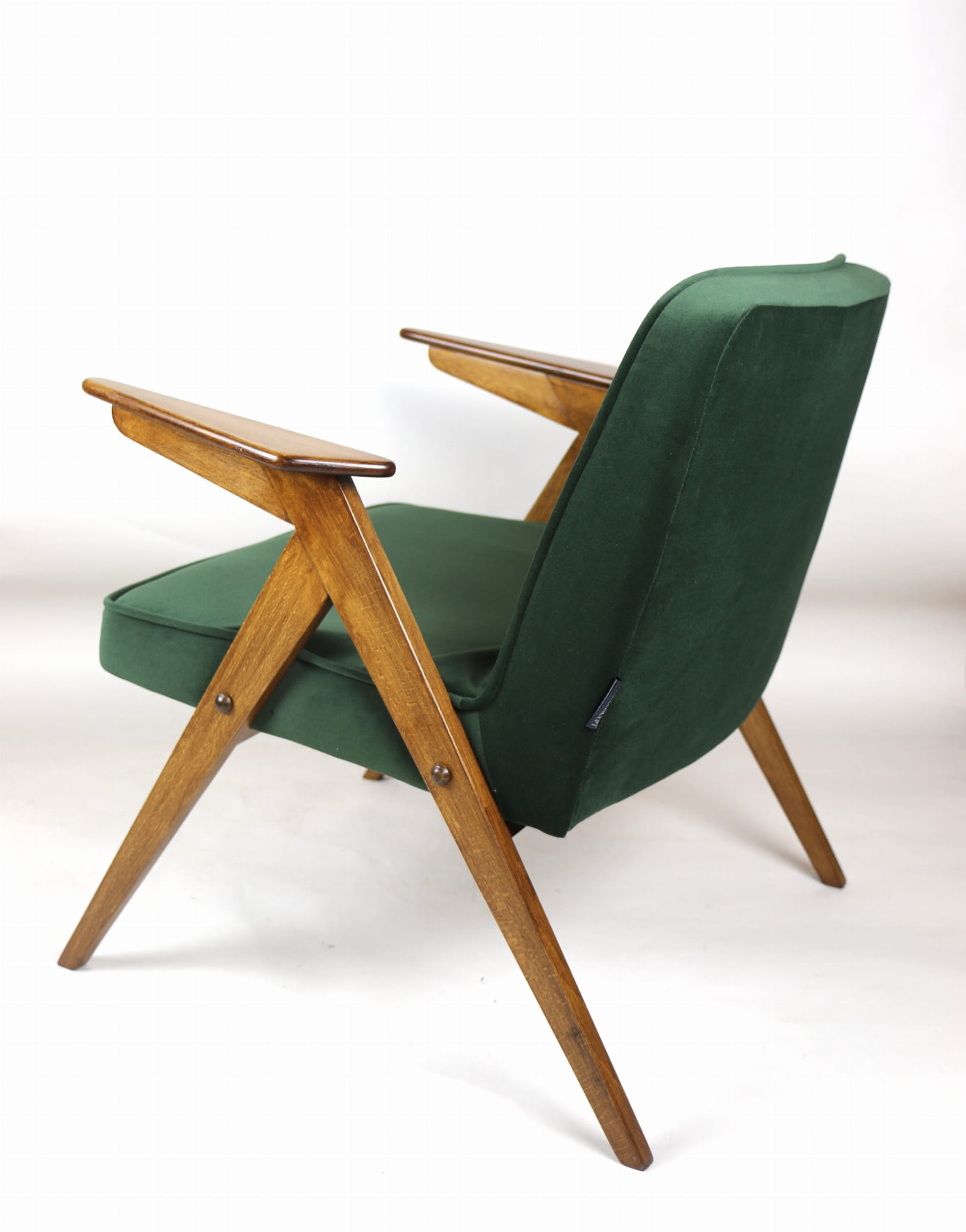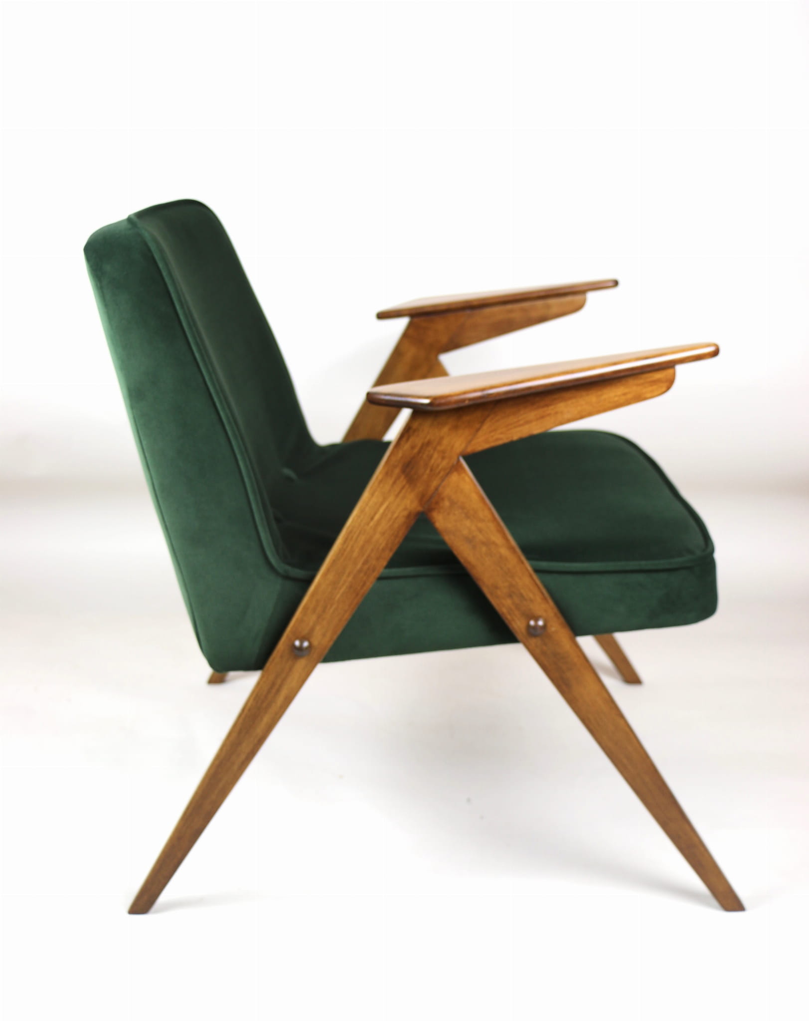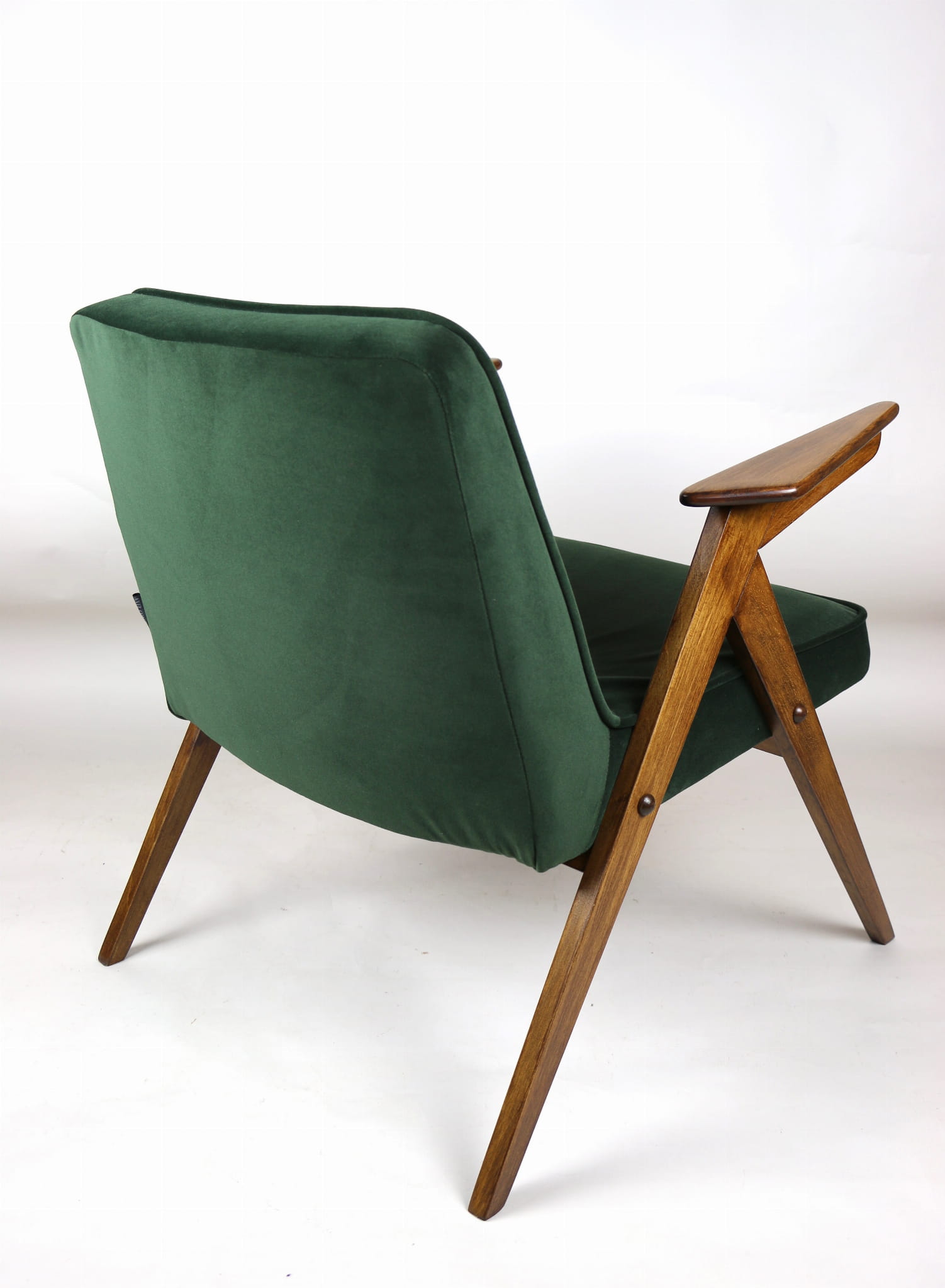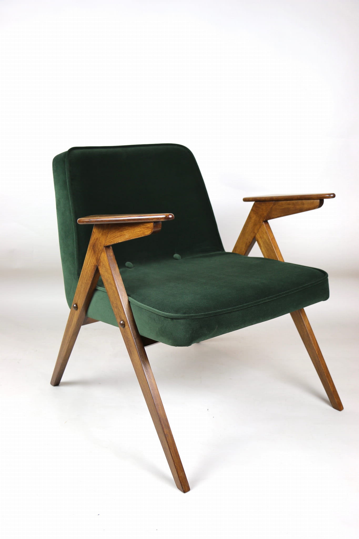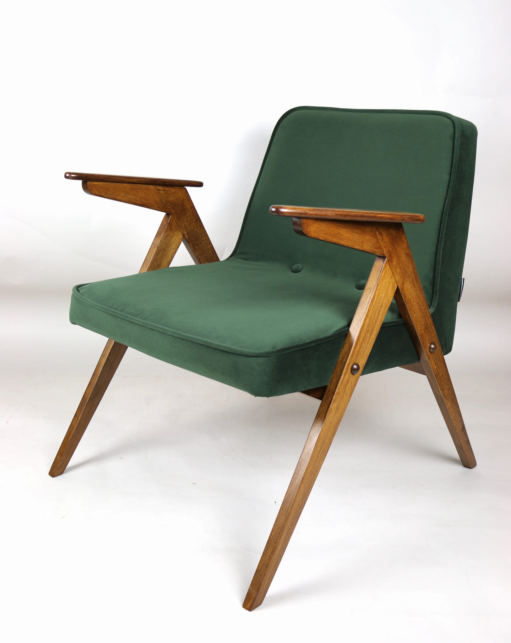 Fotel Bunny projektu Józefa Chierowskiego, który został całkowicie odrestaurowany. Nowe obicie pokryte aksamitnym materiałem tapicerskim w zielono-oliwkowym kolorze z serii Jade. Stelaż drewniany z podłokietnikami w kolorze ciemniejszego drewna.