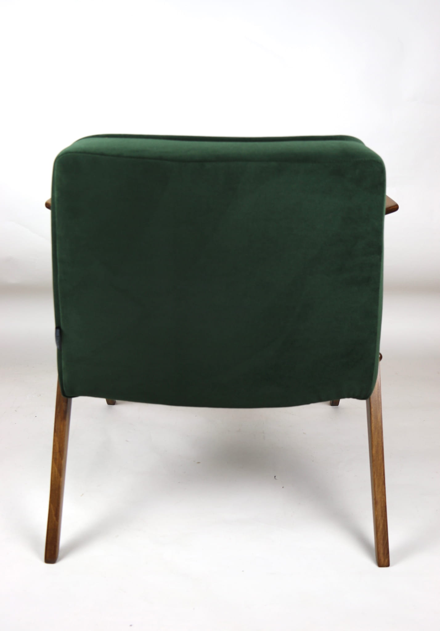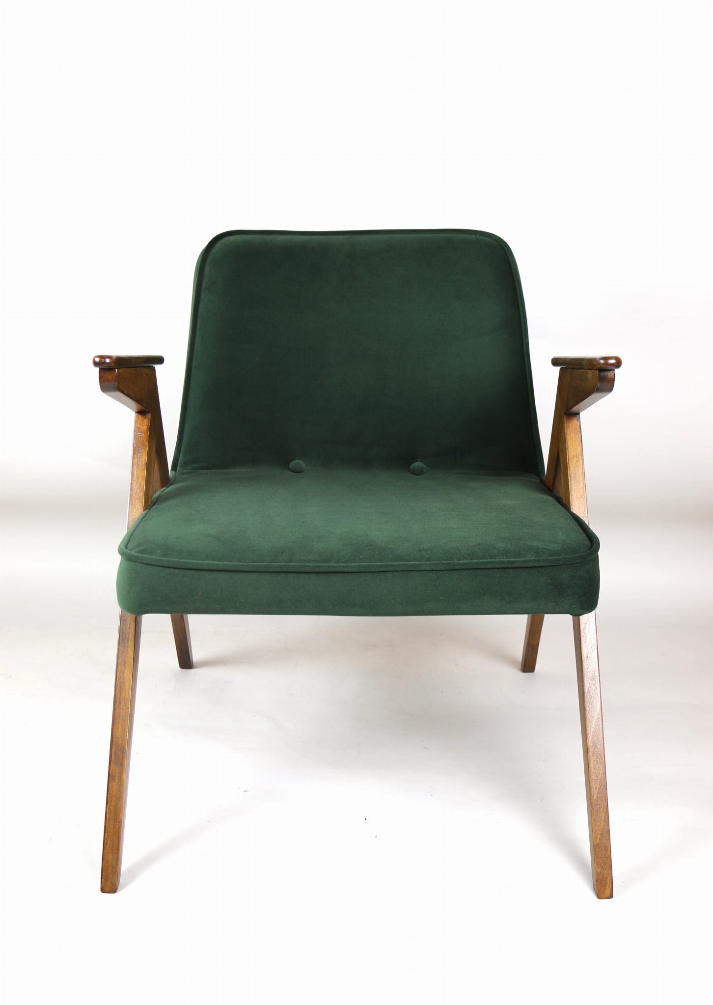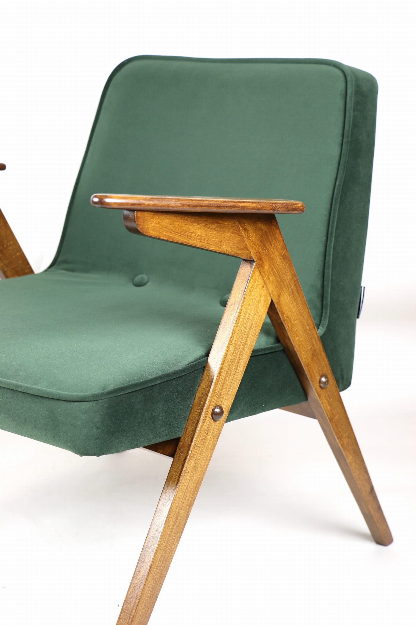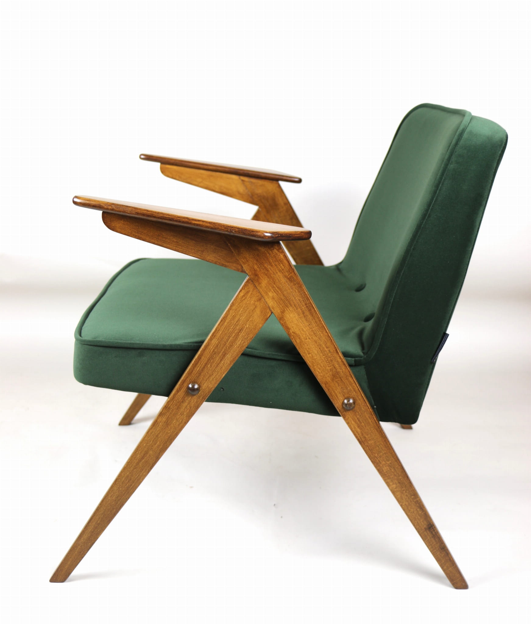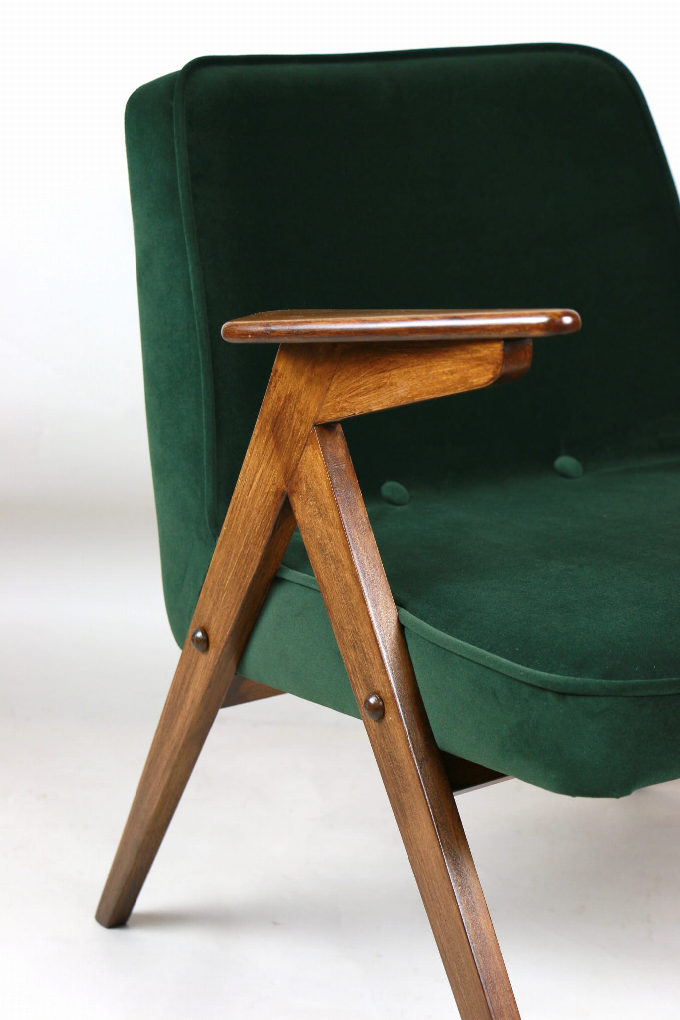 Fotel Bunny projektu Józefa Chierowskiego, który został całkowicie odrestaurowany. Nowe obicie pokryte aksamitnym materiałem tapicerskim w zielono-oliwkowym kolorze z serii Jade. Stelaż drewniany z podłokietnikami w kolorze ciemniejszego drewna.