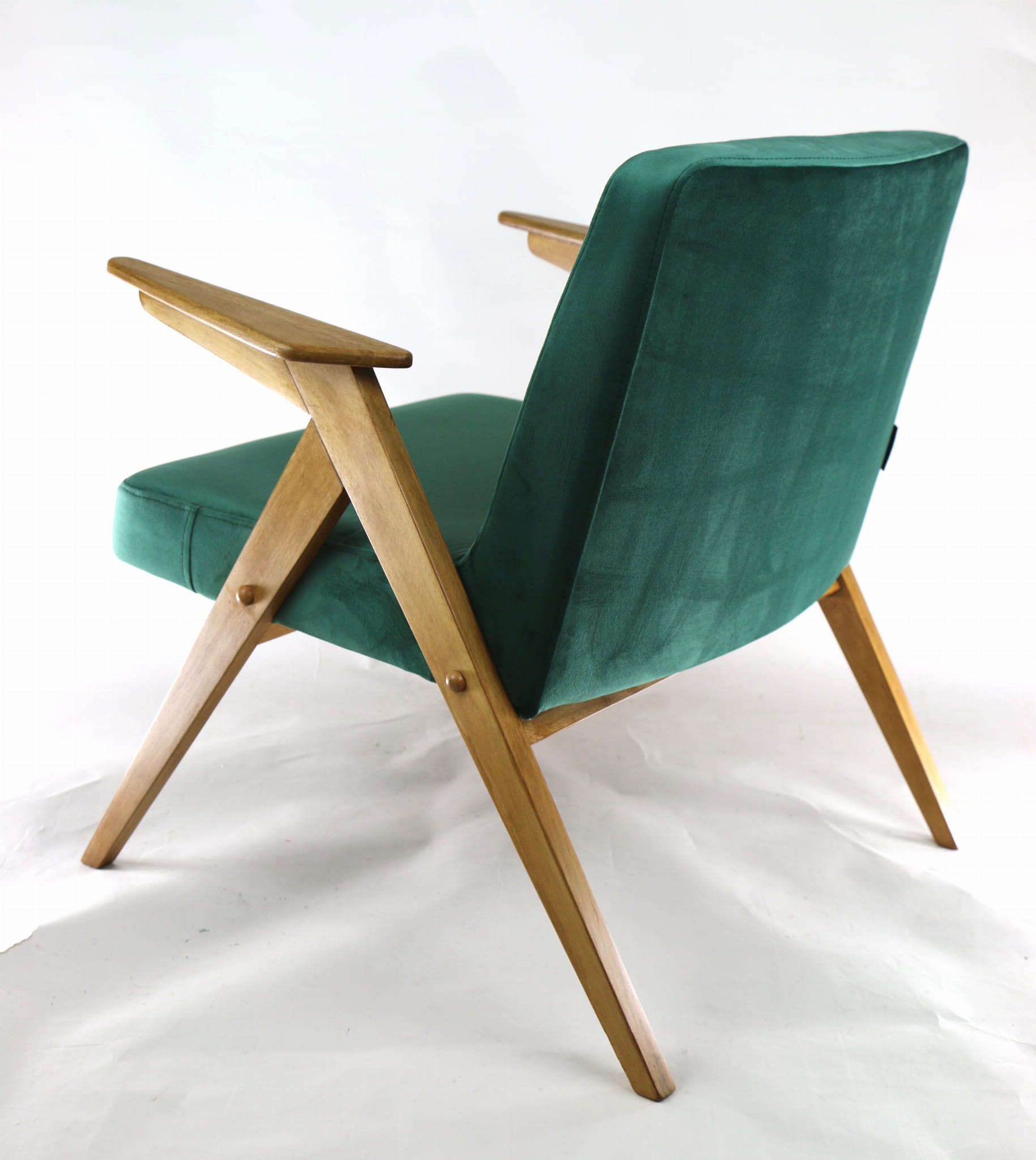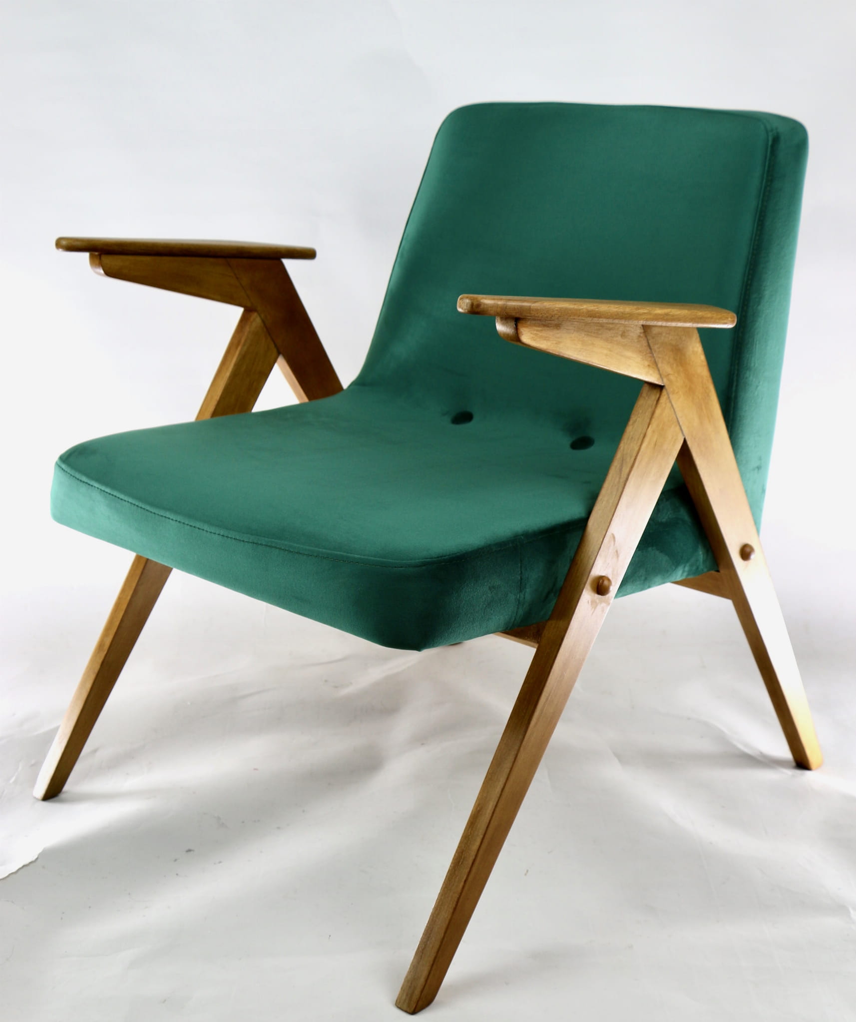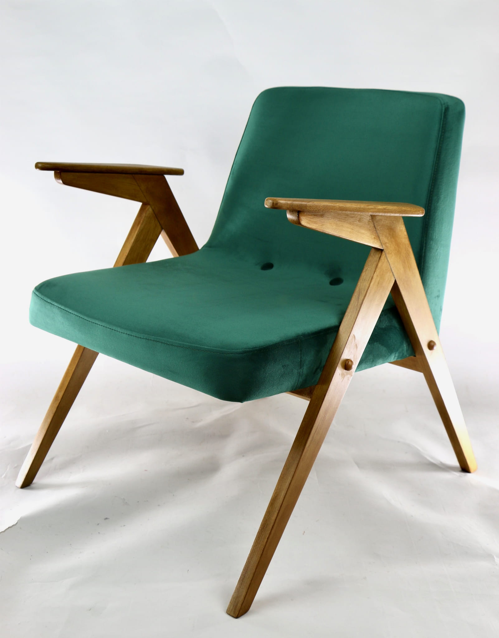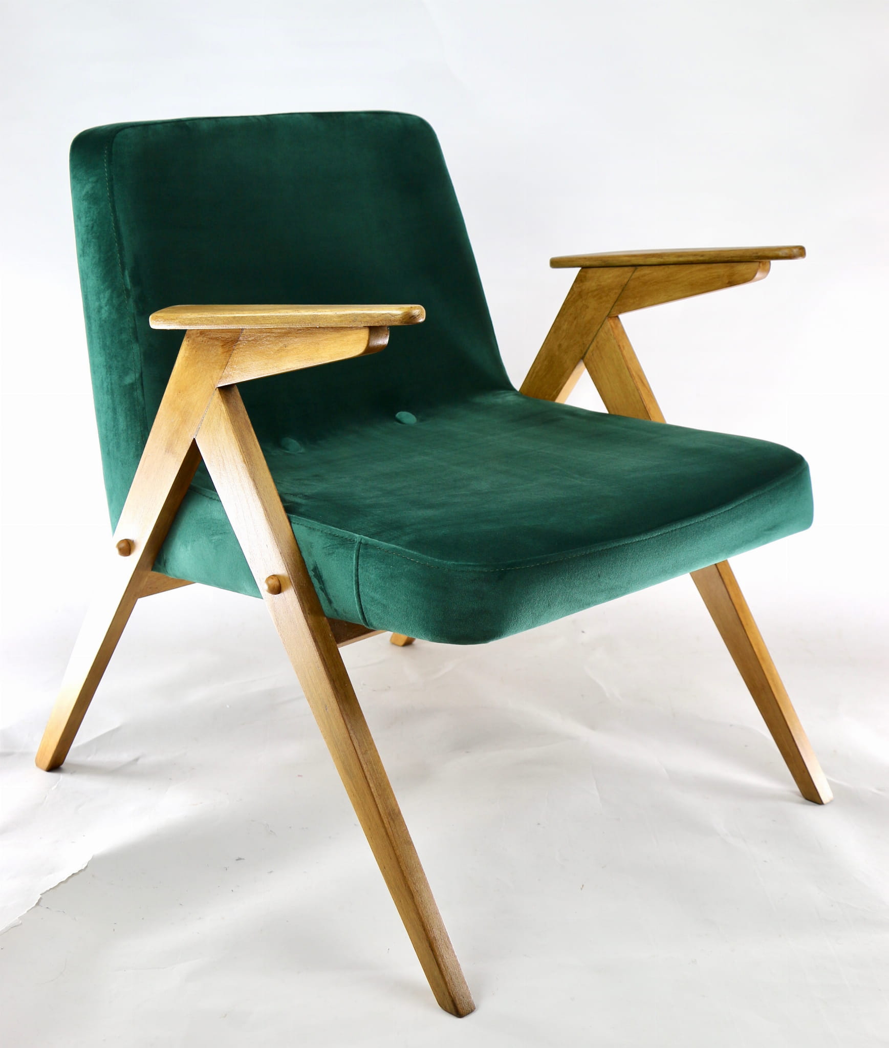 Fotel Bunny, odrestaurowany. Nowe obicie pokryte aksamitnym materiałem tapicerskim w beżowym zielonym . Stelaż drewniany z podłokietnikami w kolorze naturalnego drewna.