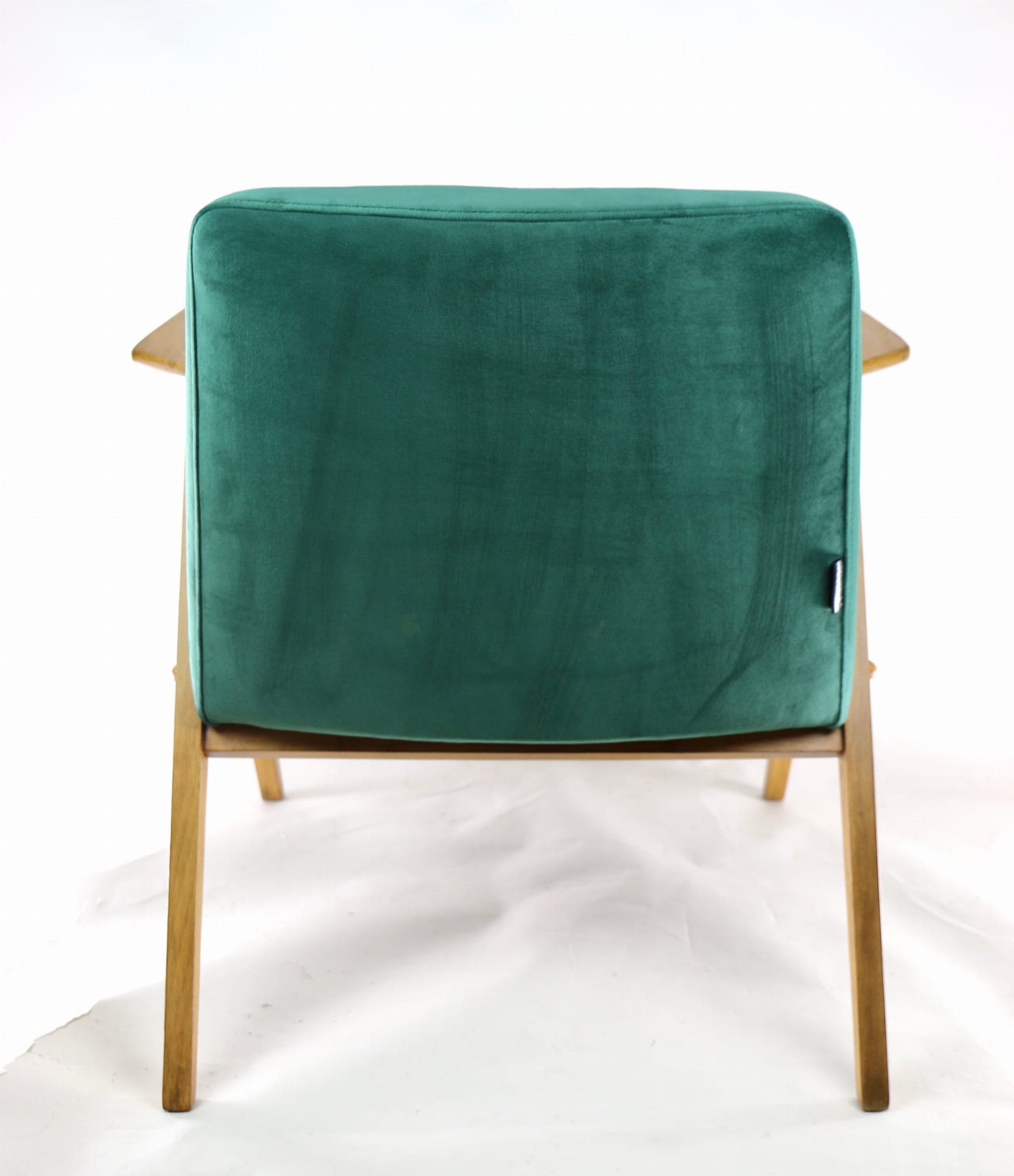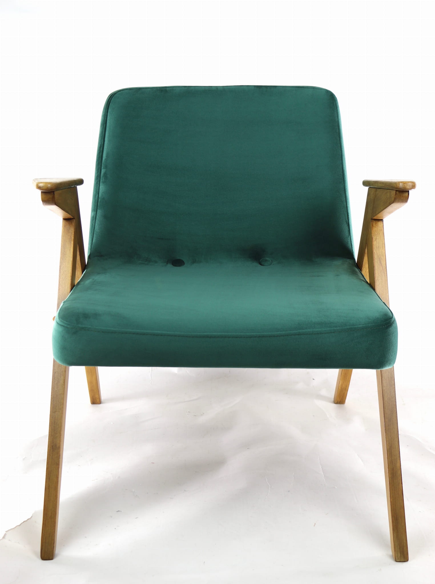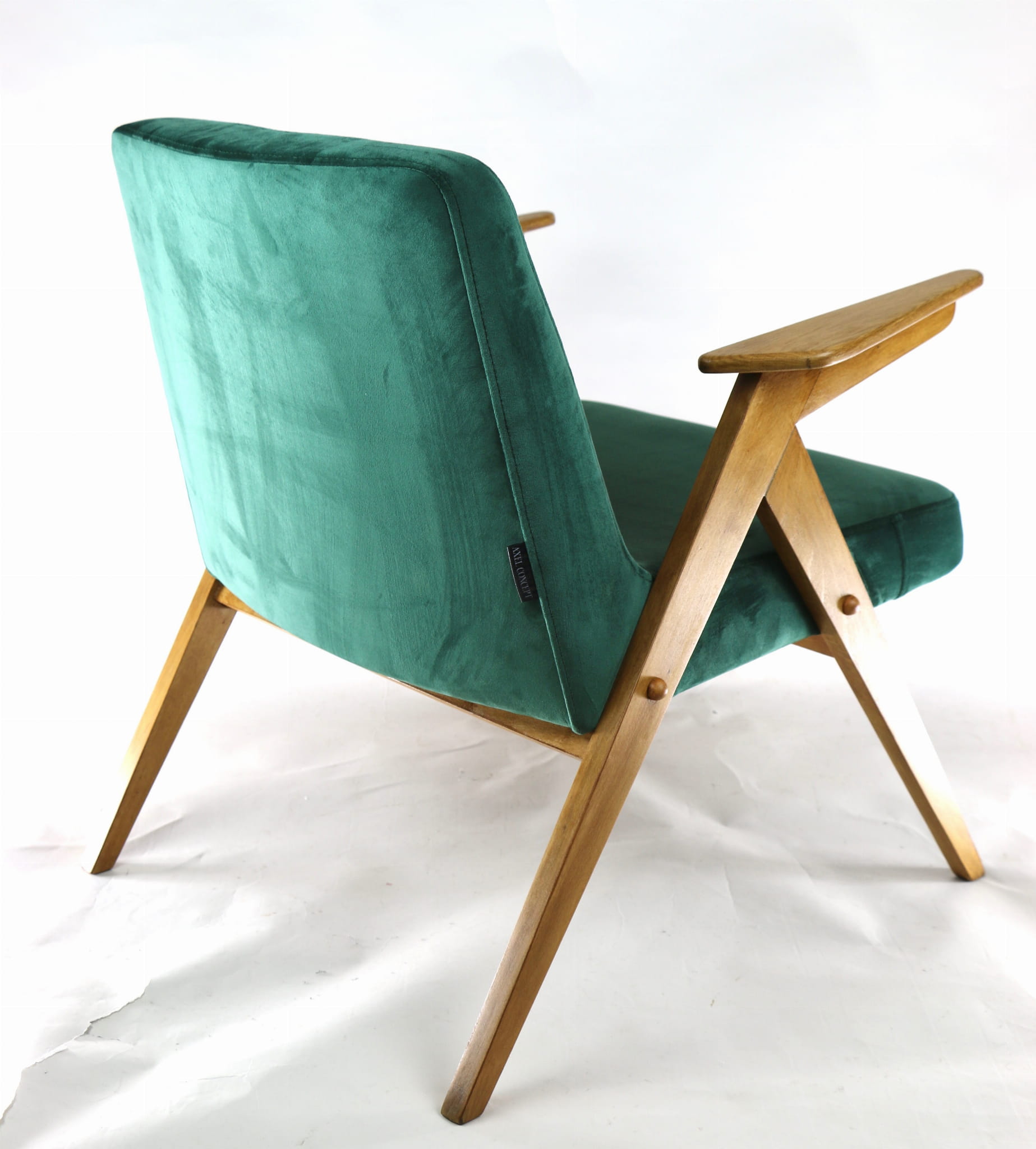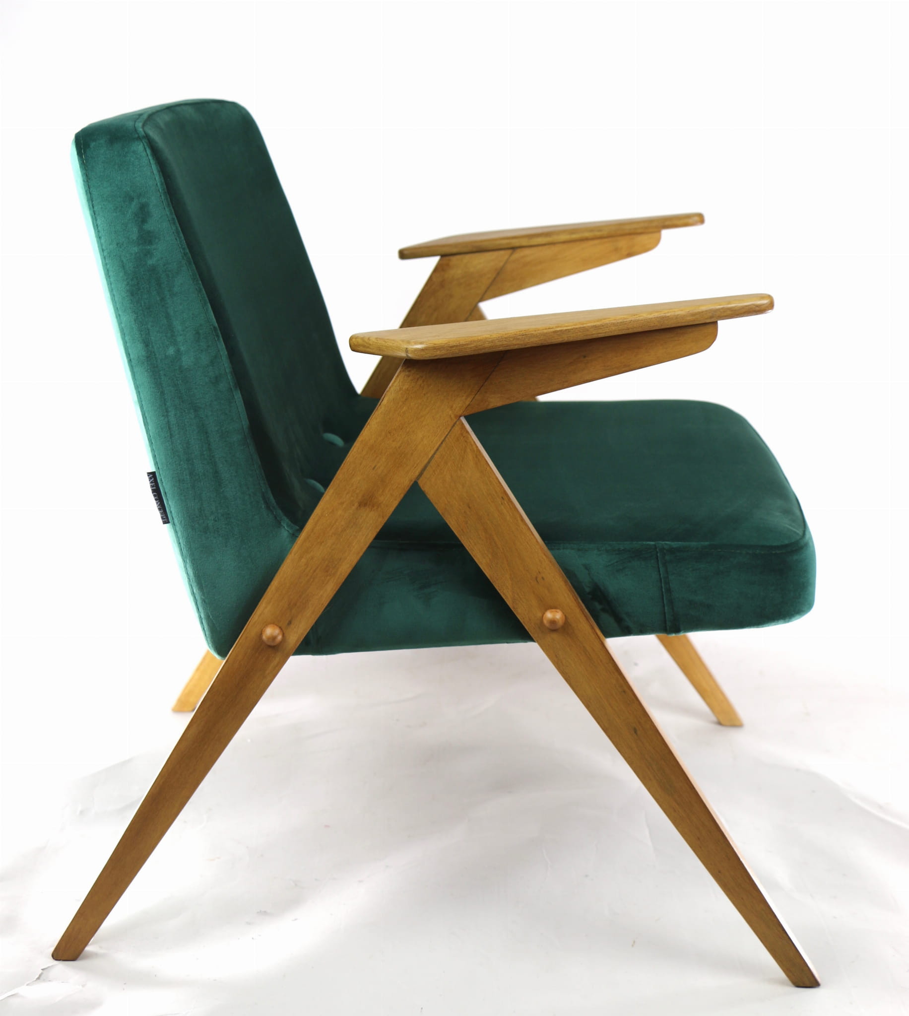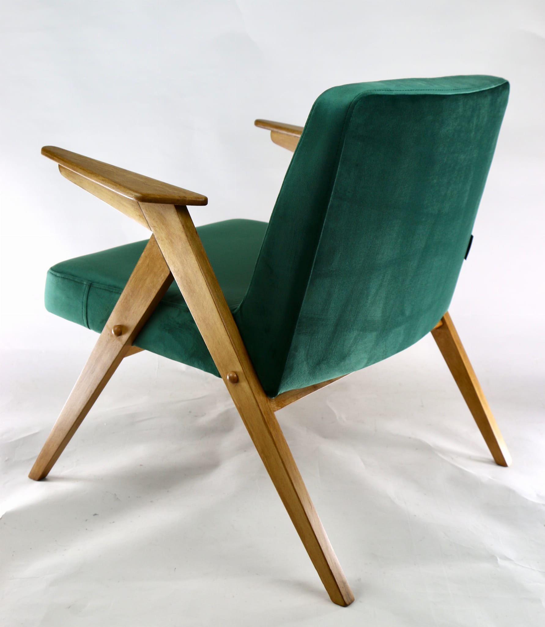 Fotel Bunny, odrestaurowany. Nowe obicie pokryte aksamitnym materiałem tapicerskim w beżowym zielonym . Stelaż drewniany z podłokietnikami w kolorze naturalnego drewna.