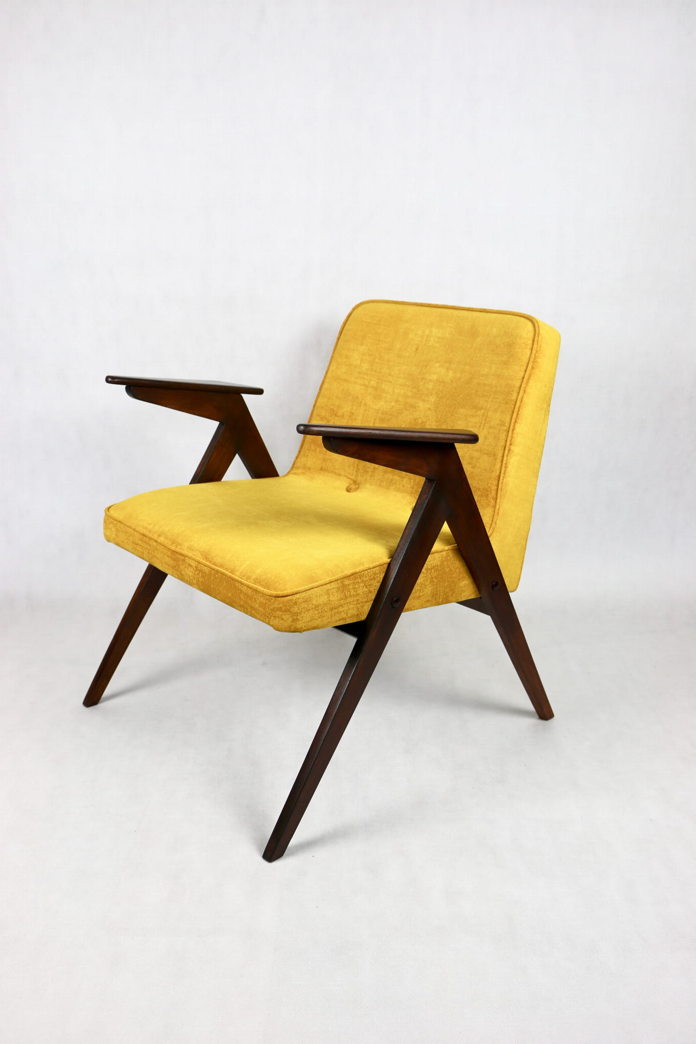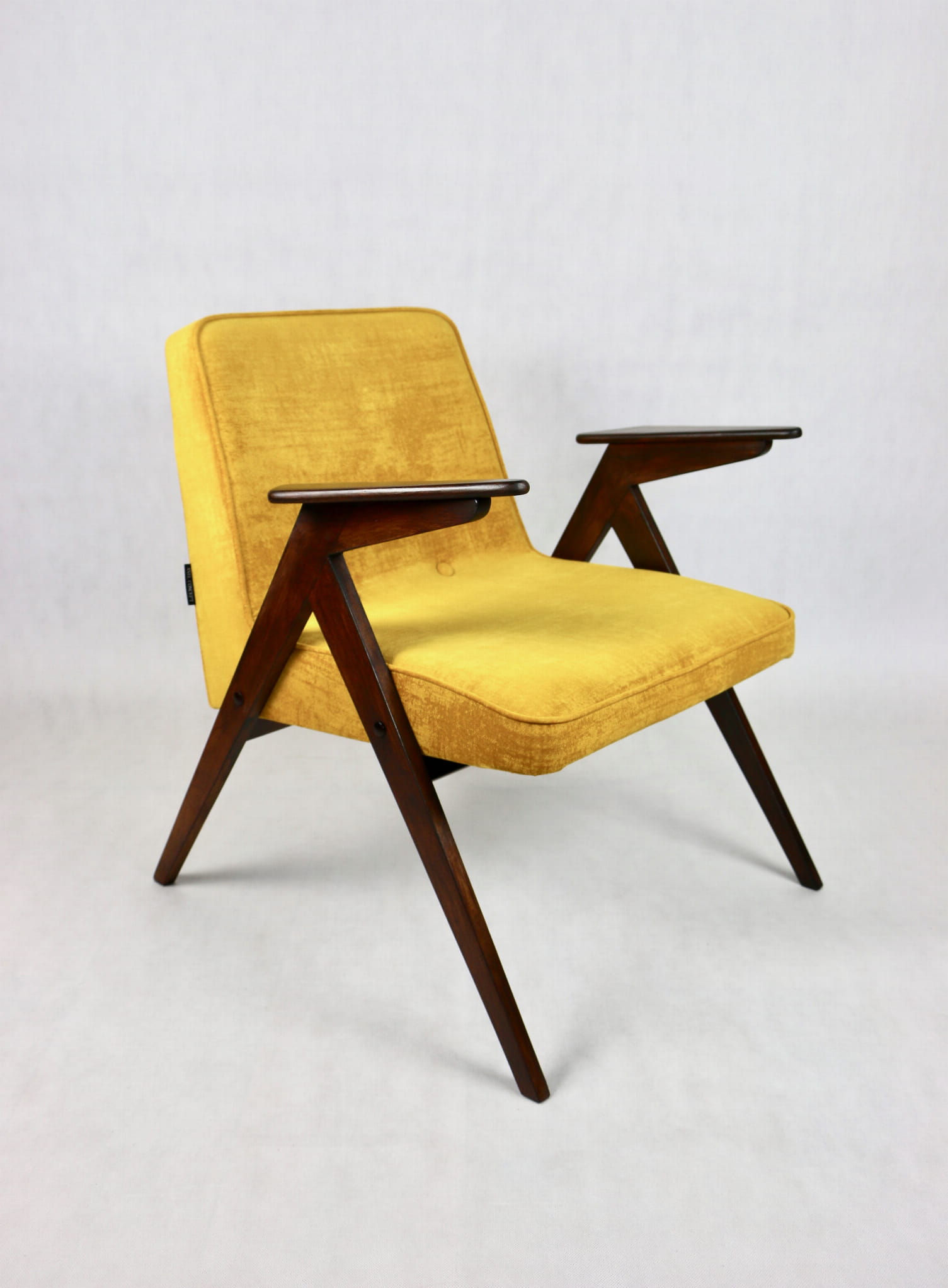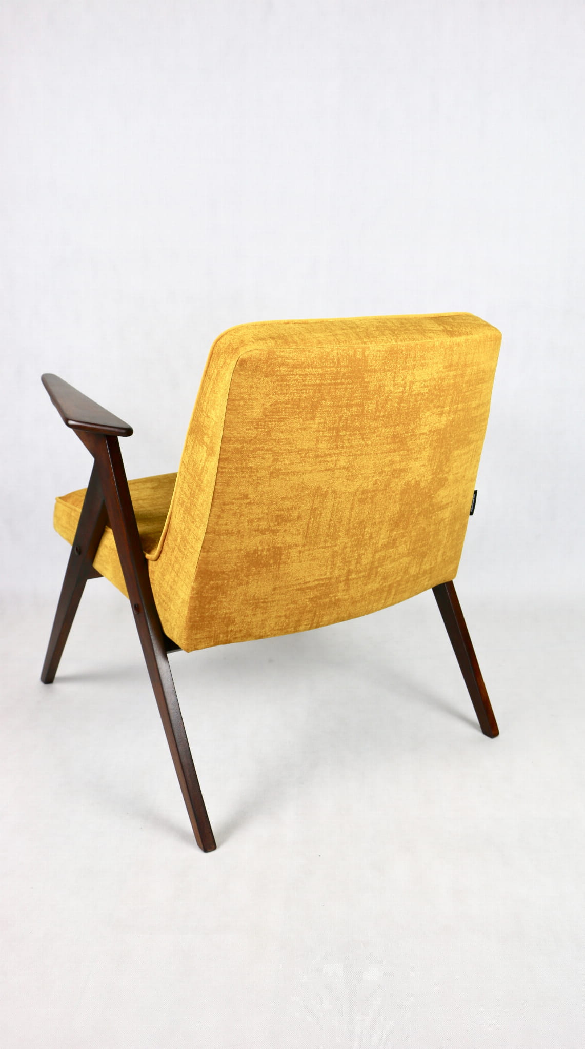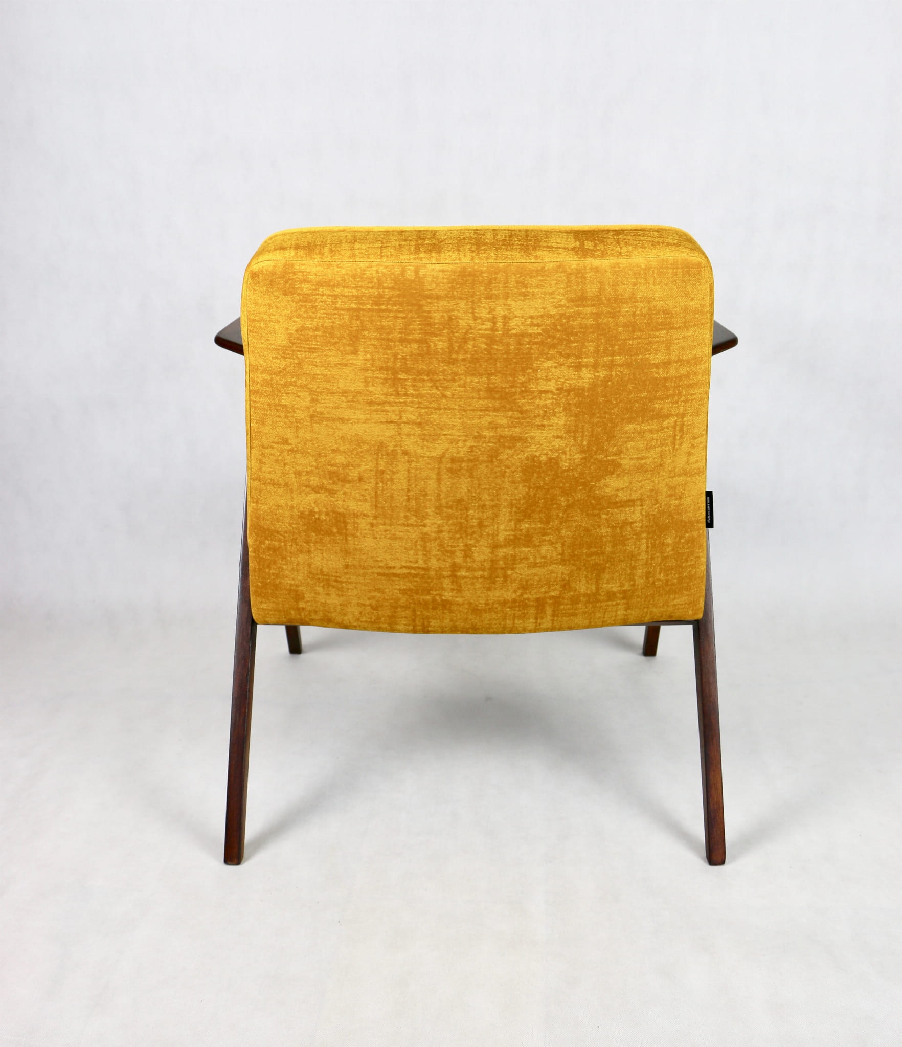 Fotel Bunny z lat 70. Został całkowicie odrestaurowany. Zyskał nowe obicie pokryte materiałem tapicerskim w kolorze żółto -złotym w charakterystyczny strukturalny velvet z serii Symphony Mills - Chameleon. Stelaż drewniany z podłokietnikami w kolorze ciemnego drewna utrwalony lakierem.