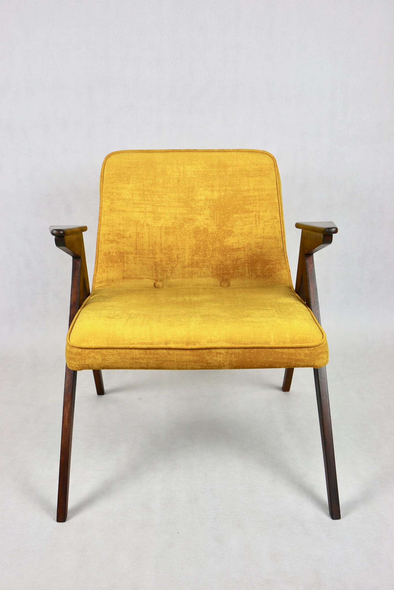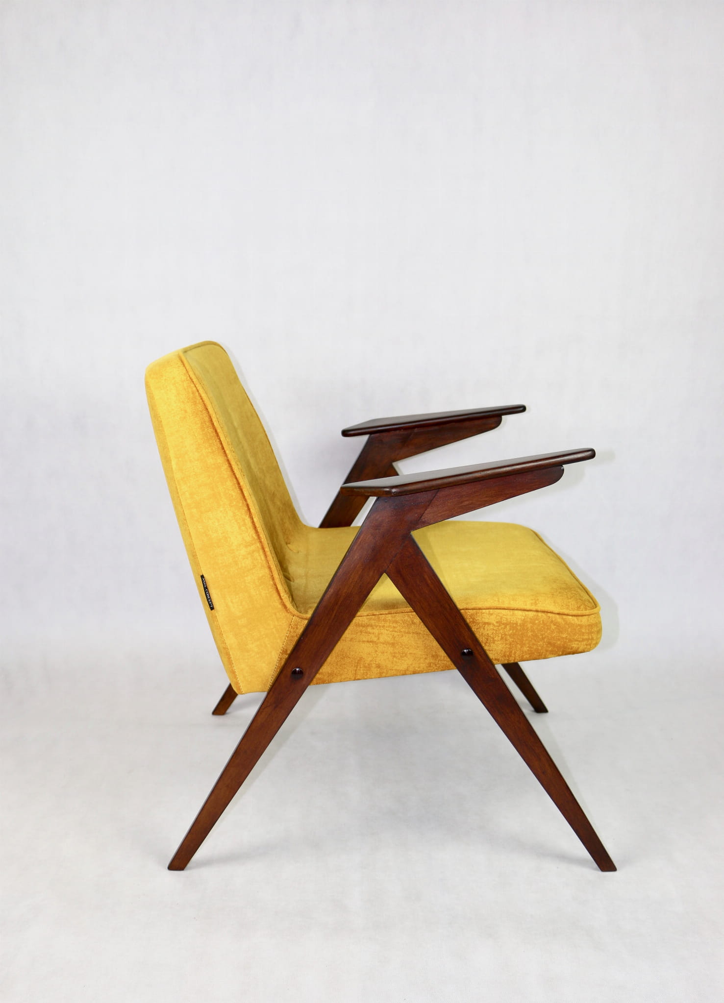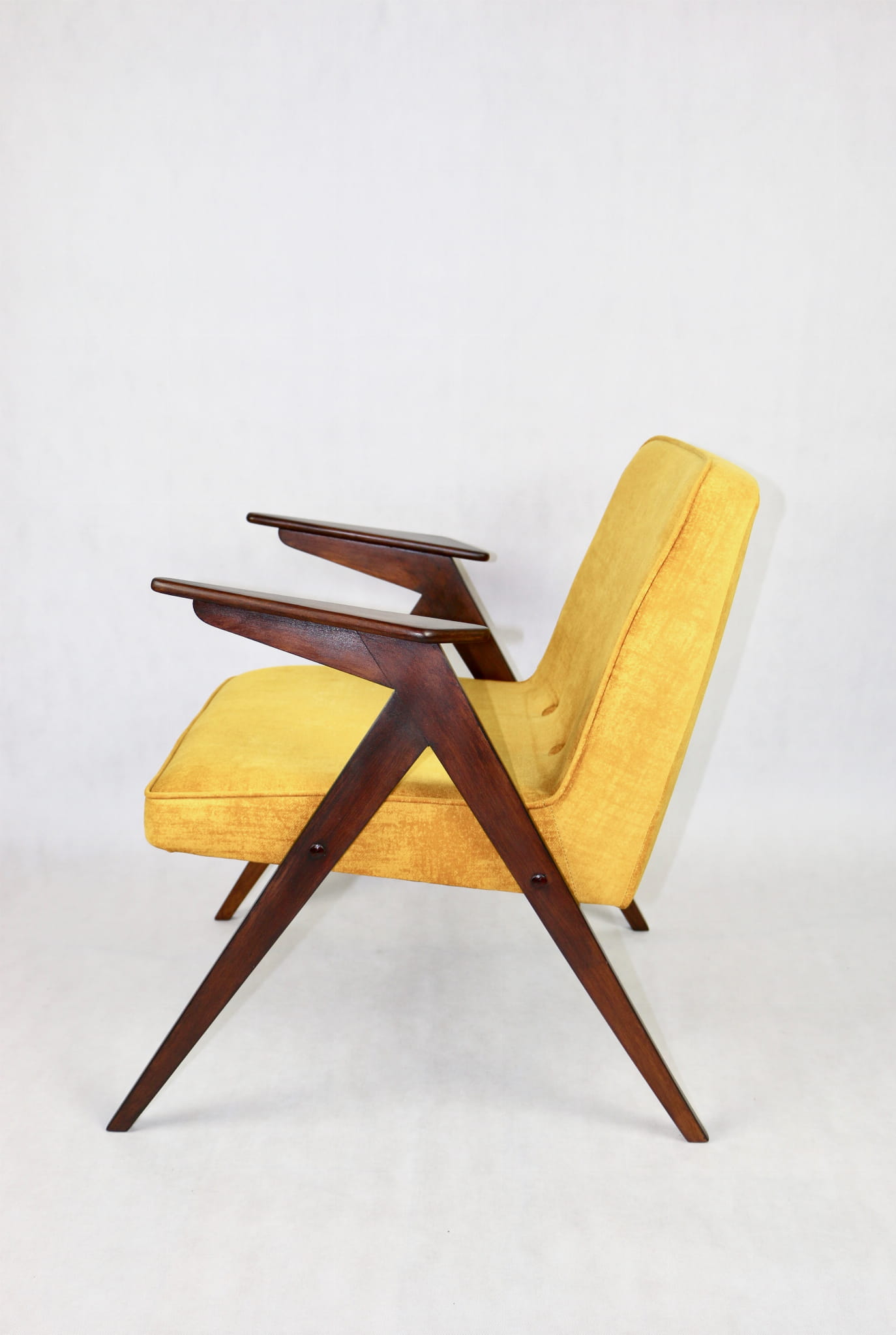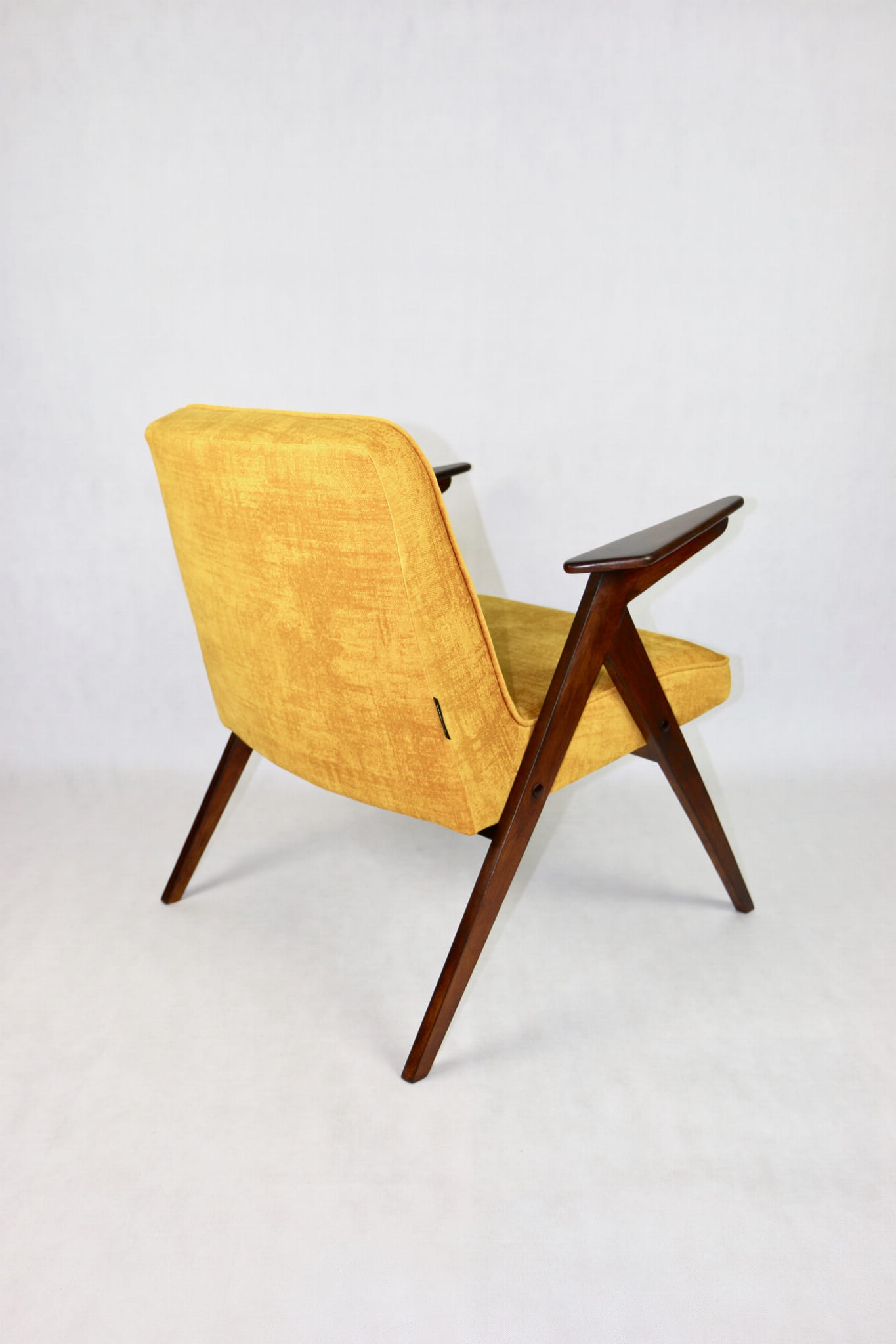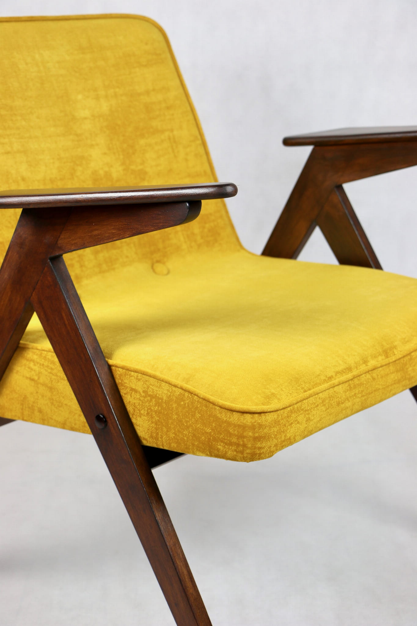 Fotel Bunny z lat 70. Został całkowicie odrestaurowany. Zyskał nowe obicie pokryte materiałem tapicerskim w kolorze żółto -złotym w charakterystyczny strukturalny velvet z serii Symphony Mills - Chameleon. Stelaż drewniany z podłokietnikami w kolorze ciemnego drewna utrwalony lakierem.