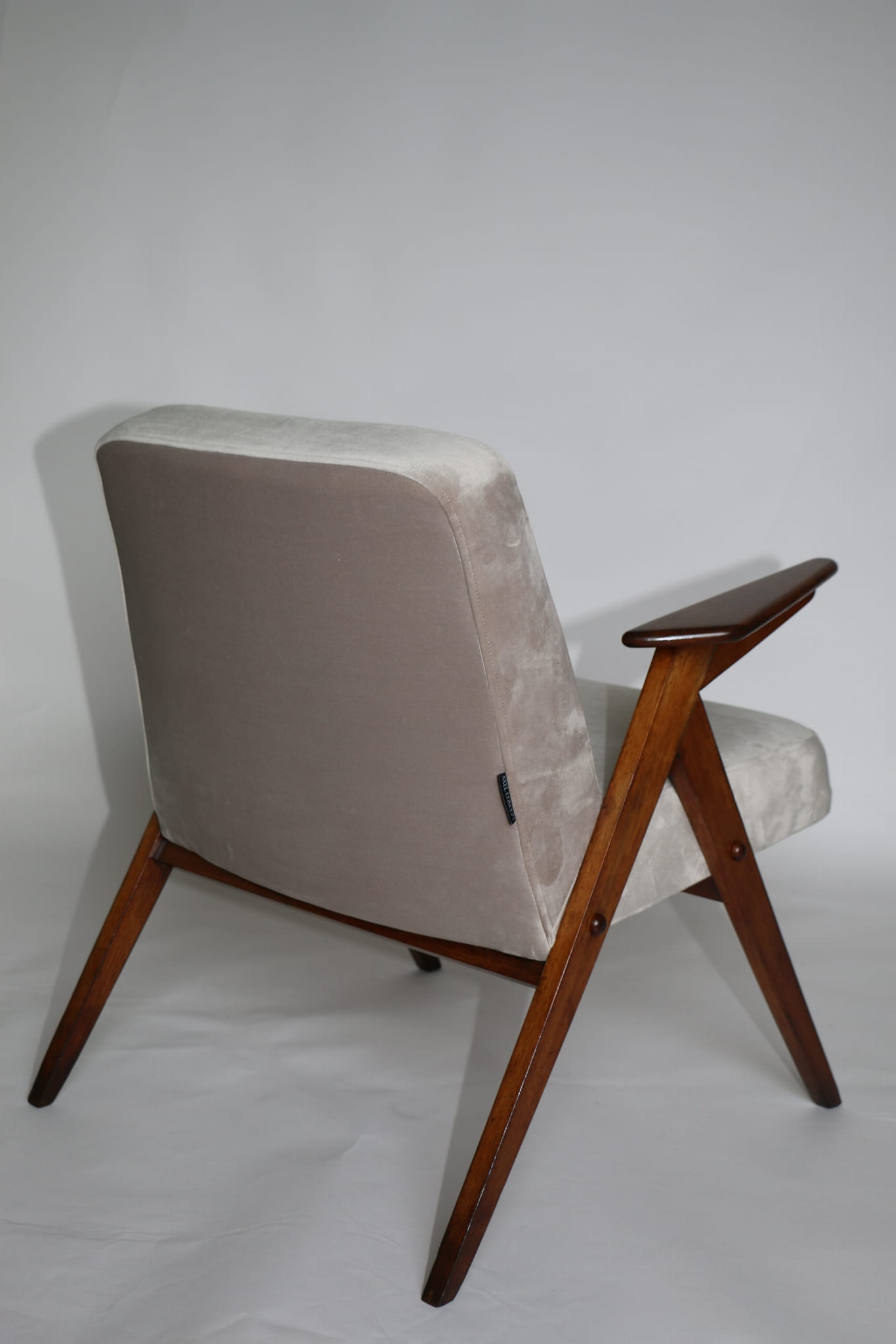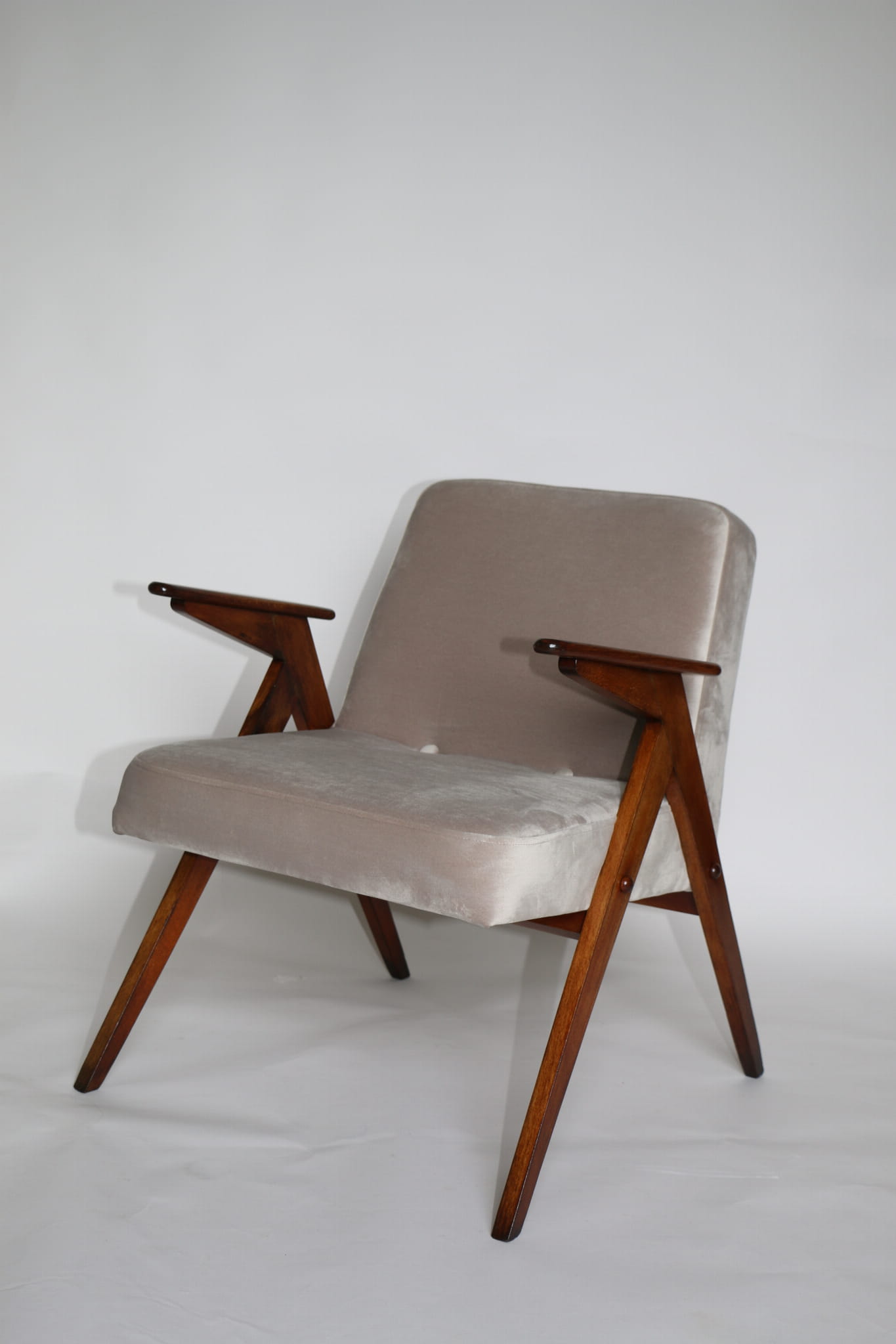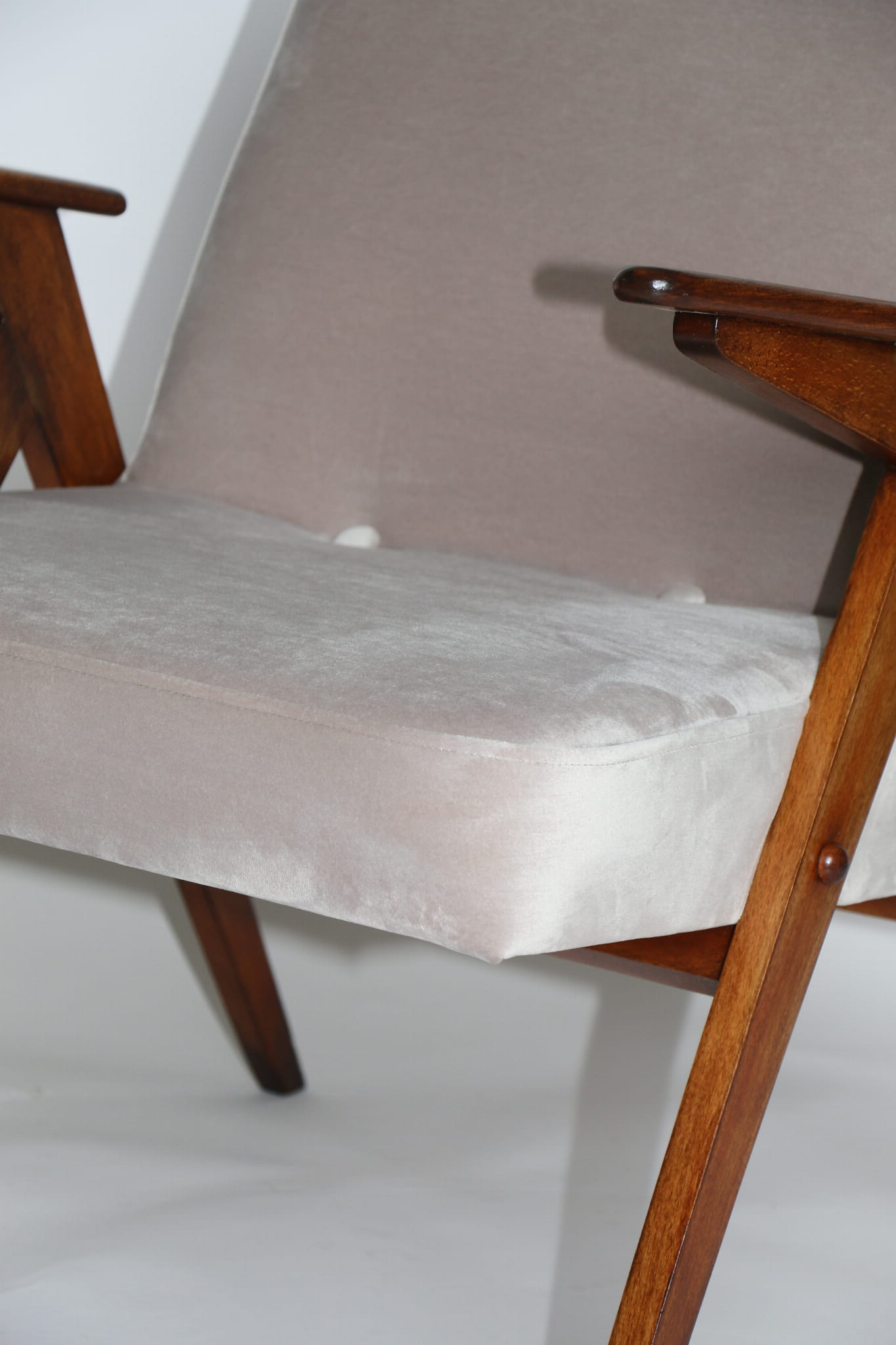Fotel Bunny, odrestaurowany. Nowe obicie pokryte aksamitnym materiałem tapicerskim w beżowym kolorze . Stelaż drewniany z podłokietnikami w kolorze ciemnego brązu.
