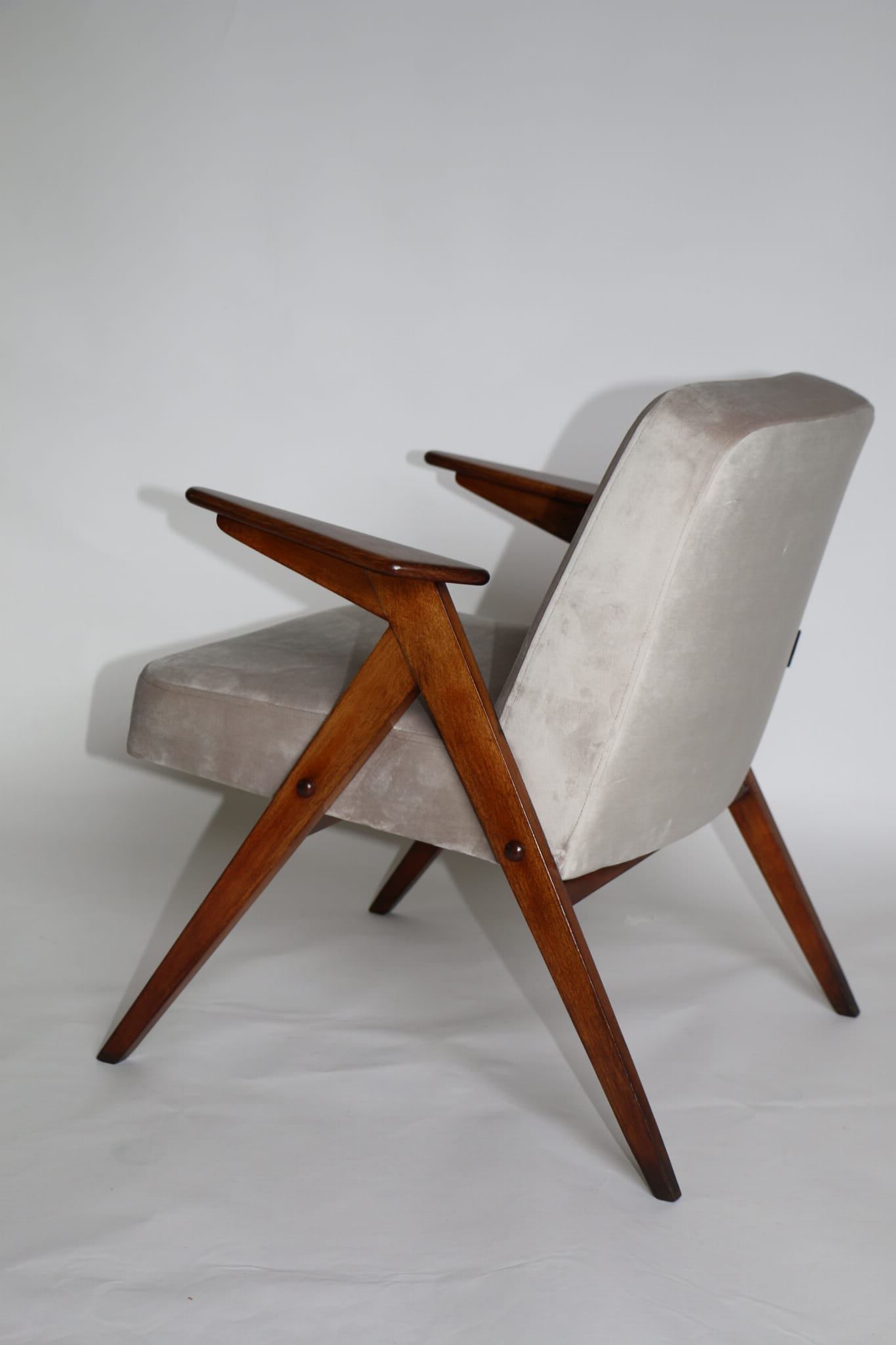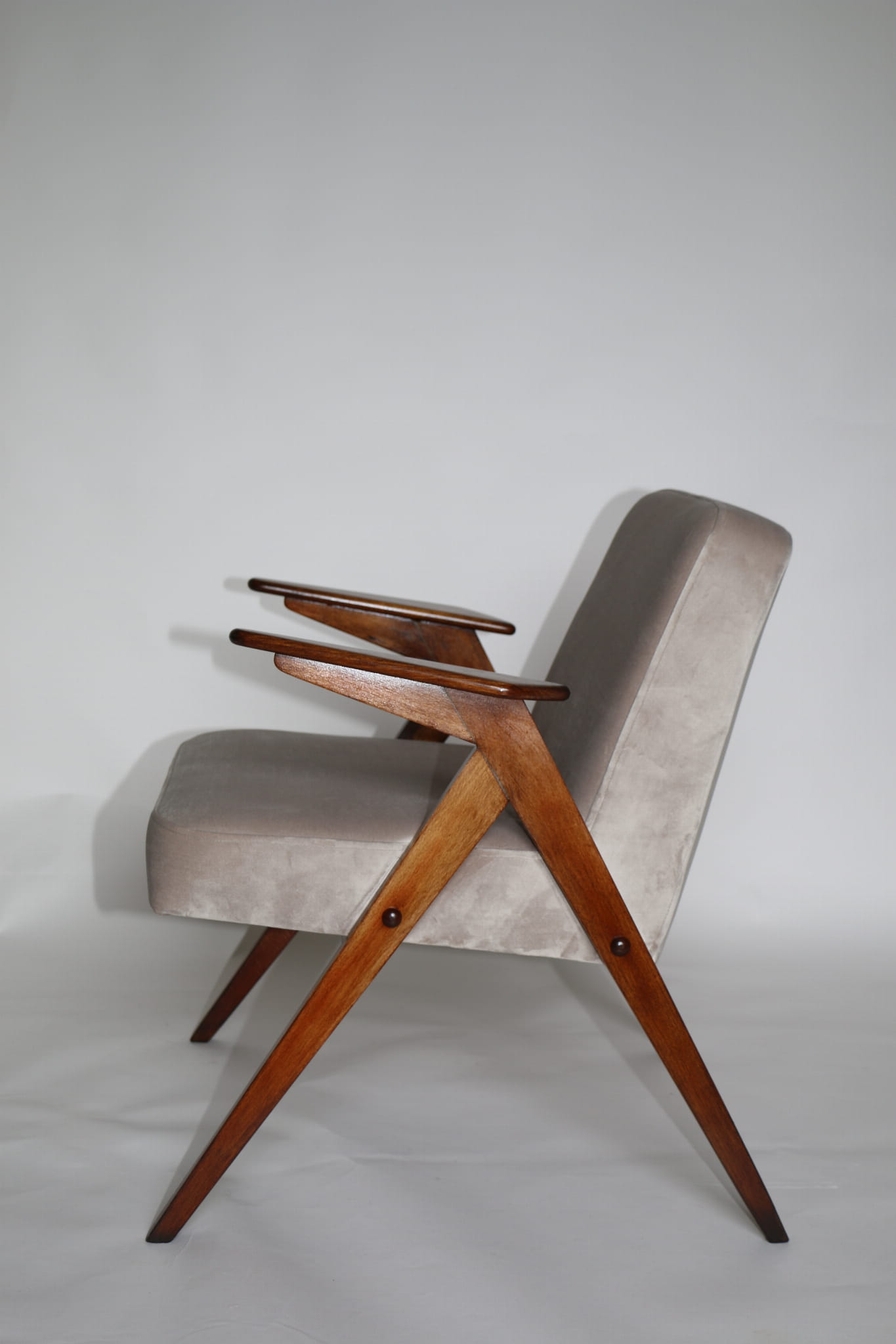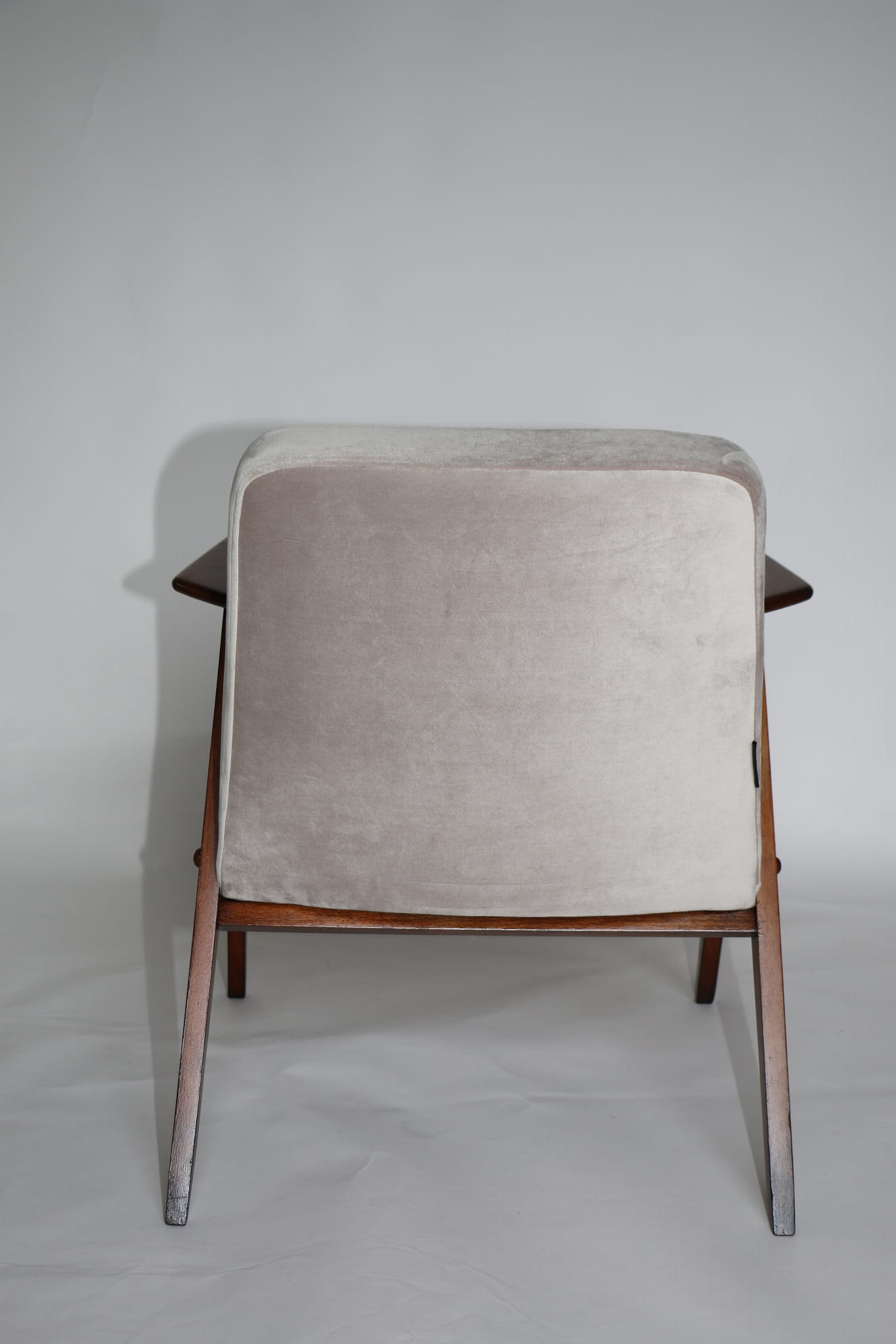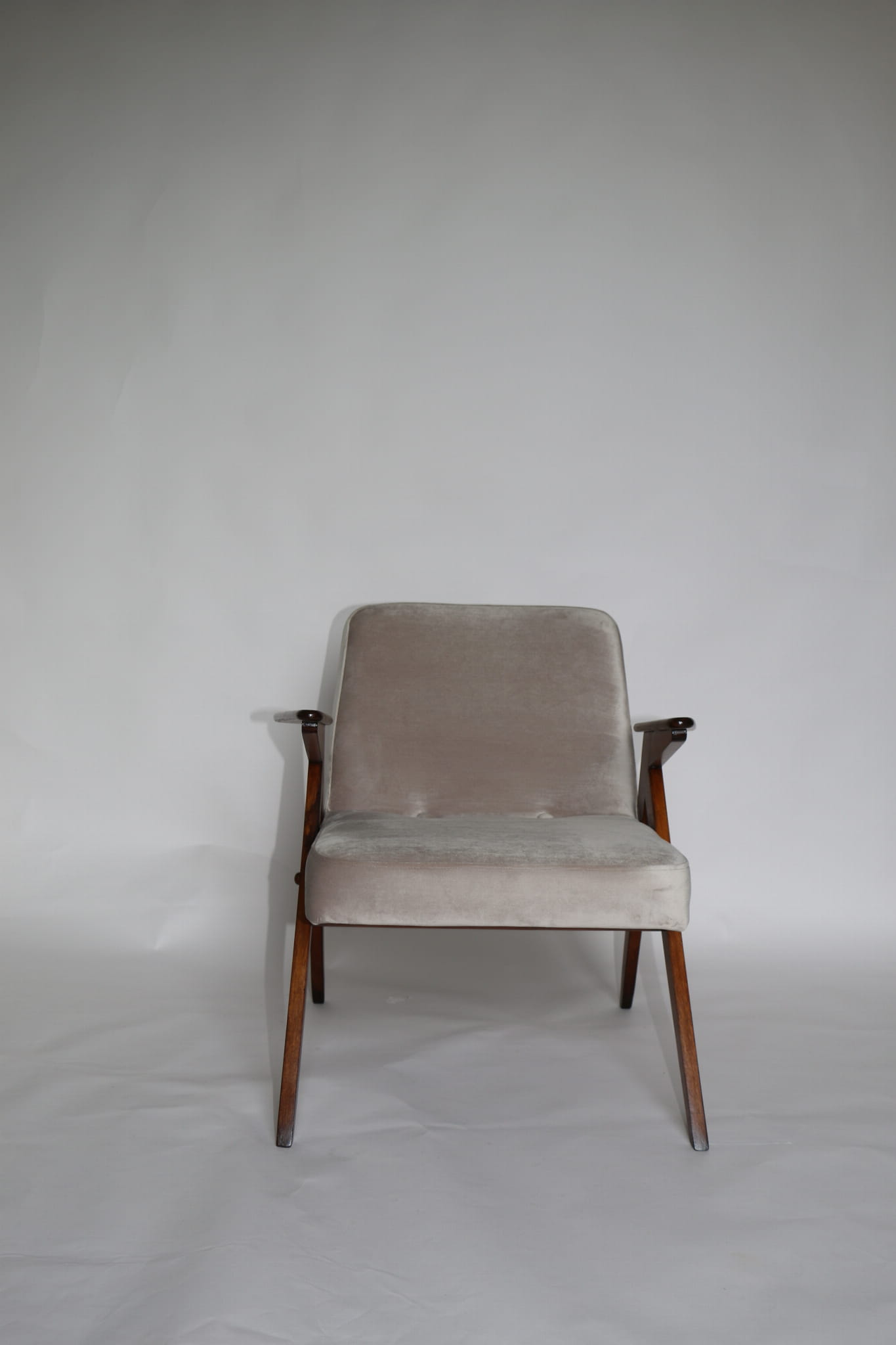 Fotel Bunny, odrestaurowany. Nowe obicie pokryte aksamitnym materiałem tapicerskim w beżowym kolorze . Stelaż drewniany z podłokietnikami w kolorze ciemnego brązu.