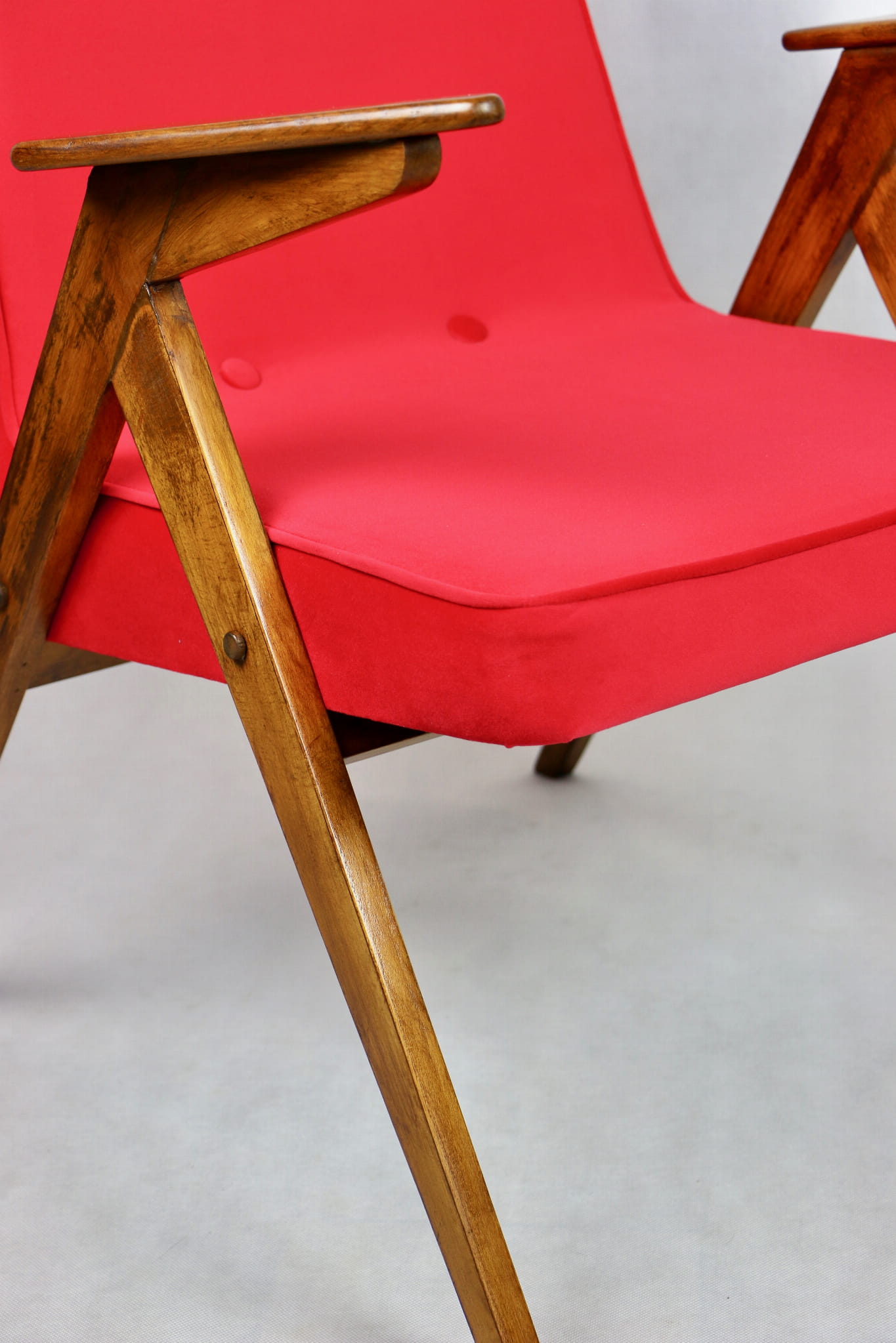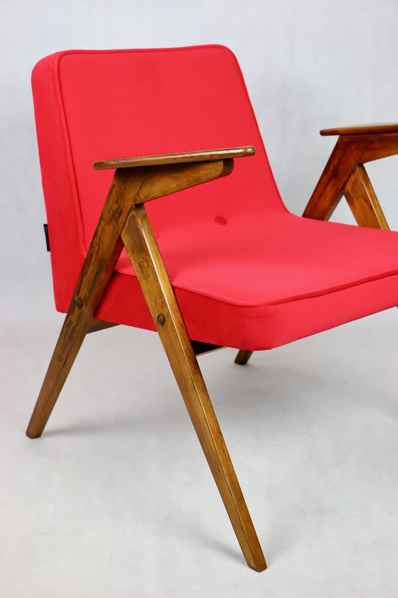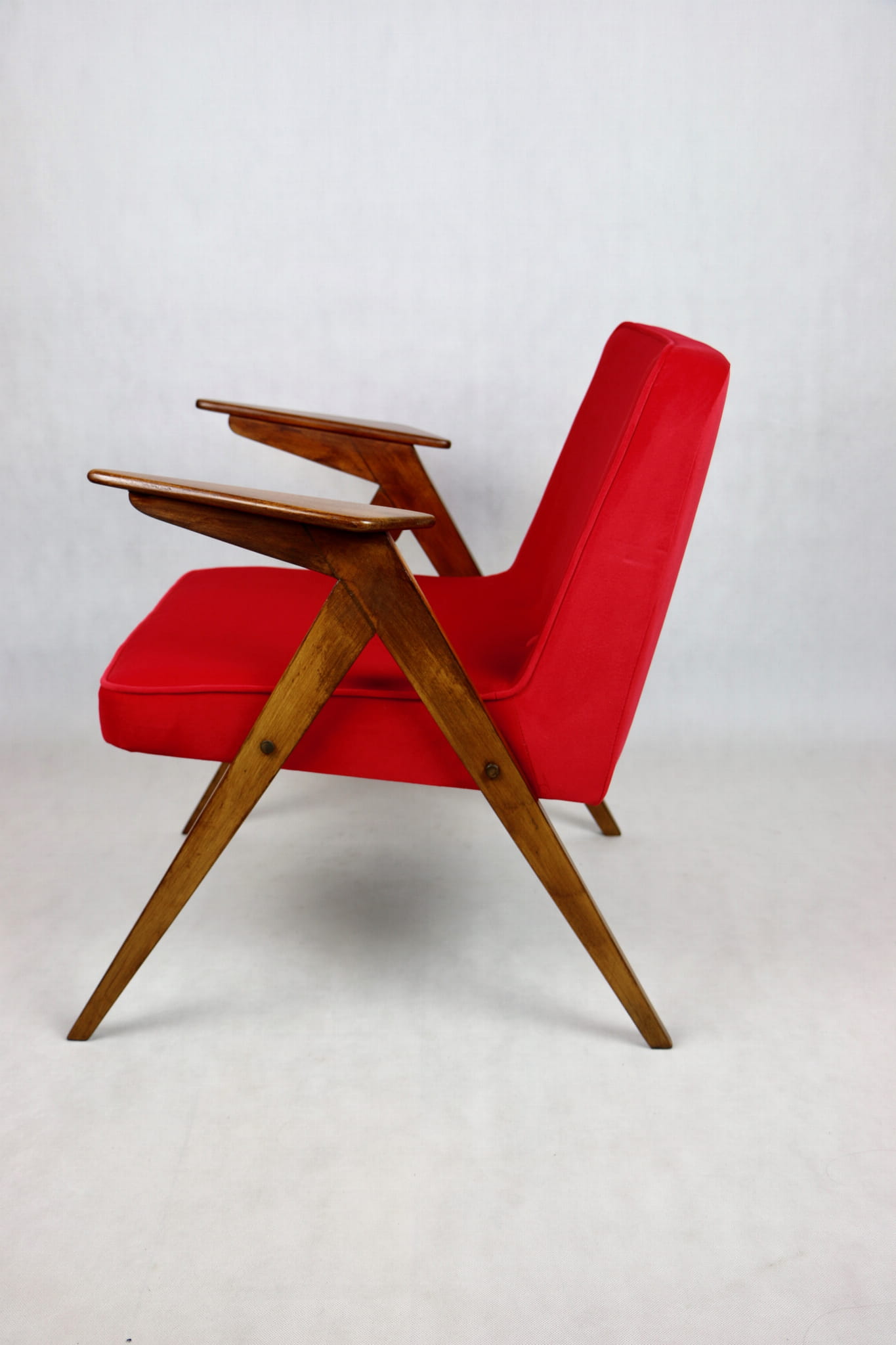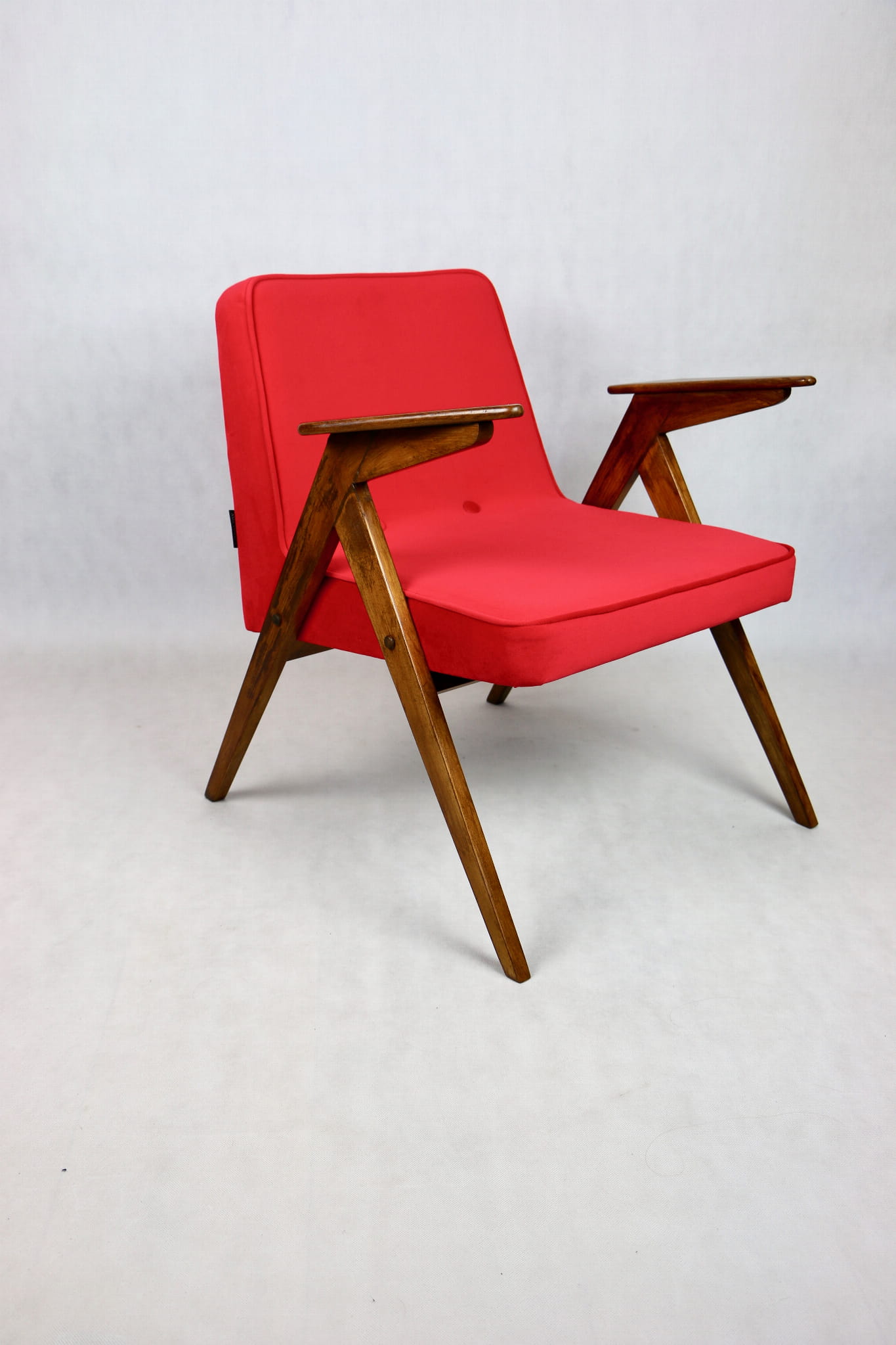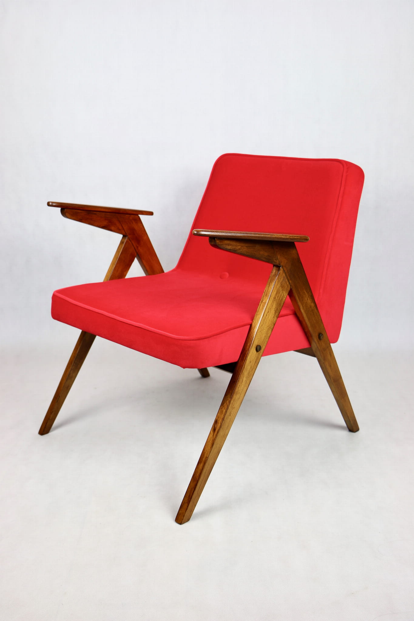 Fotel Bunny projektu J.Chierowski, kompletnie odrestaurowany. Nowe obicie pokryte aksamitnym materiałem tapicerskim Jade 205 w czerwonym kolorze. Stelaż drewniany z podłokietnikami w kolorze ciemnego naturalnego drewna.