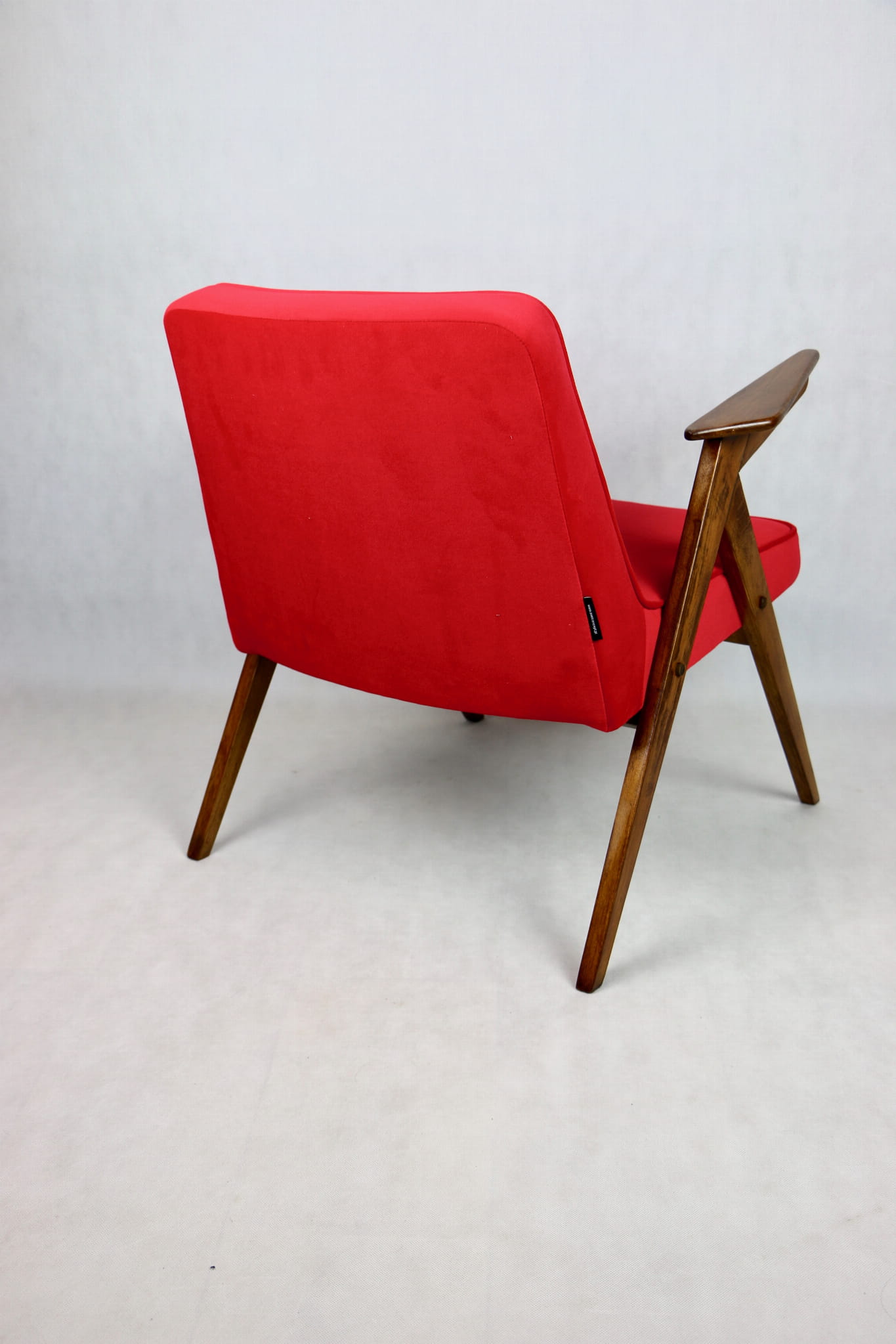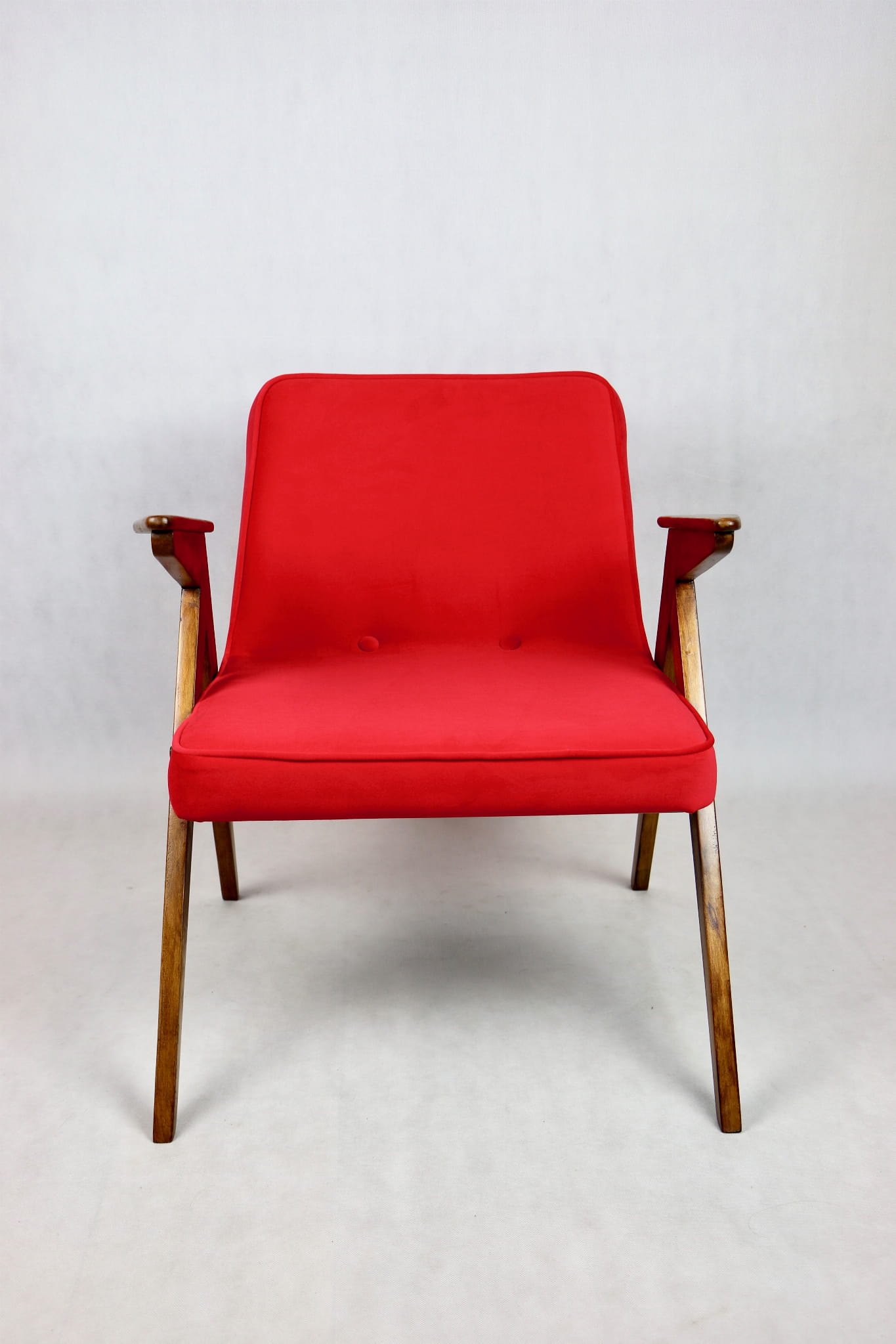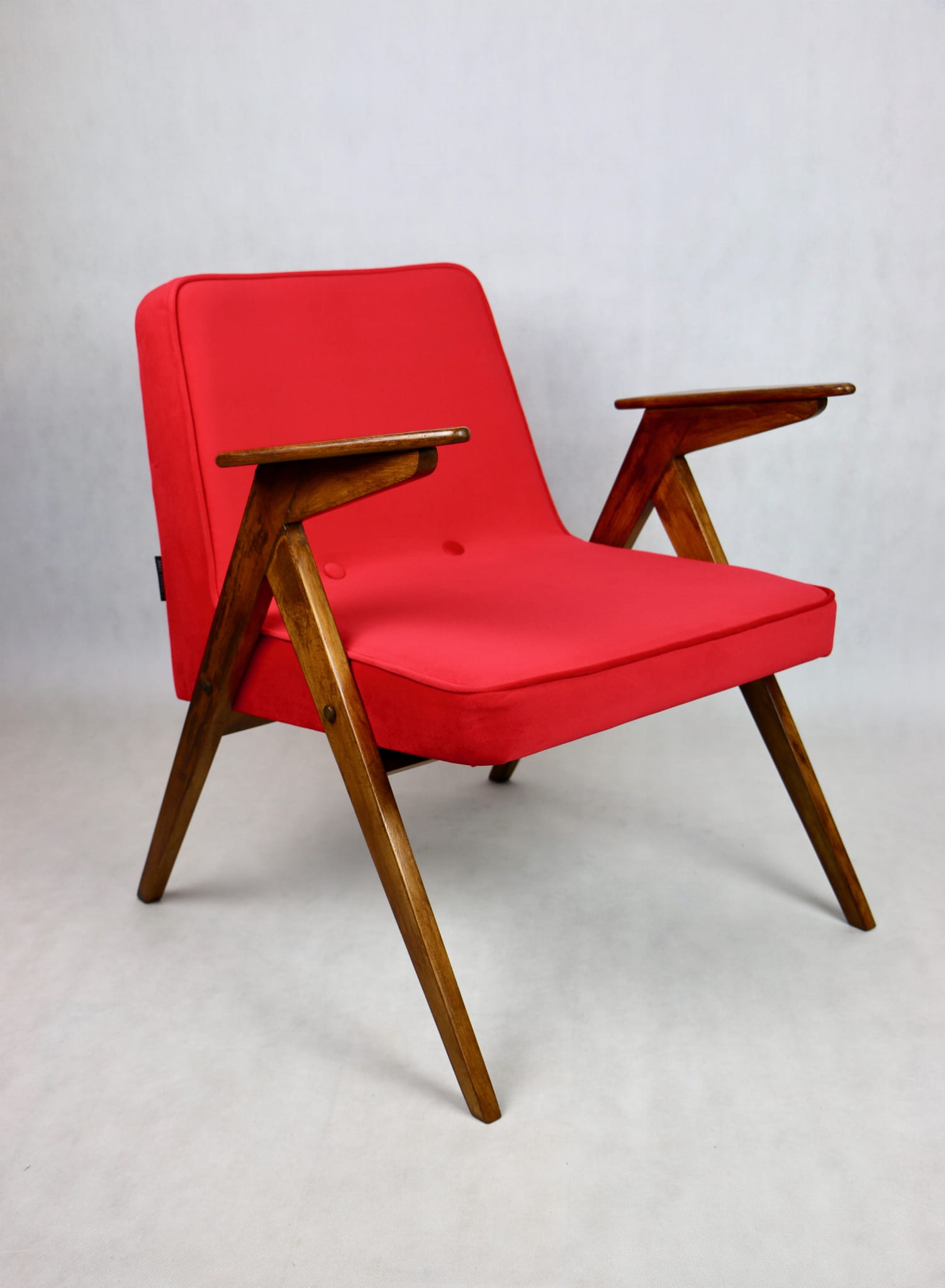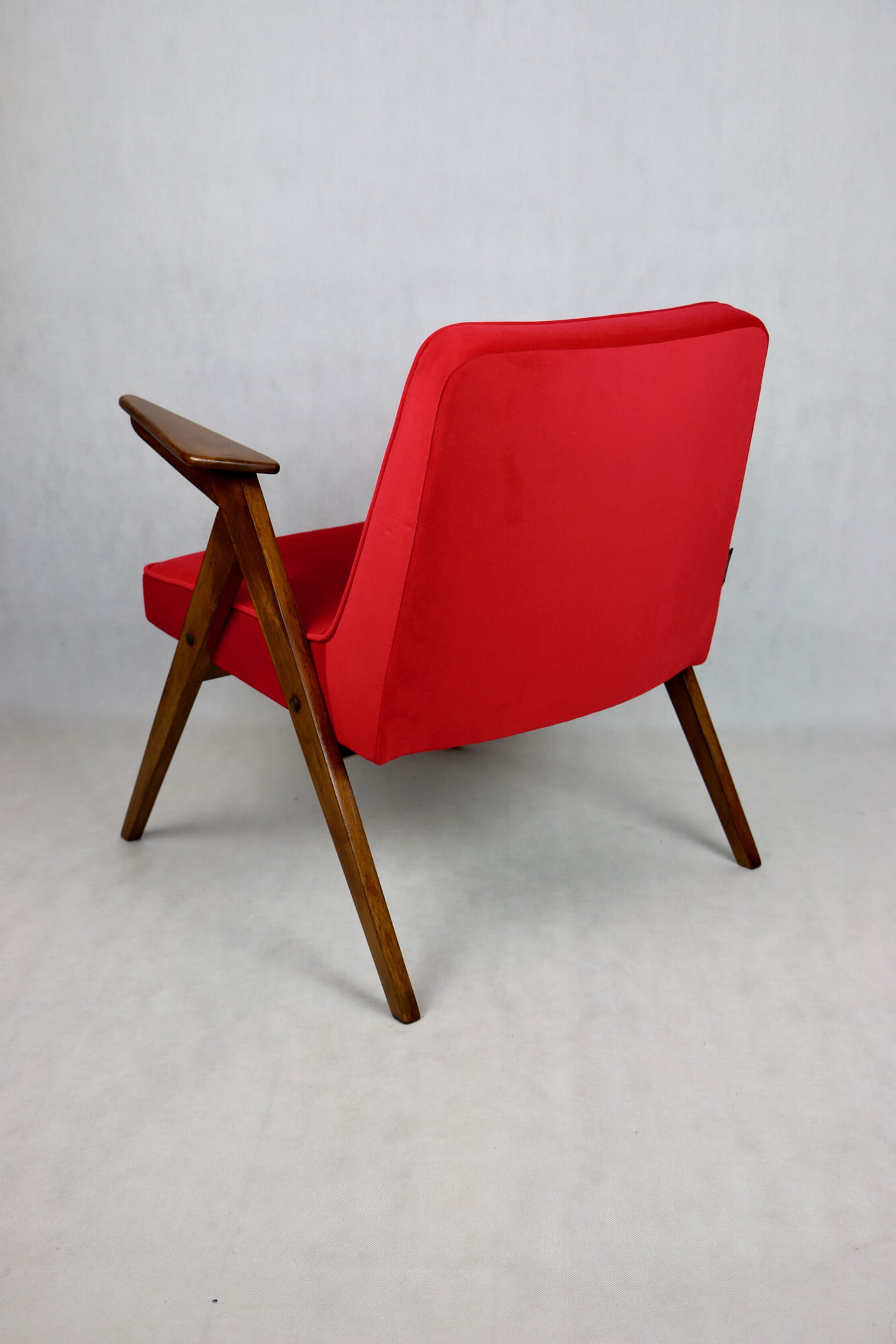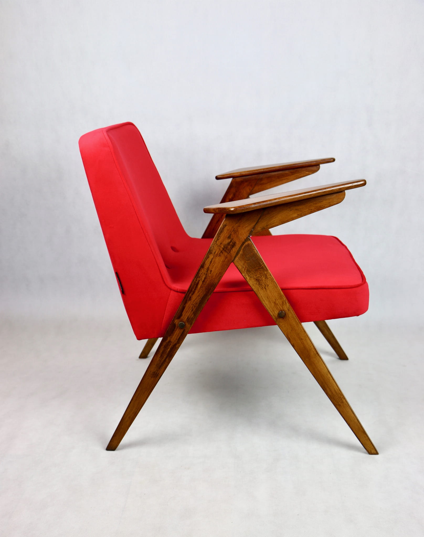 Fotel Bunny projektu J.Chierowski, kompletnie odrestaurowany. Nowe obicie pokryte aksamitnym materiałem tapicerskim Jade 205 w czerwonym kolorze. Stelaż drewniany z podłokietnikami w kolorze ciemnego naturalnego drewna.