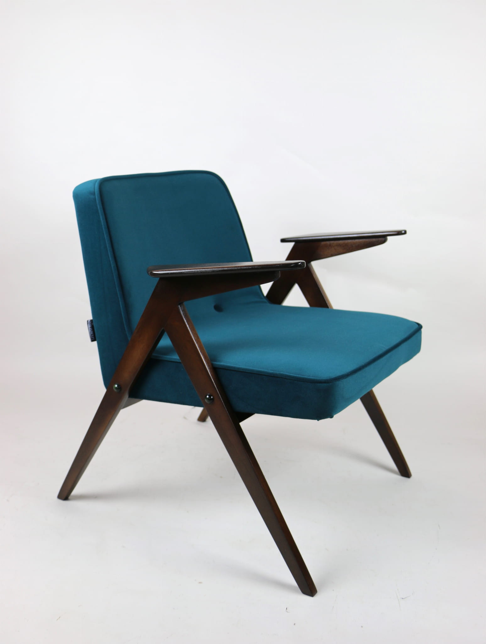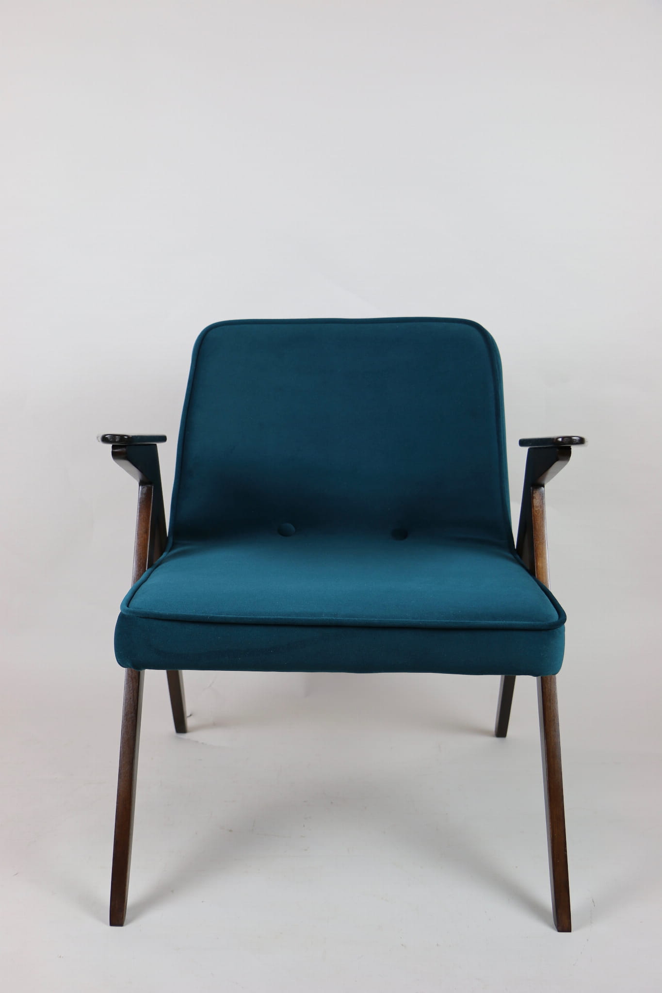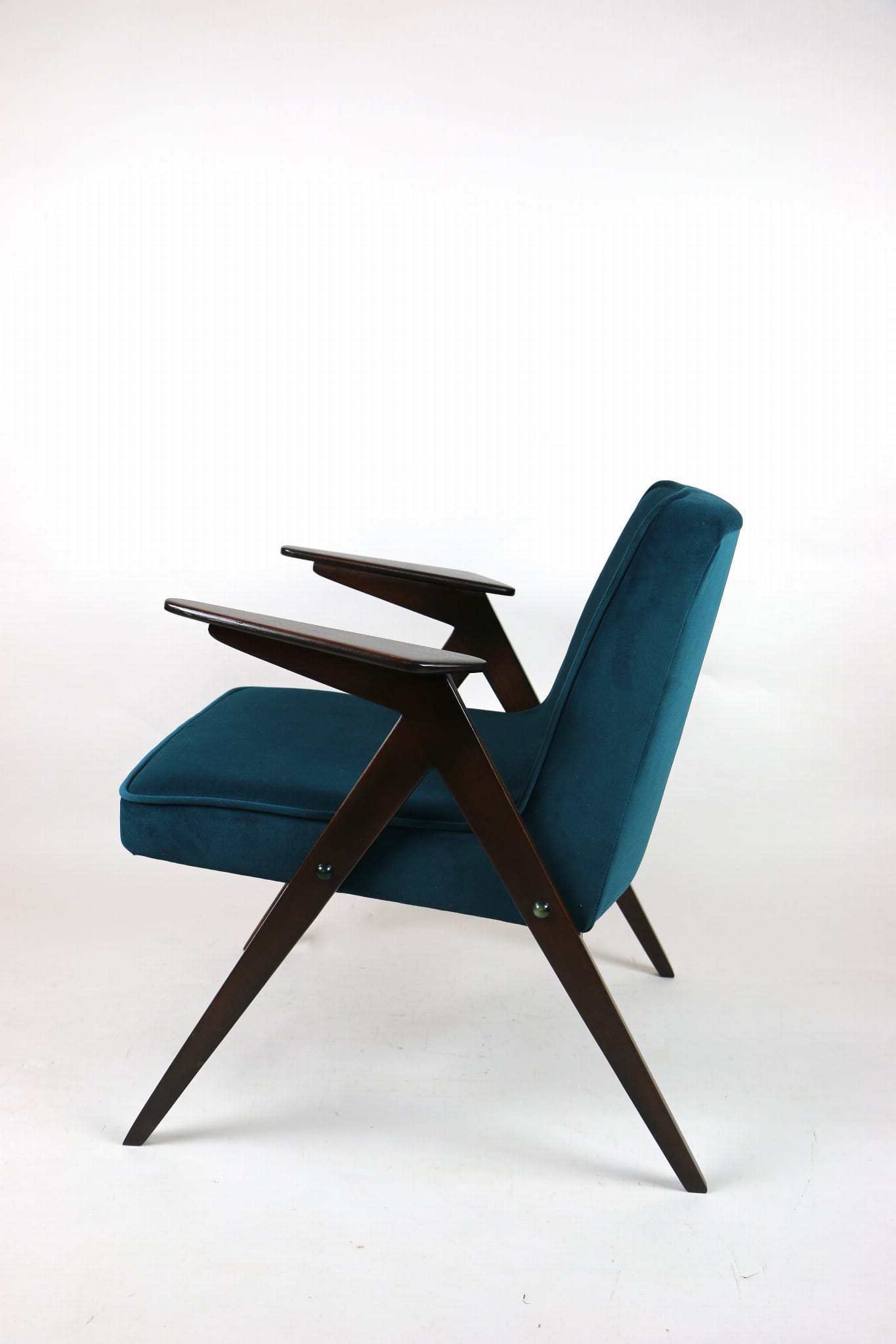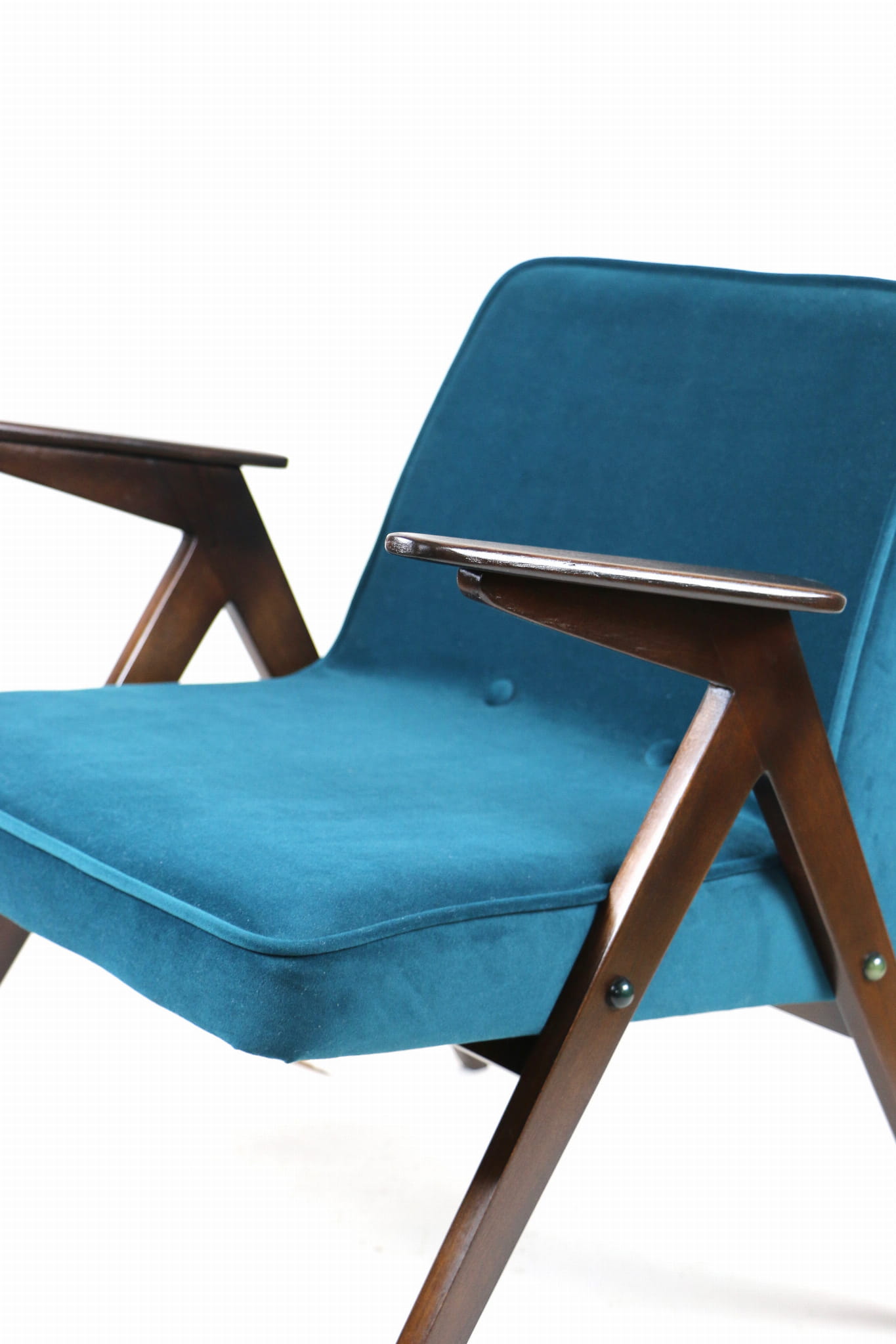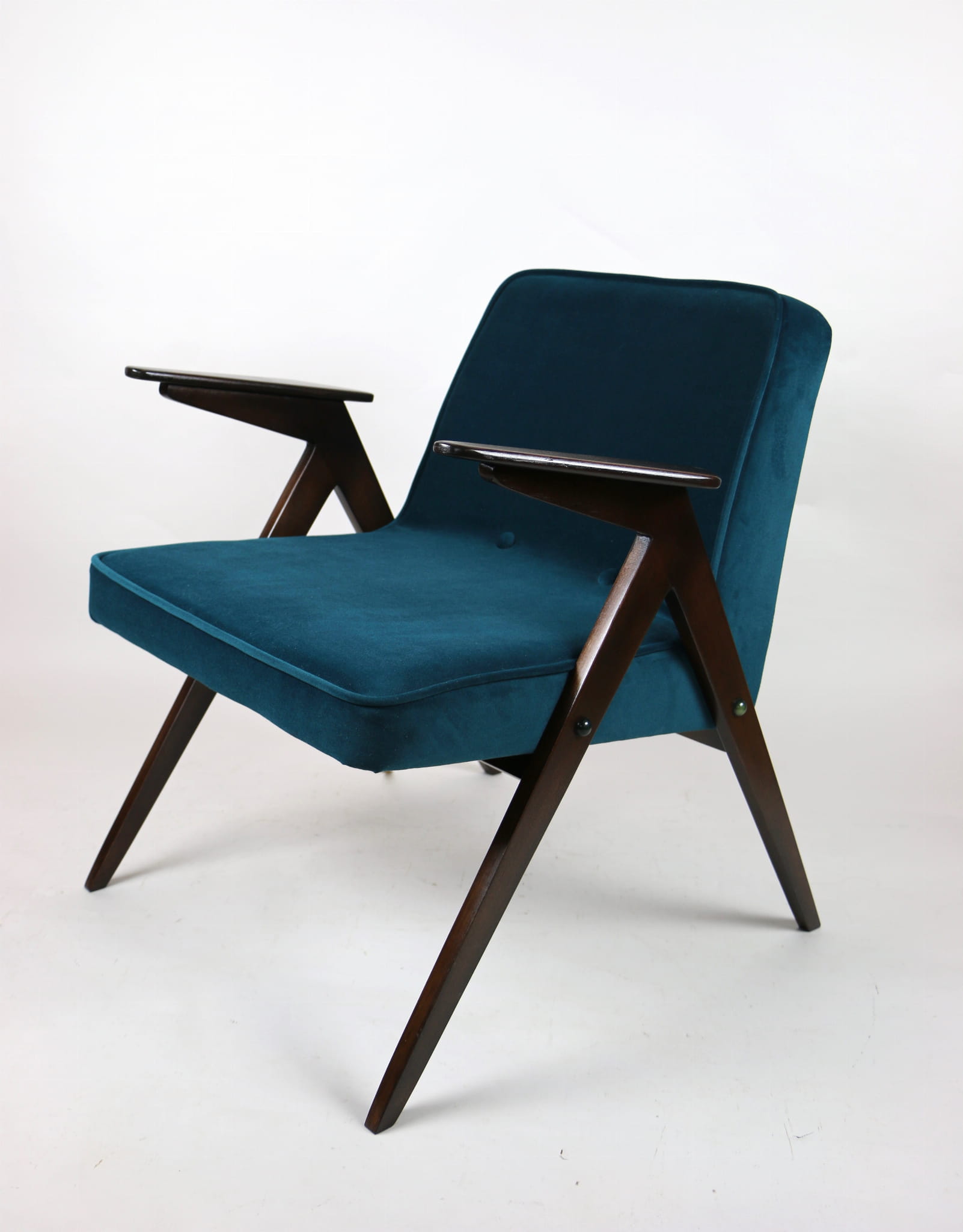 Fotel Bunny projektu J.Chierowski, kompletnie odrestaurowany. Nowe obicie pokryte aksamitnym materiałem tapicerskim Jade 608 w zielono-morskim kolorze. Stelaż drewniany z podłokietnikami w kolorze ciemnego naturalnego drewna.