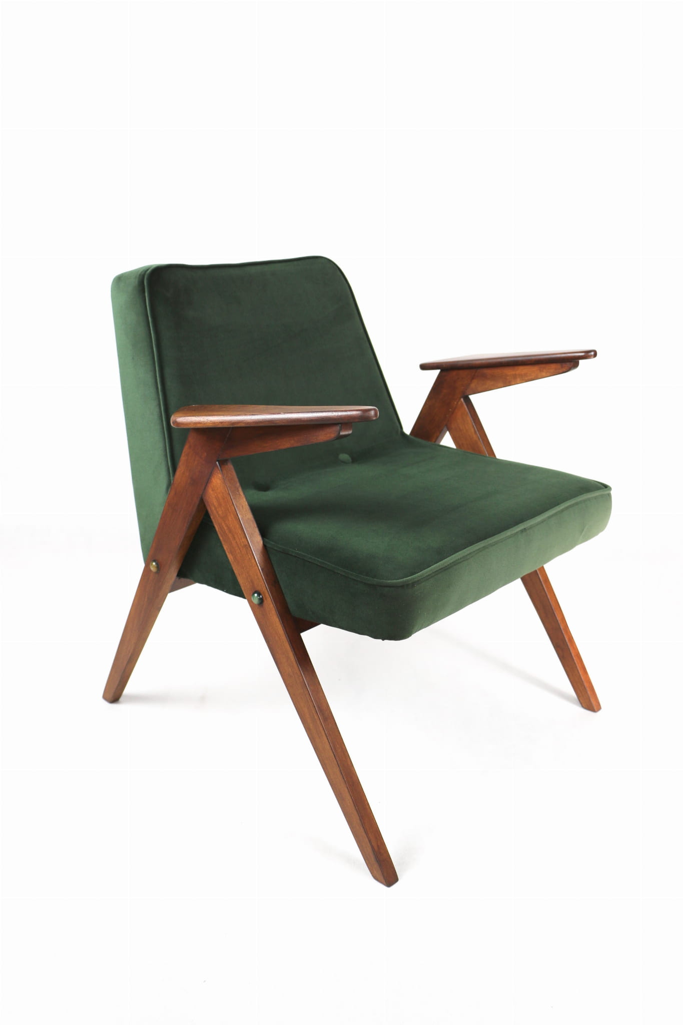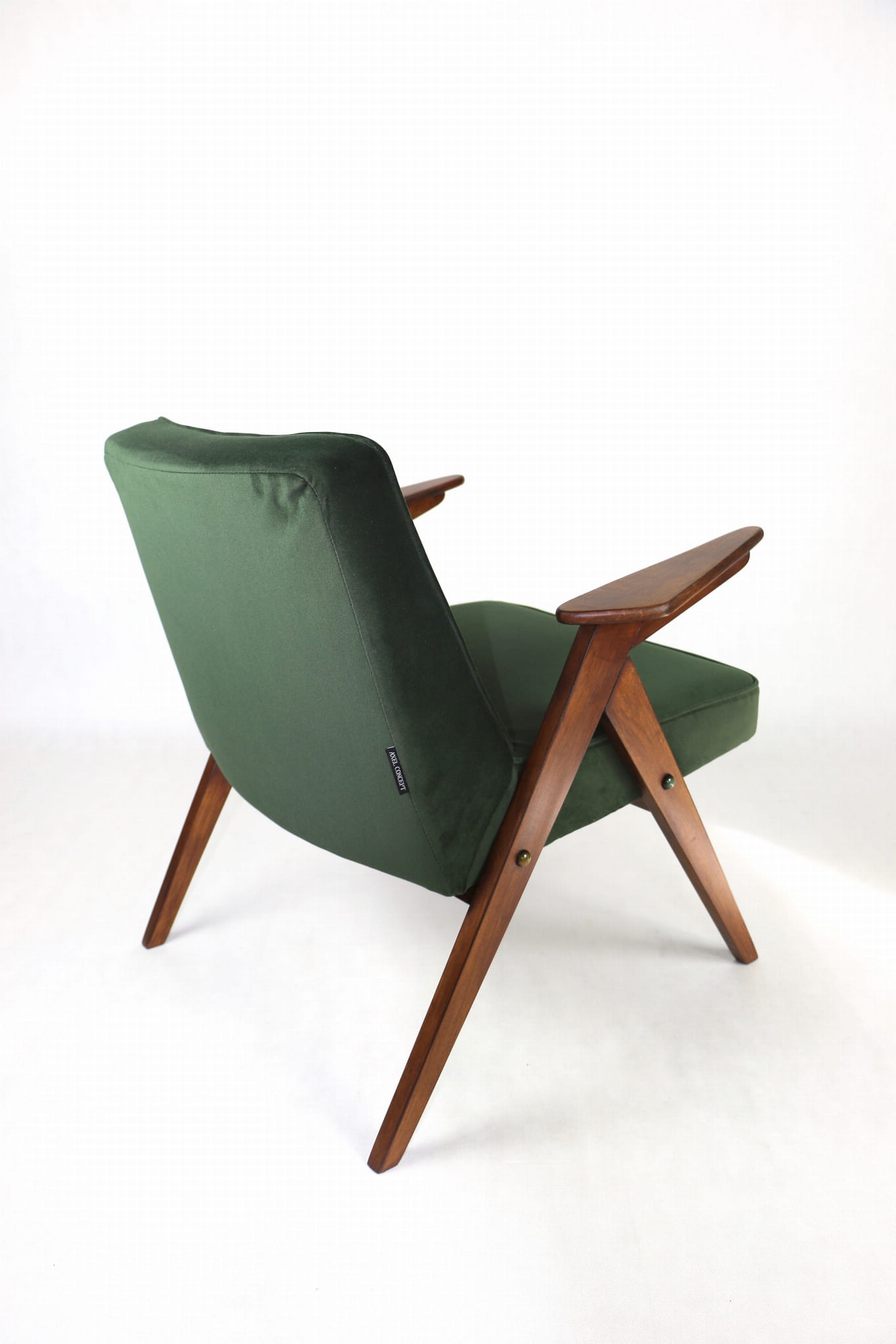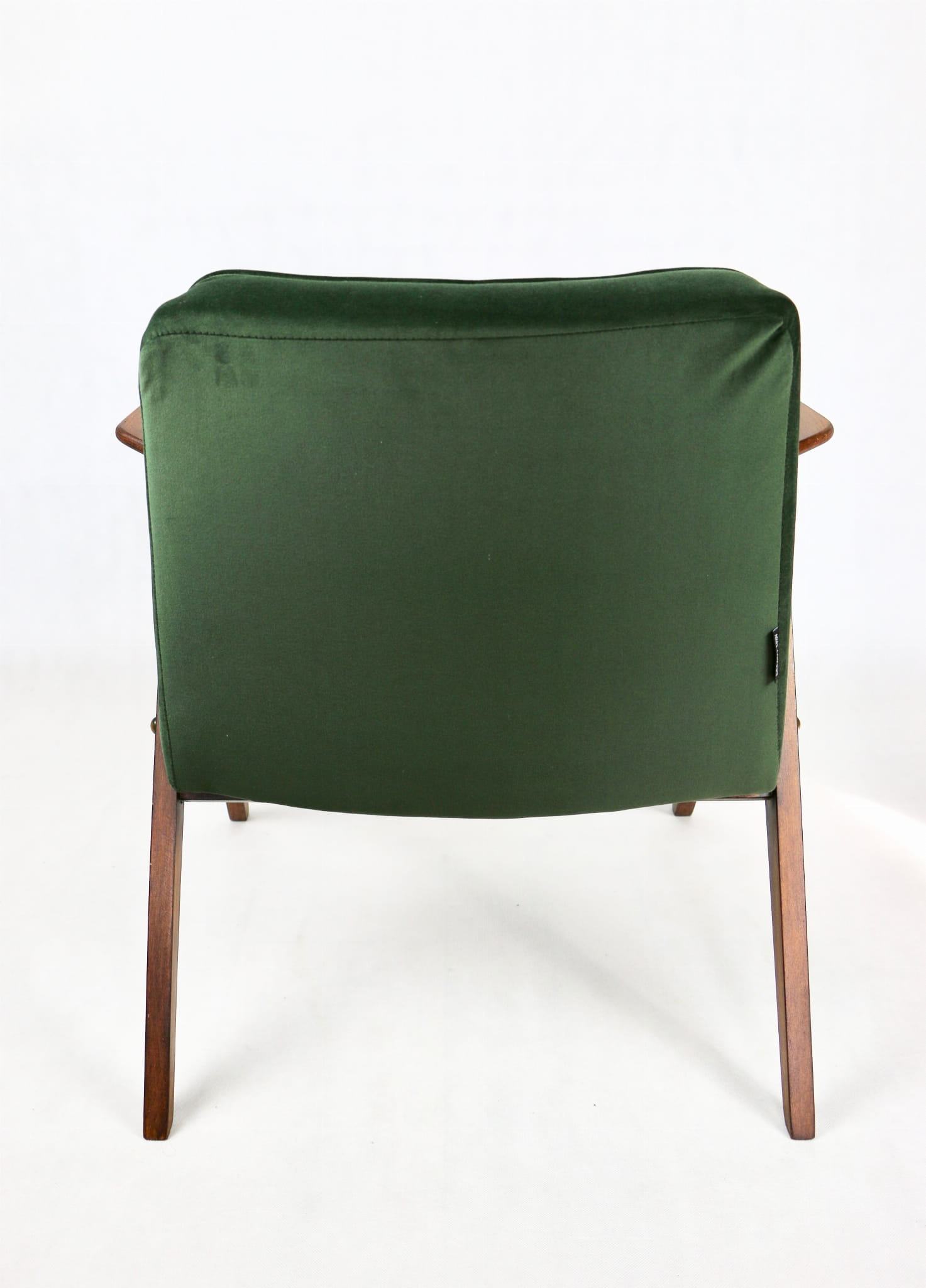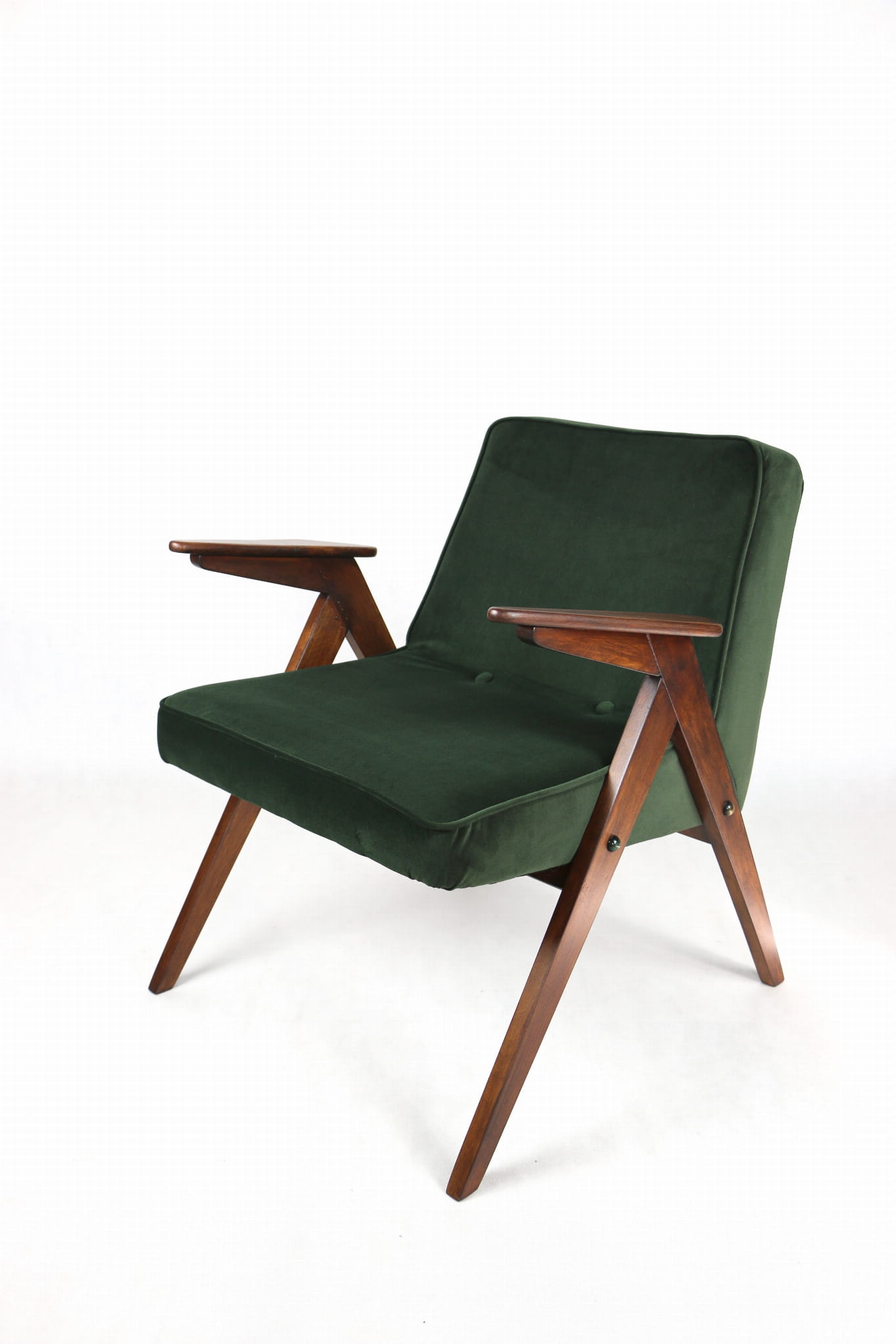 Fotel Bunny projektu J.Chierowski, kompletnie odrestaurowany. Nowe obicie pokryte aksamitnym materiałem tapicerskim Jade 508 w zielono-oliwkowym kolorze. Stelaż drewniany z podłokietnikami w kolorze ciemnego naturalnego drewna.