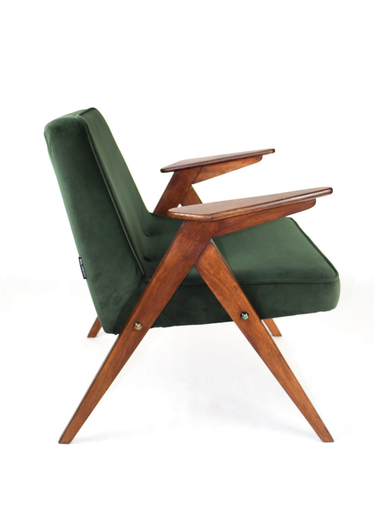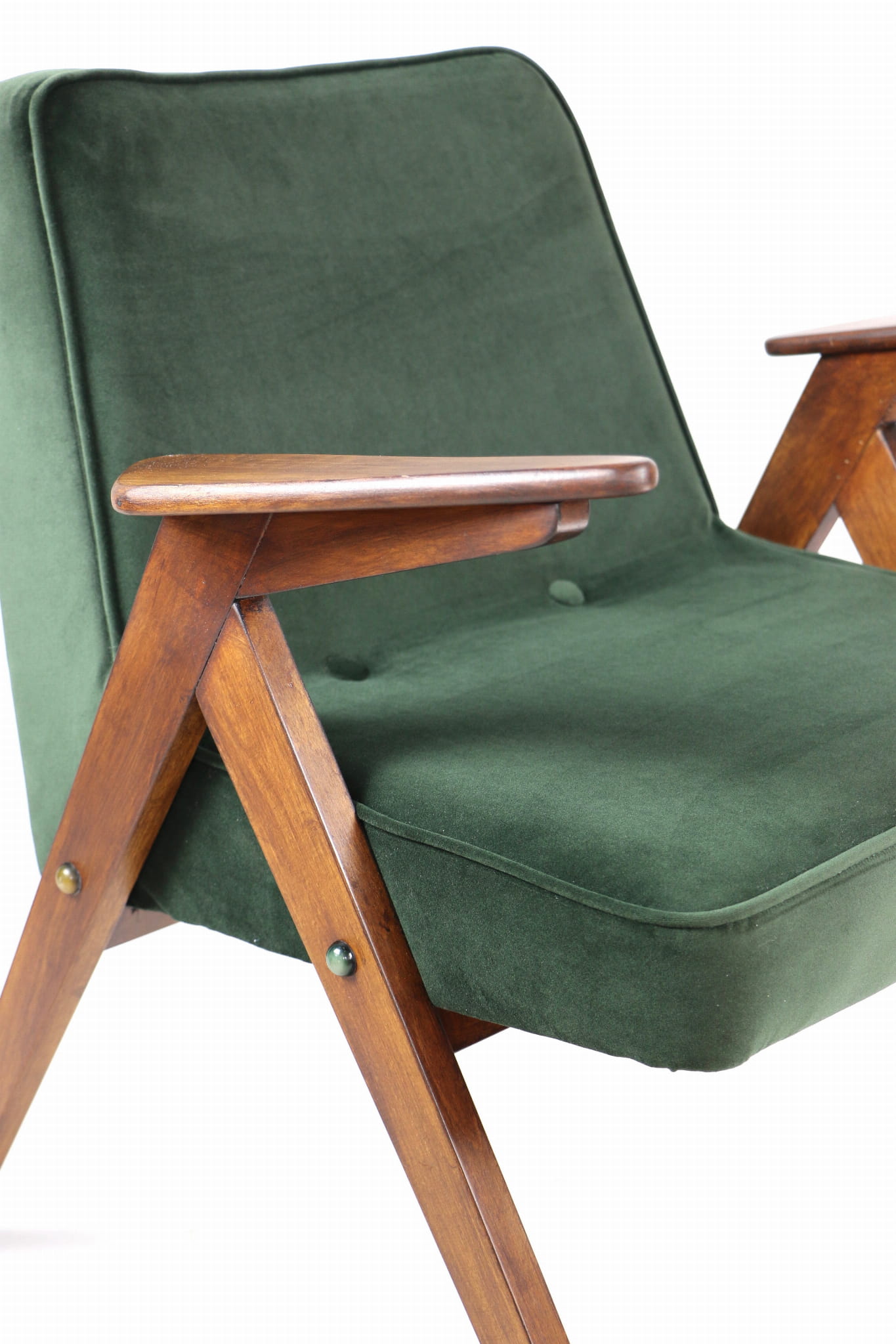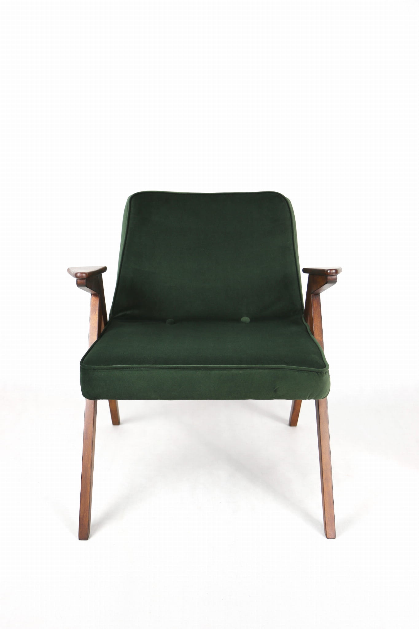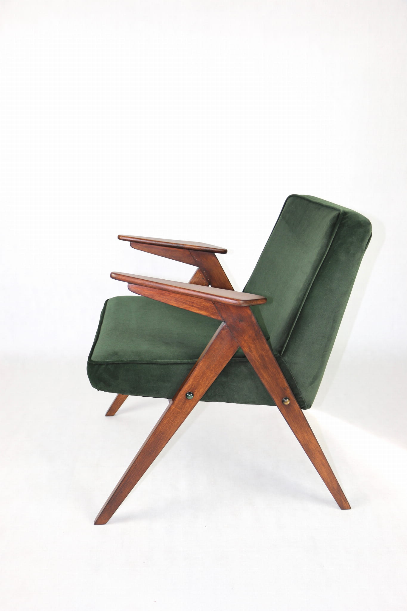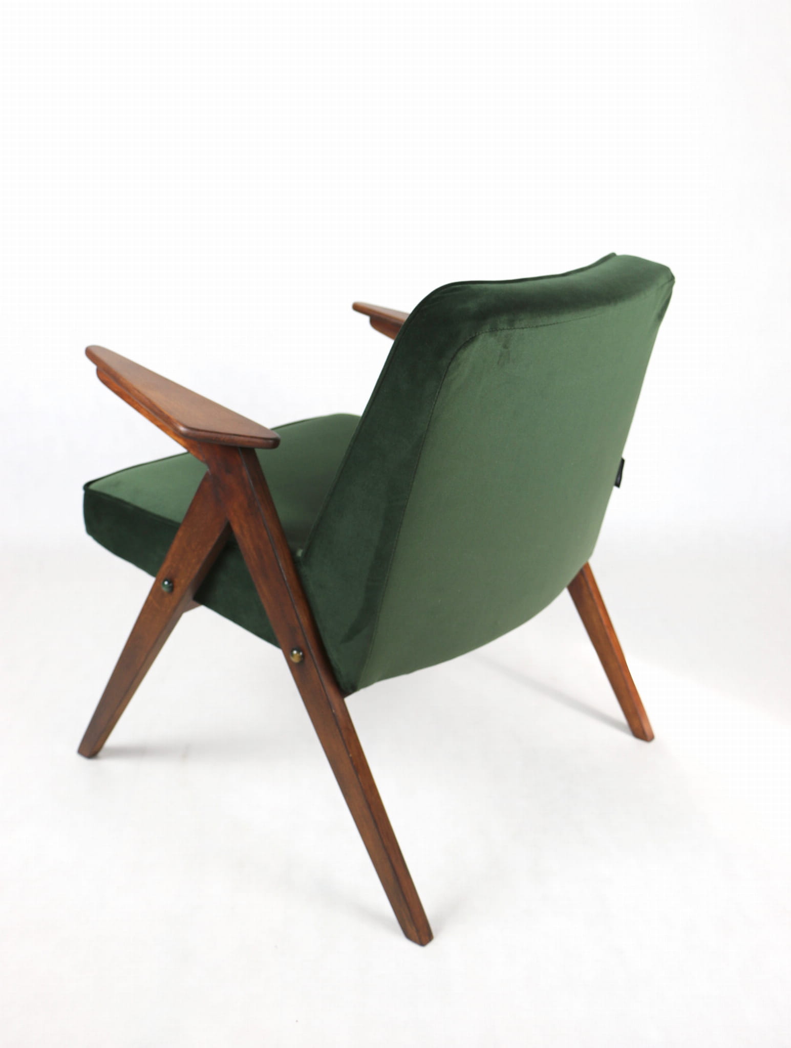 Fotel Bunny projektu J.Chierowski, kompletnie odrestaurowany. Nowe obicie pokryte aksamitnym materiałem tapicerskim Jade 508 w zielono-oliwkowym kolorze. Stelaż drewniany z podłokietnikami w kolorze ciemnego naturalnego drewna.