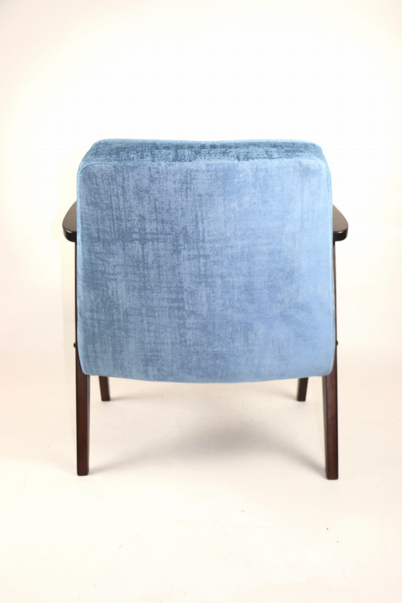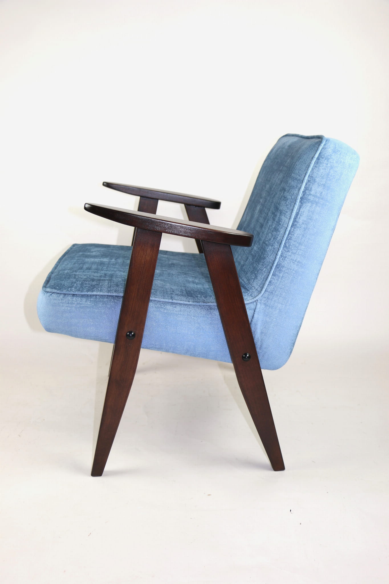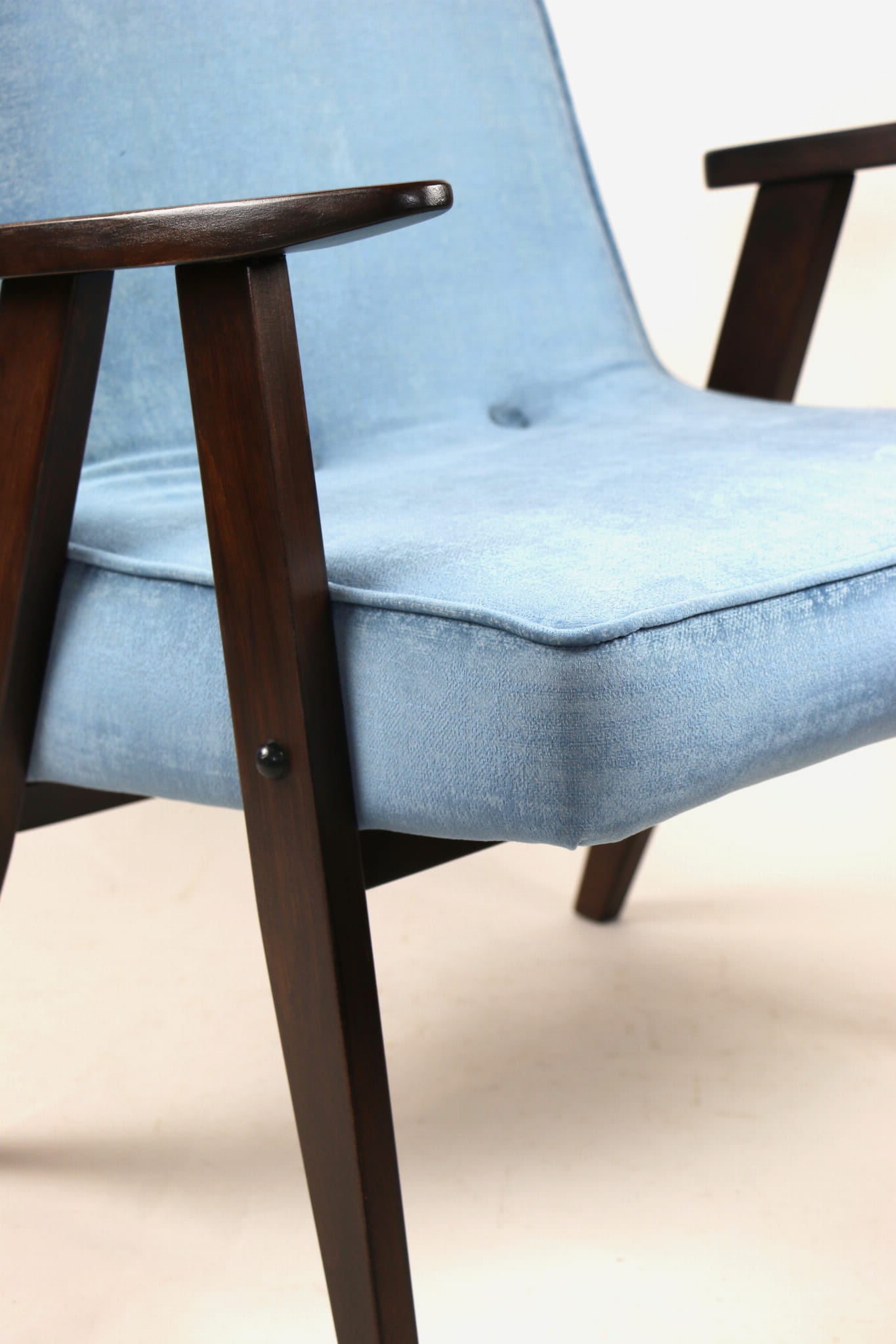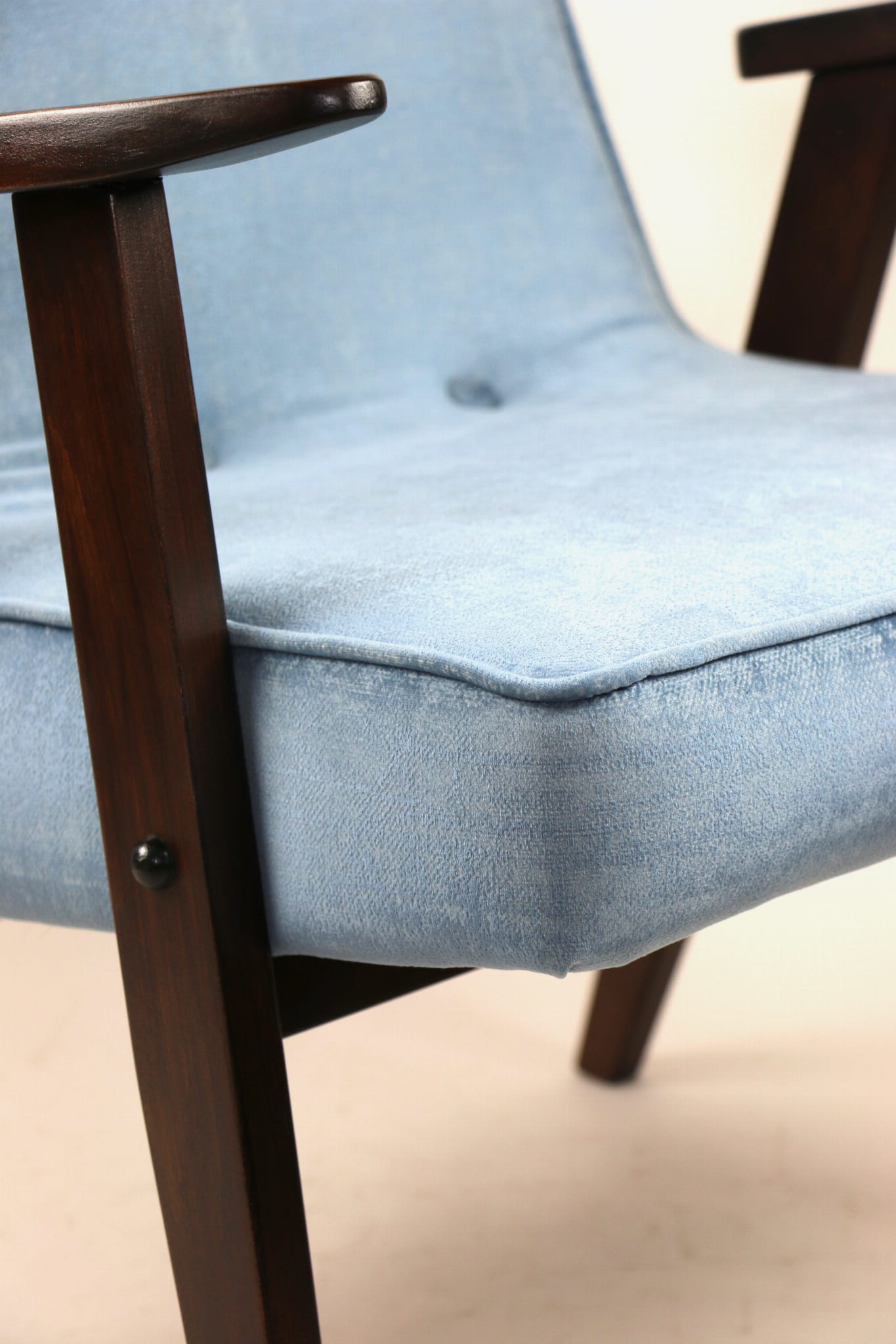 Fotel 366 Józefa Chierowskiego całkowicie odrestaurowany. Nowe obicie pokryte najwyższej jakości materiałem tapicerskim w kolorze błękitnym z serii welwetów strukturalnych o nazwie Chameleon. Stelaż drewniany z podłokietnikami lakierowany w kolorze orzech - palisander.