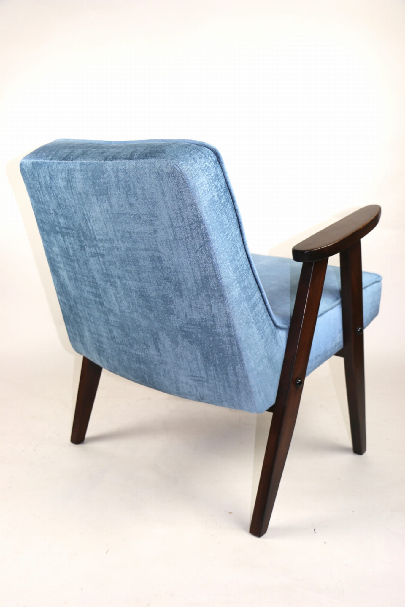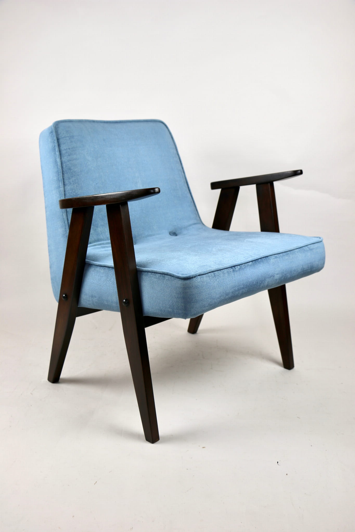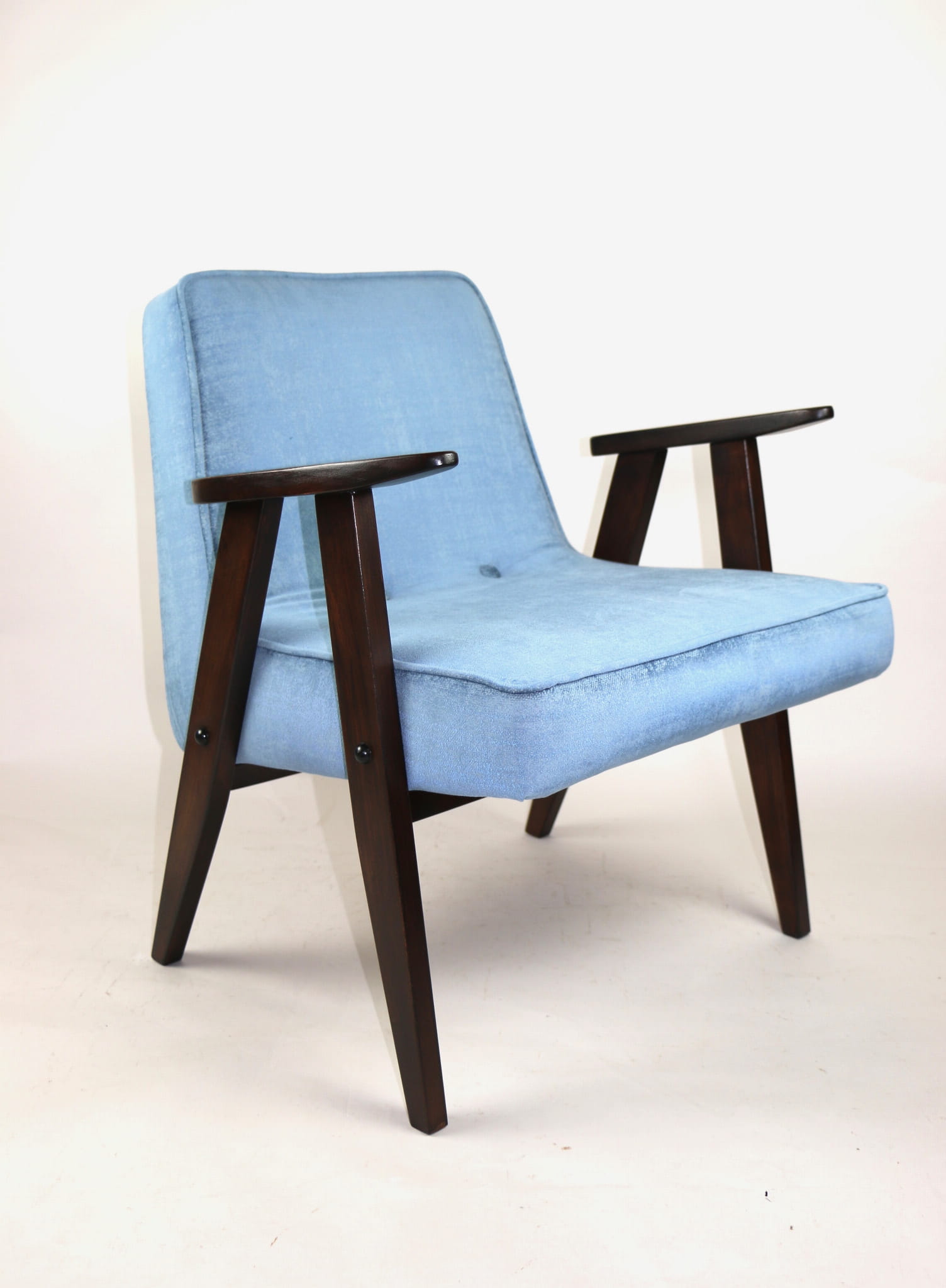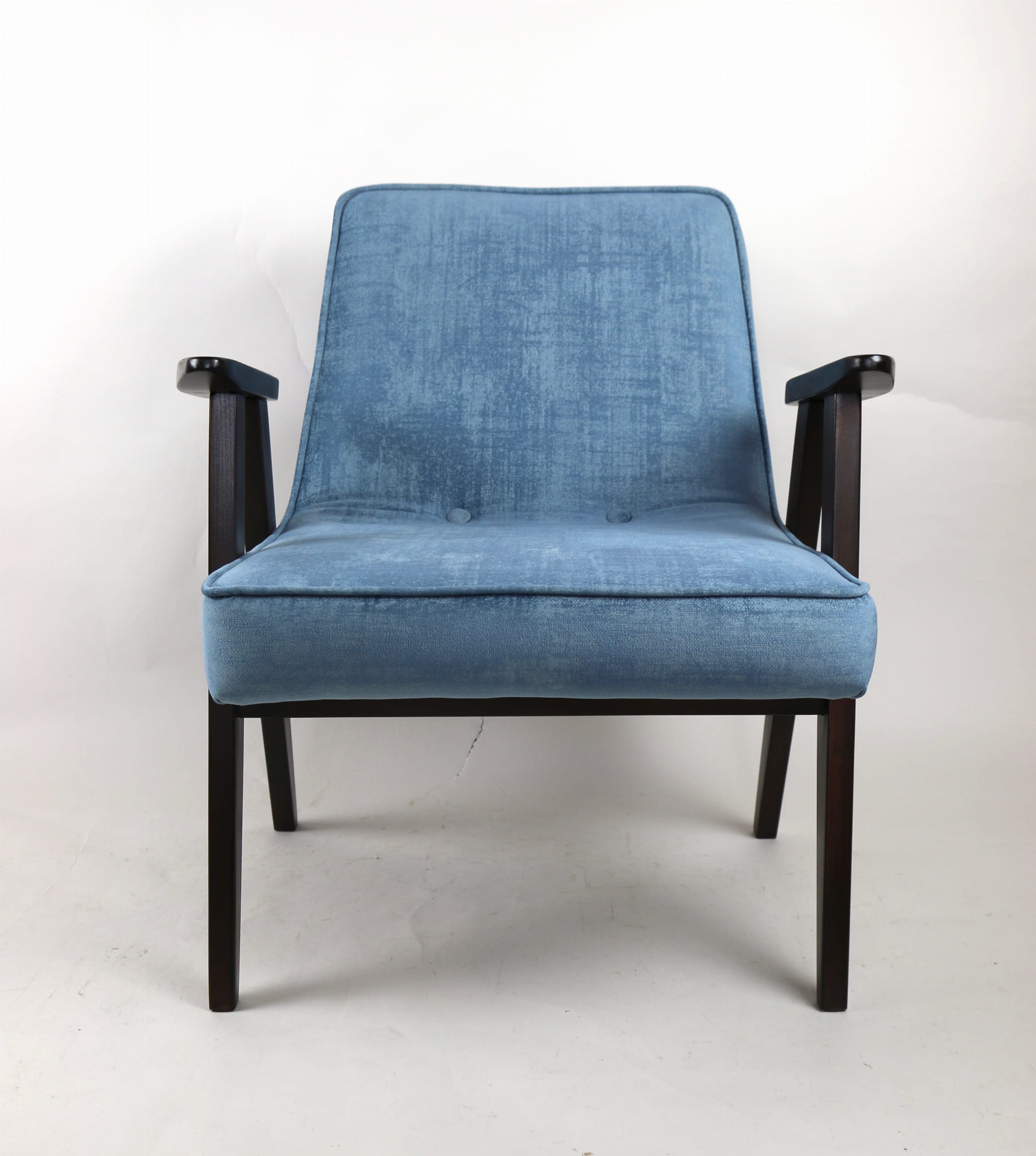 Fotel 366 Józefa Chierowskiego całkowicie odrestaurowany. Nowe obicie pokryte najwyższej jakości materiałem tapicerskim w kolorze błękitnym z serii welwetów strukturalnych o nazwie Chameleon. Stelaż drewniany z podłokietnikami lakierowany w kolorze orzech - palisander.