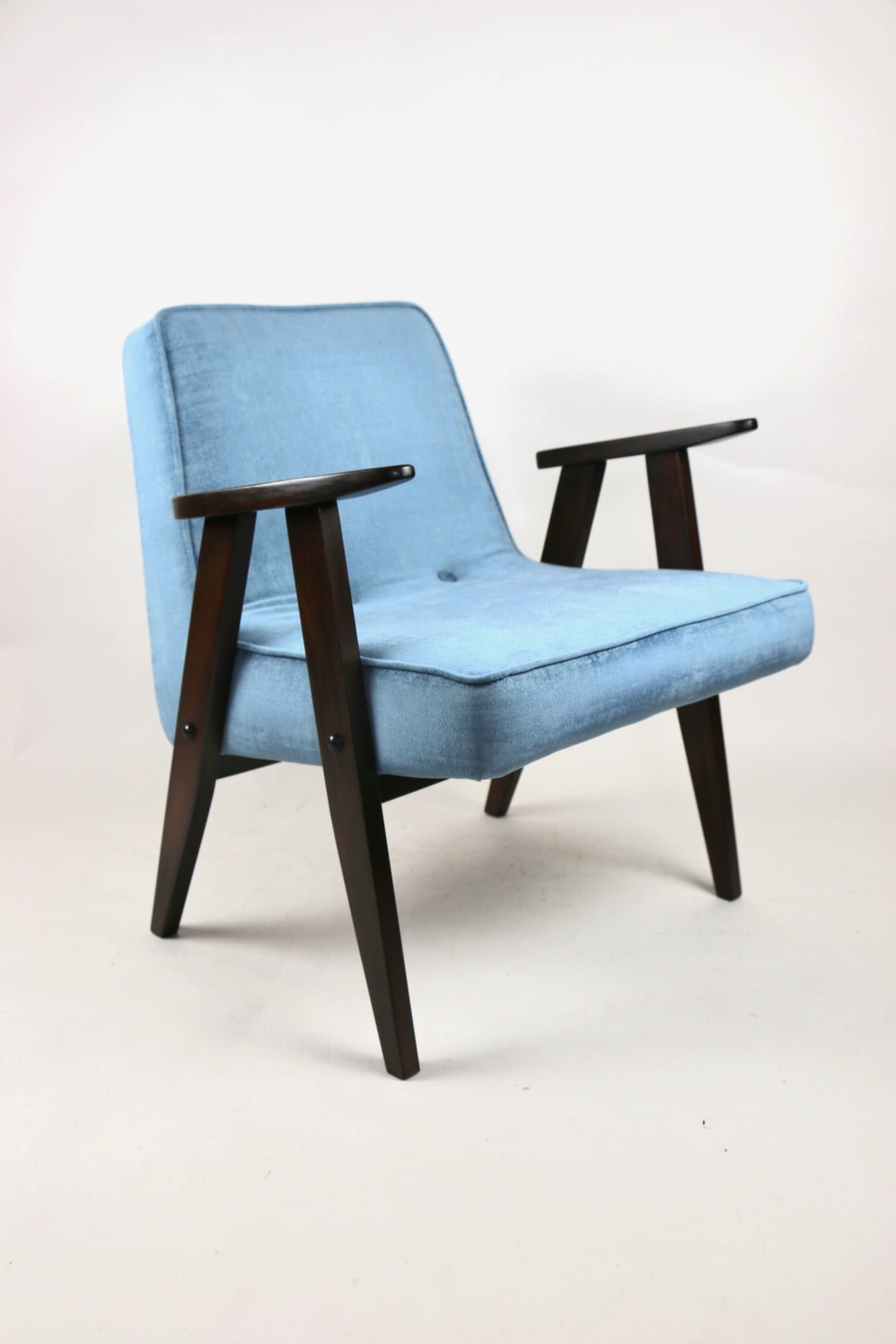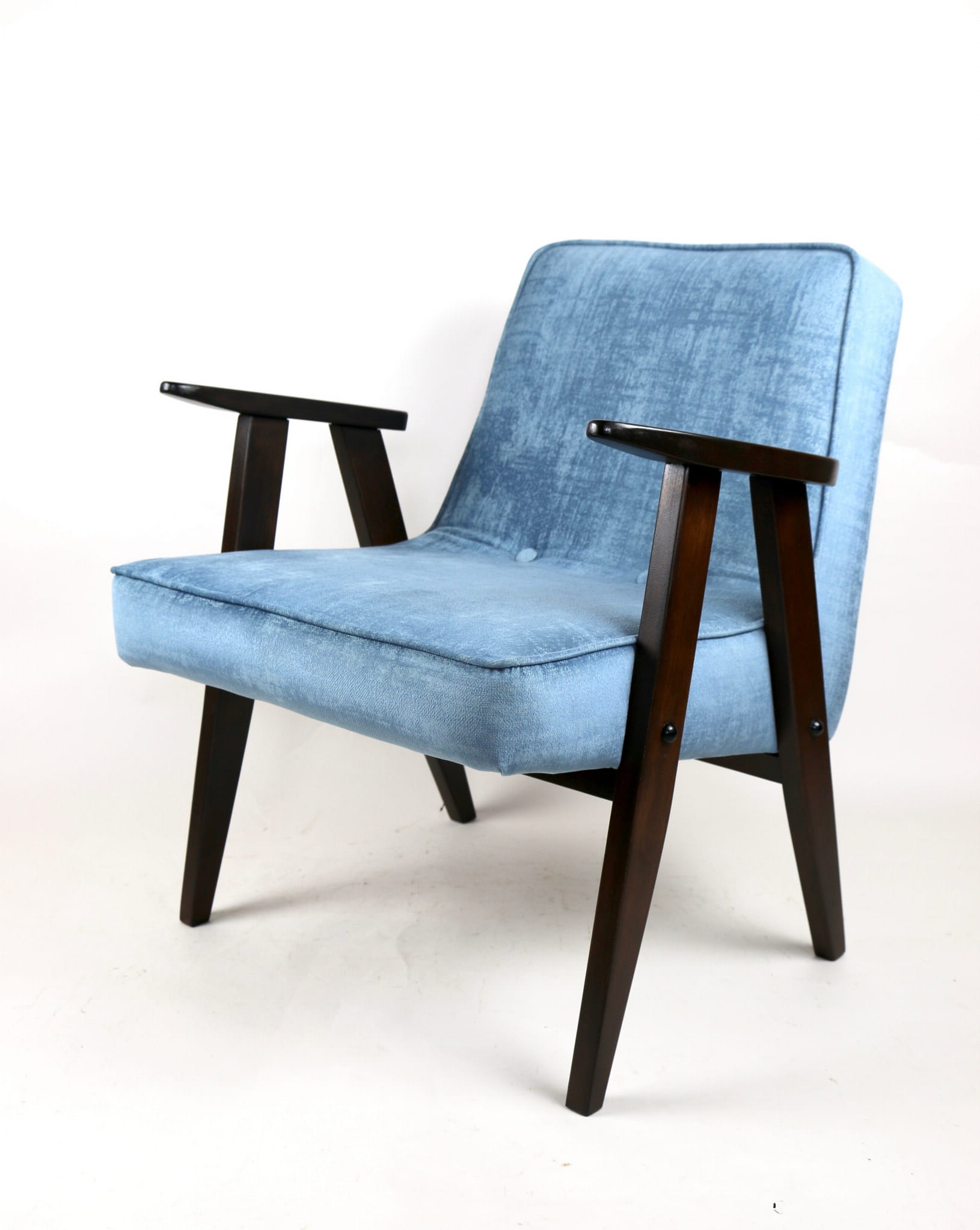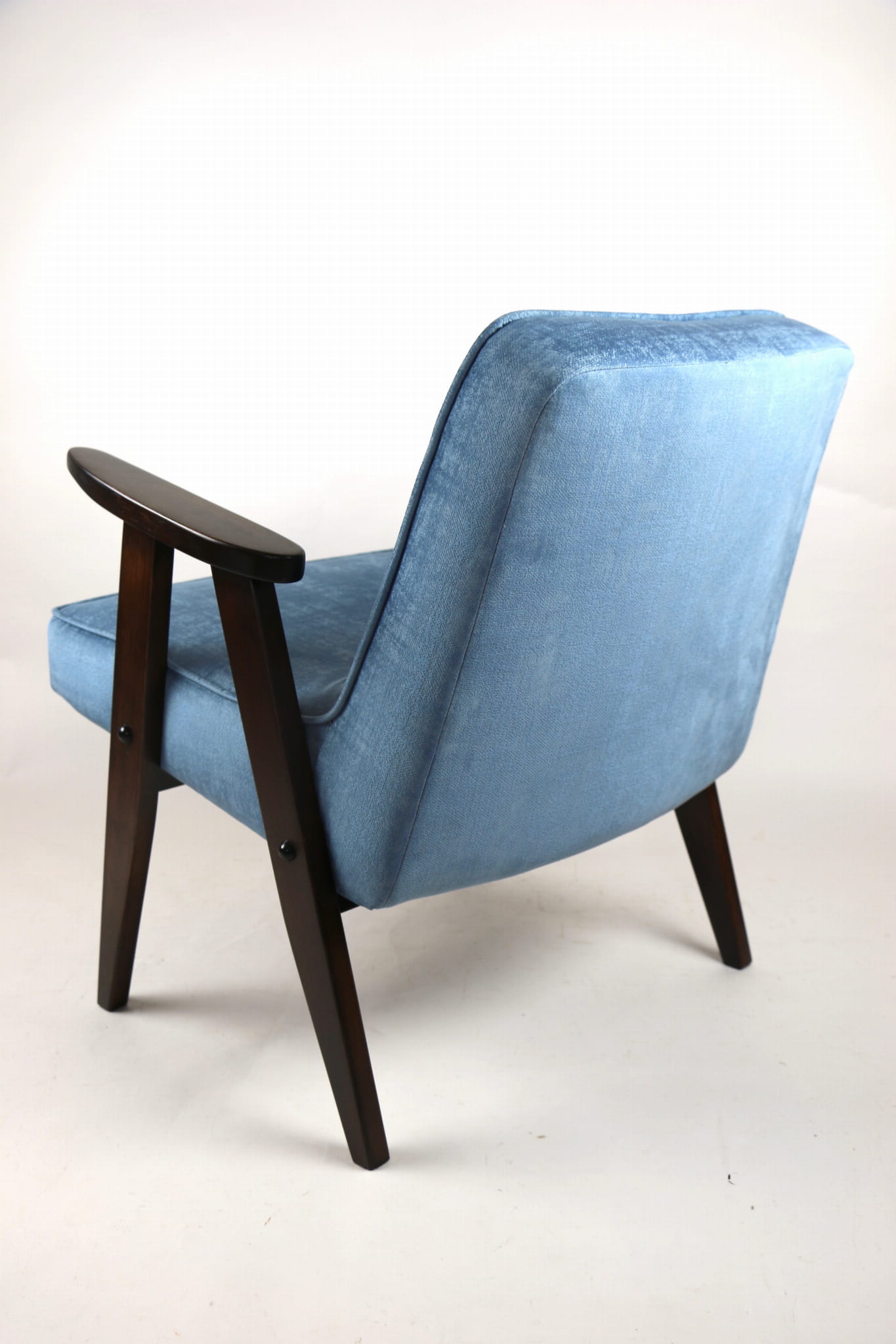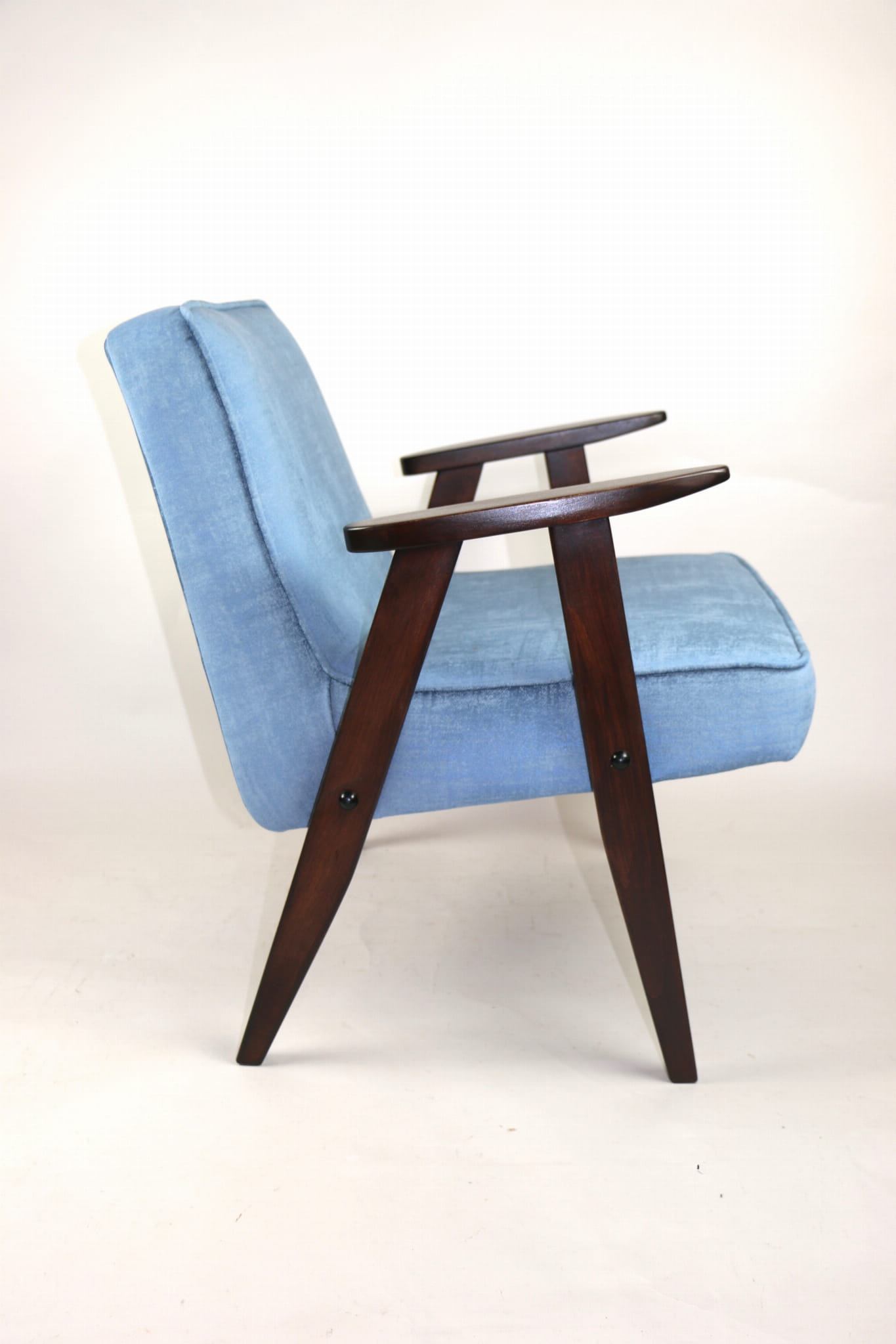 Fotel 366 Józefa Chierowskiego całkowicie odrestaurowany. Nowe obicie pokryte najwyższej jakości materiałem tapicerskim w kolorze błękitnym z serii welwetów strukturalnych o nazwie Chameleon. Stelaż drewniany z podłokietnikami lakierowany w kolorze orzech - palisander.