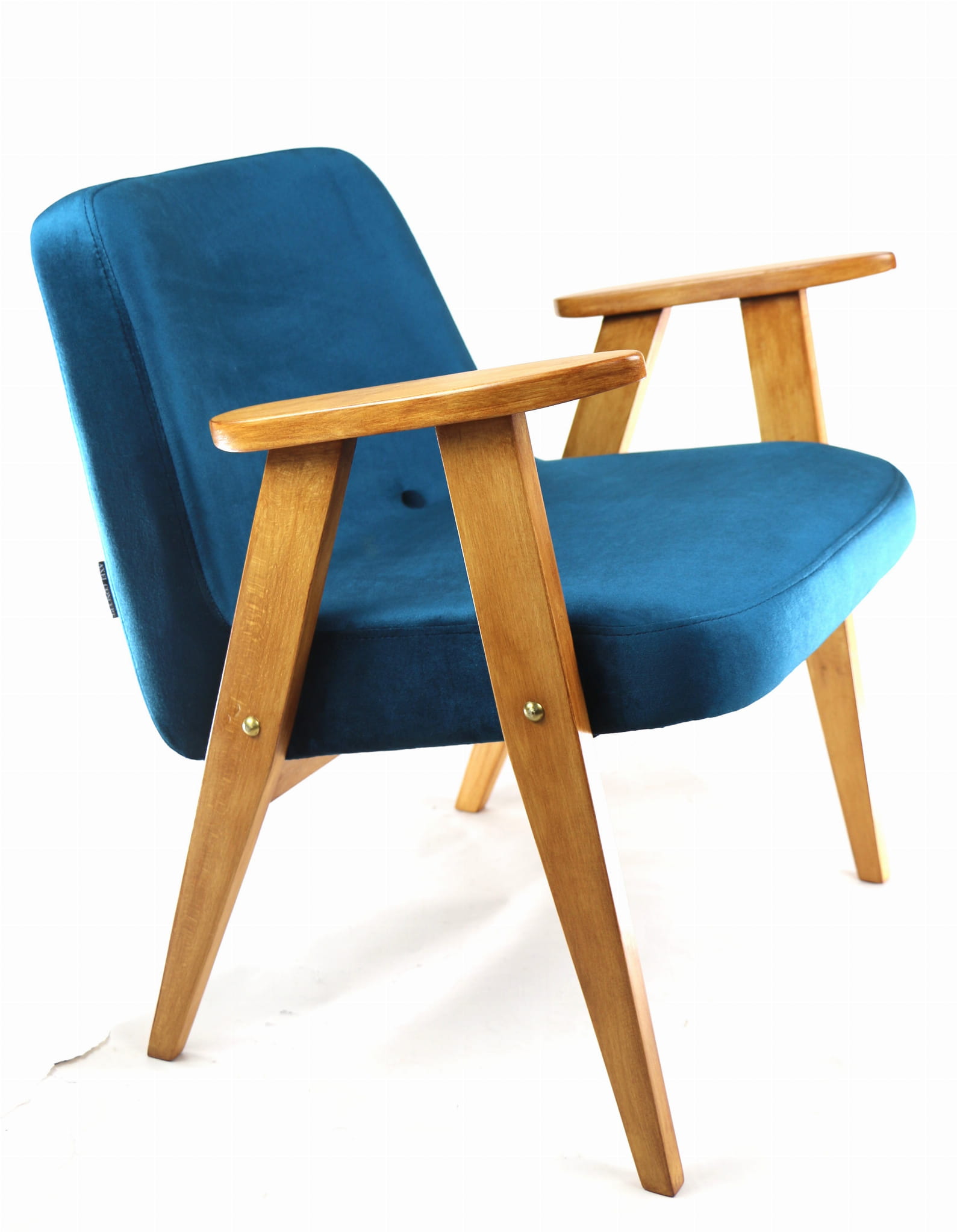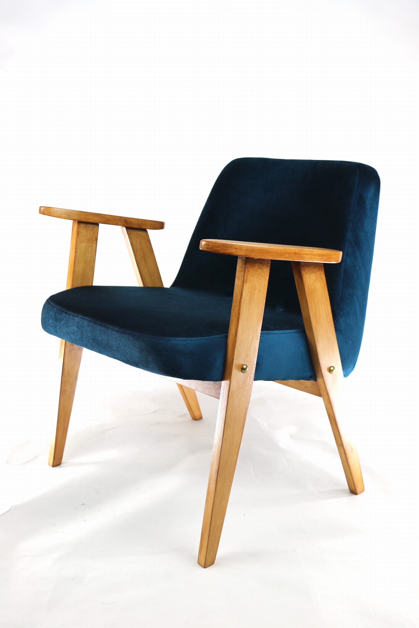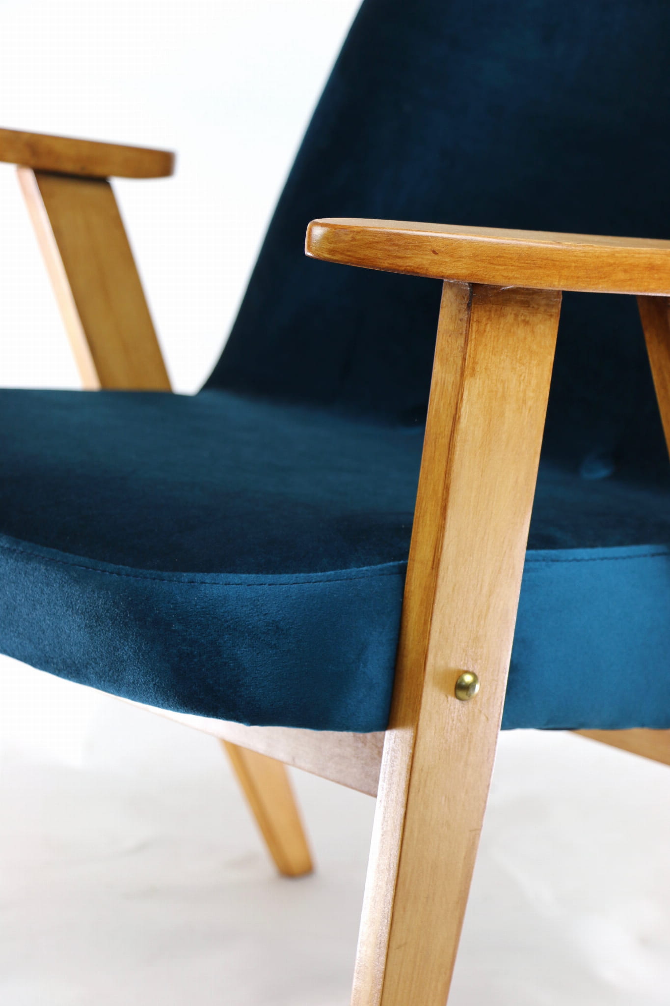 Fotel 366 Józefa Chierowskiego, odrestaurowany. Nowe obicie pokryte najwyższej jakości materiałem tapicerskim w kolorze zielonym z serii welwetów. Stelaż drewniany z podłokietnikami w kolorze palisander. Jeden z podłokietników posiada delikatne wgłębienia w drewnie, które są widoczne na zdjęciu.