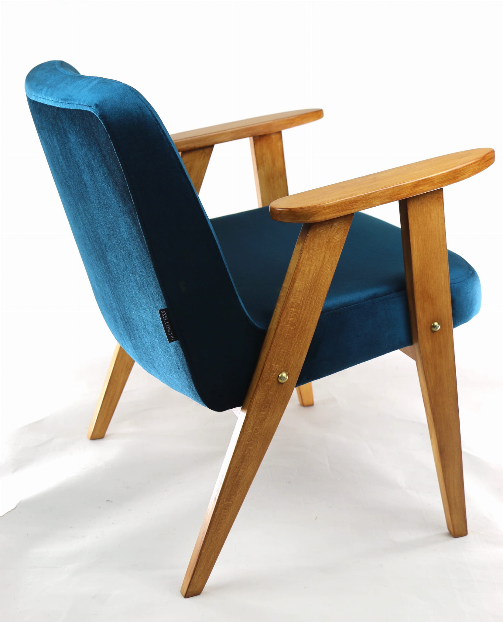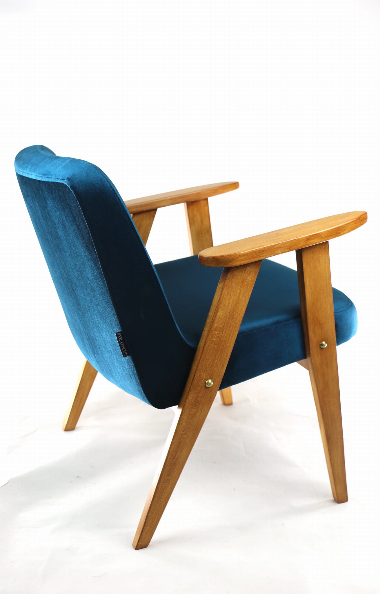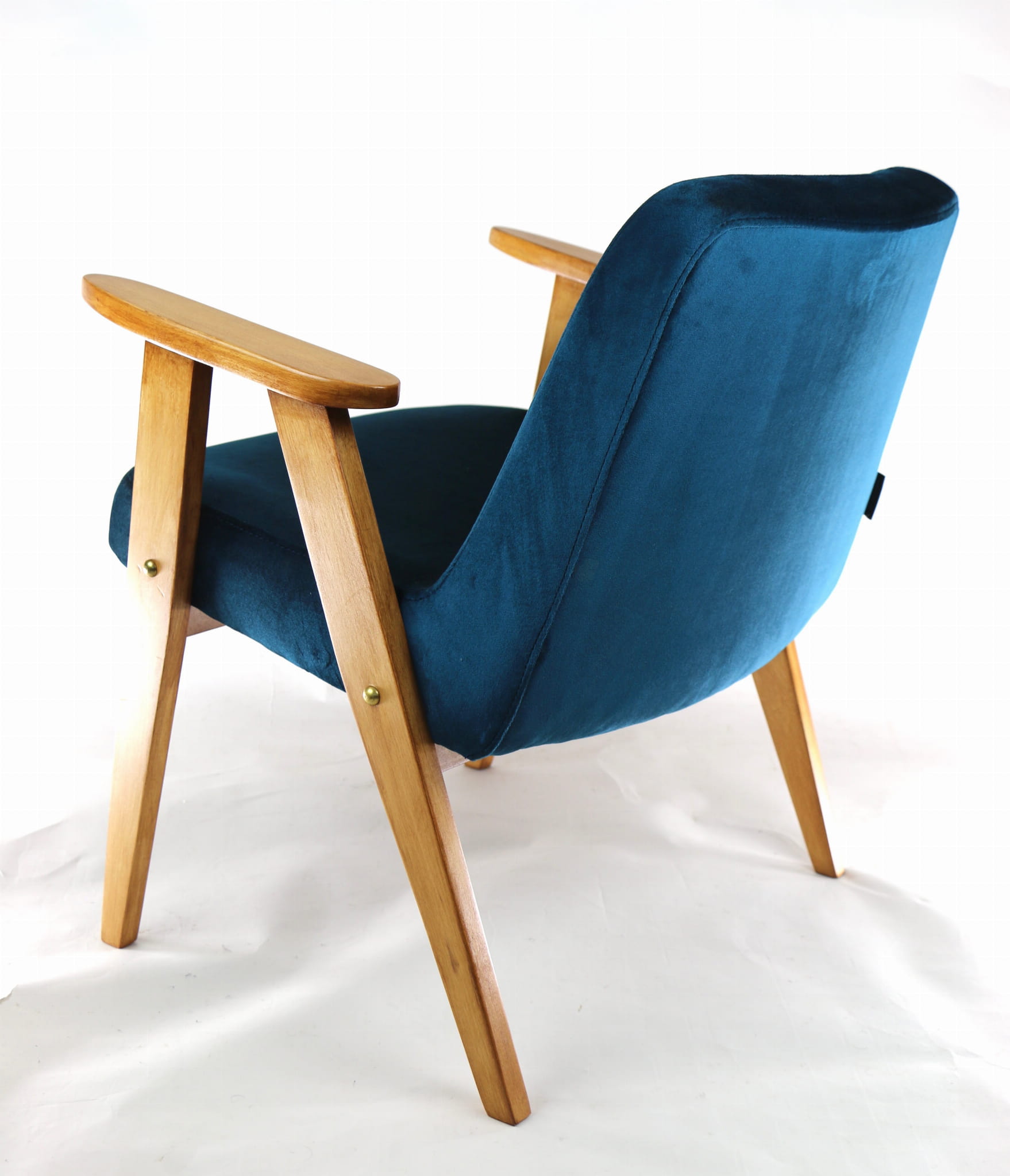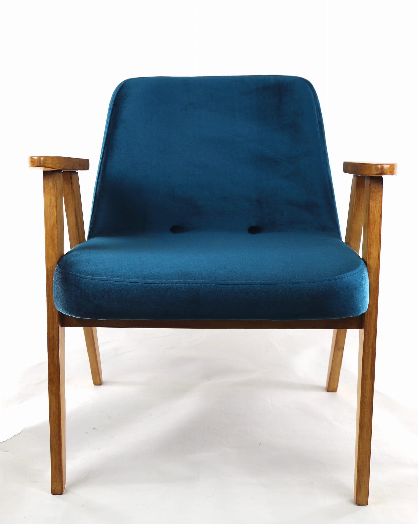 Fotel 366 Józefa Chierowskiego, odrestaurowany. Nowe obicie pokryte najwyższej jakości materiałem tapicerskim w kolorze zielonym z serii welwetów. Stelaż drewniany z podłokietnikami w kolorze palisander. Jeden z podłokietników posiada delikatne wgłębienia w drewnie, które są widoczne na zdjęciu.
