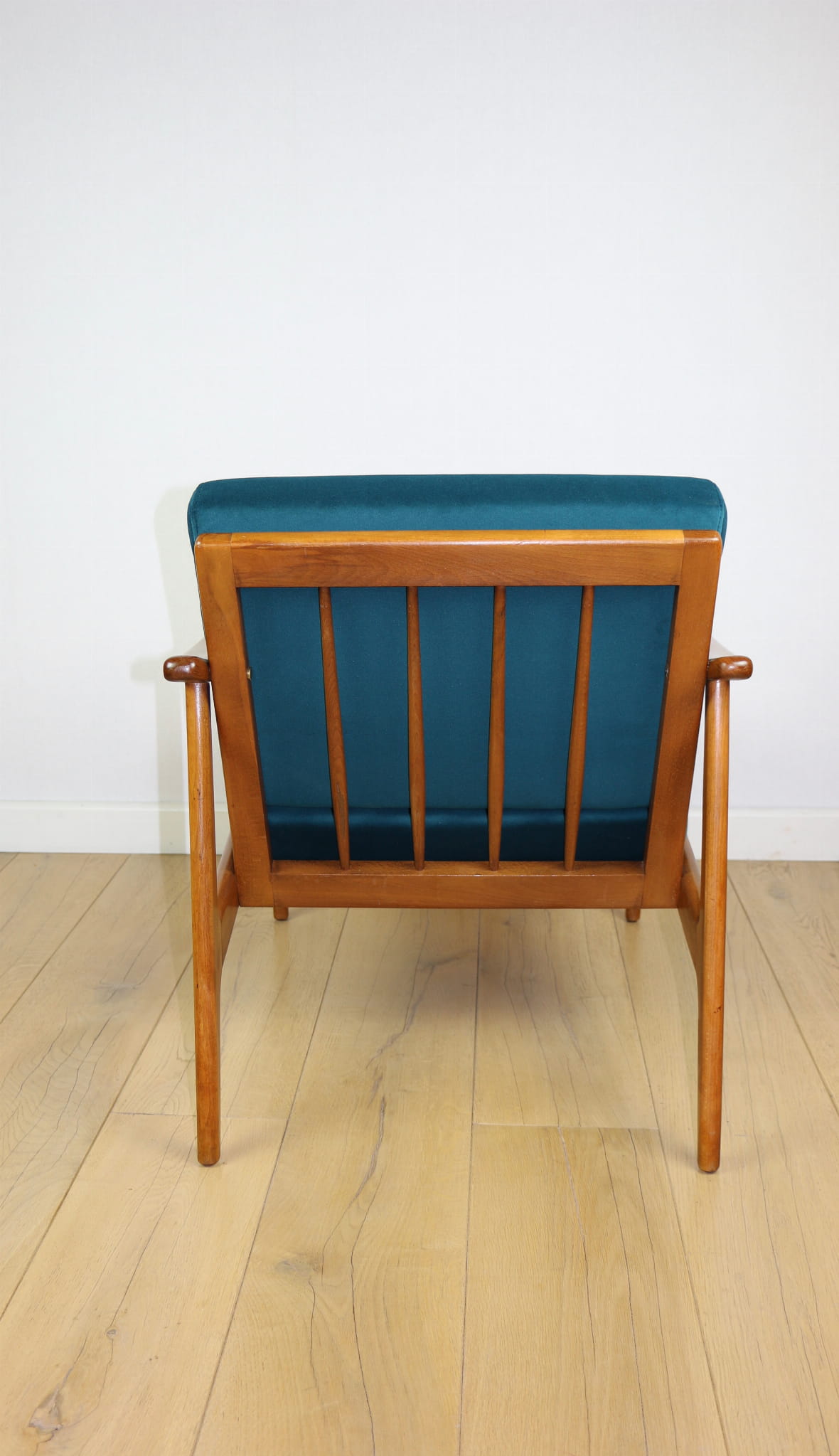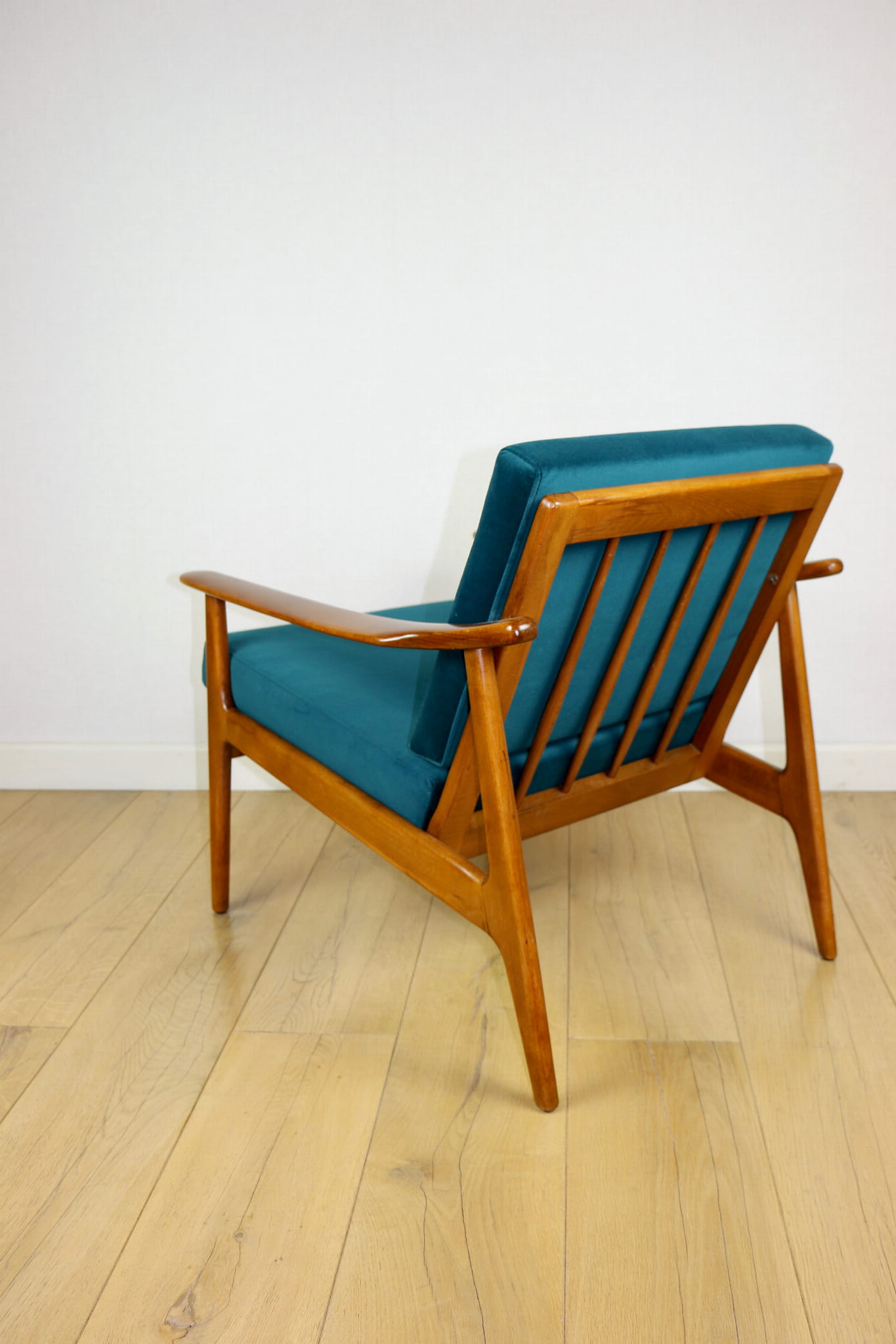 - Tapicerka – nowa tkanina typu welwet easy to clean, miękka i przyjemna w dotyku, o wyrazistej strukturze w kolorze zielono-morskim. Wnętrze fotela – zarówno siedzisko, jak i oparcie – zostało wypełnione nowymi materiałami, co zapewnia pełnię komfortu i sprężystości.