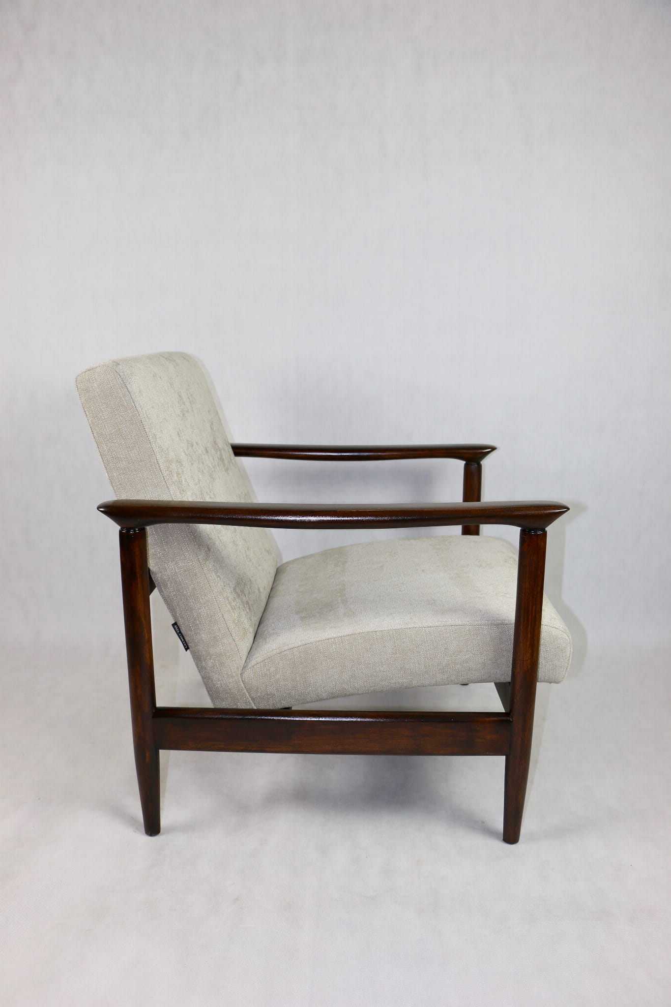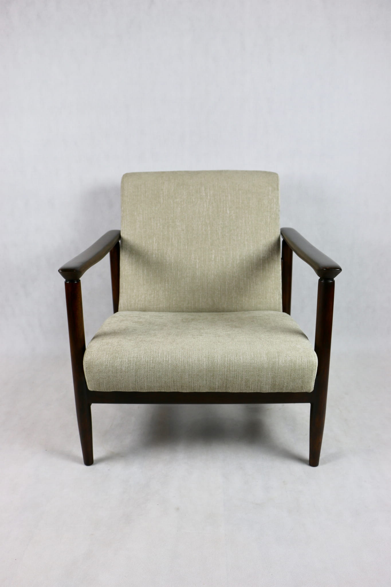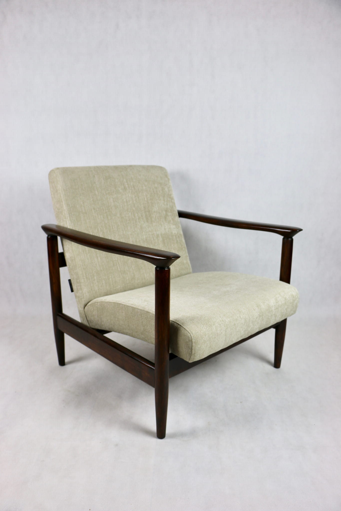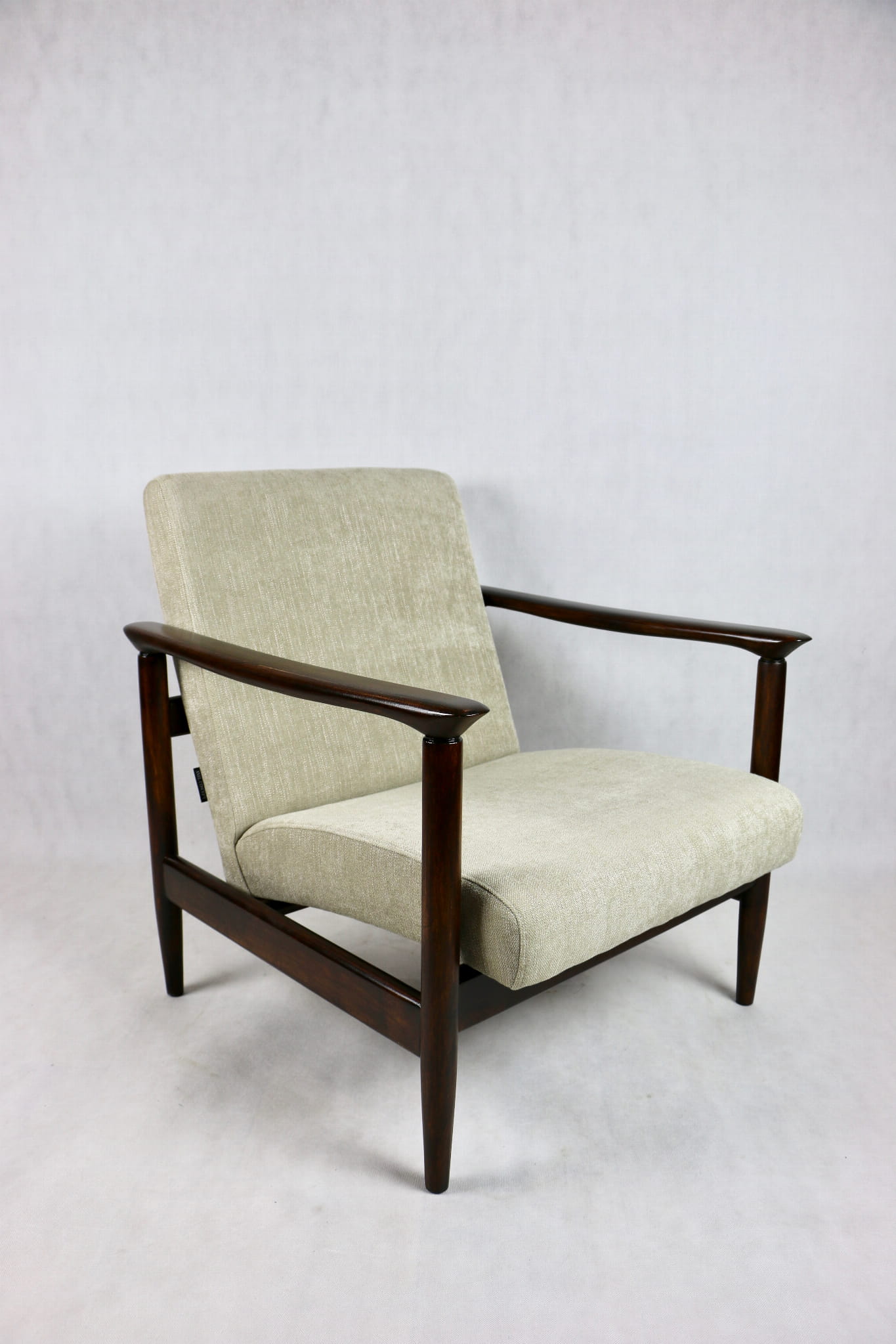 Fotel GFM - 142 zaprojektowany przez Edmunda Homa. Kompletnie odrestaurowany - nowa tapicerka wraz z wypełnieniem została pokryta naturalnym materiałem tapicerskim strukturalnym w kolorze beżowym. Podparcia i nóżki drewniane, naturalne pokryte lakiero-woskiem w kolorze ciemnego drewna.
