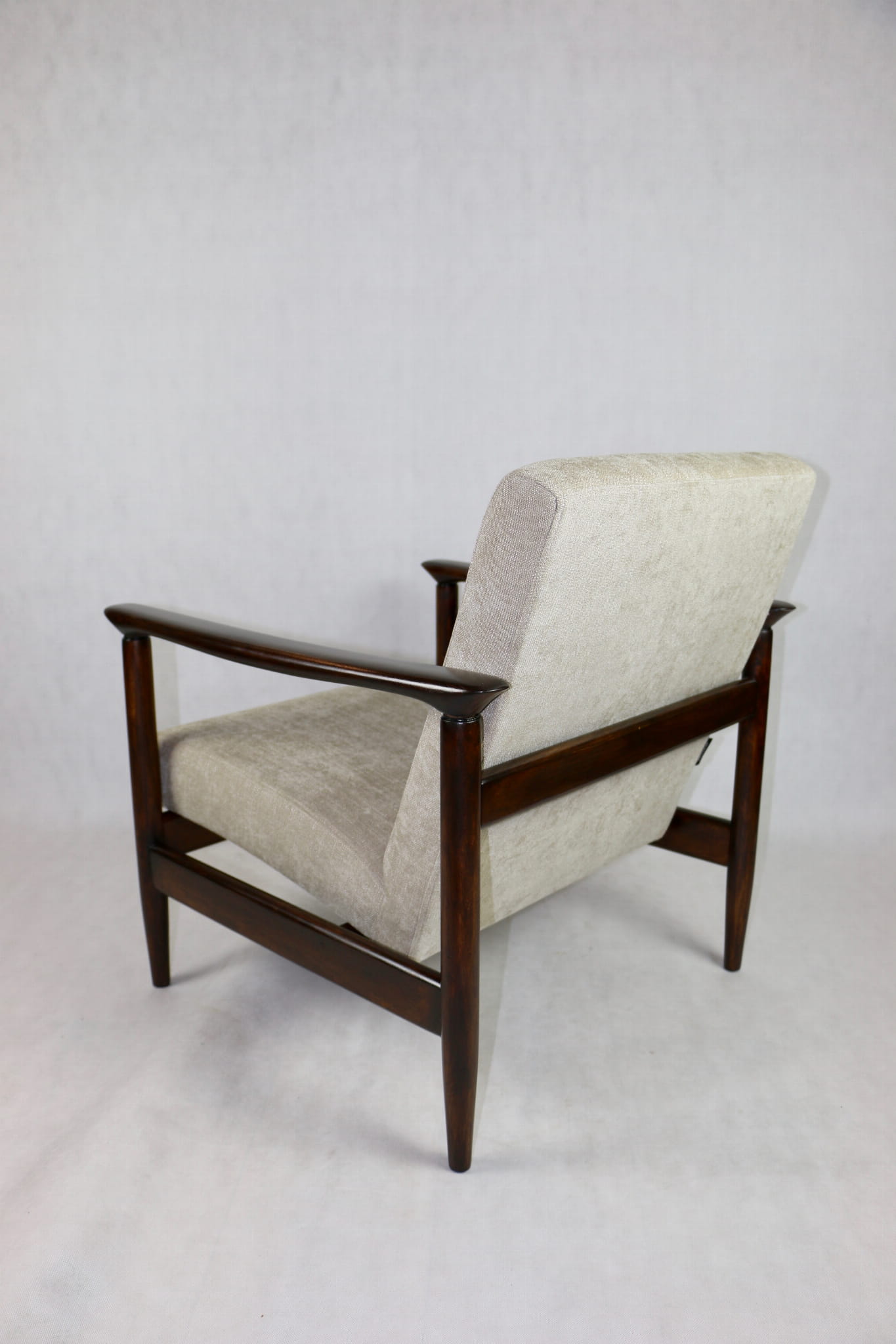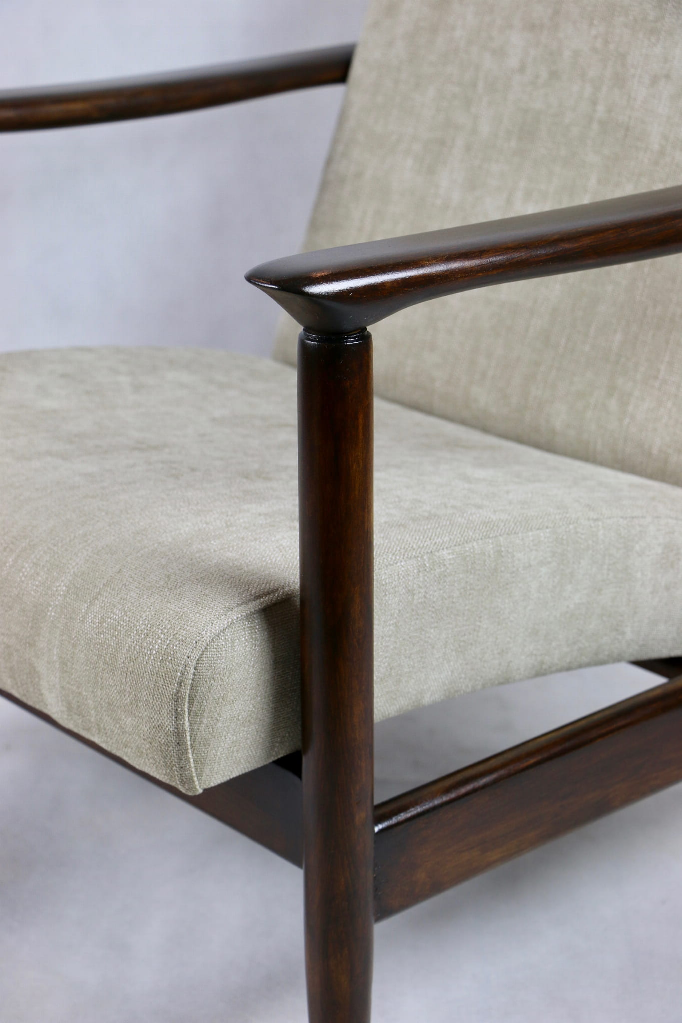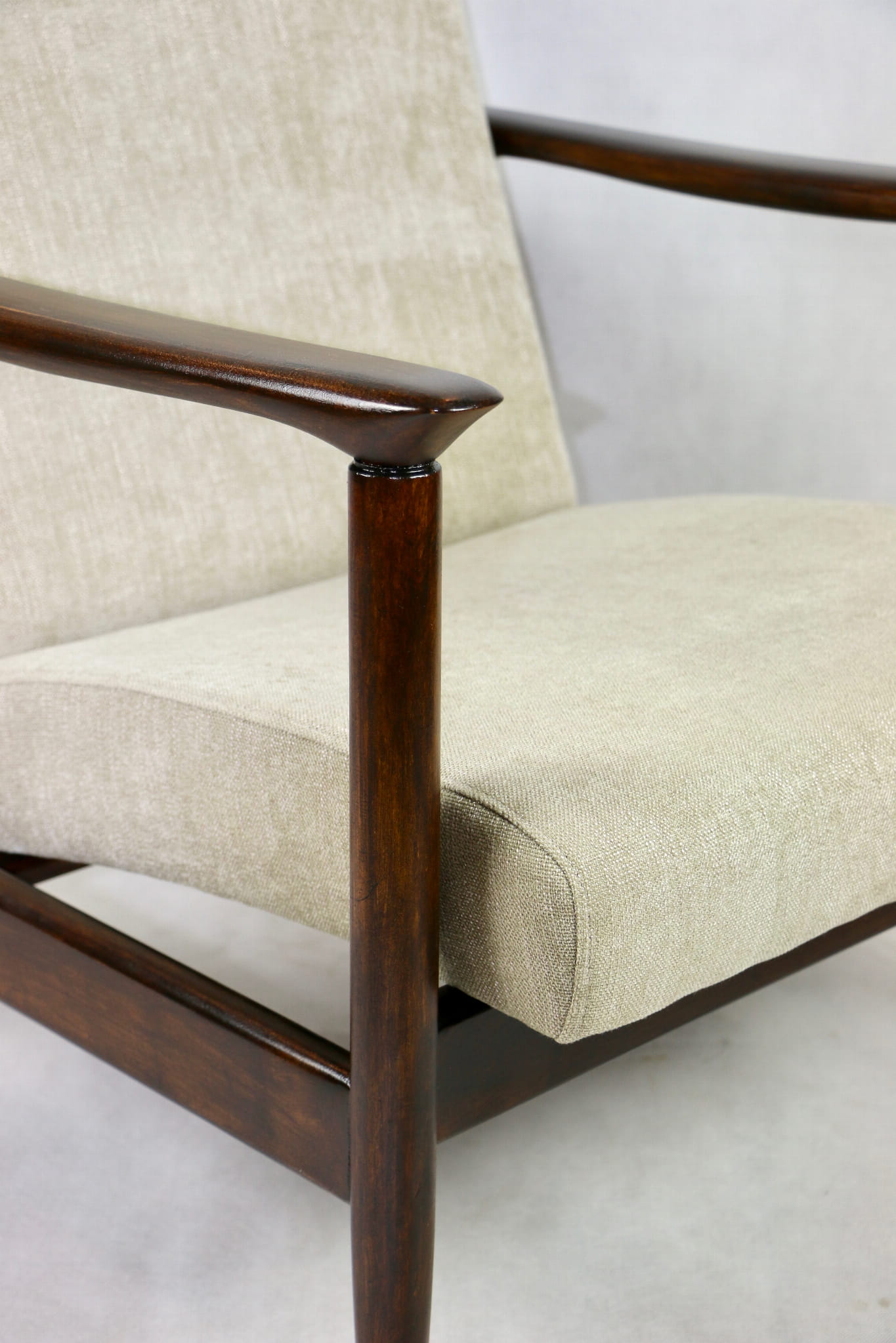 Fotel GFM - 142 zaprojektowany przez Edmunda Homa. Kompletnie odrestaurowany - nowa tapicerka wraz z wypełnieniem została pokryta naturalnym materiałem tapicerskim strukturalnym w kolorze beżowym. Podparcia i nóżki drewniane, naturalne pokryte lakiero-woskiem w kolorze ciemnego drewna.