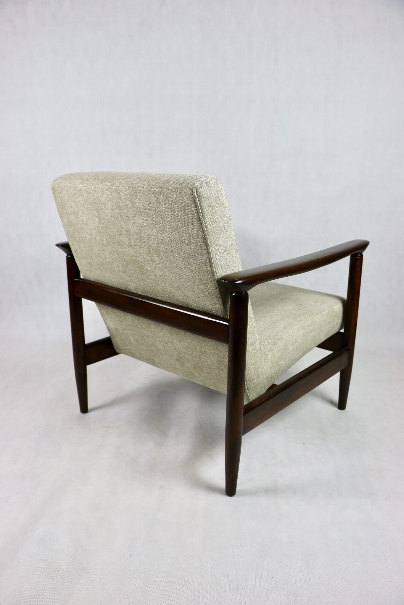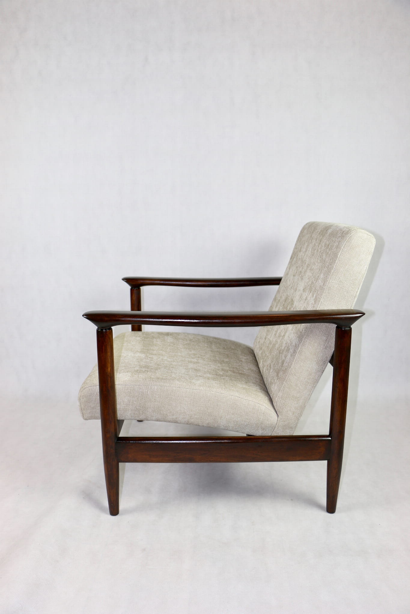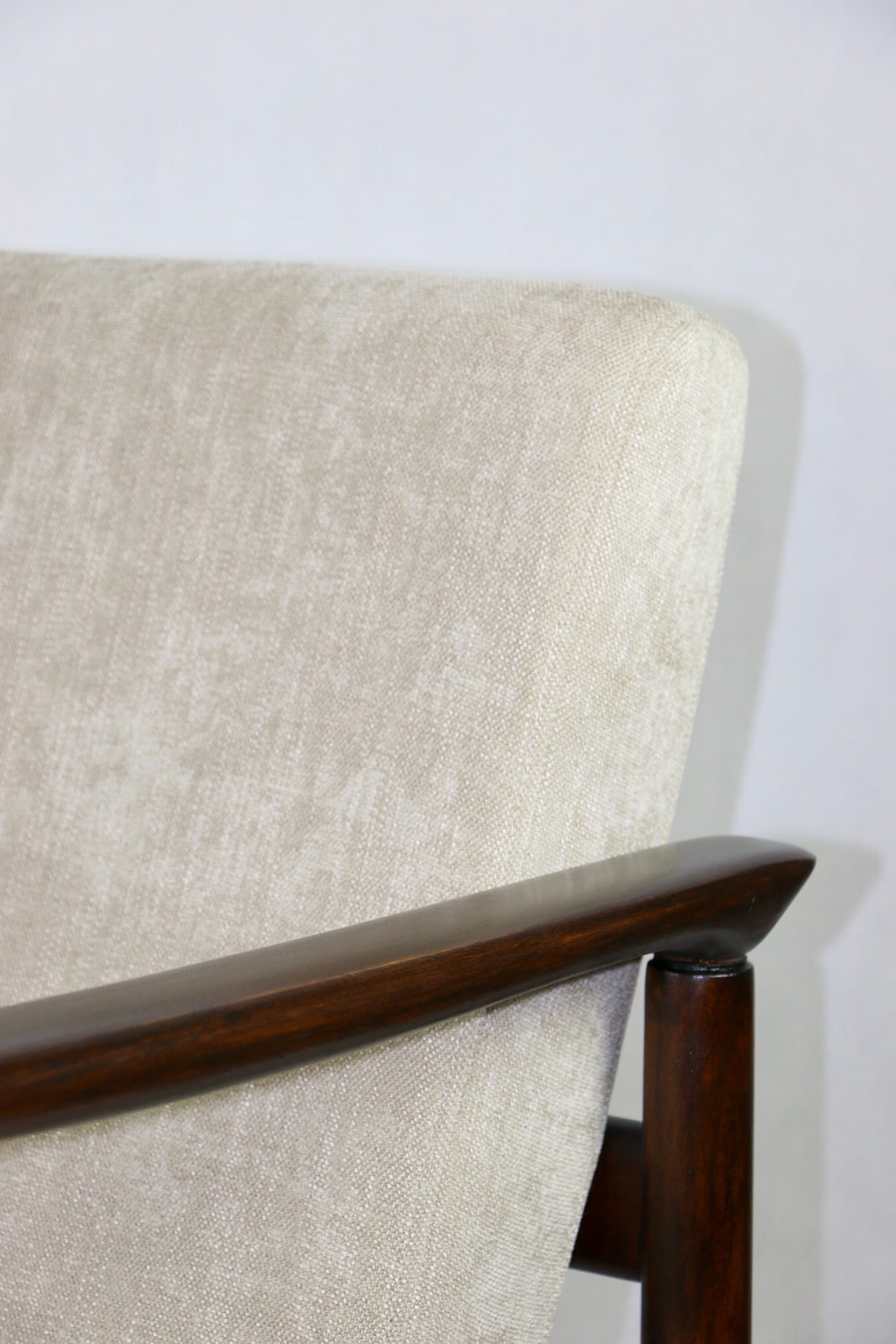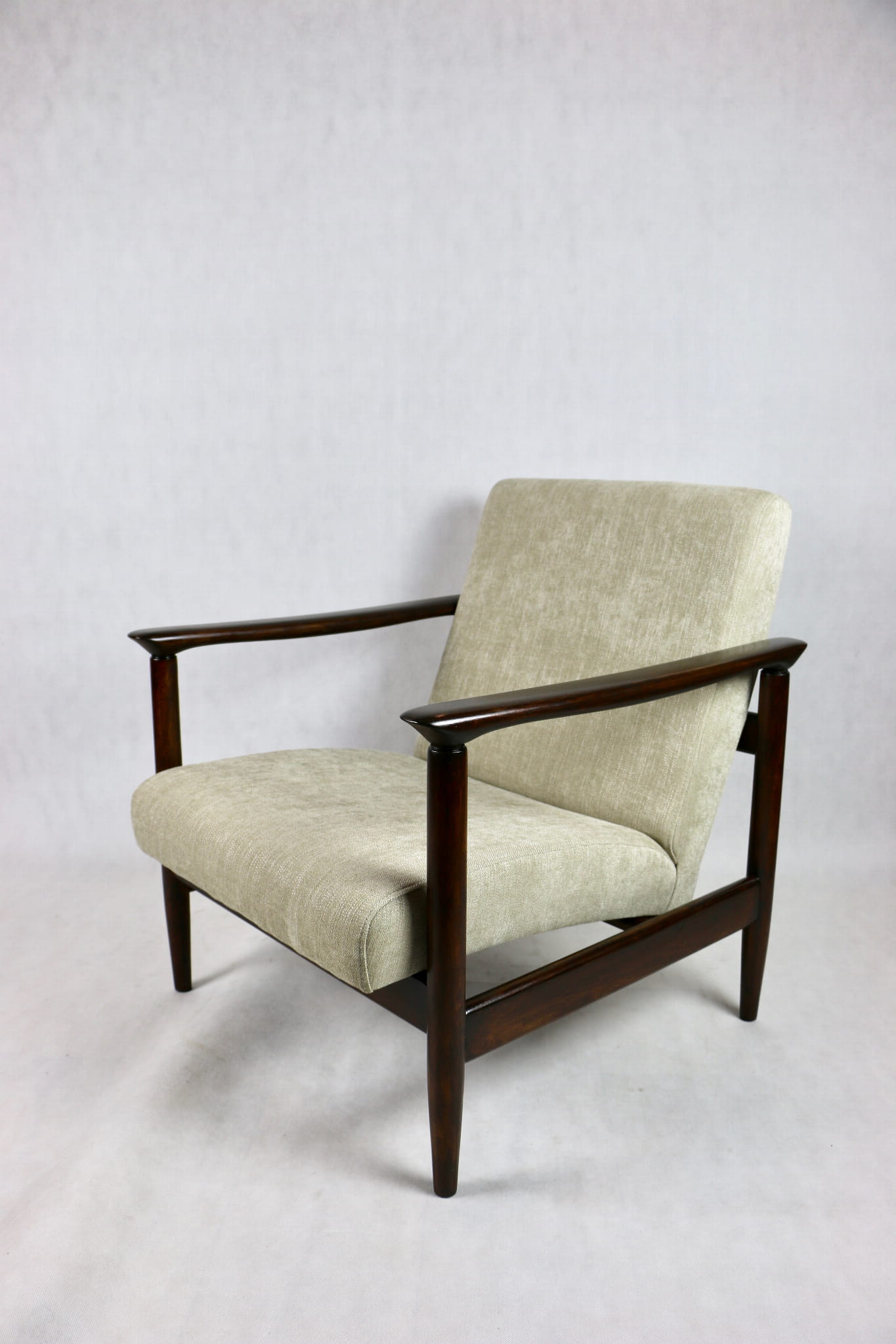 Fotel GFM - 142 zaprojektowany przez Edmunda Homa. Kompletnie odrestaurowany - nowa tapicerka wraz z wypełnieniem została pokryta naturalnym materiałem tapicerskim strukturalnym w kolorze beżowym. Podparcia i nóżki drewniane, naturalne pokryte lakiero-woskiem w kolorze ciemnego drewna.