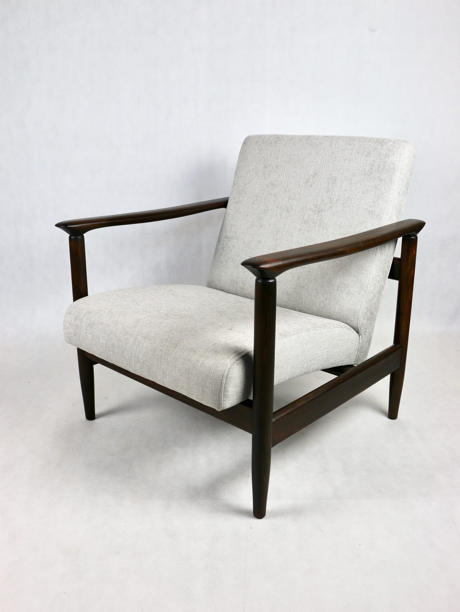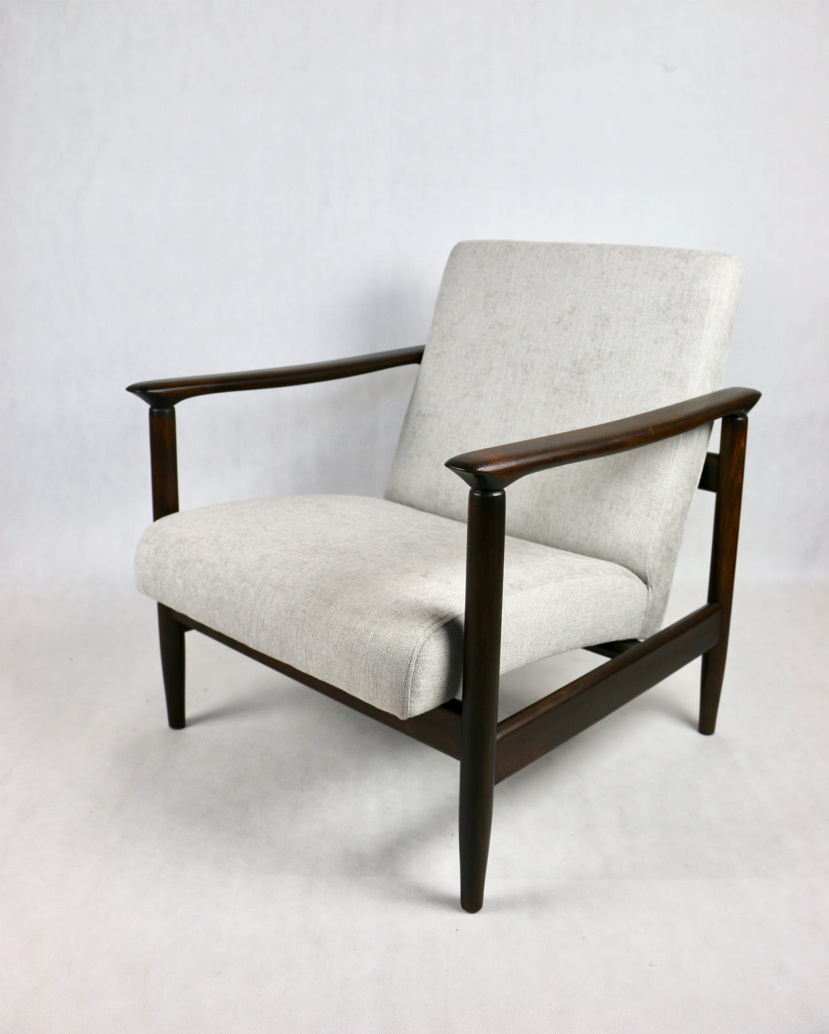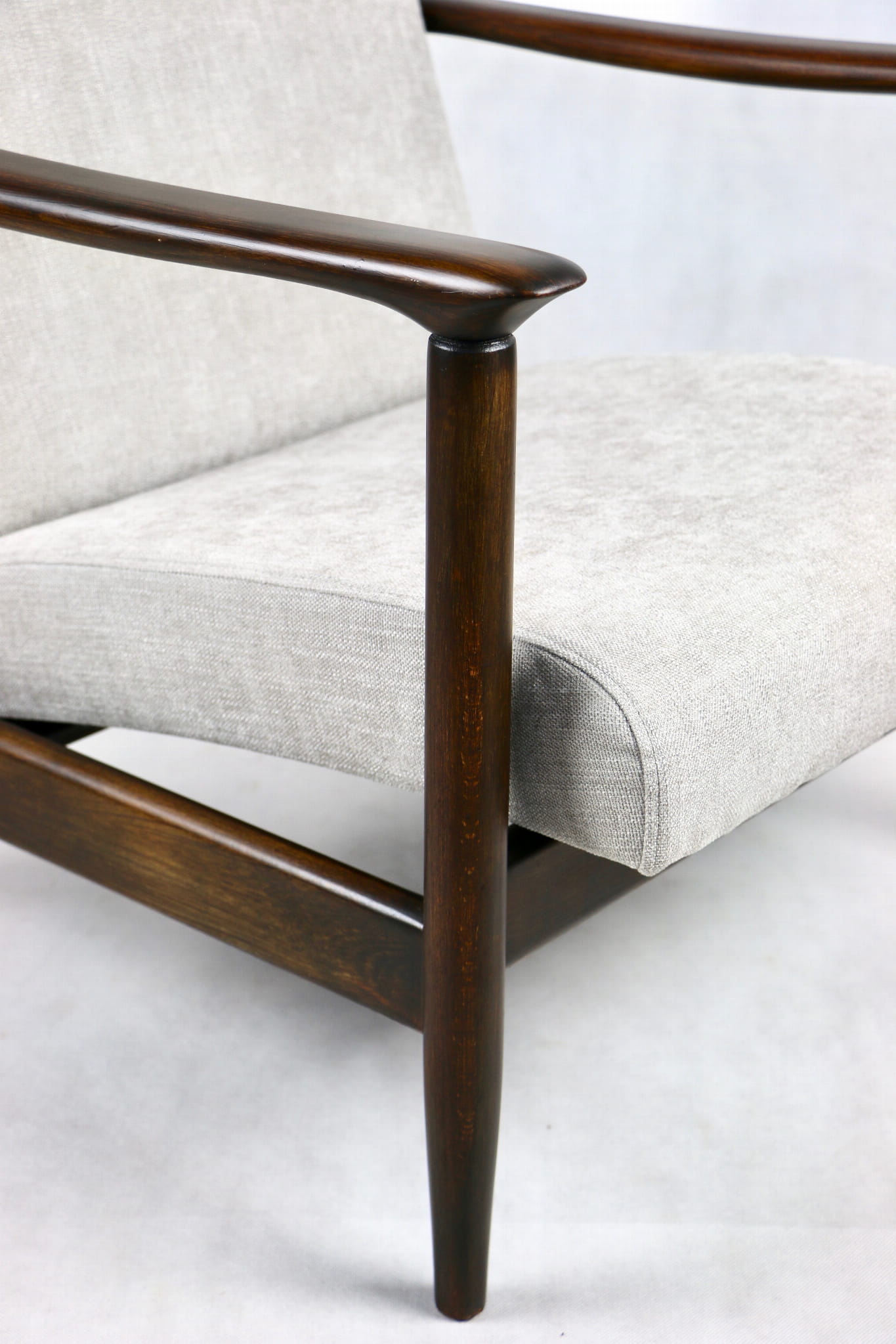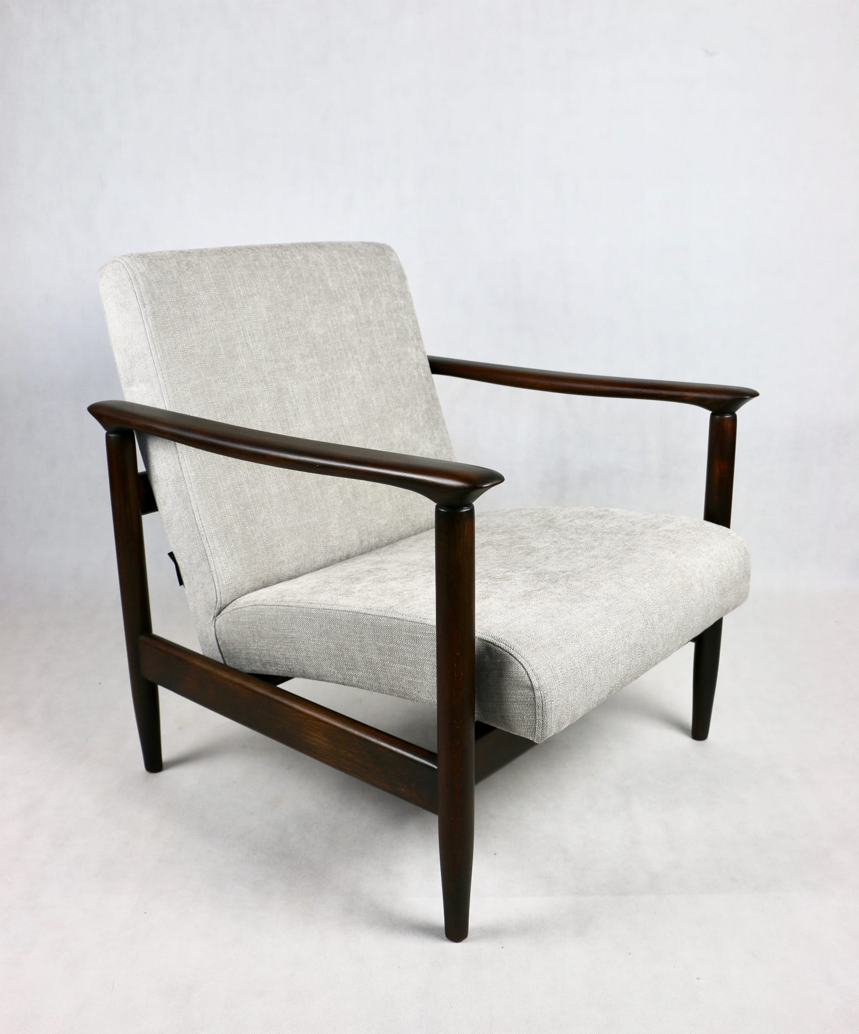 Fotel GFM - 142 zaprojektowany przez Edmunda Homę. Kompletnie odrestaurowany - nowa tapicerka wraz z wypełnieniem została pokryta naturalnym materiałem tapicerskim strukturalnym w kolorze beżowym / jasno szarym. Podparcia i nóżki drewniane, naturalne pokryte woskiem w kolorze ciemnego drewna.