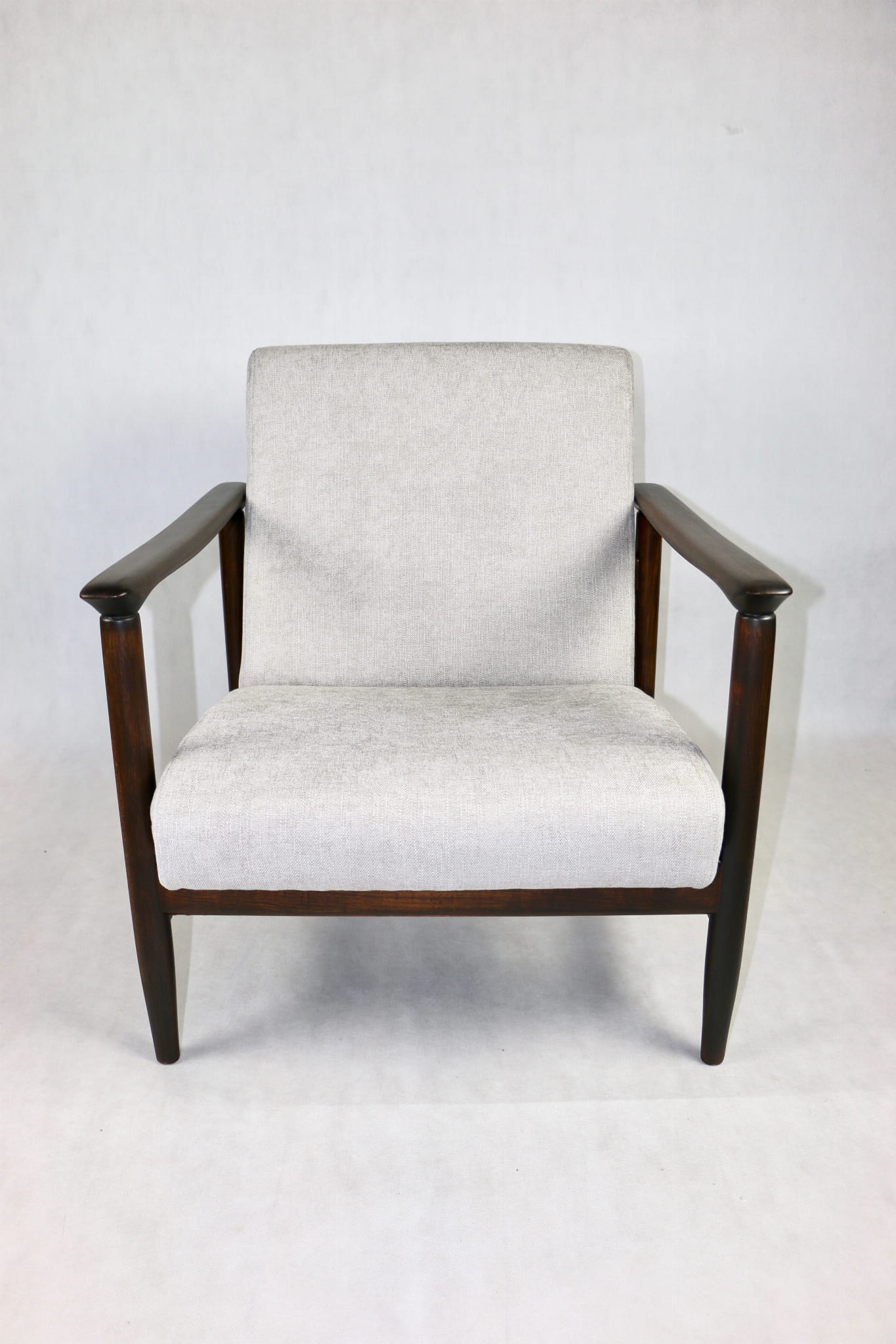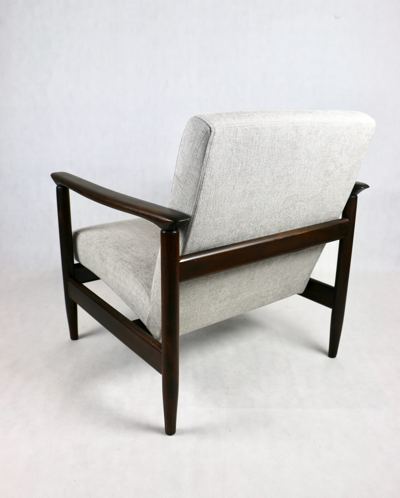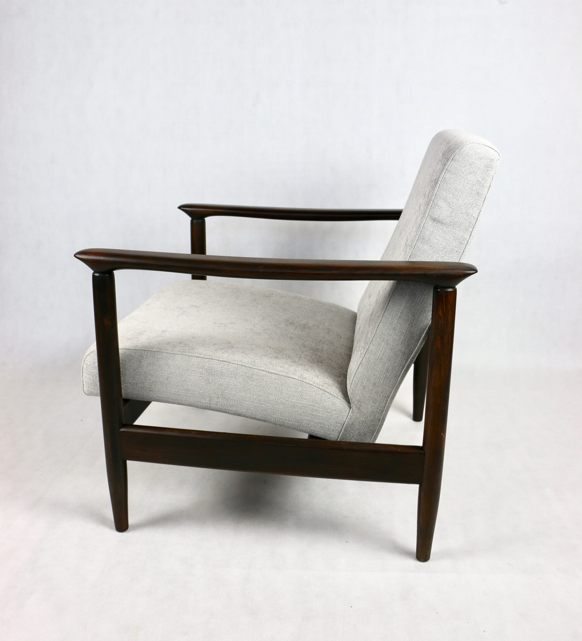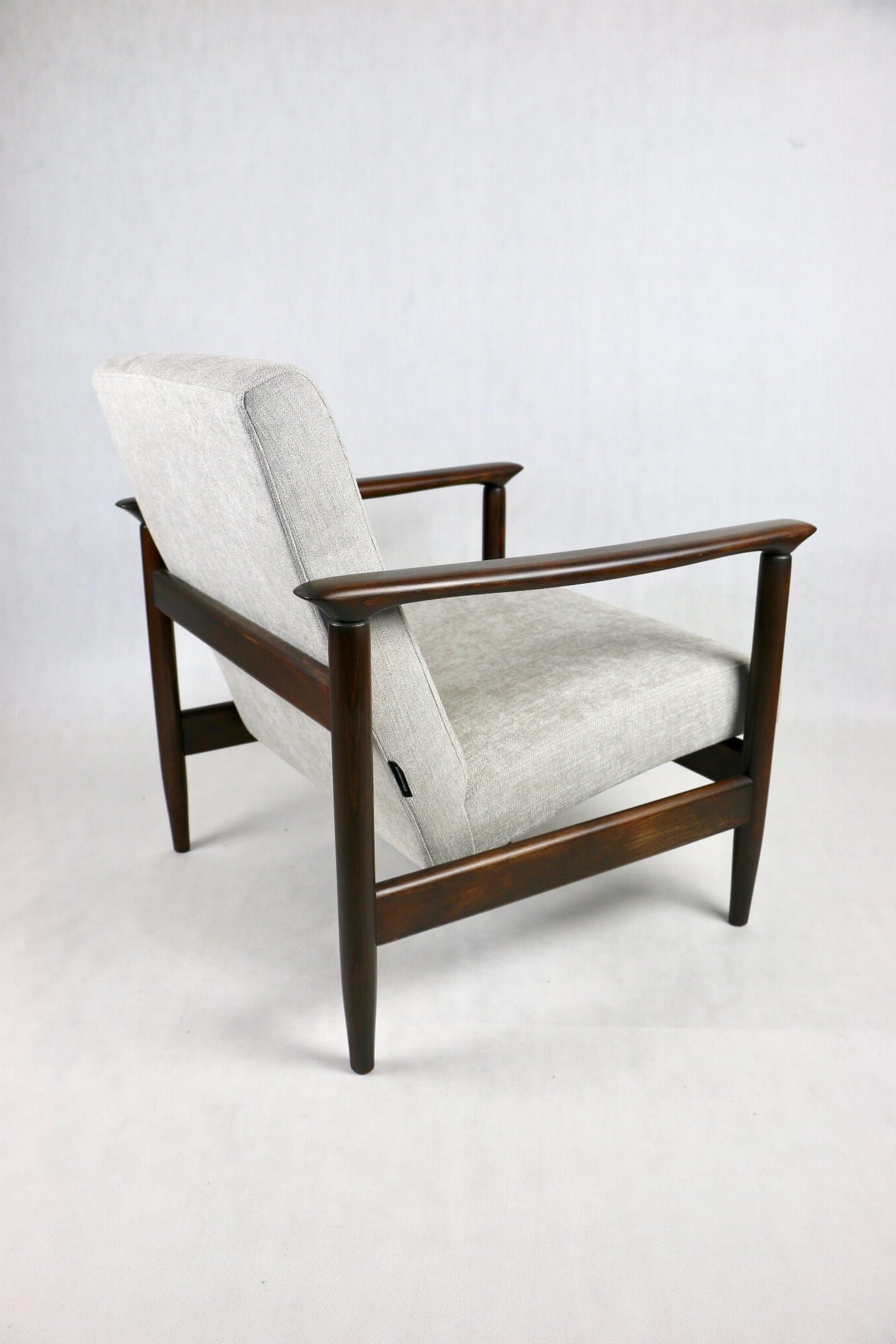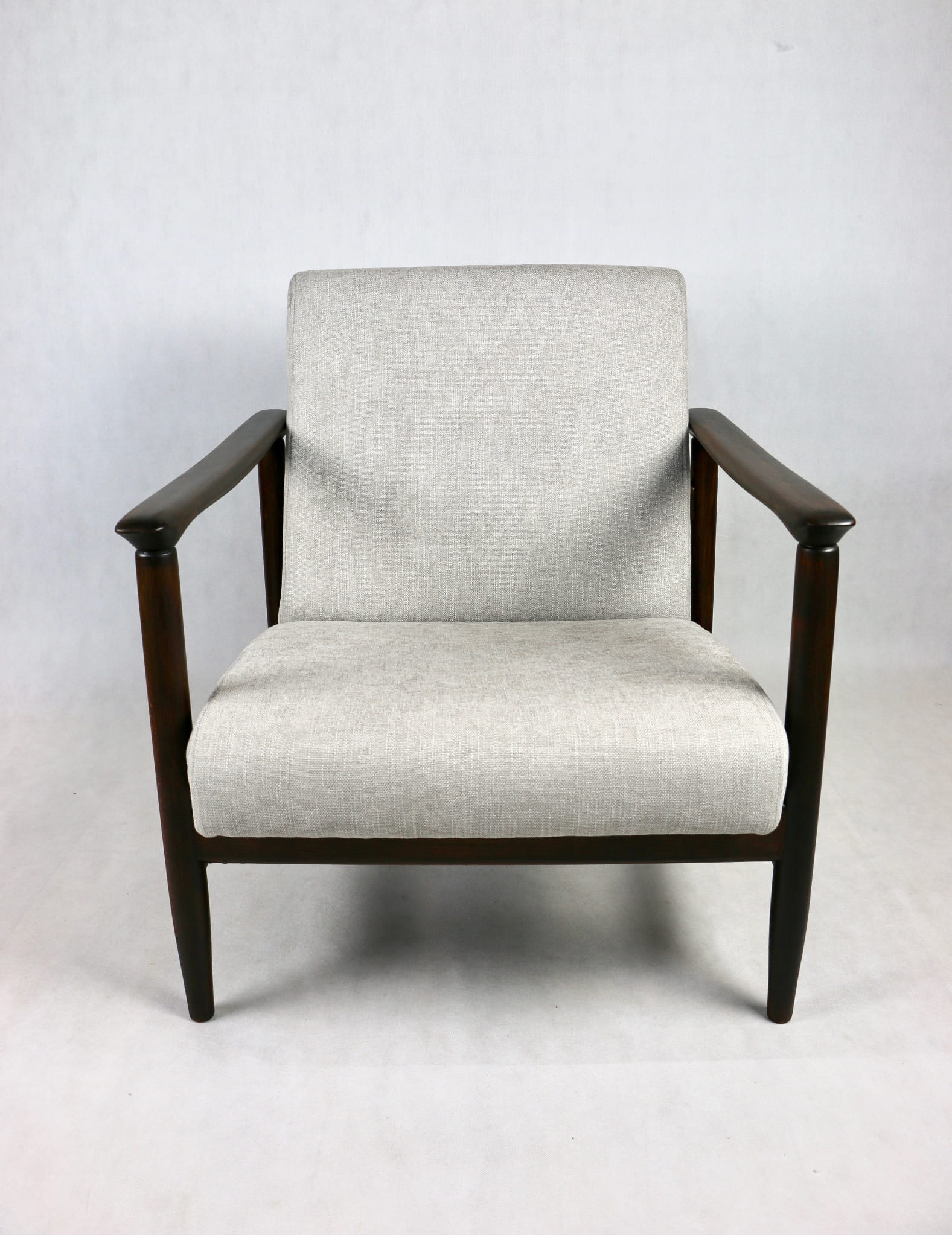 Fotel GFM - 142 zaprojektowany przez Edmunda Homę. Kompletnie odrestaurowany - nowa tapicerka wraz z wypełnieniem została pokryta naturalnym materiałem tapicerskim strukturalnym w kolorze beżowym / jasno szarym. Podparcia i nóżki drewniane, naturalne pokryte woskiem w kolorze ciemnego drewna.