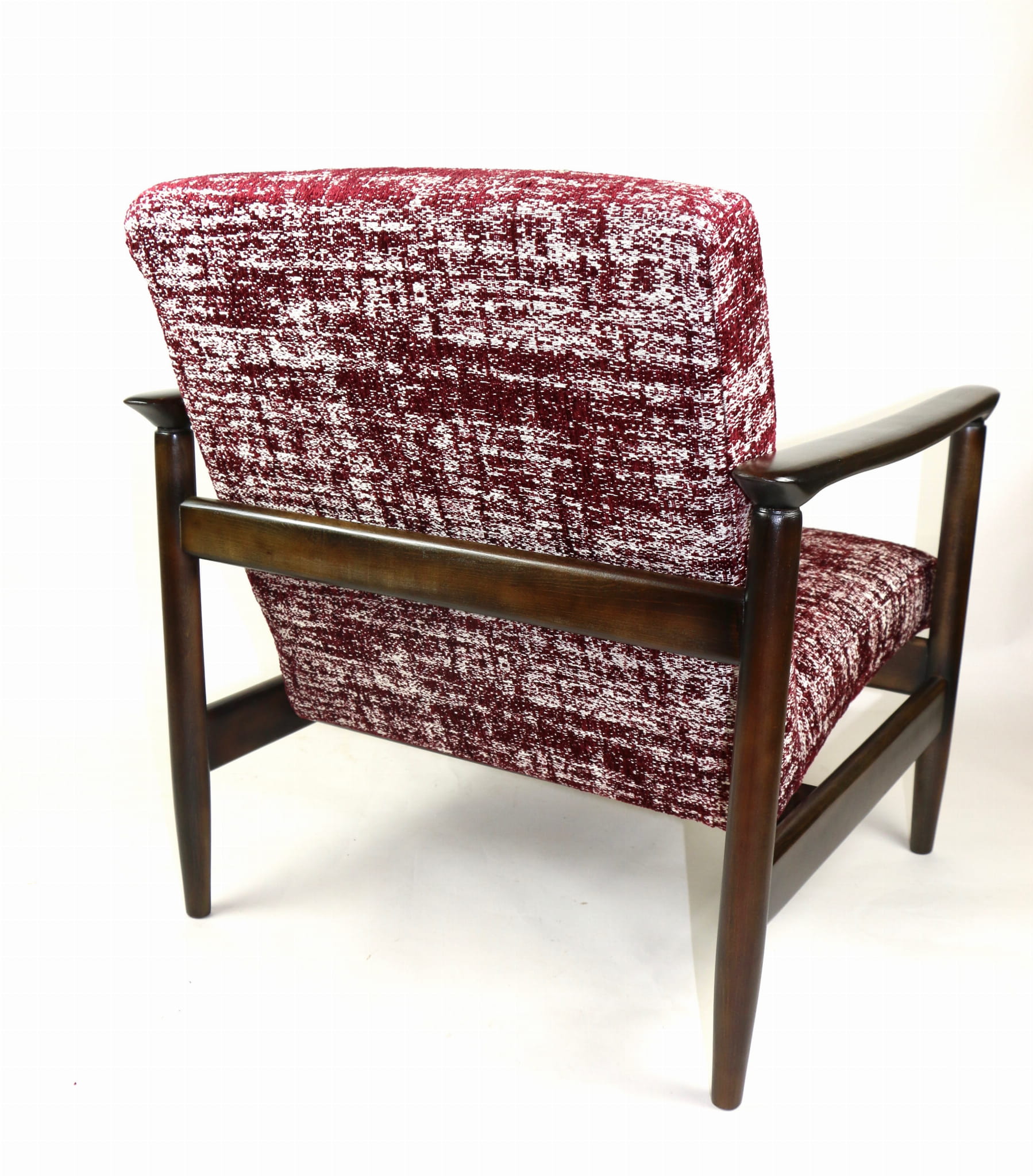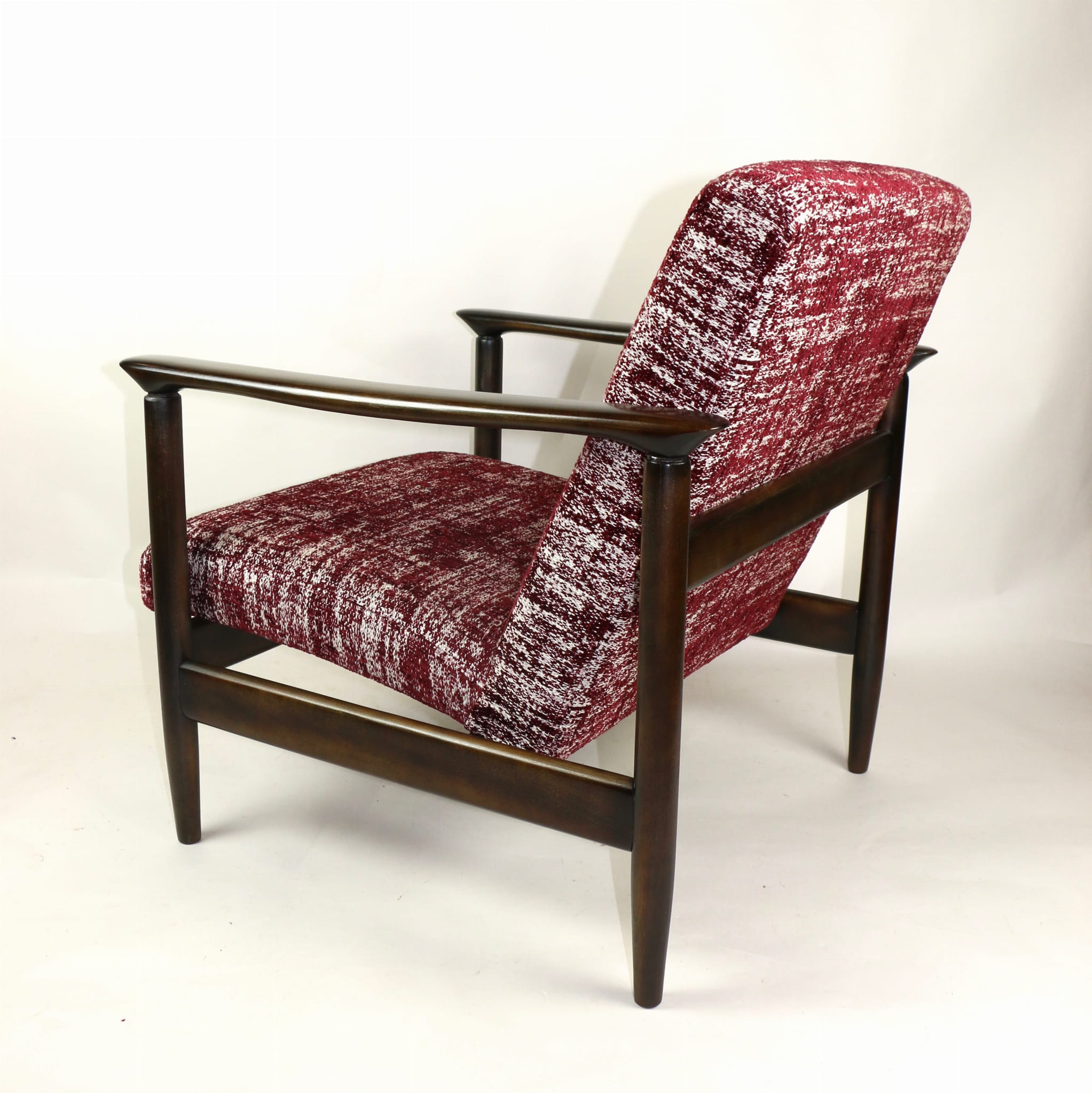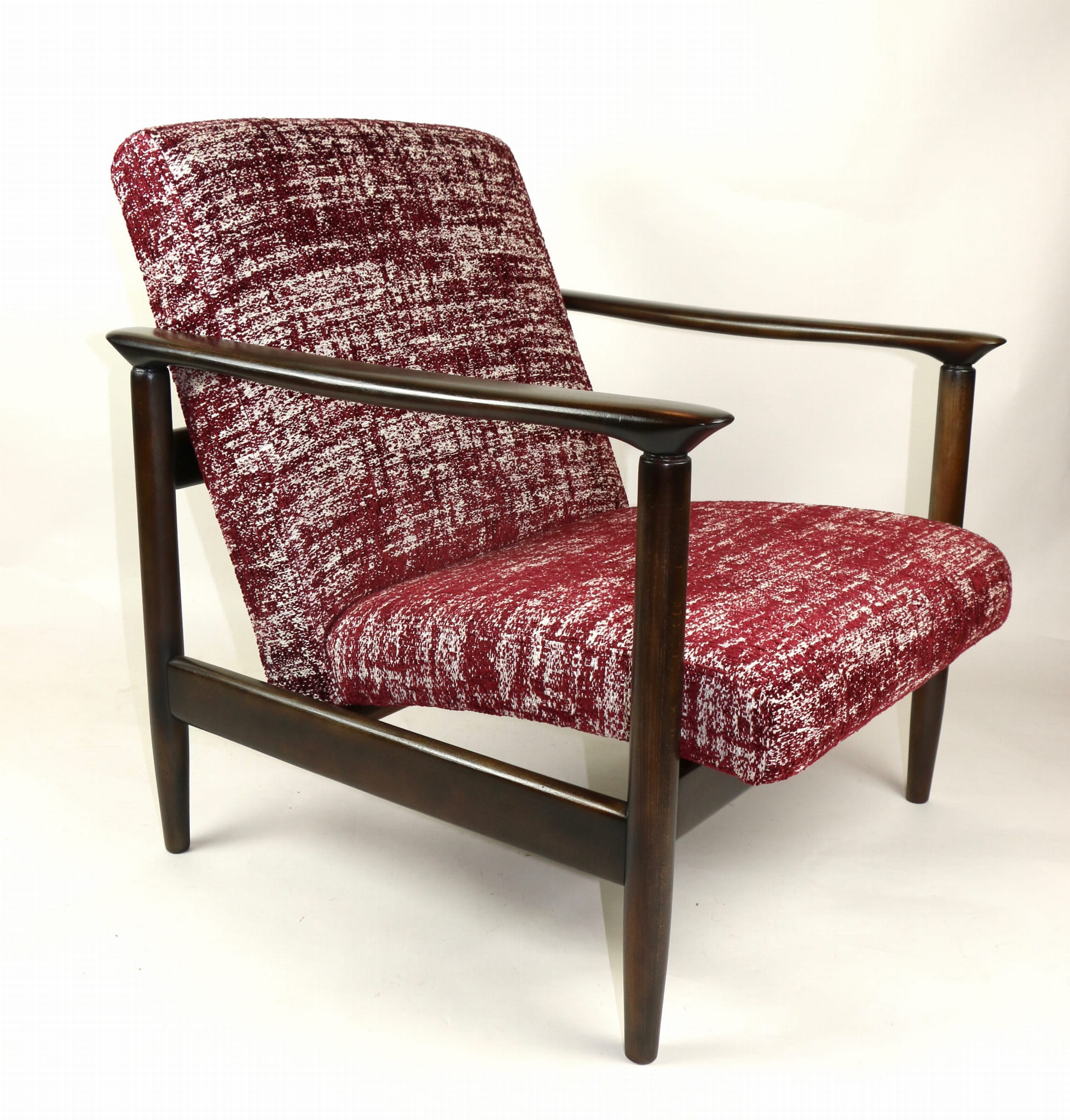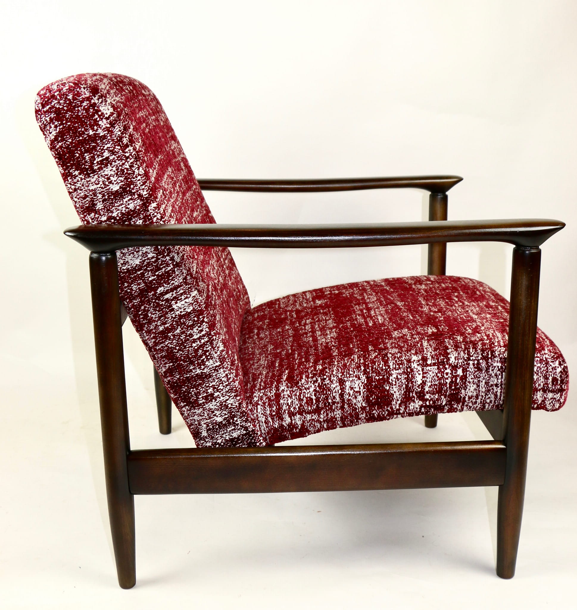 Fotel GFM - 142 zaprojektowany przez Edmunda Homę. Kompletnie odrestaurowany - nowa tapicerka wraz z wypełnieniem została pokryta naturalnym materiałem tapicerskim strukturalnym w kolorze czerwonym. Podparcia i nóżki drewniane, naturalne pokryte lakierem w kolorze ciemnego drewna.