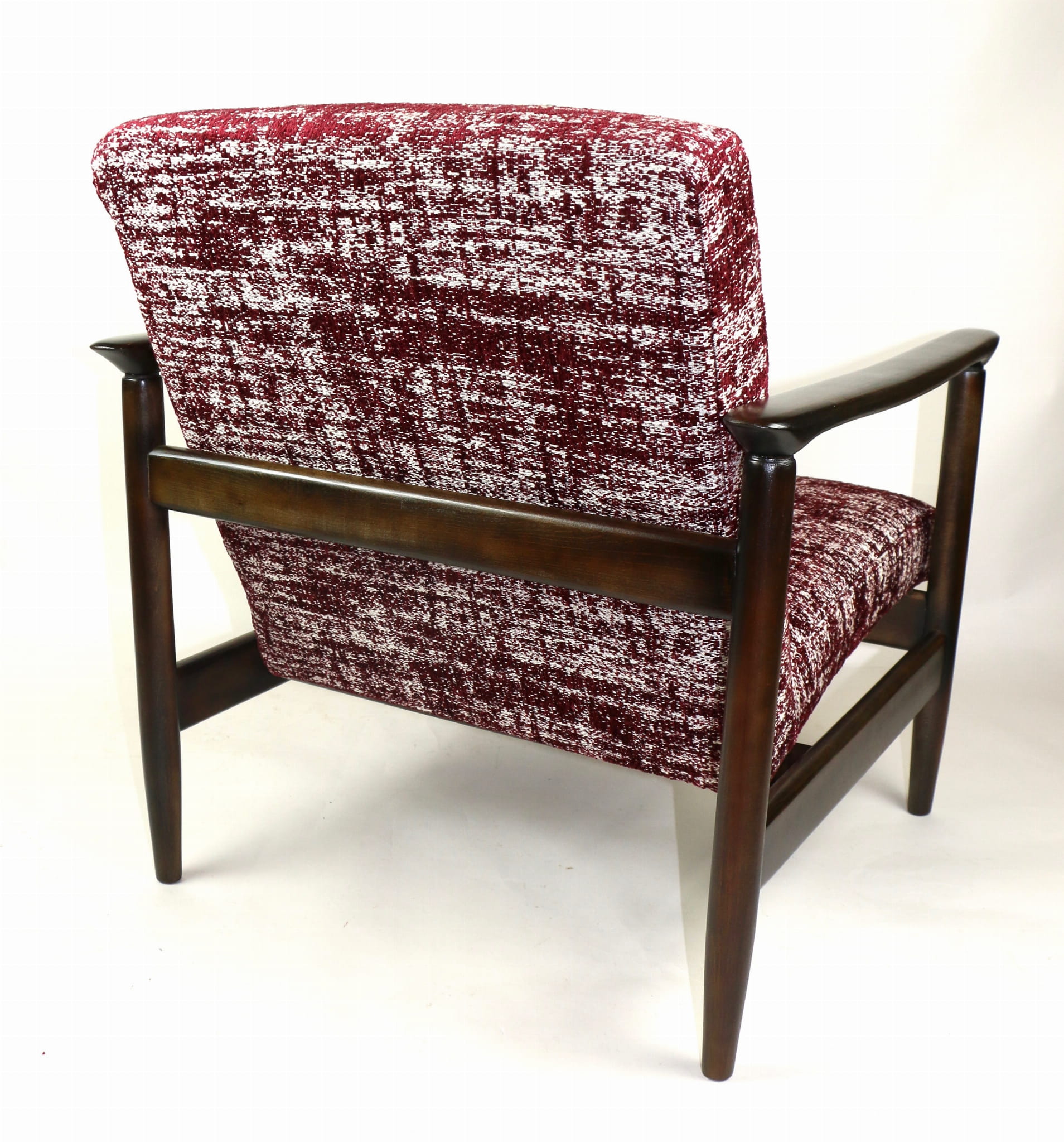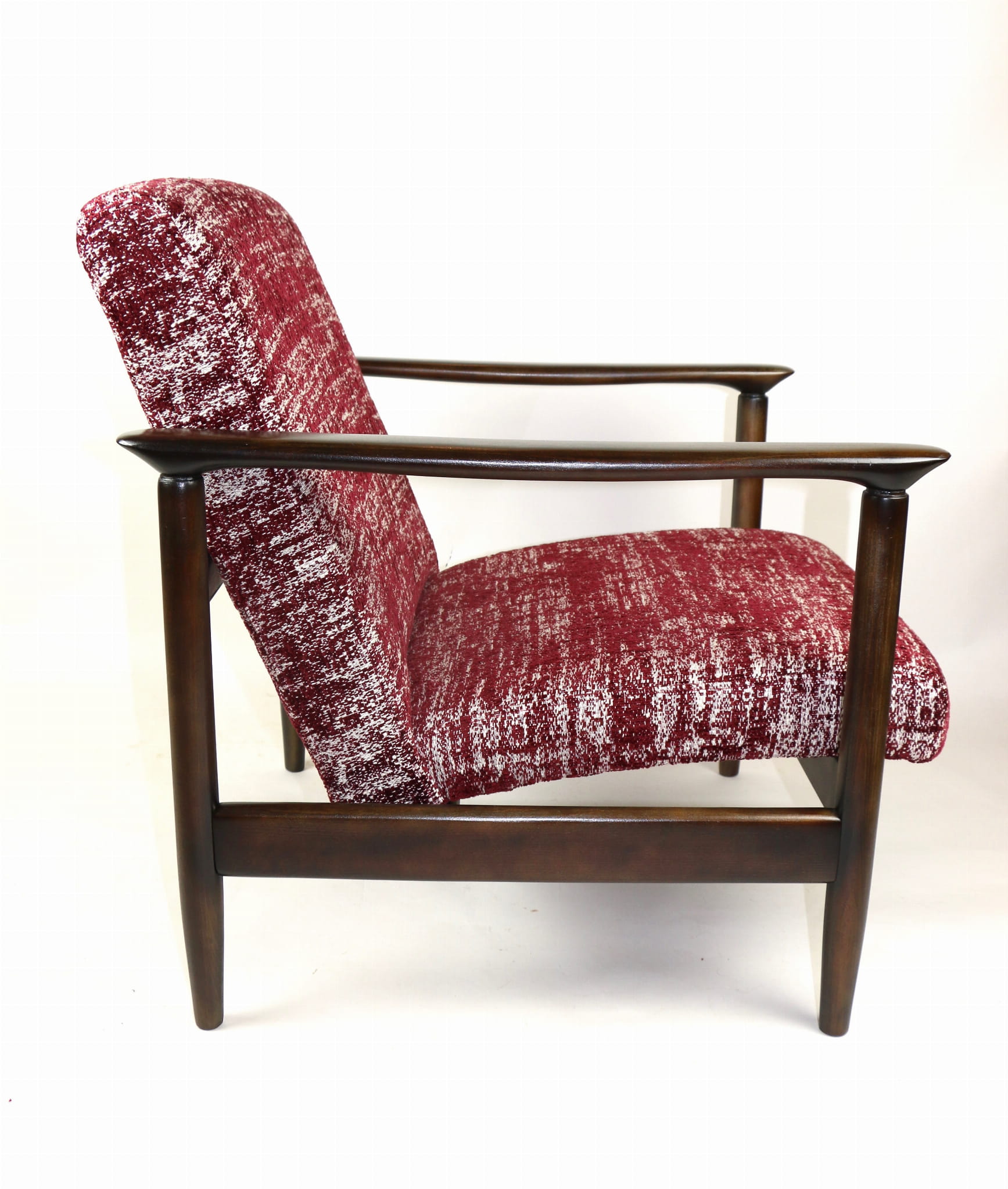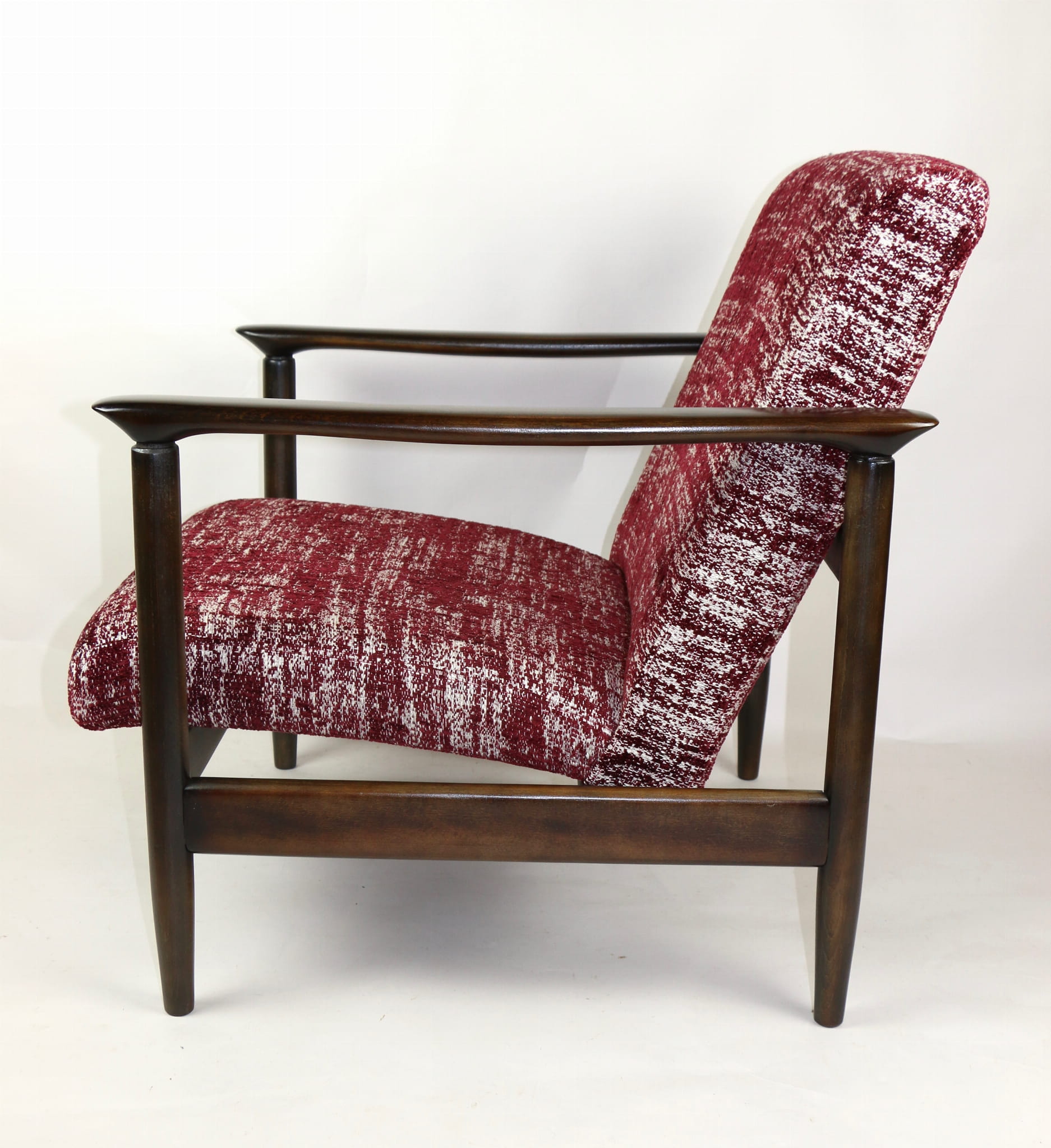 Fotel GFM - 142 zaprojektowany przez Edmunda Homę. Kompletnie odrestaurowany - nowa tapicerka wraz z wypełnieniem została pokryta naturalnym materiałem tapicerskim strukturalnym w kolorze czerwonym. Podparcia i nóżki drewniane, naturalne pokryte lakierem w kolorze ciemnego drewna.