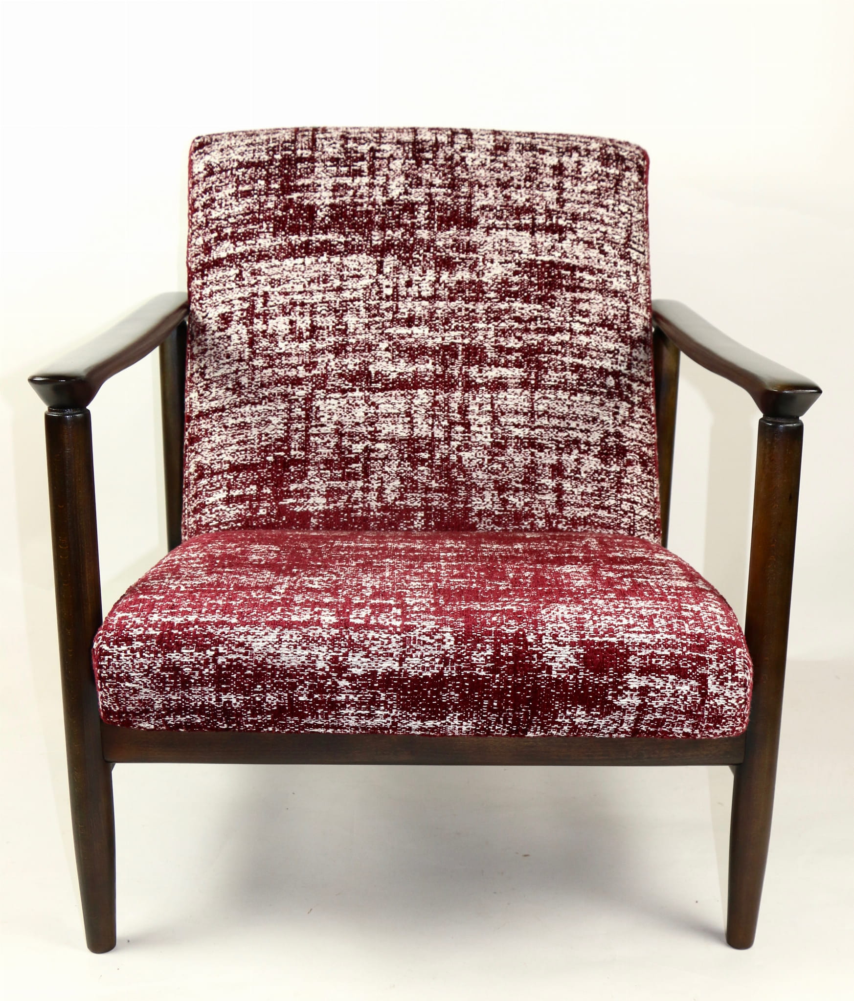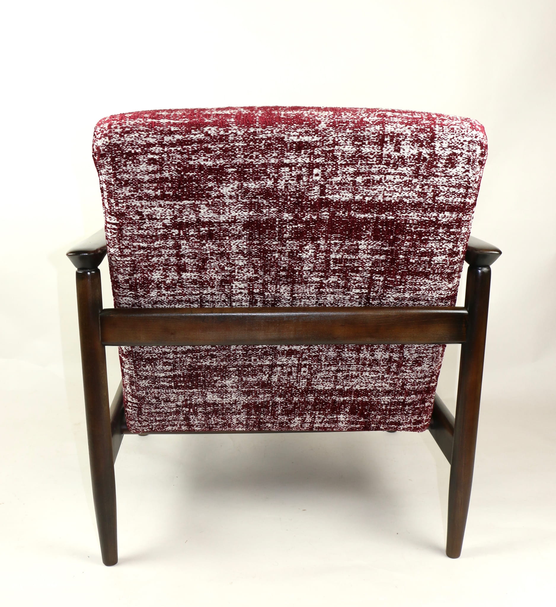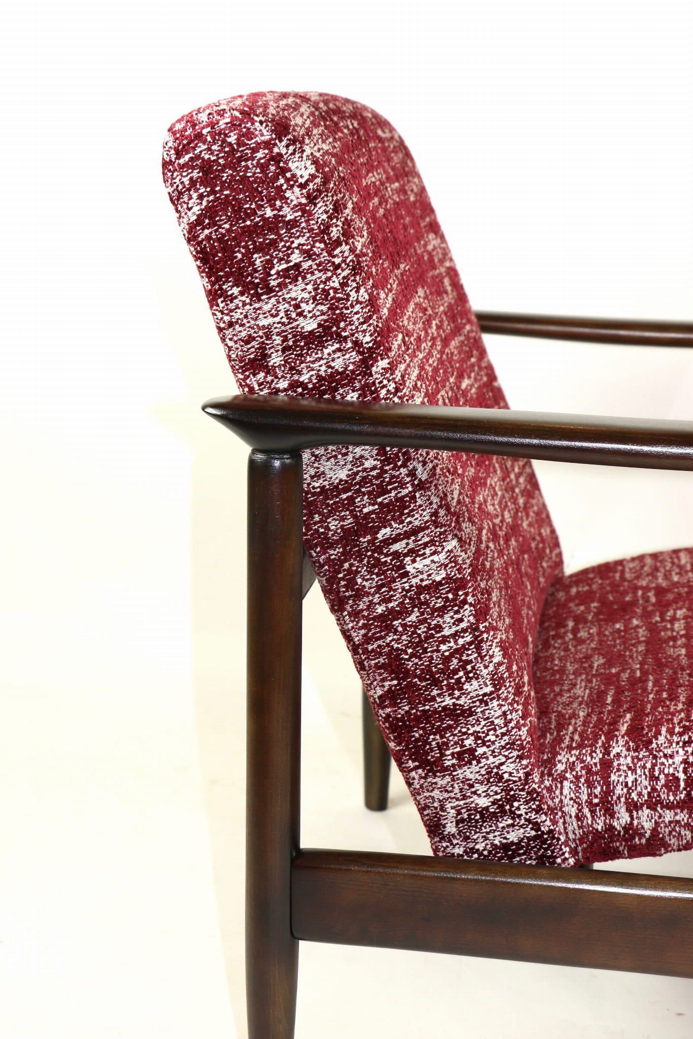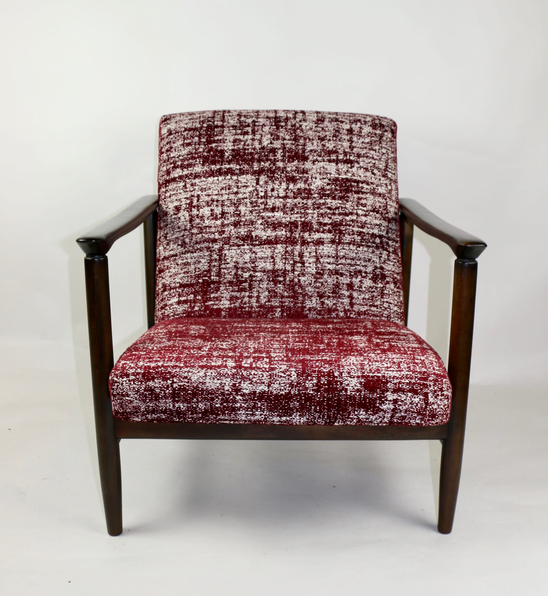 Fotel GFM - 142 zaprojektowany przez Edmunda Homę. Kompletnie odrestaurowany - nowa tapicerka wraz z wypełnieniem została pokryta naturalnym materiałem tapicerskim strukturalnym w kolorze czerwonym. Podparcia i nóżki drewniane, naturalne pokryte lakierem w kolorze ciemnego drewna.