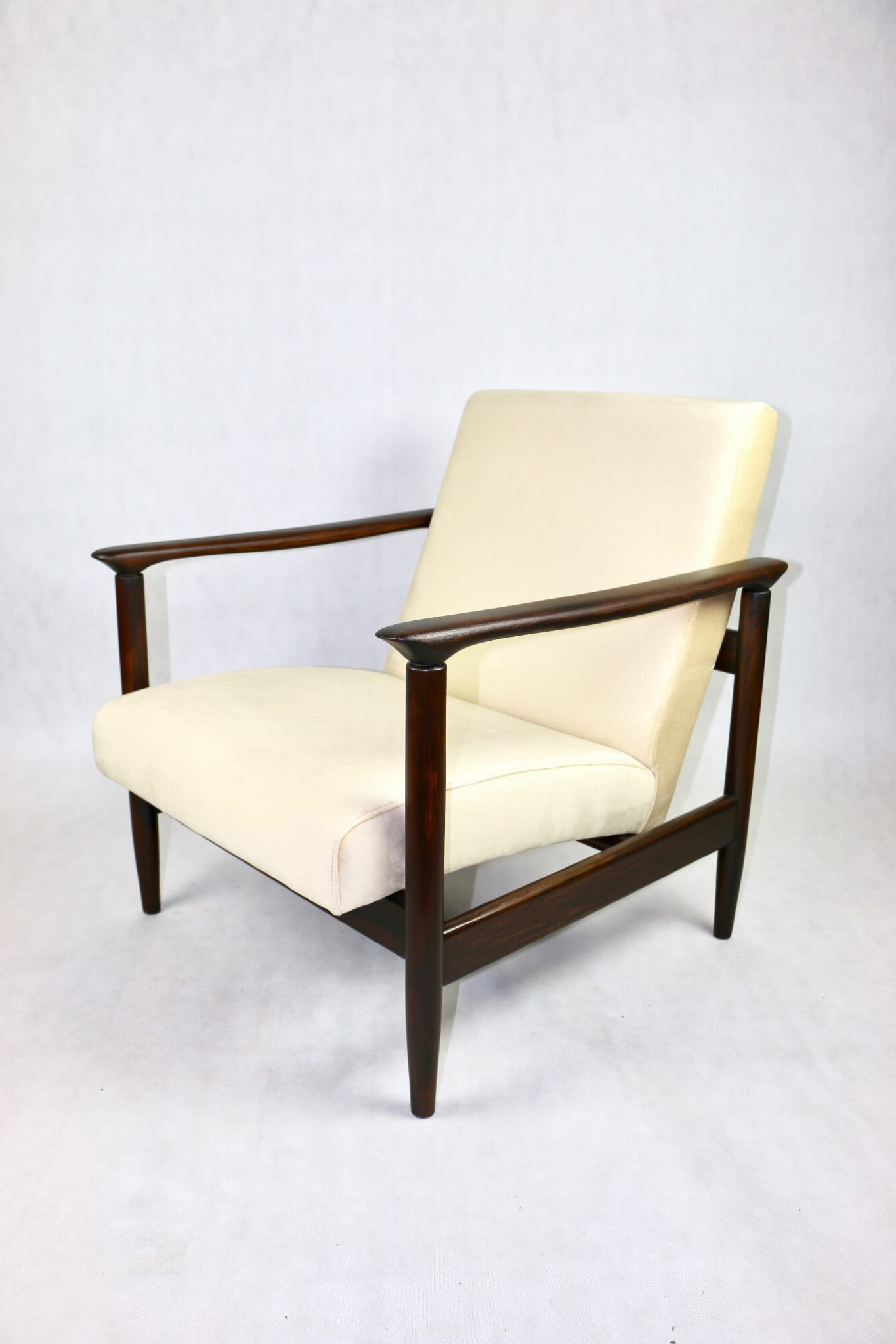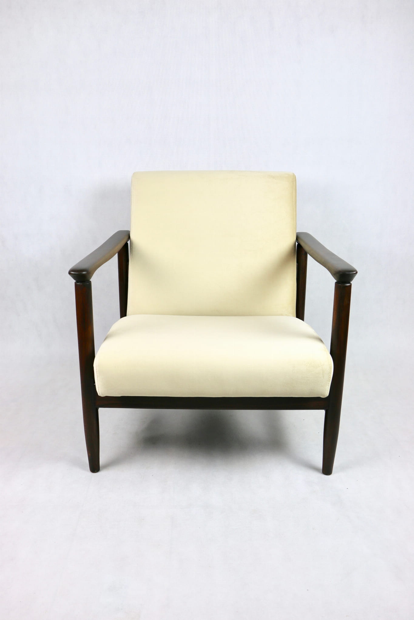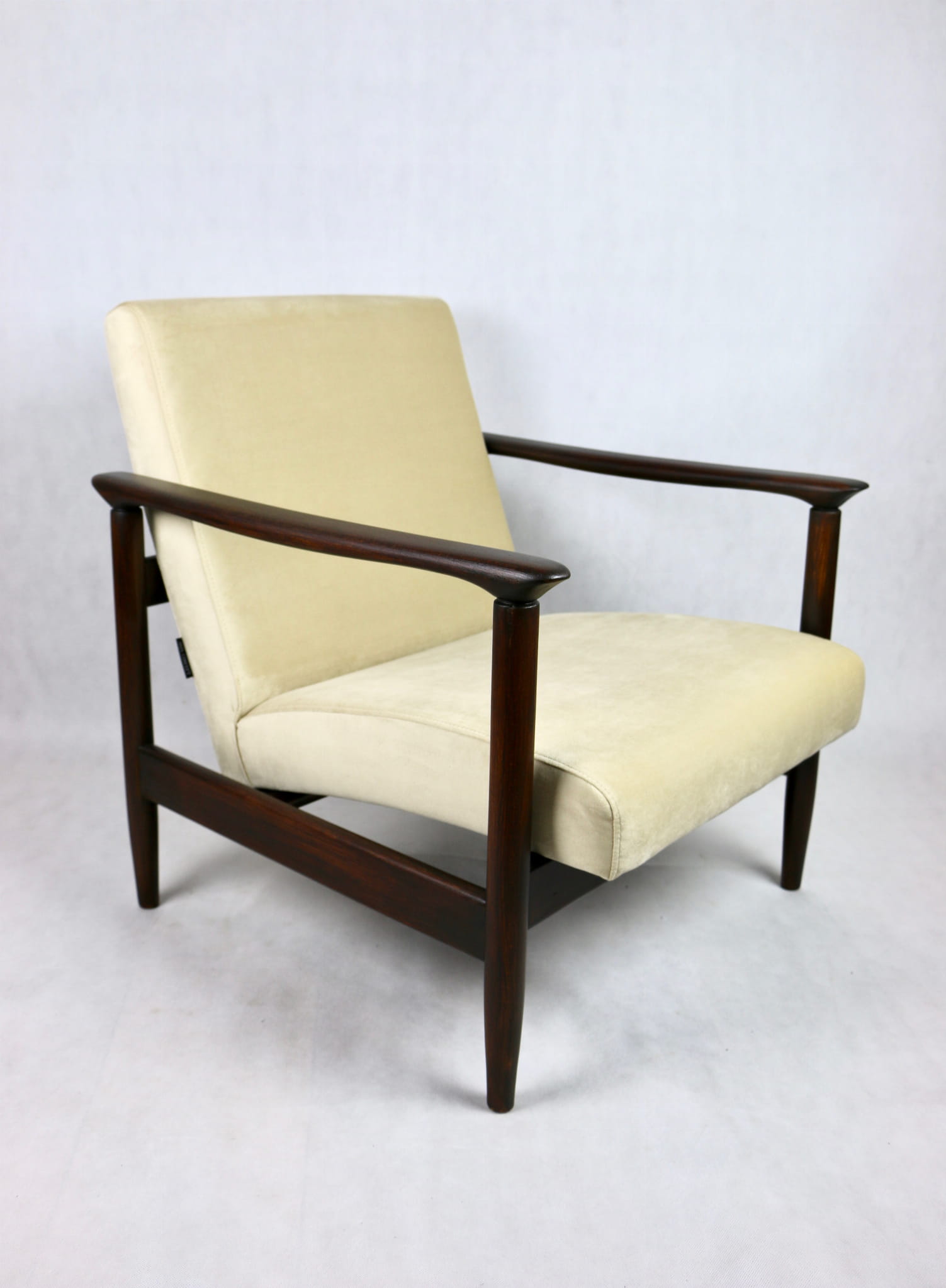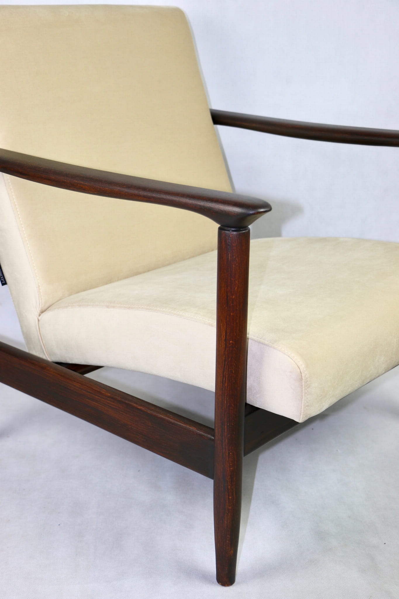Fotel GFM - 142 zaprojektowany przez Edmunda Homę. Kompletnie odrestaurowany - nowa tapicerka wraz z wypełnieniem została pokryta materiałem tapicerskim welwetem w kolorze beżowym z serii Paris. Podparcia i nóżki drewniane, pokryte lakierem w kolorze ciemnego drewna.
