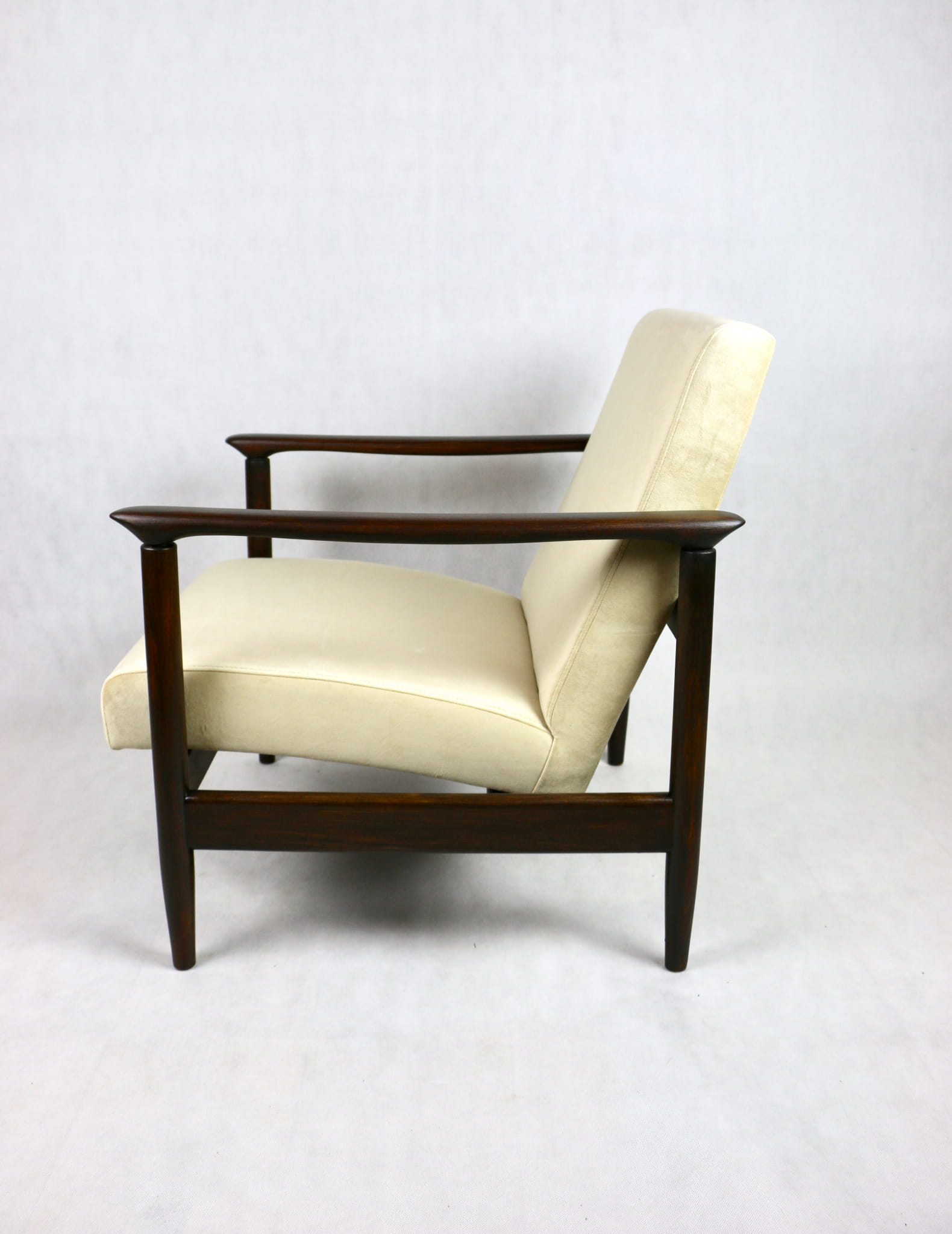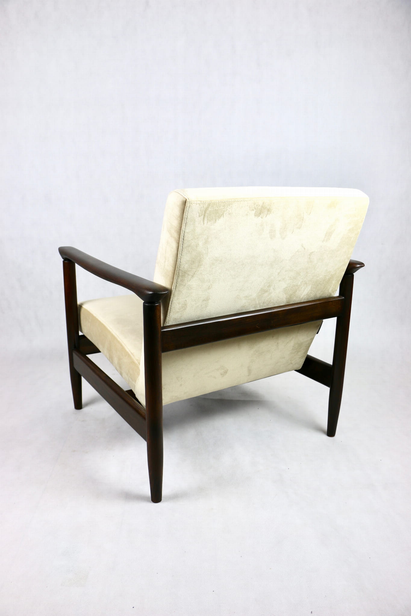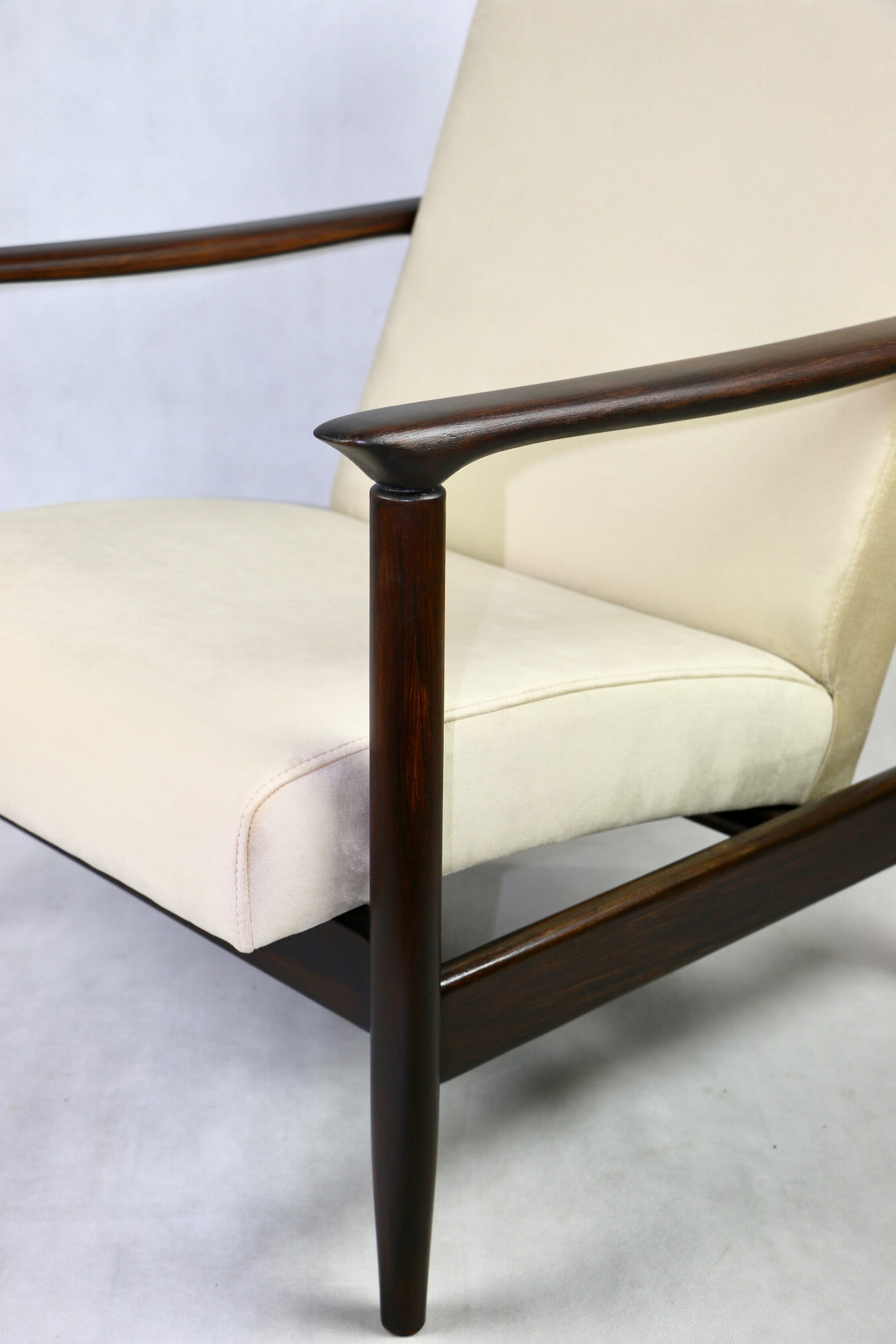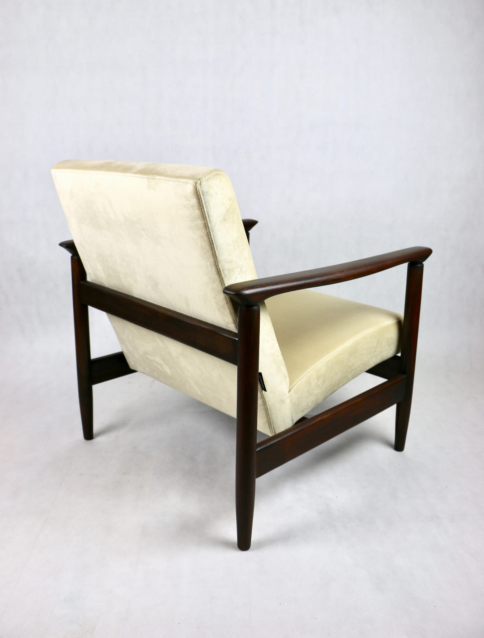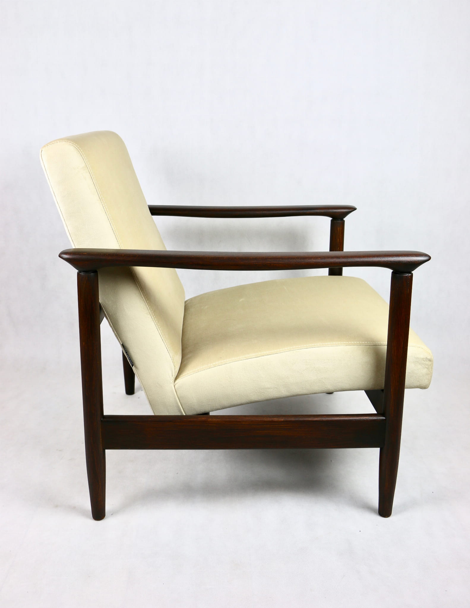 Fotel GFM - 142 zaprojektowany przez Edmunda Homę. Kompletnie odrestaurowany - nowa tapicerka wraz z wypełnieniem została pokryta materiałem tapicerskim welwetem w kolorze beżowym z serii Paris. Podparcia i nóżki drewniane, pokryte lakierem w kolorze ciemnego drewna.
