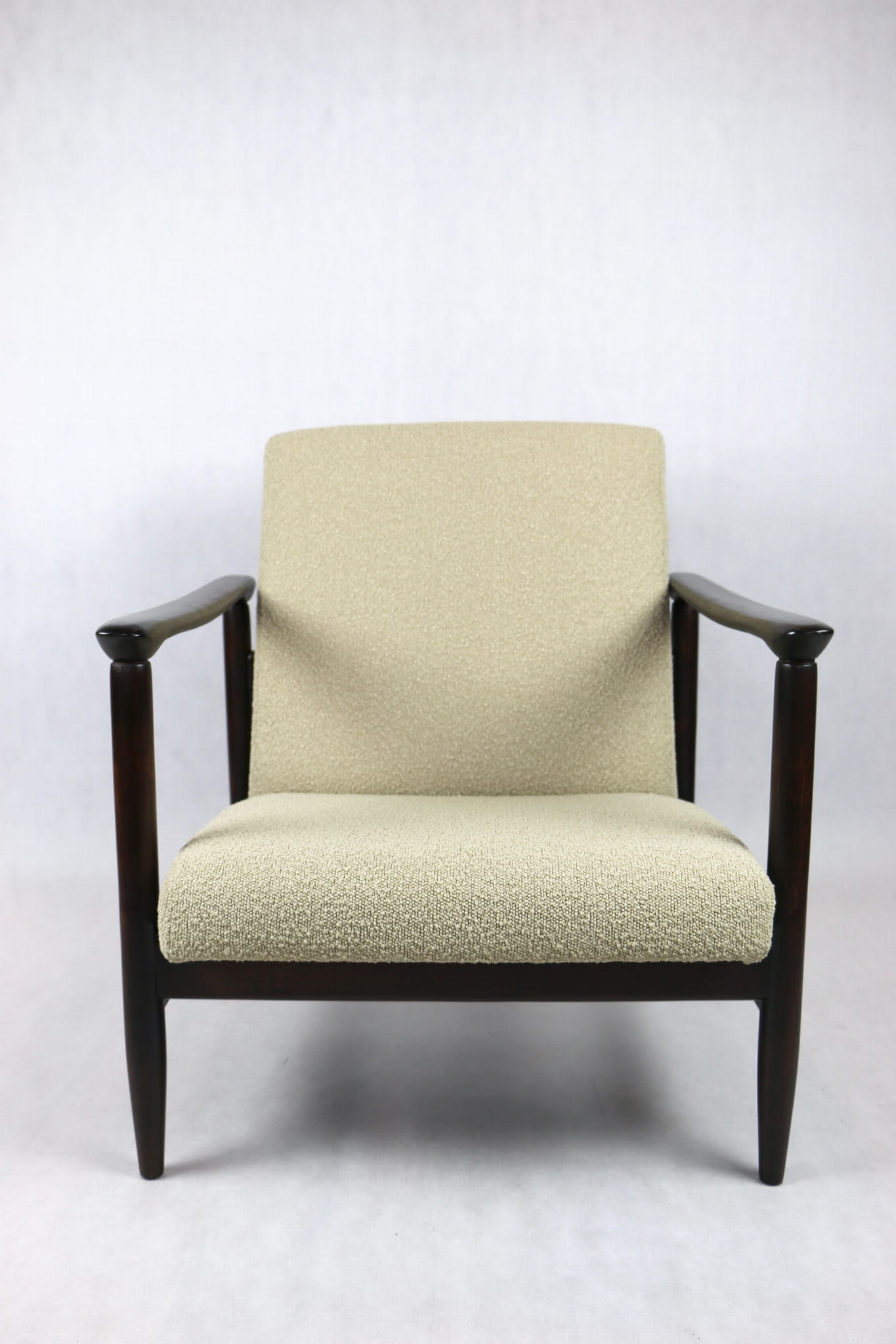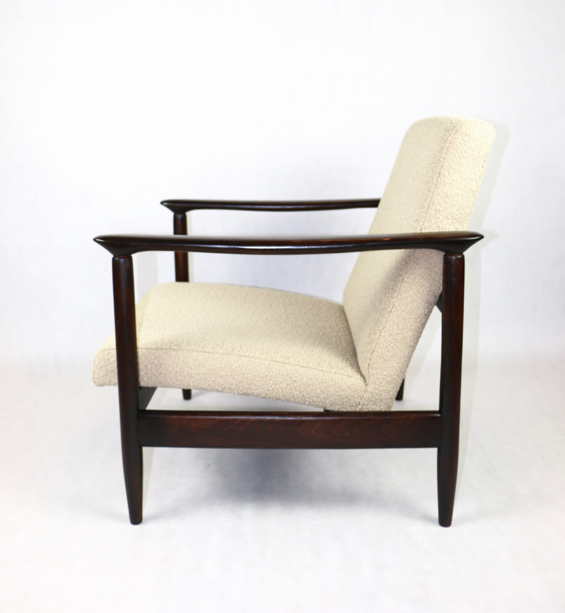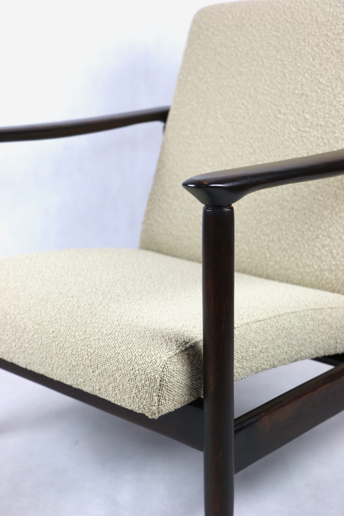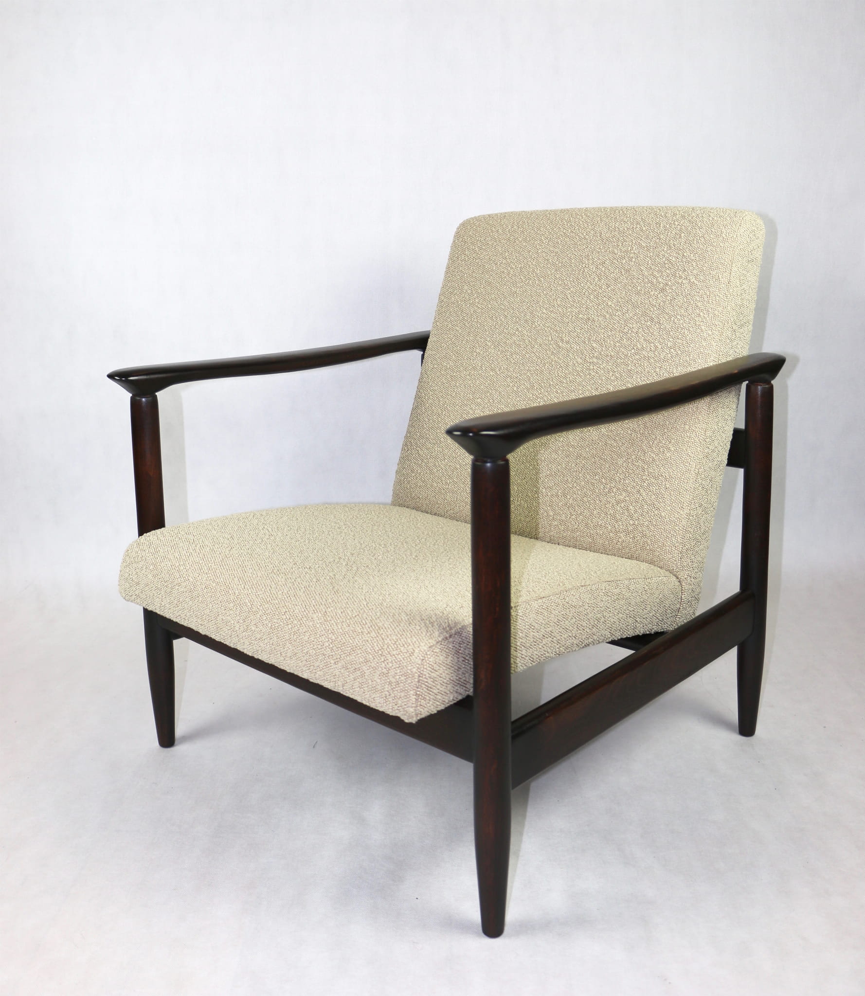 Fotel GFM - 142 zaprojektowany przez Edmunda Homa. Kompletnie odrestaurowany - nowa tapicerka wraz z wypełnieniem została pokryta materiałem tapicerskim strukturalnym w kolorze beżowym z serii boucle. Podparcia i nóżki drewniane, pokryte lakierem w kolorze ciemnego drewna.