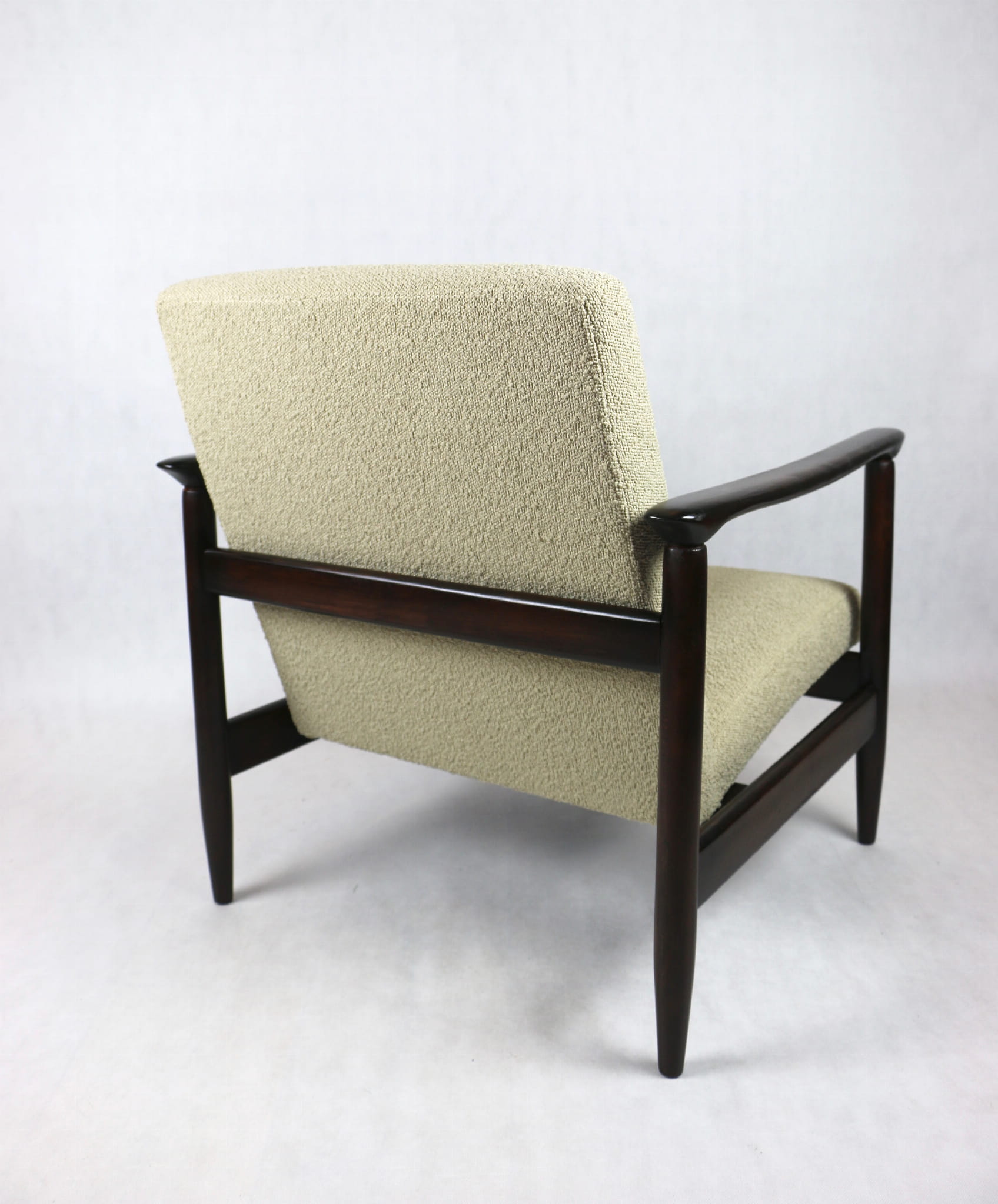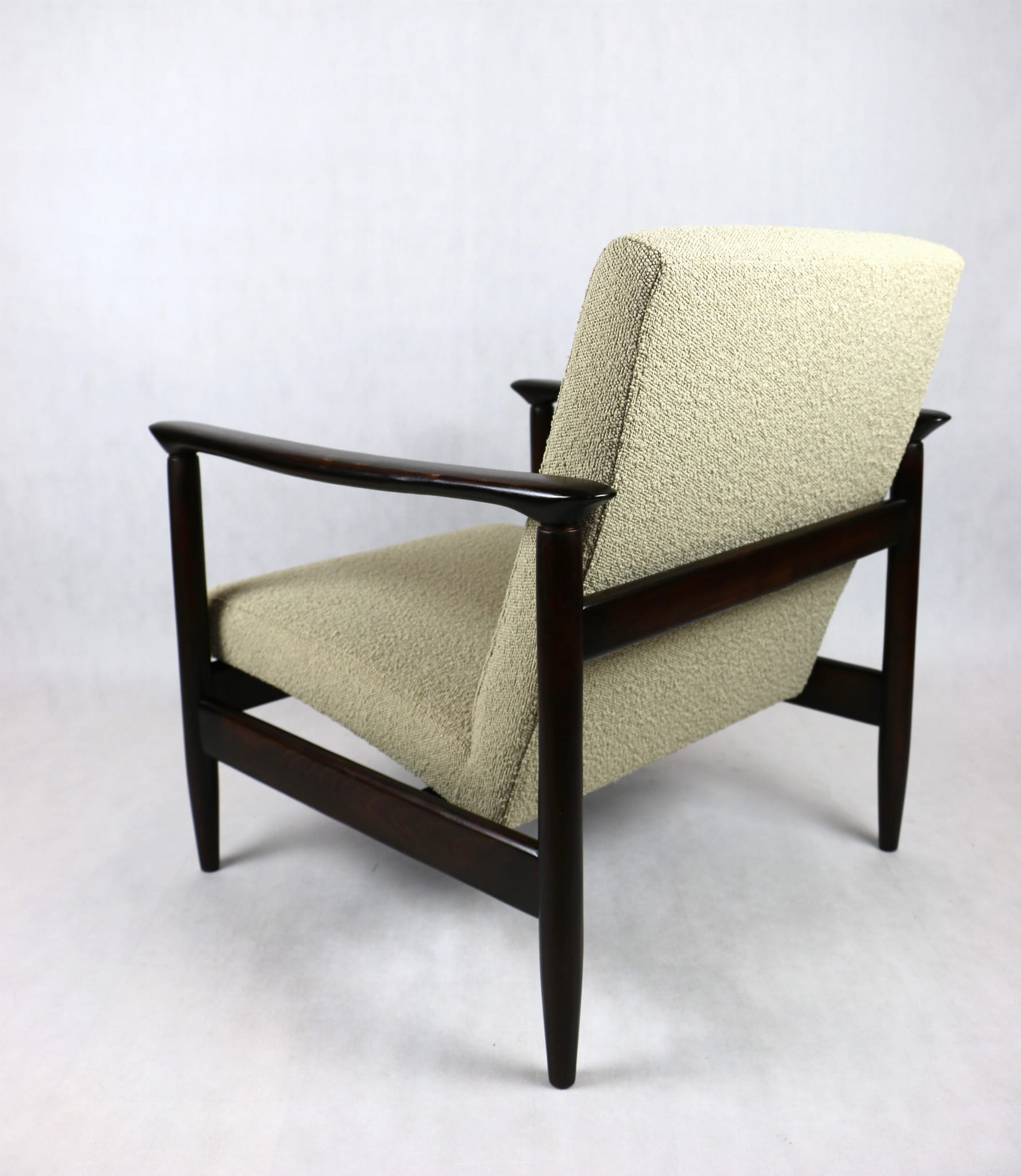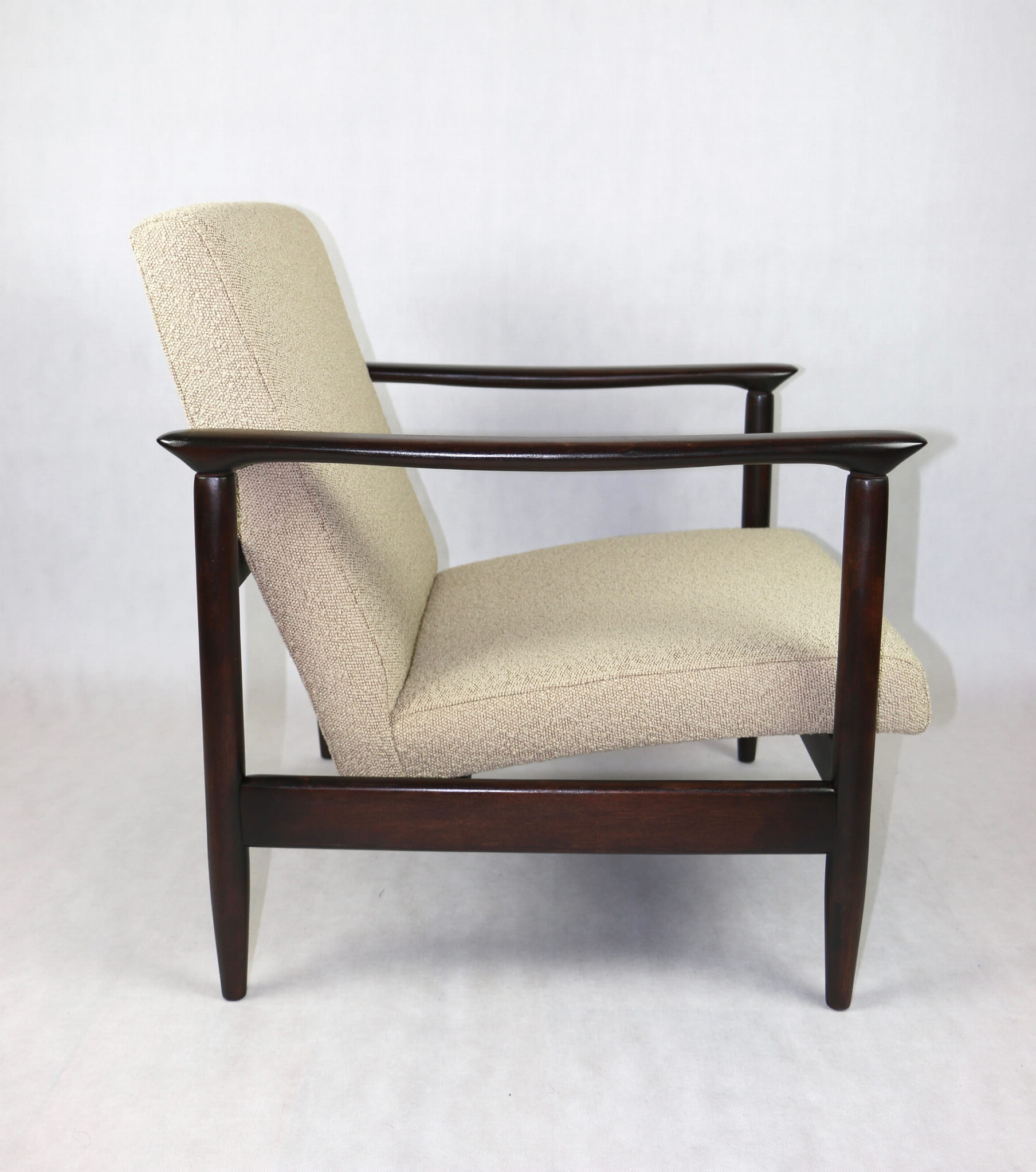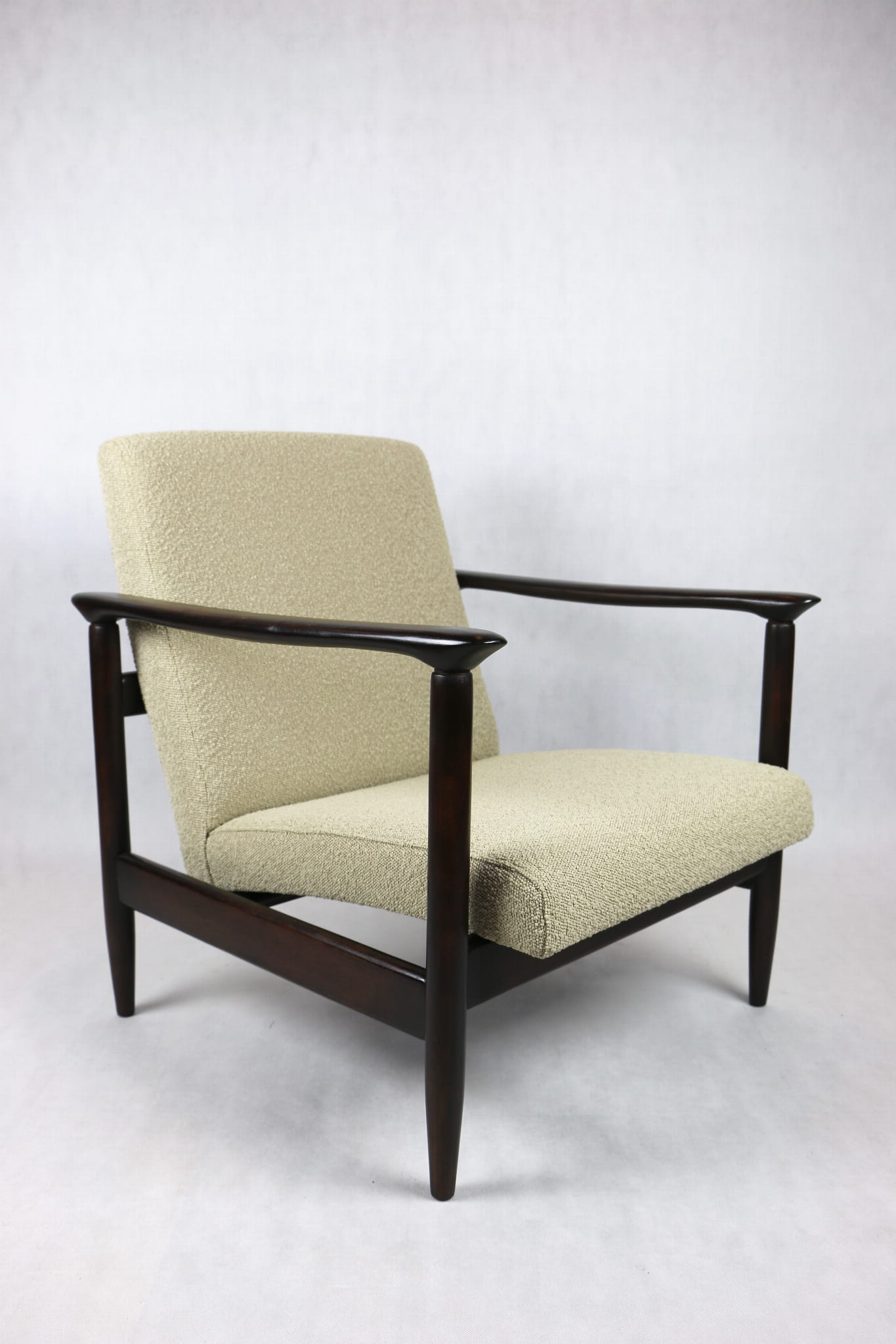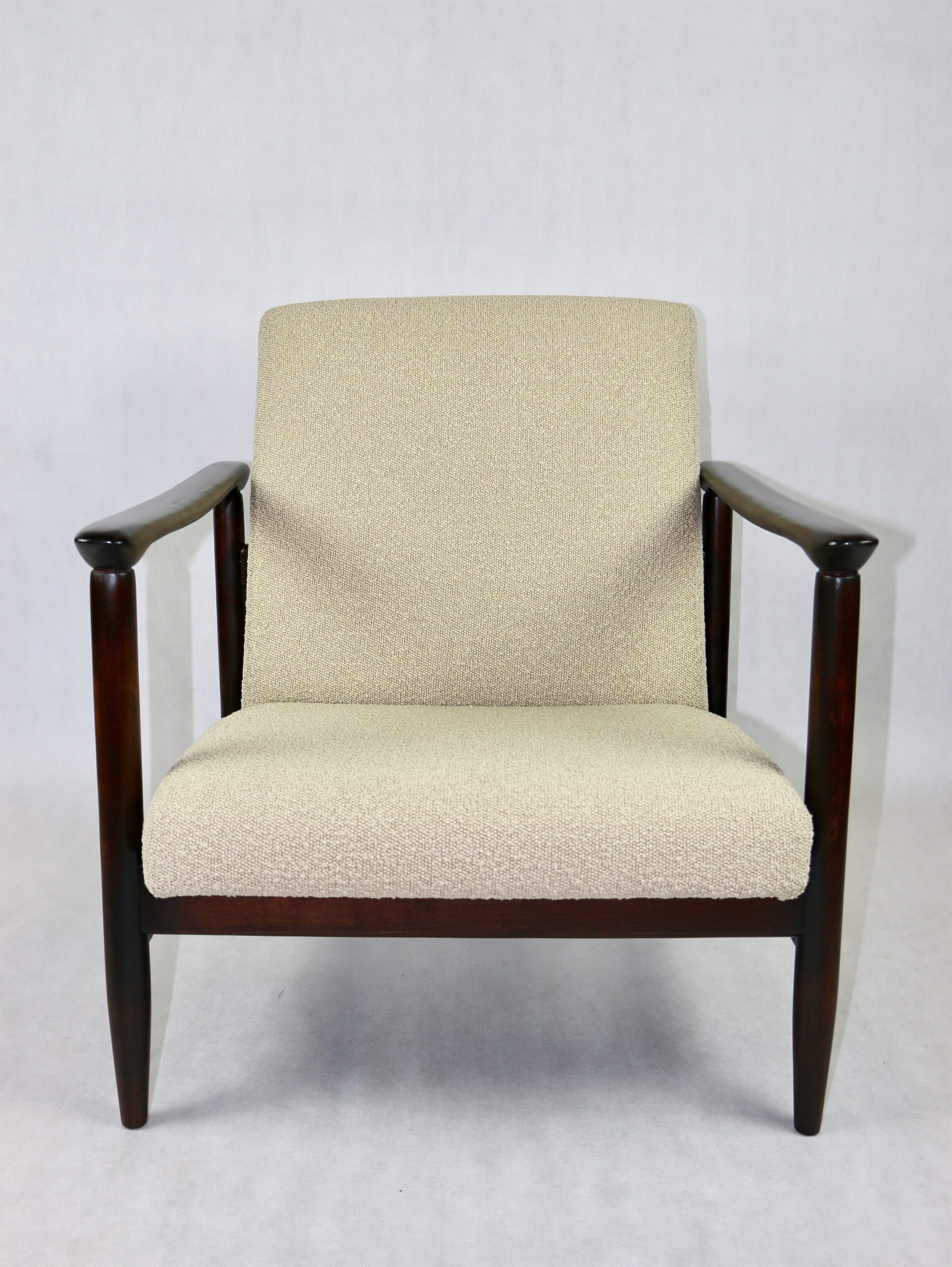 Fotel GFM - 142 zaprojektowany przez Edmunda Homa. Kompletnie odrestaurowany - nowa tapicerka wraz z wypełnieniem została pokryta materiałem tapicerskim strukturalnym w kolorze beżowym z serii boucle. Podparcia i nóżki drewniane, pokryte lakierem w kolorze ciemnego drewna.